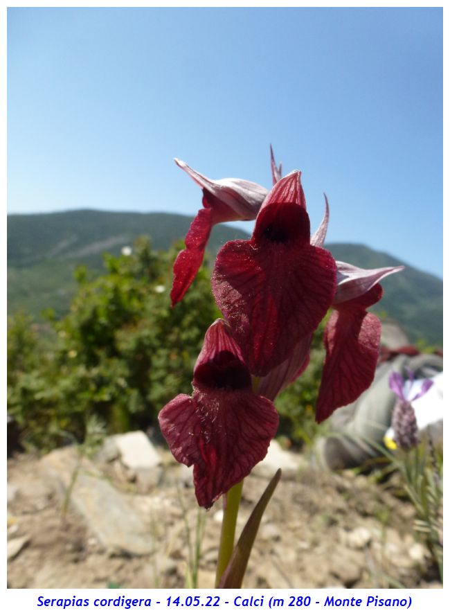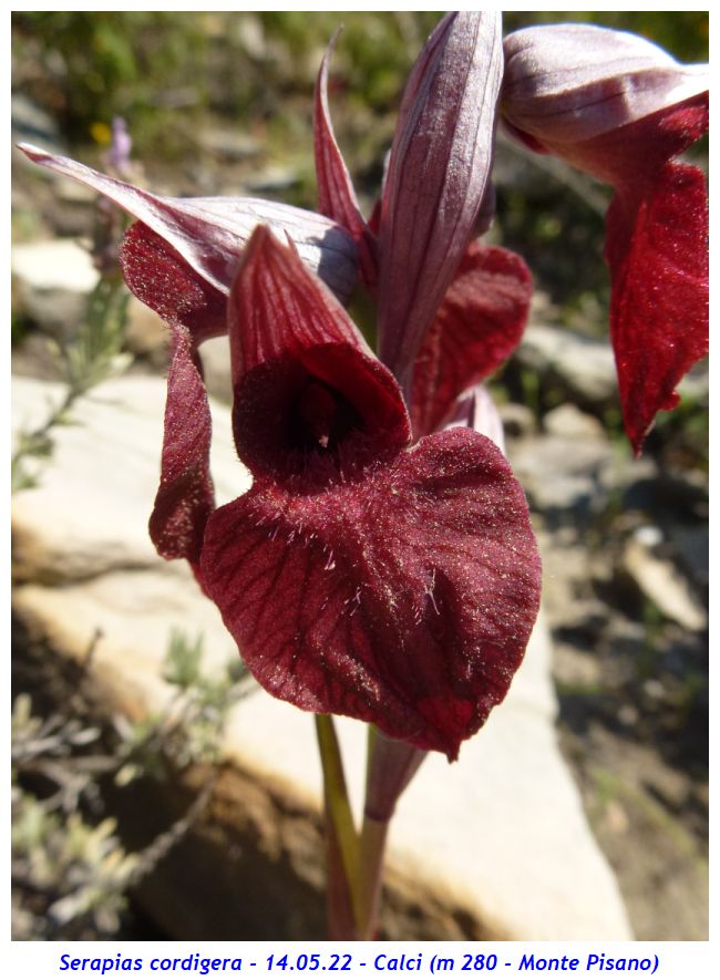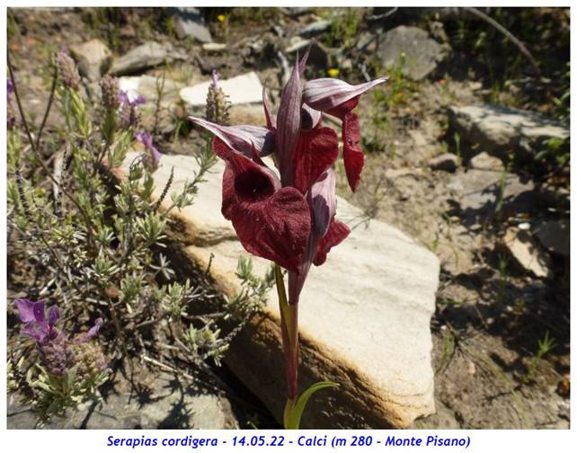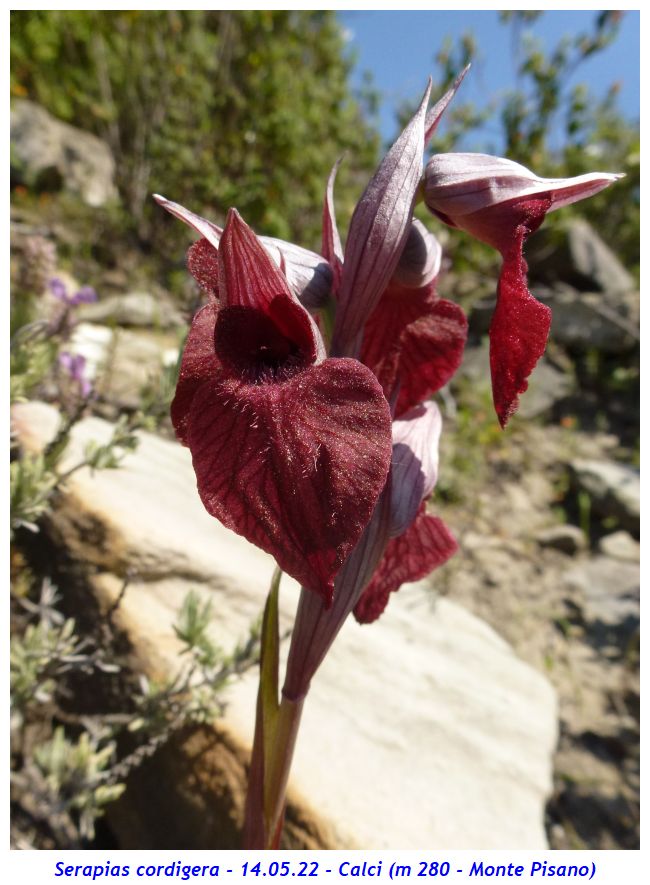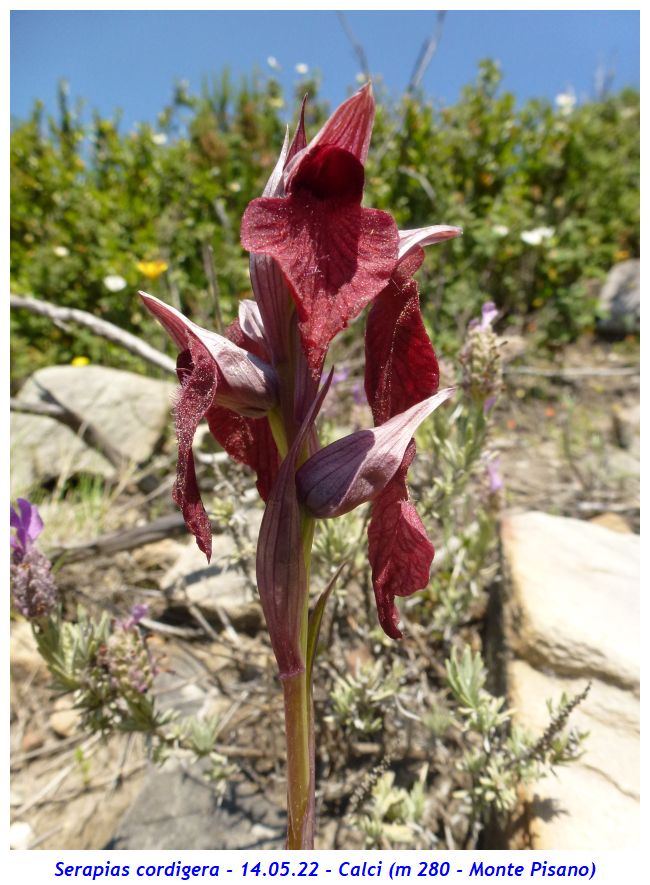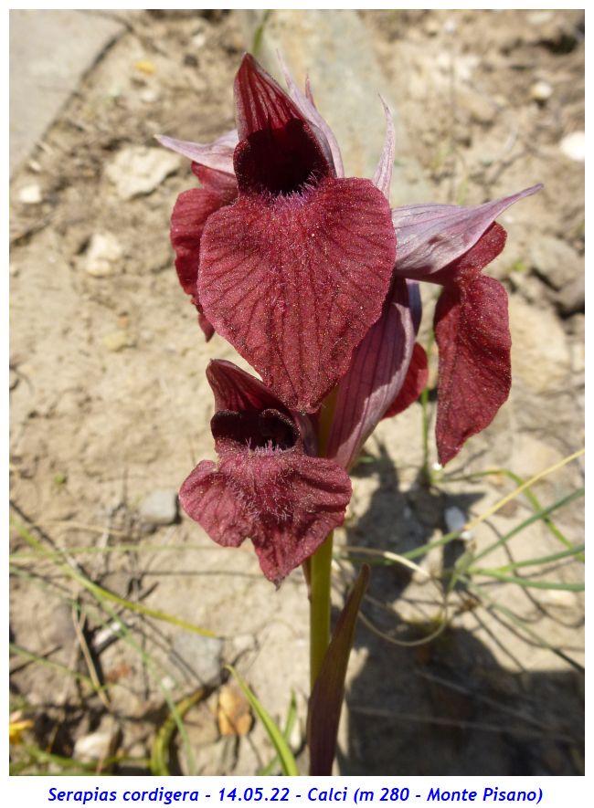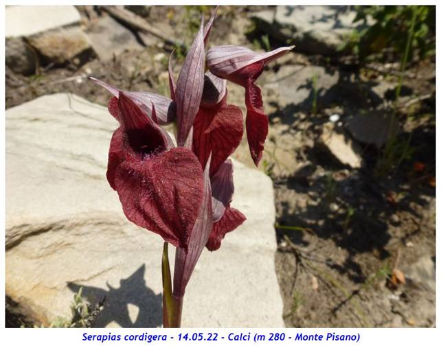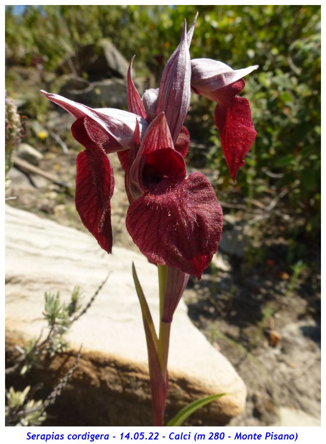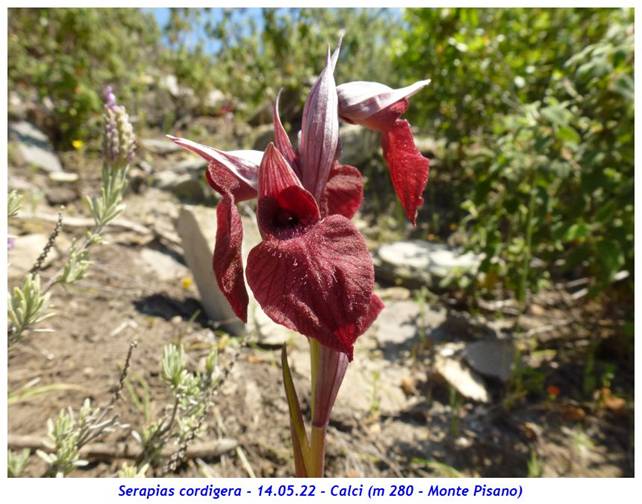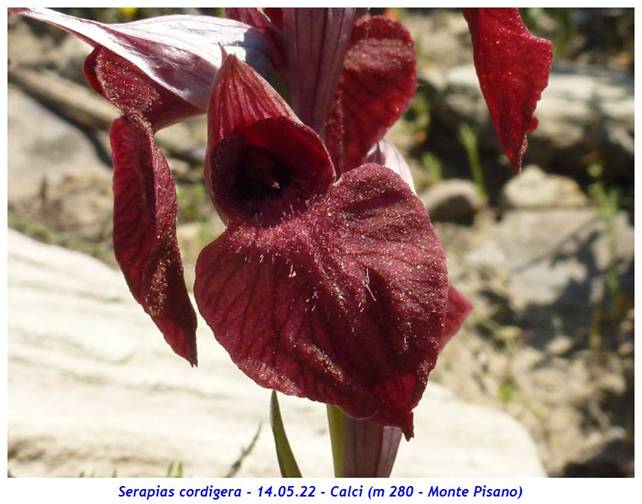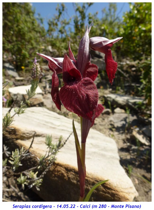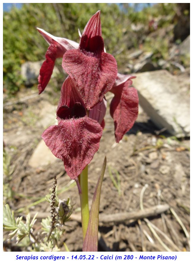 Nome scientifico: Serapias cordigera L. (Sinonimi: Helleborine cordigera (L.) Pers - Serapias azorica Schltr) Famiglia: Orchidaceae Habitat naturale: Garighe, cespuglieti, prati leggermente umidi, macchie, boscaglie chiare (castagneti, boschi di querce) da 0 a 1100 metri. Presente in tutta Italia tranne in Valle d’Aosta, Lombardia, Trentino Alto Adige, Veneto e Friuli Venezia Giulia. Risulta più frequente nel versante tirrenico mentre è più rara in quello adriatico con l’eccezione della Puglia. Periodo di fioritura: Da marzo a giugno Descrizione della pianta: Pianta erbacea perenne alta 15 – 50 cm con apparato radicale caratterizzato da 2 rizotuberi (raramente 3). Il fusto è eretto, di colore verde, con la base caratterizzata da macchie purpuree. Le foglie, in numero compreso tra 4 e 9, presentano lamina lineare-lanceolata; sono carenate con le cauline guainanti il fusto, di colore verde con striature violacee. Sono presenti brattee poco più corte del casco di colore argenteo con venature porporine. L’infiorescenza presenta 3 – 10 fiori con sepali di forma lineare-lanceolata e colore grigio rossiccio riuniti a formare un casco allungato rossastro all’interno. I petali sono lanceolati, quasi interamente nascosti dal casco, di colore rosso scuro. Il labello è trilobo, di colore compreso tra il rosso e il rosso-ruggine con, alla base, due callosità lineari purpureo-nerastre divergenti in avanti. I lobi dell’ipochilo sono quasi interamente coperti dai sepali. L’epichilo è cuoriforme, piuttosto grande (19-32 mm x 12-23 mm), pendente e riflesso con parte centrale pelosa e con nervature più scure. I pollini sono di colore compreso tra il giallo-verdastro e il violaceo. Note: Il nome specifico della specie deriva dal latino cor = cuore e gerere = portare in riferimento alla forma cuoriforme dell’epichilo del labello. Nonostante presenti un areale piuttosto ampio è specie nel complesso non comune caratterizzata da una forte variabilità biometrica. La riproduzione della specie è entomofila, grazie alla presenza di insetti pronubi che trovano riparo all’interno del casco tepalico. Serapias cordigera L. è specie protetta in Lombardia, Emilia Romagna e Campania. Appare assai simile a Serapias neglecta De Not. Quest’ultima si differenzia per il labello più chiaro di colorazione compresa tra il giallo ocra e il rosa salmone con venature porporine, per l’ipochilo che esce dal casco tepalico e per i calli alla base del labello paralleli e non divergenti. Notevole appare la somiglianza anche con Serapias cossyrensis, specie endemica dell’isola di Pantelleria che si differenzia per le foglie basali più larghe, l’infiorescenza più breve, epichilo e ipochilo quasi larghi uguali. Dove l’abbiamo osservata: Tutte le fotografie sono state realizzate in Toscana nelle colline alle spalle di Calci (m 280 – Monte Pisano). ![]()