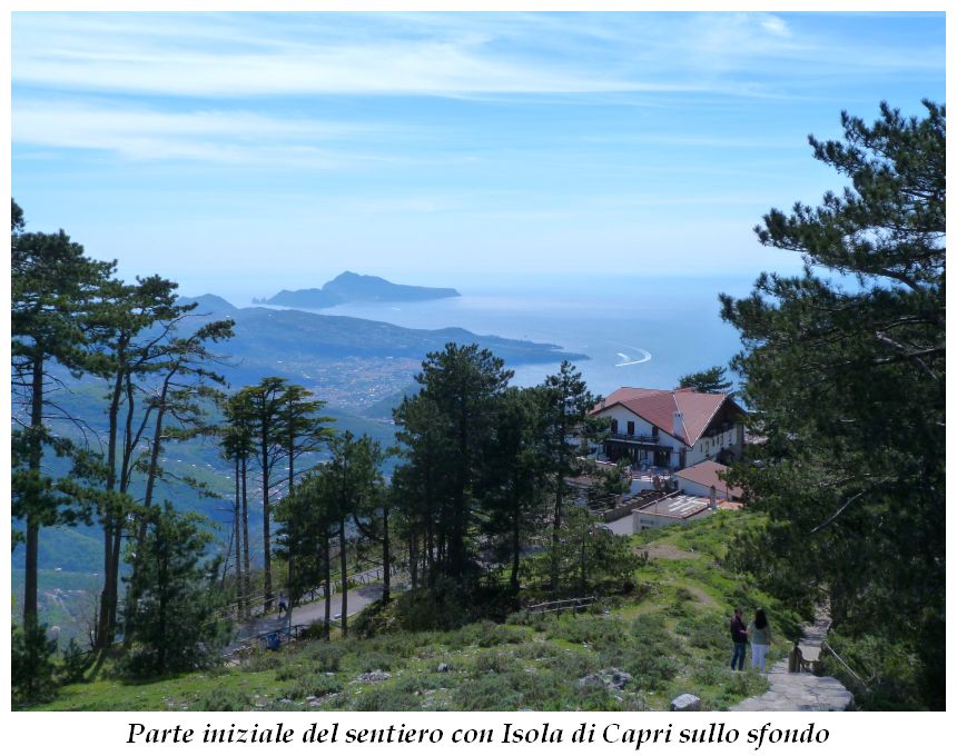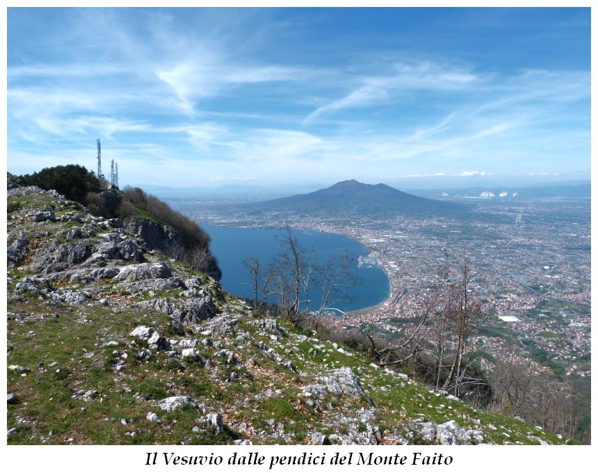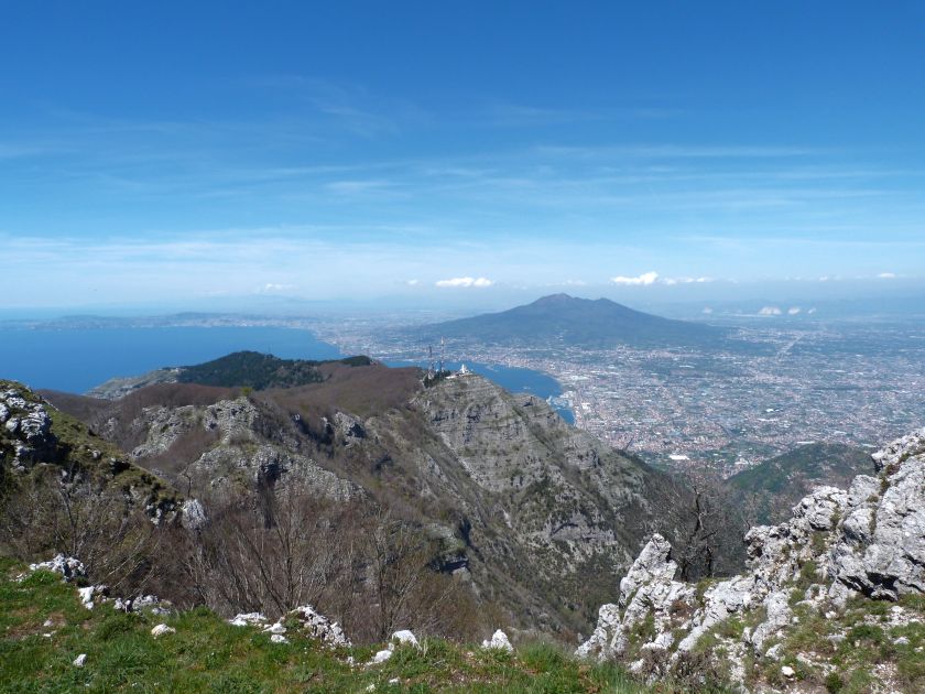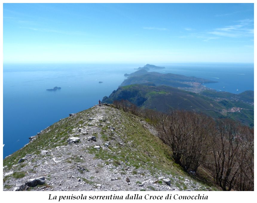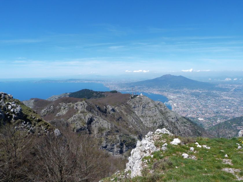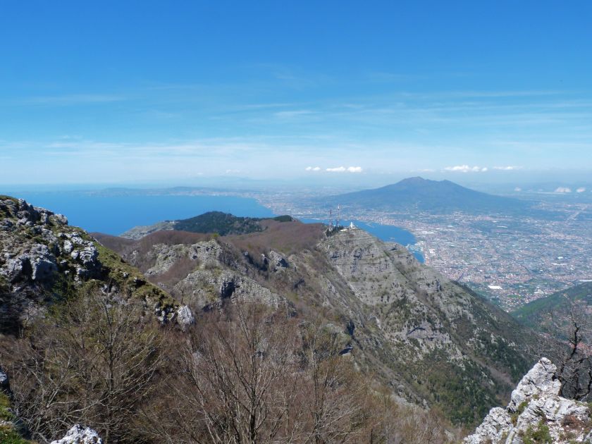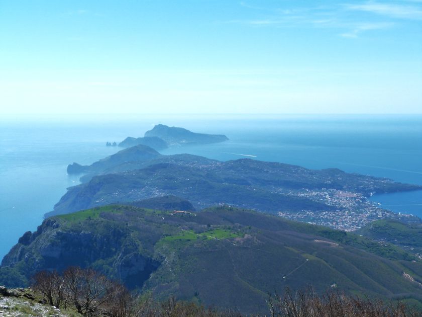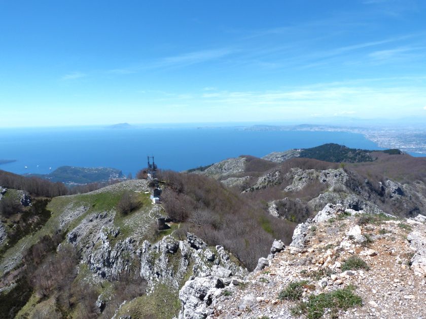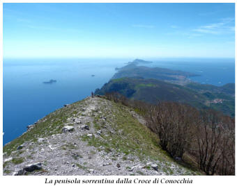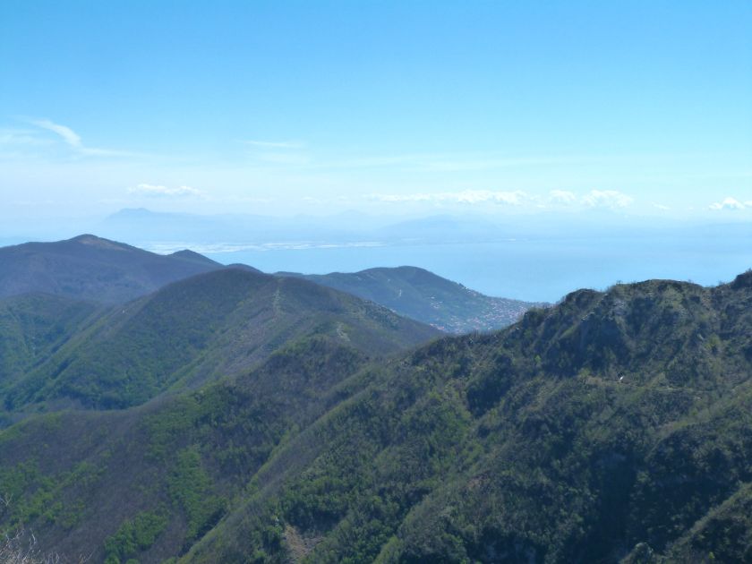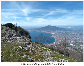 Il nostro primo itinerario escursionistico in Campania ha lasciato in noi un ricordo indelebile. Il solo citare la penisola sorrentina e la costiera amalfitana evoca, nella maggior parte delle persone, la visione di una costa a picco decantata in tutto il mondo oltre ad un ambiente mediterraneo di grande mitezza. Quante persone associeranno quest’area alla possibilità di camminare in montagna? Da un lato l’intero settore è ben noto a chi pratica il trekking per la presenza di un percorso famoso quale il Sentiero degli Dei. Abbiamo tuttavia rivolto la nostra attenzione più in alto, raggiungendo nella vetta del Molare, il vertice dei Monti Lattari ovvero la catena montuosa che caratterizza la penisola. Sarebbe superficiale considerare queste montagne come poco rilevanti. In cima al Molare si è infatti oltre i 1400 metri di quota: da lassù si gode la vista di un braccio di mare di grande ampiezza oltre ad un panorama incomparabile su Napoli, sul Vesuvio e sulle isole di Procida, Ischia e Capri. Per completezza aggiungiamo che il percorso descritto tocca anche il Monte Faito, forse la vetta della catena che gode della maggior notorietà sebbene non sia la più alta in quanto raggiungibile con la funivia che sale da Castellamare di Stabia. Il Parco Regionale dei Monti Lattari si prende cura in modo eccellente della segnaletica escursionistica che appare puntuale e ben curata. L’ambiente appare del tutto atipico per chi è abituato alle altitudini delle Alpi e dell’Appennino Centrale ma non per questo meno affascinante e ricco di spunti d’interesse. La neve può interessare il settore attraversato dal sentiero per via della quota nonostante la notevole vicinanza del litorale ragion per cui consigliamo d’eseguire la camminata in primavera o in autunno. Un particolare cenno è relativo alle nebbie che spesso si addensano sulle cime dei Lattari favorite dal contrasto tra l’umidità che sale dal Tirreno e la forzata risalita delle masse d’aria verso le cime. Per godere del favoloso panorama di vetta è più che mai necessario l’ascolto delle previsioni meteorologiche per godere di un’atmosfera limpida e stabile. L’escursione in breve: Belvedere Sant’Angelo (Piazzale dei Capi – m 1034) – Stazione a monte Funivia del Faito (m 1102) – Monte Faito (m 1131) – Porta del Faito (m 1200) – Santuario San Michele (m 1261) – Castellone (m 1233) – Sorgente Acqua Santa (m 1235) – Molare (Monte San Michele – m 1444) – Croce della Conocchia (m 1387) Dati tecnici: Partenza dal Belvedere Sant’Angelo (Piazzale dei Capi - m 1034): Difficoltà: E. Dalla partenza al Santuario di San Michele difficoltà T, quindi E con brevissimo tratto EE poco prima della vetta del Molare. (Vai alla scala delle difficoltà). Dislivello assoluto: m 410. Acqua potabile sul percorso: alla Sorgente Acqua Santa. Accesso alla partenza: Con la SS 145 Sorrentina raggiungiamo il paese di Vico Equense. In coincidenza del centro abitato troviamo il bivio per il Villaggio Monte Faito. La strada sale ripida serpeggiando sul fianco della montagna toccando alcune frazioni fra le quali ricordiamo Massaquano e Patierno. Dopo 16 km da Vico Equense si raggiunge il cosiddetto Piazzale dei Capi dove, presso una grande rotonda, possiamo lasciare l’automobile. La strada proseguirebbe volgendo bruscamente verso destra bordeggiando l’Hotel Sant’Angelo. Appena più a sinistra cala ripida Via Quisisana. Tra le due strade si osserva un’area picnic in coincidenza della quale ha inizio il sentiero che sale verso Monte Faito. Descrizione del percorso: La traccia si innalza lasciando l’Hotel Sant’Angelo e la strada più in basso sulla destra. Seguiamo l’ampio costone discendente dal Monte Faito. Nonostante la camminata sia solo all’inizio godiamo già, alle spalle, di un paesaggio grandioso che si apre permettendo l’osservazione di un ampio tratto di mare con in vista l’Isola di Capri. Proseguiamo con una ripida ma bella scalinata che permette di guadagnare rapidamente quota. Il tracciato si sviluppa sul bordo del crinaletto offrendo una vista che si estende grandiosa in direzione di Napoli con il Vesuvio, nonché verso le isole di Procida e d’Ischia. A 25 minuti dalla partenza guadagniamo il pianetto che ospita la stazione a monte della funivia di Monte Faito (m 1102). Naturalmente è possibile iniziare qui l’escursione usando l’impianto a fune che ha la sua stazione a valle in coincidenza di Castellamare di Stabia. Abbiamo tuttavia preferito la soluzione che vi stiamo proponendo per non dipendere dagli orari dell’impianto. Da notare inoltre l’ulteriore possibilità di salire fin qui in automobile eliminando anche in questo caso il primo tratto di salita. Ancora una volta la scelta è libera; con la soluzione descritta abbiamo cercato tuttavia di includere la parte iniziale per non provarsi delle grandiose vedute prima indicate. Si tratta inoltre di un’escursione nel complesso non troppo lunga e non avrebbe molto senso abbreviarla ulteriormente a meno che non si abbia pochissimo tempo a disposizione. Proseguiamo con la nostra narrazione ignorando la strada aperta al traffico che permette l’accesso alla stazione a monte della funivia e che scende sulla destra. Manteniamo l’ampio e comodo crinale con cartelli indicanti “San Michele”. Il tracciato si sviluppa tra frazioni prative e altri settori caratterizzati da una fitta faggeta. Andiamo a lambire la vetta del Monte Faito (m 1131) deturpato in vetta da parecchi ripetitori radio. Nel proseguo manteniamo l’ampia mulattiera che, dopo aver bordeggiato sulla destra alcune proprietà, procede grosso modo lungo il filo di cresta. Si apre a tratti la vista a sinistra osservando ancora una volta il Vesuvio e la grande piana ai suoi piedi, una delle aree più densamente abitate della nostra penisola. Infine la mulattiera, in vista della Chiesa di San Michele, intercetta l’ultimo tornante della strada asfaltata aperta al traffico che 