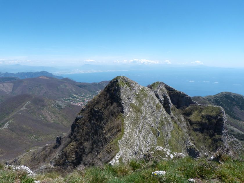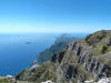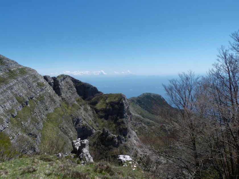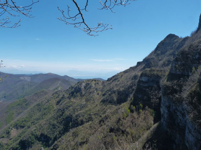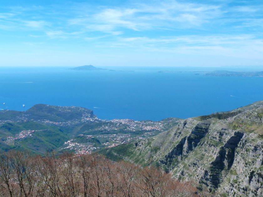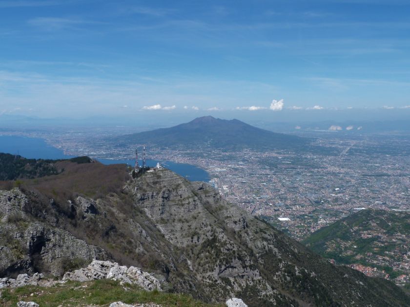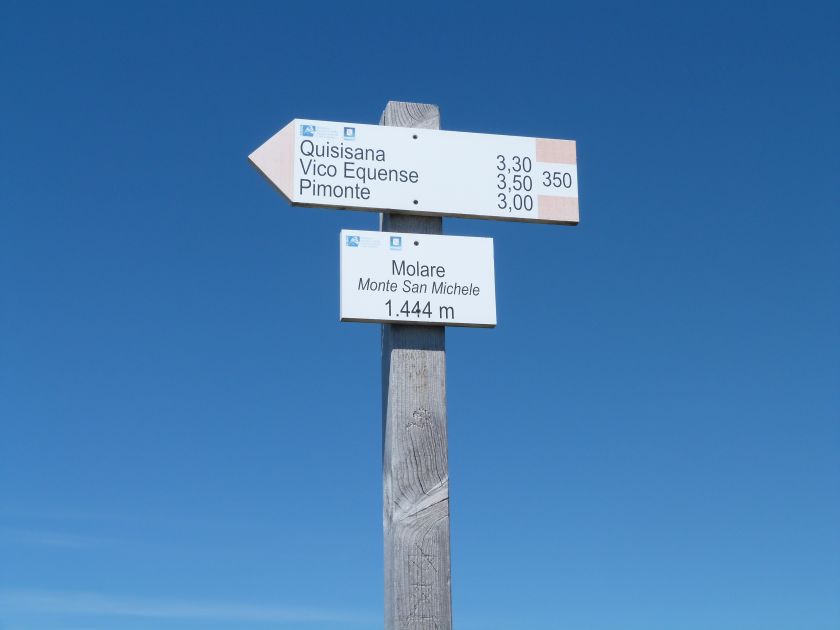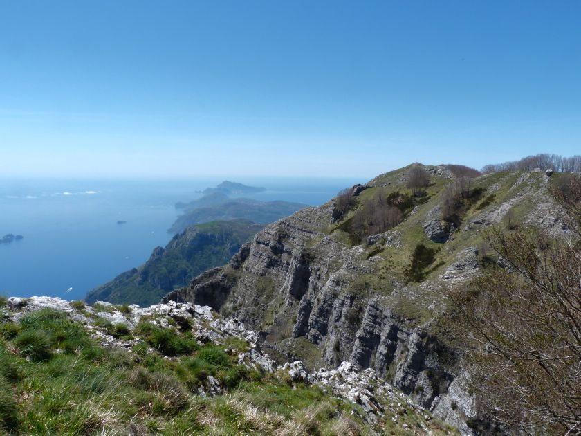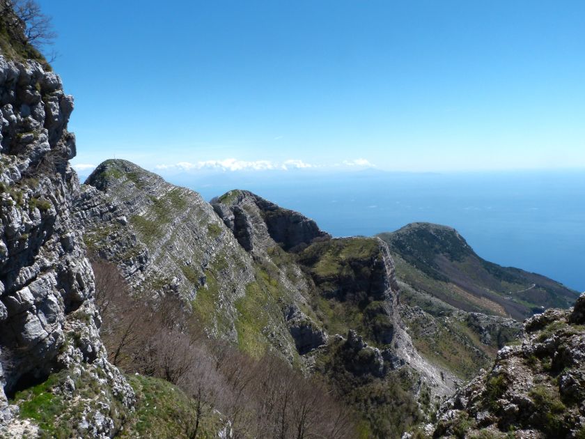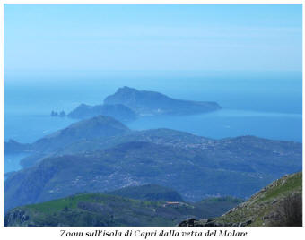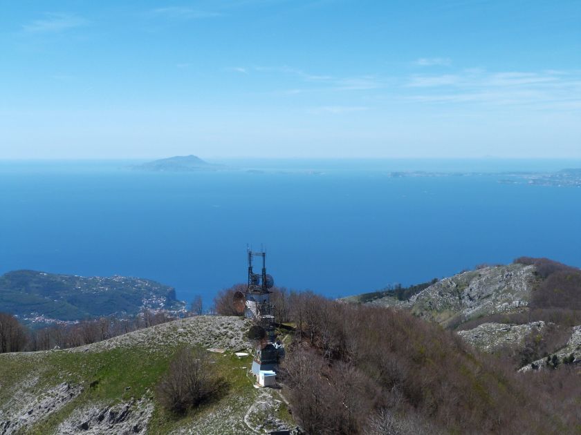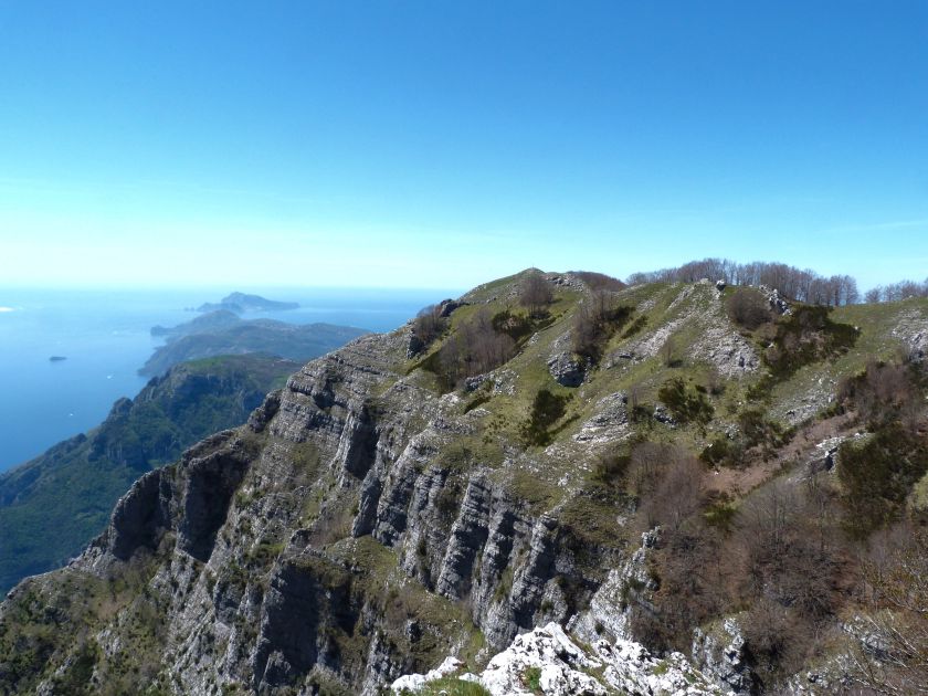 Il nostro primo itinerario escursionistico in Campania ha lasciato in noi un ricordo indelebile. Il solo citare la penisola sorrentina e la costiera amalfitana evoca, nella maggior parte delle persone, la visione di una costa a picco decantata in tutto il mondo oltre ad un ambiente mediterraneo di grande mitezza. Quante persone associeranno quest’area alla possibilità di camminare in montagna? Da un lato l’intero settore è ben noto a chi pratica il trekking per la presenza di un percorso famoso quale il Sentiero degli Dei. Abbiamo tuttavia rivolto la nostra attenzione più in alto, raggiungendo nella vetta del Molare, il vertice dei Monti Lattari ovvero la catena montuosa che caratterizza la penisola. Sarebbe superficiale considerare queste montagne come poco rilevanti. In cima al Molare si è infatti oltre i 1400 metri di quota: da lassù si gode la vista di un braccio di mare di grande ampiezza oltre ad un panorama incomparabile su Napoli, sul Vesuvio e sulle isole di Procida, Ischia e Capri. Per completezza aggiungiamo che il percorso descritto tocca anche il Monte Faito, forse la vetta della catena che gode della maggior notorietà sebbene non sia la più alta in quanto raggiungibile con la funivia che sale da Castellamare di Stabia. Il Parco Regionale dei Monti Lattari si prende cura in modo eccellente della segnaletica escursionistica che appare puntuale e ben curata. L’ambiente appare del tutto atipico per chi è abituato alle altitudini delle Alpi e dell’Appennino Centrale ma non per questo meno affascinante e ricco di spunti d’interesse. La neve può interessare il settore attraversato dal sentiero per via della quota nonostante la notevole vicinanza del litorale ragion per cui consigliamo d’eseguire la camminata in primavera o in autunno. Un particolare cenno è relativo alle nebbie che spesso si addensano sulle cime dei Lattari favorite dal contrasto tra l’umidità che sale dal Tirreno e la forzata risalita delle masse d’aria verso le cime. Per godere del favoloso panorama di vetta è più che mai necessario l’ascolto delle previsioni meteorologiche per godere di un’atmosfera limpida e stabile. L’escursione in breve: Belvedere Sant’Angelo (Piazzale dei Capi – m 1034) – Stazione a monte Funivia del Faito (m 1102) – Monte Faito (m 1131) – Porta del Faito (m 1200) – Santuario San Michele (m 1261) – Castellone (m 1233) – Sorgente Acqua Santa (m 1235) – Molare (Monte San Michele – m 1444) – Croce della Conocchia (m 1387) Dati tecnici: Partenza dal Belvedere Sant’Angelo (Piazzale dei Capi - m 1034): Difficoltà: E. Dalla partenza al Santuario di San Michele difficoltà T, quindi E con brevissimo tratto EE poco prima della vetta del Molare. (Vai alla scala delle difficoltà). Dislivello assoluto: m 410. Acqua potabile sul percorso: alla Sorgente Acqua Santa. Accesso alla partenza: Con la SS 145 Sorrentina raggiungiamo il paese di Vico Equense. In coincidenza del centro abitato troviamo il bivio per il Villaggio Monte Faito. La strada sale ripida serpeggiando sul fianco della montagna toccando alcune frazioni fra le quali ricordiamo Massaquano e Patierno. Dopo 16 km da Vico Equense si raggiunge il cosiddetto Piazzale dei Capi dove, presso una grande rotonda, possiamo lasciare l’automobile. La strada proseguirebbe volgendo bruscamente verso destra bordeggiando l’Hotel Sant’Angelo. Appena più a sinistra cala ripida Via Quisisana. Tra le due strade si osserva un’area picnic in coincidenza della quale ha inizio il sentiero che sale verso Monte Faito. Descrizione del percorso: La traccia si innalza lasciando l’Hotel Sant’Angelo e la strada più in basso sulla destra. Seguiamo l’ampio costone discendente dal Monte Faito. Nonostante la camminata sia solo all’inizio godiamo già, alle spalle, di un paesaggio grandioso che si apre permettendo l’osservazione di un ampio tratto di mare con in vista l’Isola di Capri. Proseguiamo con una ripida ma bella scalinata che permette di guadagnare rapidamente quota. Il tracciato si sviluppa sul bordo del crinaletto offrendo una vista che si estende grandiosa in direzione di Napoli con il Vesuvio, nonché verso le isole di Procida e d’Ischia. A 25 minuti dalla partenza guadagniamo il pianetto che ospita la stazione a monte della funivia di Monte Faito (m 1102). Naturalmente è possibile iniziare qui l’escursione usando l’impianto a fune che ha la sua stazione a valle in coincidenza di Castellamare di Stabia. Abbiamo tuttavia preferito la soluzione che vi stiamo proponendo per non dipendere dagli orari dell’impianto. Da notare inoltre l’ulteriore possibilità di salire fin qui in automobile eliminando anche in questo caso il primo tratto di salita. Ancora una volta la scelta è libera; con la soluzione descritta abbiamo cercato tuttavia di includere la parte iniziale per non provarsi delle grandiose vedute prima indicate. Si tratta inoltre di un’escursione nel complesso non troppo lunga e non avrebbe molto senso abbreviarla ulteriormente a meno che non si abbia pochissimo tempo a disposizione. Proseguiamo con la nostra narrazione ignorando la strada aperta al traffico che permette l’accesso alla stazione a monte della funivia e che scende sulla destra. Manteniamo l’ampio e comodo crinale con cartelli indicanti “San Michele”. Il tracciato si sviluppa tra frazioni prative e altri settori caratterizzati da una fitta faggeta. Andiamo a lambire la vetta del Monte Faito (m 1131) deturpato in vetta da parecchi ripetitori radio. Nel proseguo manteniamo l’ampia mulattiera che, dopo aver bordeggiato sulla destra alcune proprietà, procede grosso modo lungo il filo di cresta. Si apre a tratti la vista a sinistra osservando ancora una volta il Vesuvio e la grande piana ai suoi piedi, una delle aree più densamente abitate della nostra penisola. Infine la mulattiera, in vista della Chiesa di San Michele, intercetta l’ultimo tornante della strada asfaltata aperta al traffico che 