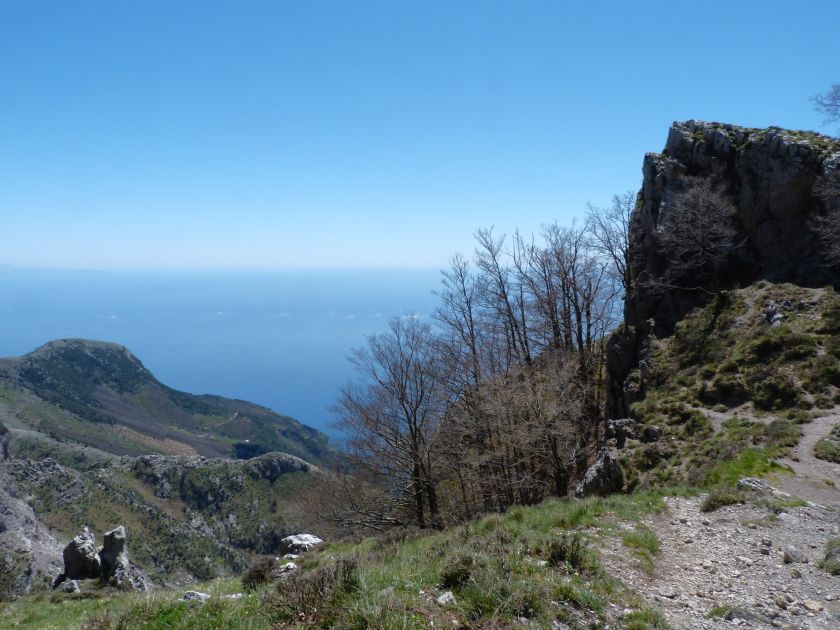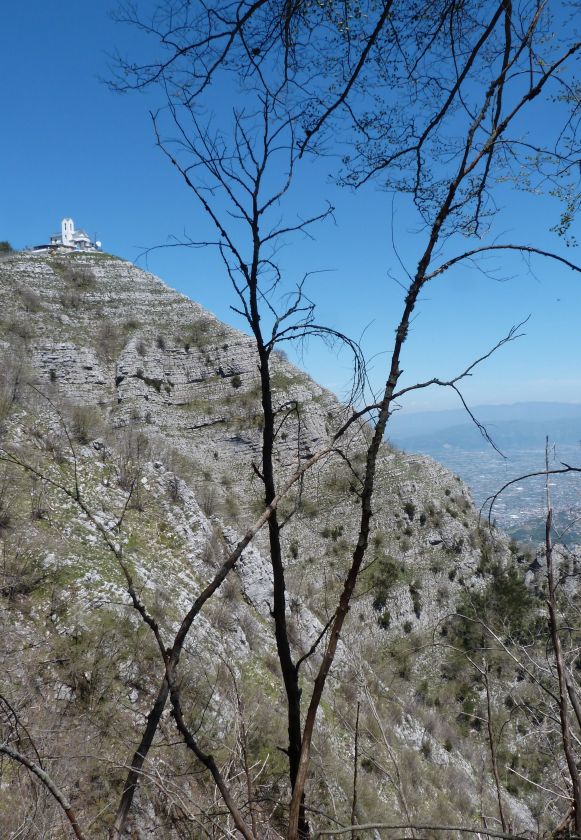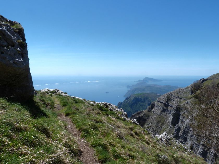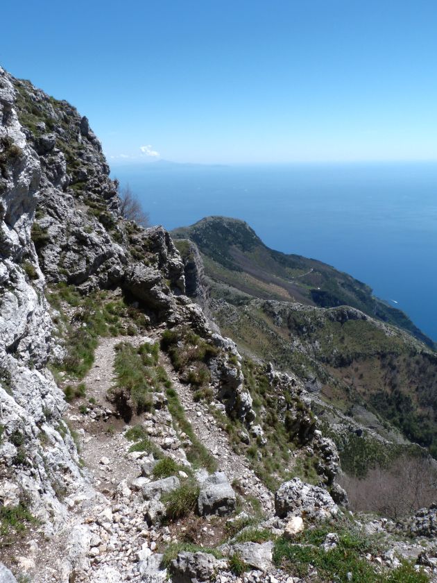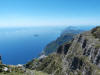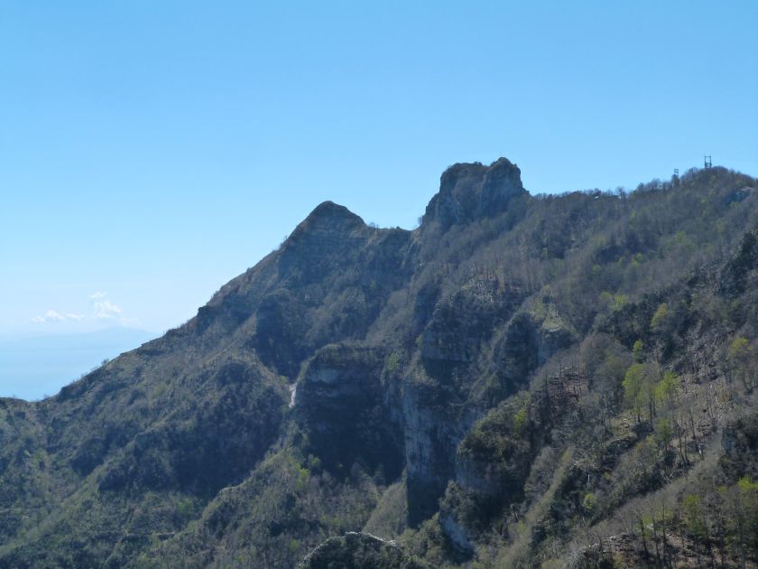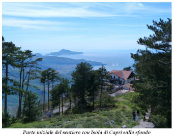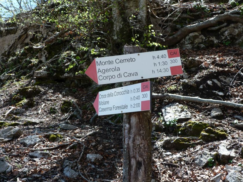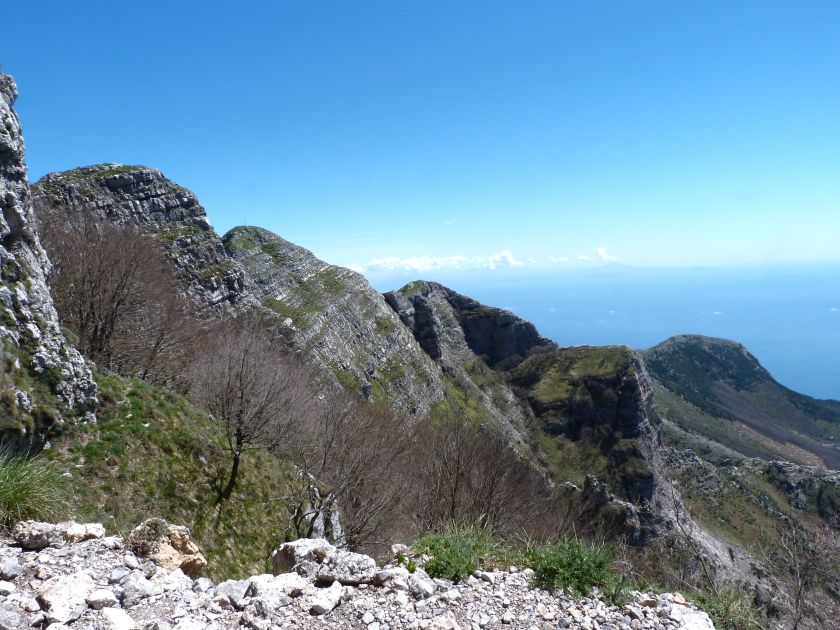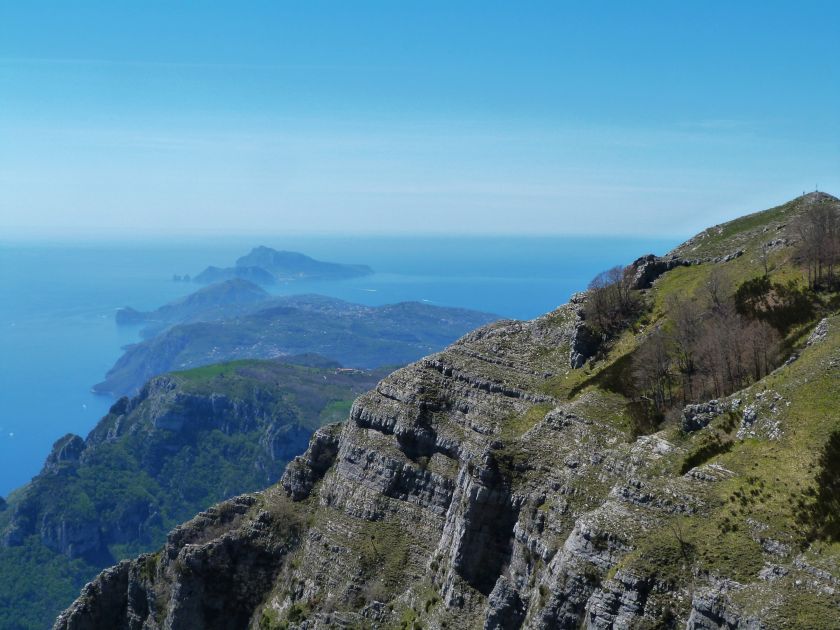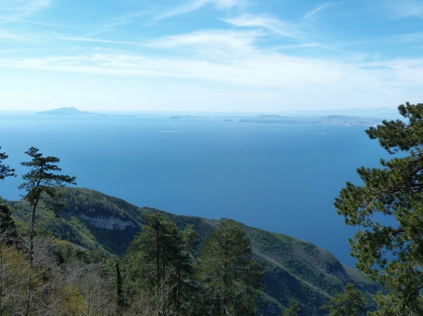 Il nostro primo itinerario escursionistico in Campania ha lasciato in noi un ricordo indelebile. Il solo citare la penisola sorrentina e la costiera amalfitana evoca, nella maggior parte delle persone, la visione di una costa a picco decantata in tutto il mondo oltre ad un ambiente mediterraneo di grande mitezza. Quante persone associeranno quest’area alla possibilità di camminare in montagna? Da un lato l’intero settore è ben noto a chi pratica il trekking per la presenza di un percorso famoso quale il Sentiero degli Dei. Abbiamo tuttavia rivolto la nostra attenzione più in alto, raggiungendo nella vetta del Molare, il vertice dei Monti Lattari ovvero la catena montuosa che caratterizza la penisola. Sarebbe superficiale considerare queste montagne come poco rilevanti. In cima al Molare si è infatti oltre i 1400 metri di quota: da lassù si gode la vista di un braccio di mare di grande ampiezza oltre ad un panorama incomparabile su Napoli, sul Vesuvio e sulle isole di Procida, Ischia e Capri. Per completezza aggiungiamo che il percorso descritto tocca anche il Monte Faito, forse la vetta della catena che gode della maggior notorietà sebbene non sia la più alta in quanto raggiungibile con la funivia che sale da Castellamare di Stabia. Il Parco Regionale dei Monti Lattari si prende cura in modo eccellente della segnaletica escursionistica che appare puntuale e ben curata. L’ambiente appare del tutto atipico per chi è abituato alle altitudini delle Alpi e dell’Appennino Centrale ma non per questo meno affascinante e ricco di spunti d’interesse. La neve può interessare il settore attraversato dal sentiero per via della quota nonostante la notevole vicinanza del litorale ragion per cui consigliamo d’eseguire la camminata in primavera o in autunno. Un particolare cenno è relativo alle nebbie che spesso si addensano sulle cime dei Lattari favorite dal contrasto tra l’umidità che sale dal Tirreno e la forzata risalita delle masse d’aria verso le cime. Per godere del favoloso panorama di vetta è più che mai necessario l’ascolto delle previsioni meteorologiche per godere di un’atmosfera limpida e stabile. L’escursione in breve: Belvedere Sant’Angelo (Piazzale dei Capi – m 1034) – Stazione a monte Funivia del Faito (m 1102) – Monte Faito (m 1131) – Porta del Faito (m 1200) – Santuario San Michele (m 1261) – Castellone (m 1233) – Sorgente Acqua Santa (m 1235) – Molare (Monte San Michele – m 1444) – Croce della Conocchia (m 1387) Dati tecnici: Partenza dal Belvedere Sant’Angelo (Piazzale dei Capi - m 1034): Difficoltà: E. Dalla partenza al Santuario di San Michele difficoltà T, quindi E con brevissimo tratto EE poco prima della vetta del Molare. (Vai alla scala delle difficoltà). Dislivello assoluto: m 410. Acqua potabile sul percorso: alla Sorgente Acqua Santa. Accesso alla partenza: Con la SS 145 Sorrentina raggiungiamo il paese di Vico Equense. In coincidenza del centro abitato troviamo il bivio per il Villaggio Monte Faito. La strada sale ripida serpeggiando sul fianco della montagna toccando alcune frazioni fra le quali ricordiamo Massaquano e Patierno. Dopo 16 km da Vico Equense si raggiunge il cosiddetto Piazzale dei Capi dove, presso una grande rotonda, possiamo lasciare l’automobile. La strada proseguirebbe volgendo bruscamente verso destra bordeggiando l’Hotel Sant’Angelo. Appena più a sinistra cala ripida Via Quisisana. Tra le due strade si osserva un’area picnic in coincidenza della quale ha inizio il sentiero che sale verso Monte Faito. Descrizione del percorso: La traccia si innalza lasciando l’Hotel Sant’Angelo e la strada più in basso sulla destra. Seguiamo l’ampio costone discendente dal Monte Faito. Nonostante la camminata sia solo all’inizio godiamo già, alle spalle, di un paesaggio grandioso che si apre permettendo l’osservazione di un ampio tratto di mare con in vista l’Isola di Capri. Proseguiamo con una ripida ma bella scalinata che permette di guadagnare rapidamente quota. Il tracciato si sviluppa sul bordo del crinaletto offrendo una vista che si estende grandiosa in direzione di Napoli con il Vesuvio, nonché verso le isole di Procida e d’Ischia. A 25 minuti dalla partenza guadagniamo il pianetto che ospita la stazione a monte della funivia di Monte Faito (m 1102). Naturalmente è possibile iniziare qui l’escursione usando l’impianto a fune che ha la sua stazione a valle in coincidenza di Castellamare di Stabia. Abbiamo tuttavia preferito la soluzione che vi stiamo proponendo per non dipendere dagli orari dell’impianto. Da notare inoltre l’ulteriore possibilità di salire fin qui in automobile eliminando anche in questo caso il primo tratto di salita. Ancora una volta la scelta è libera; con la soluzione descritta abbiamo cercato tuttavia di includere la parte iniziale per non provarsi delle grandiose vedute prima indicate. Si tratta inoltre di un’escursione nel complesso non troppo lunga e non avrebbe molto senso abbreviarla ulteriormente a meno che non si abbia pochissimo tempo a disposizione. Proseguiamo con la nostra narrazione ignorando la strada aperta al traffico che permette l’accesso alla stazione a monte della funivia e che scende sulla destra. Manteniamo l’ampio e comodo crinale con cartelli indicanti “San Michele”. Il tracciato si sviluppa tra frazioni prative e altri settori caratterizzati da una fitta faggeta. Andiamo a lambire la vetta del Monte Faito (m 1131) deturpato in vetta da parecchi ripetitori radio. Nel proseguo manteniamo l’ampia mulattiera che, dopo aver bordeggiato sulla destra alcune proprietà, procede grosso modo lungo il filo di cresta. Si apre a tratti la vista a sinistra osservando ancora una volta il Vesuvio e la grande piana ai suoi piedi, una delle aree più densamente abitate della nostra penisola. Infine la mulattiera, in vista della Chiesa di San Michele, intercetta l’ultimo tornante della strada asfaltata aperta al traffico che 
