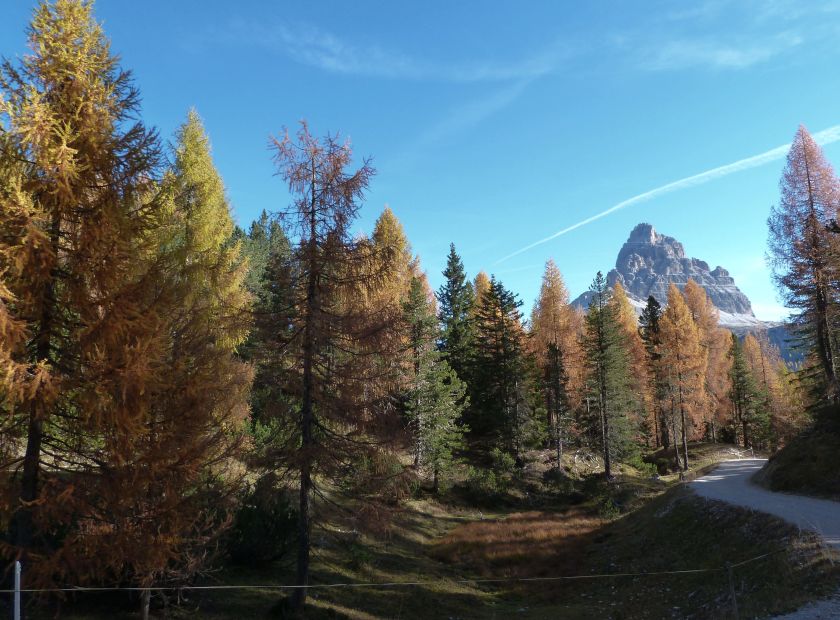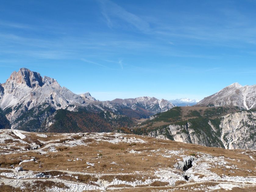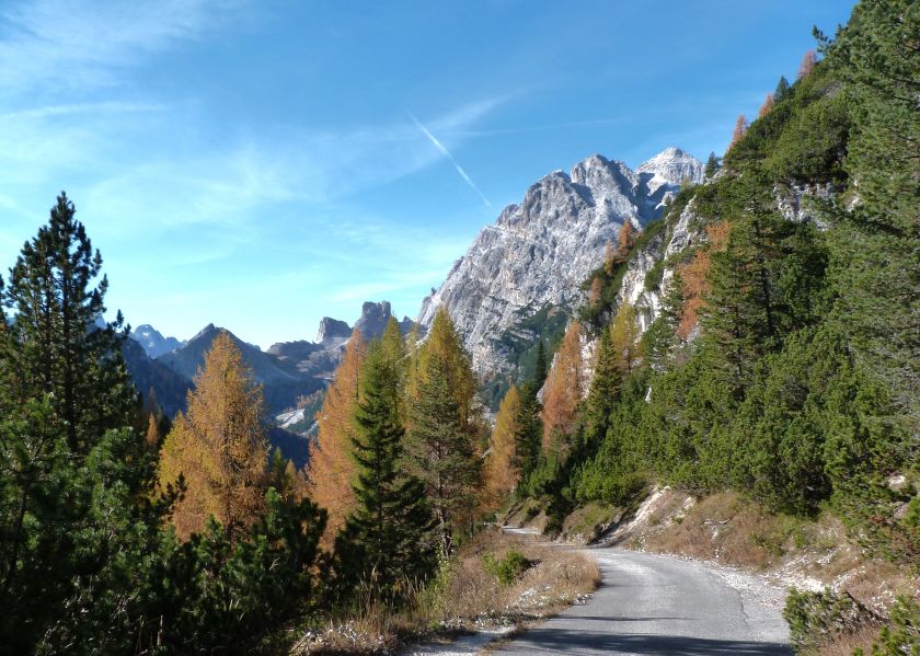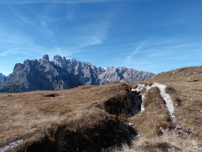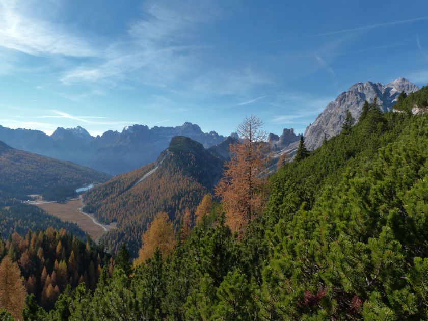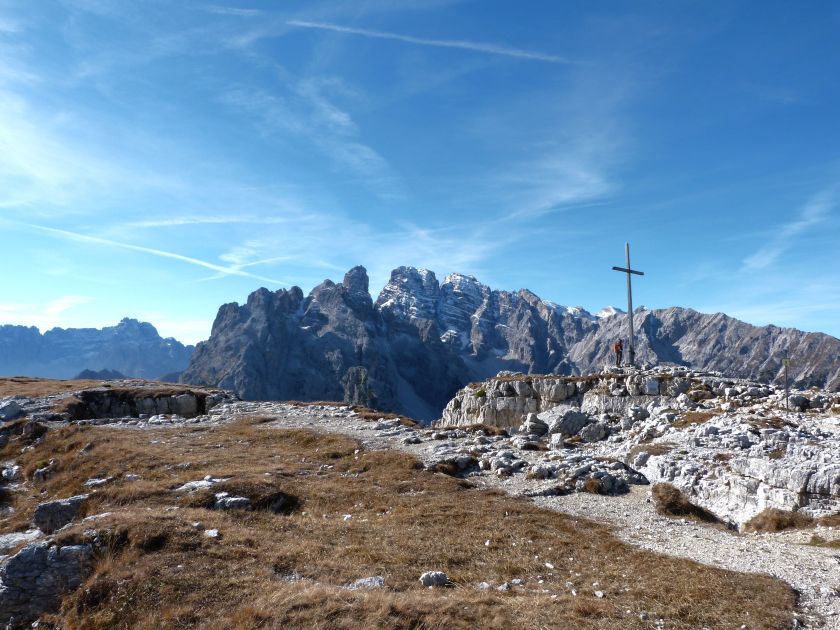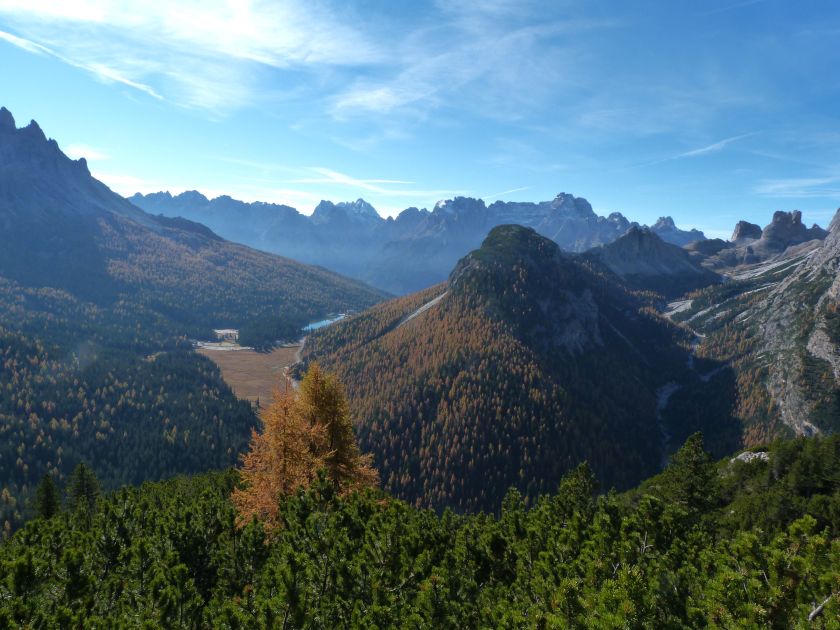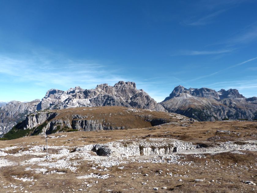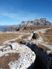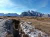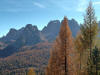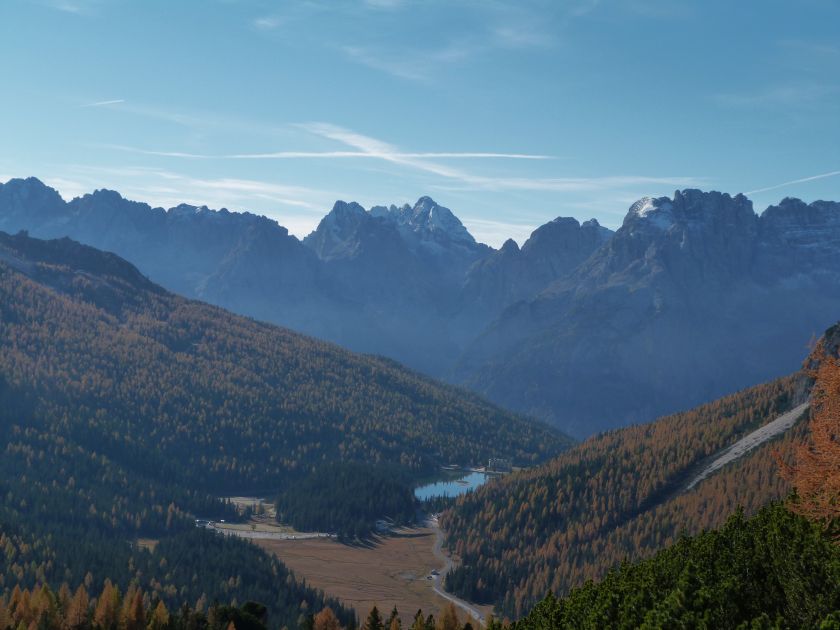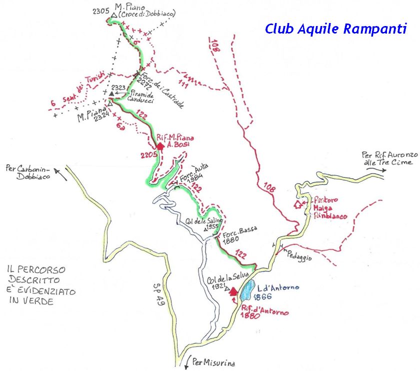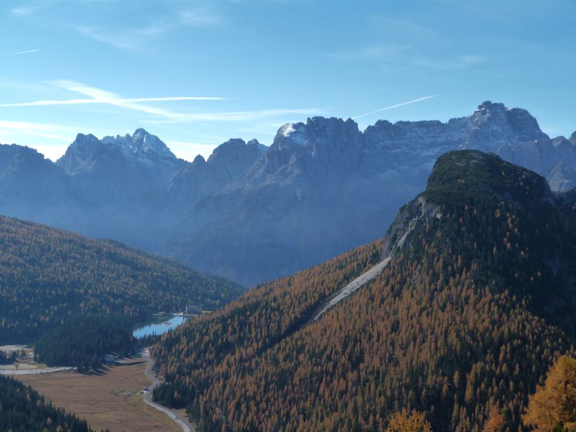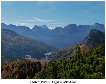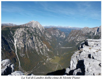La presenza della coppia Monte Piana – Monte Piano è, nell’ambito delle Dolomiti, quanto meno bizzarra. Divise dalla poco marcata Forcella dei Castrati, sono due cime molto vicine fra loro e alte quasi uguali. A renderle atipiche se non uniche è la caratteristica di presentare delle sommità ampie e in pratica piatte. Le spianate sommitali contrastano con le precipiti pareti che le due montagne presentano verso occidente e verso settentrione. Trovandosi sulla loro vetta basta infatti spostarsi in queste direzioni per raggiungere il ciglio dell’impressionante baratro che precipita fino alla sottostante Val di Landro con l’omonimo lago e il paese di Carbonin. Due ambienti completamente opposti: quello delle praterie di vetta in contrasto con quello delle rupi strapiombanti. La coppia Monte Piana – Monte Piano è purtroppo famosa primariamente per le tragiche vicende che ne sconvolsero le pendici durante il Primo conflitto mondiale. In quest’area persero la vita qualcosa come 14000 soldati tra italiani e austro-ungarici. La salita, come descritta a seguire, tocca poco a valle di Monte Piana il Rifugio Bosi all’interno del quale è presente un piccolo museo privato che raccoglie fotografie, documenti e reperti della Grande Guerra. Proseguendo fin sul vasto pianoro del Monte Piana si osserva un impressionante reticolo di trincee, postazioni e gallerie riportate alla luce e ristrutturate permettendo un interessantissimo tour storico in un vero e proprio museo alla luce del sole. L’interesse dell’escursione è pertanto storico ma non è da meno il valore panoramico essendo osservabile dalle due sommità un grandioso panorama esteso alle vette circostanti tra le quali ricordiamo il Monte Cristallo e le Tre Cime di Lavaredo. Da notare che l’accesso al Monte Piana avviene per mezzo di una strada comunale asfaltata chiusa dal 1998 al traffico (anche delle biciclette) che ricalca quasi integralmente la vecchia strada militare costruita durante la guerra. Nel periodo estivo i 6 km di strada sono percorsi da un servizio di jeep-navetta a permettere un accesso fin troppo banale al Rifugio Bosi. L’interesse storico fa sì che l’area sia letteralmente presa d’assalto dai turisti. Nel nostro caso vi raccomandiamo l’ascesa in bassa stagione. Vi descriviamo la salita dal Lago d’Antorno toccando solo in parte la strada d’accesso che resta comunque sempre chiusa al traffico. Nella seconda metà di ottobre, in particolare, il silenzio torna ad avvolgere le cime permettendo un’esperienza decisamente più intima e meditativa. Avrete modo di osservare il foliage grazie ai lariceti che caratterizzano la parte inferiore del cammino. Tra i mille colori degli alberi e il silenzio talvolta malinconico del tardo autunno sembra incredibile pensare come quest’area sia stata muta testimone di uno dei più sanguinosi e violenti combattimenti della Prima Guerra Mondiale. Vi auguriamo di provare la pace e la meravigliosa solitudine che abbiamo provato noi risalendone lentamente i fianchi sino a godere dello spettacolare panorama di vetta. L’escursione in breve: Lago d’Antorno (m 1866) – Forcella Bassa (m 1880) - Forcella Àuta (m 1984) – Rifugio Monte Piana Angelo Bosi (m 2205) – Piramide Carducci (m 2323) – Monte Piana (m 2324) – Forcella de i Castrade (Forcella dei Castrati - m 2272) – Monte Piano (Croce di Dobbiaco – m 2305) Dati tecnici: Partenza dal Lago d’Antorno (m 1866): Difficoltà: E (Vai alla scala delle difficoltà). Segnaletica: totale. Dislivello assoluto: m 458. Dislivello realmente coperto in salita: m 550. Acqua potabile sul percorso: assente. Accesso alla partenza: Chi proviene da sud tocca il paese di Auronzo quindi sale al Lago di Misurina con la SR 48 delle Dolomiti. La strada segue la sponda occidentale del lago sino ad arrivare alla sua estremità settentrionale. Poco oltre troviamo sulla destra il bivio per le Tre Cime di Lavaredo. Abbandoniamo pertanto il proseguo che condurrebbe altrimenti a Carbonin e a Dobbiaco per volgere in questa direzione raggiungendo, dopo un paio di km, il bellissimo Lago d’Antorno posizionato a destra del piano stradale. Possiamo lasciare l’automobile nel parcheggio presso lo specchio d’acqua. Descrizione del percorso: Il Lago di Antorno (m 1866), punto iniziale della nostra escursione, merita senz’altro una visita percorrendo il breve sentiero che ne ricalca la sponda orientale. Le cime dei Cadini di Misurina e delle Tre Cime di Lavaredo si specchiano nelle sue acque in un ambiente ameno particolarmente apprezzabile in autunno quando è lontana la confusione del turismo agostano. Il sentiero appare a tratti agevolato da una bella passerella in legno che permette di superare senza difficoltà alcune frazioni torbose. Ritornati sulla strada asfaltata ne percorriamo un breve tratto in direzione delle Tre Cime di Lavaredo trovando, poco oltre, il cartello che segnala a sinistra il segnavia 122 diretto al Monte Piana e al Rifugio Bosi (m 1885 – ore 0,10 dalla partenza). Muoviamo in questa direzione con sentiero che si sviluppa, facile e con debole dislivello, nel folto del bosco di conifere. In breve accediamo alla Forcella Bassa (m 1880 – ore 0,25 dalla partenza) dove confluiamo in un’ampia forestale. Guidati dal cartello segnaletico procediamo verso destra su comoda carrareccia con tratti asfaltati osservando i primi scorci, tra le frasche dei larici e degli abeti, in direzione delle cime circostanti con specifico riferimento al Monte Cristallo e alle Tre Cime di Lavaredo. La forestale lambisce una zona prativa umida posta alla destra del tracciato quindi volgiamo verso nordovest scorgendo davanti a noi il Monte Piana che appare coperto nella fascia sommitale da una densa vegetazione a pino mugo. La salita resta nel complesso moderata. Nella seconda parte del mese di ottobre il cammino è allietato dalle sgargianti colorazioni dei larici a rendere affascinante un’ascesa che altrimenti potrebbe risultare