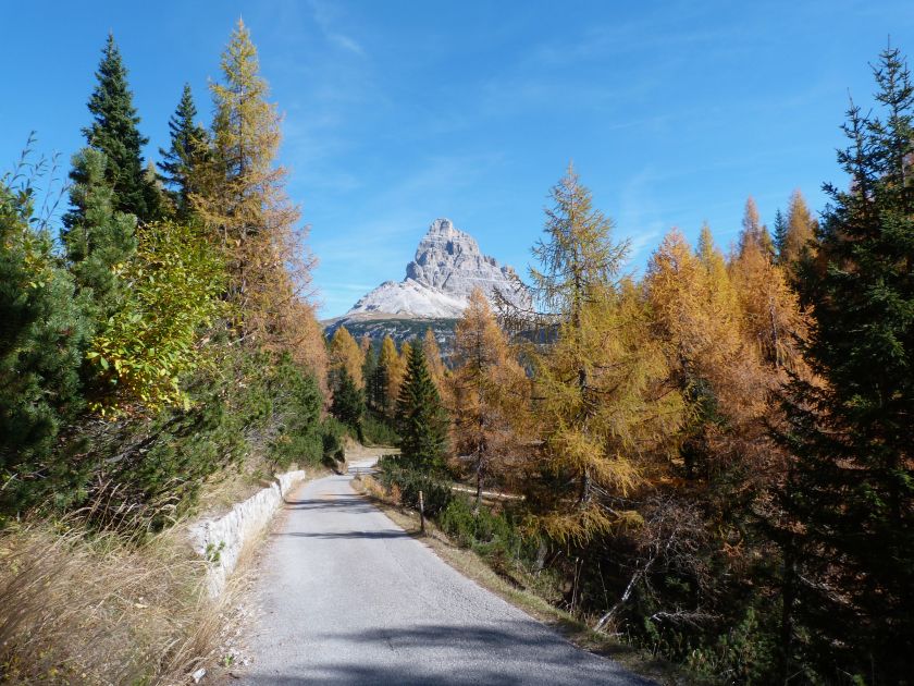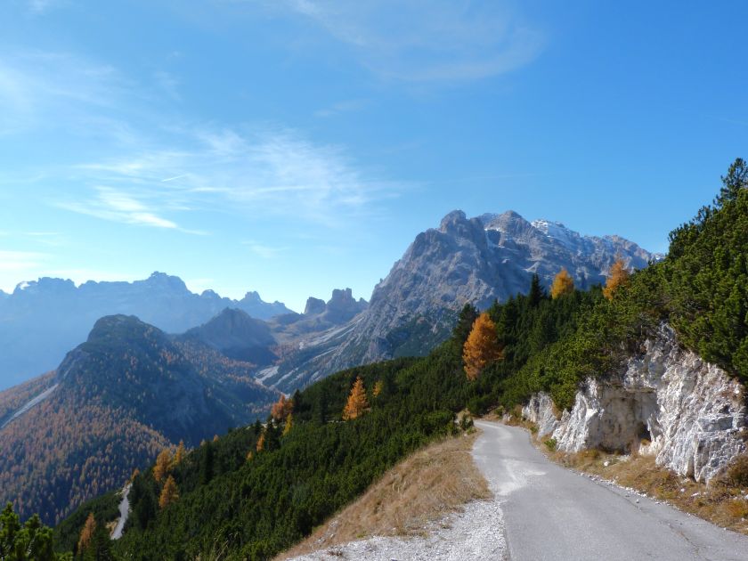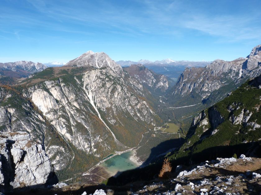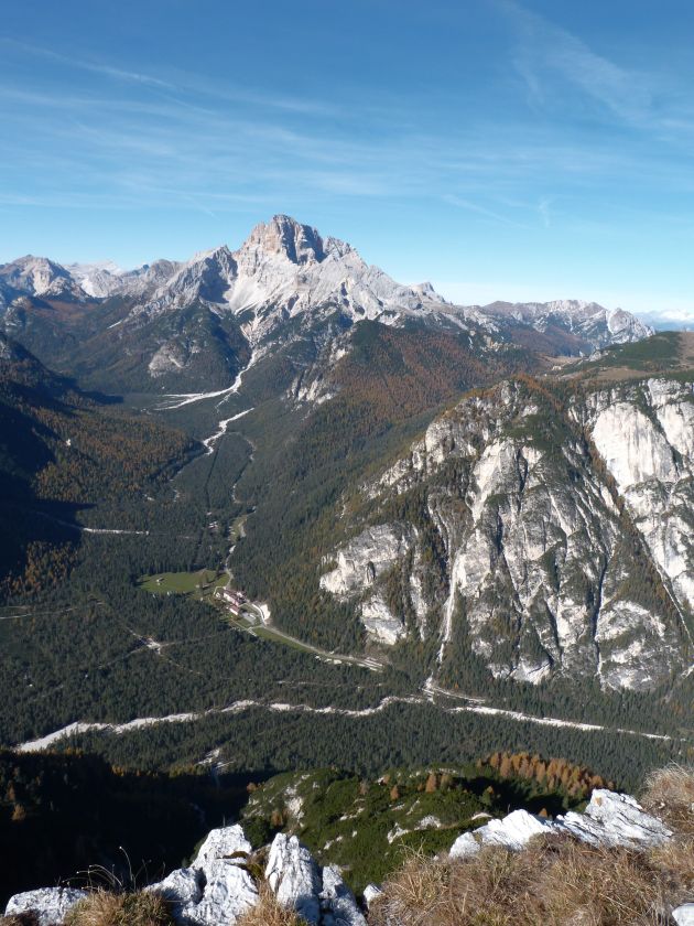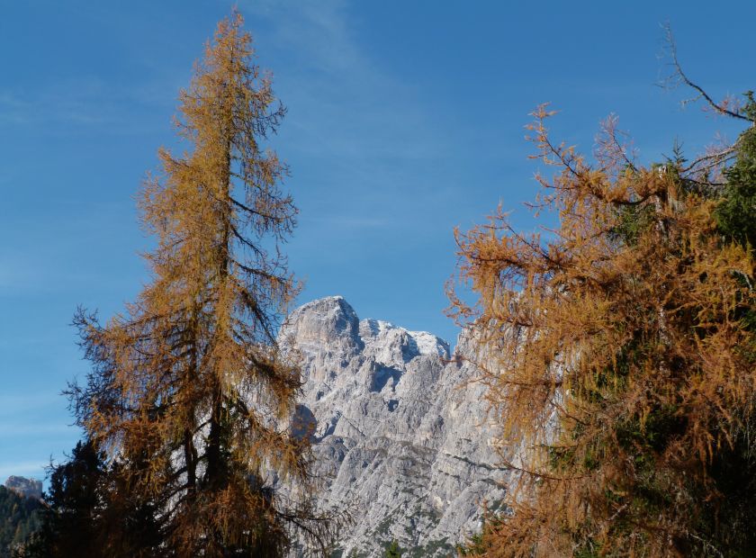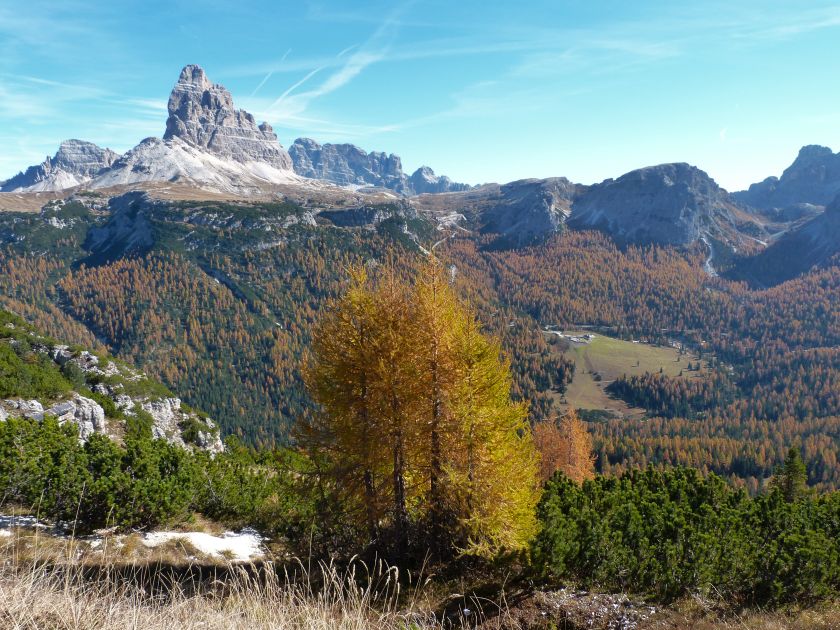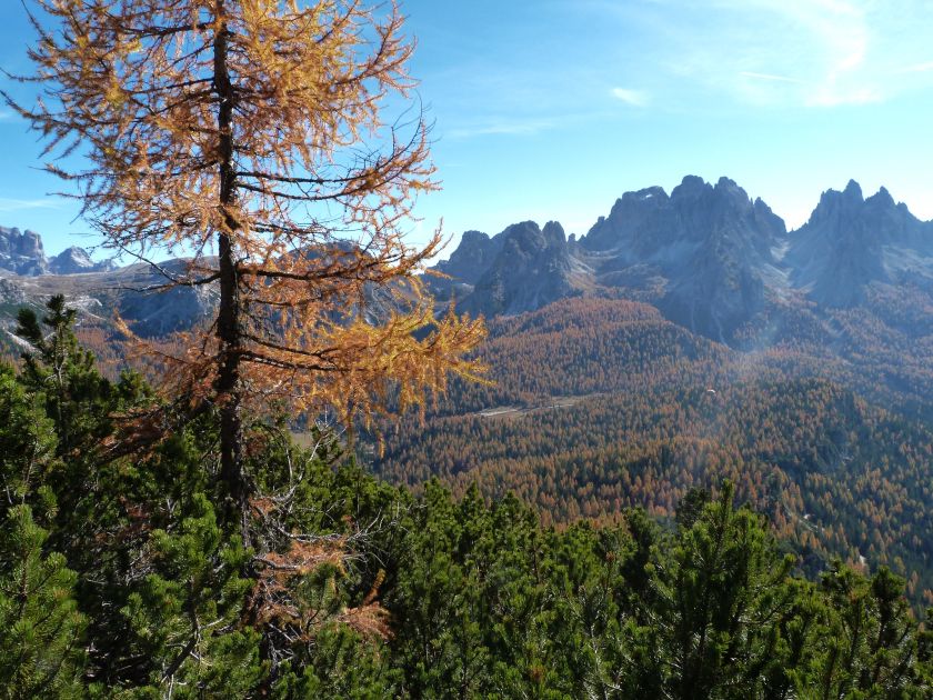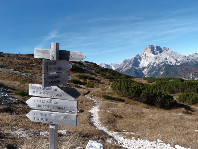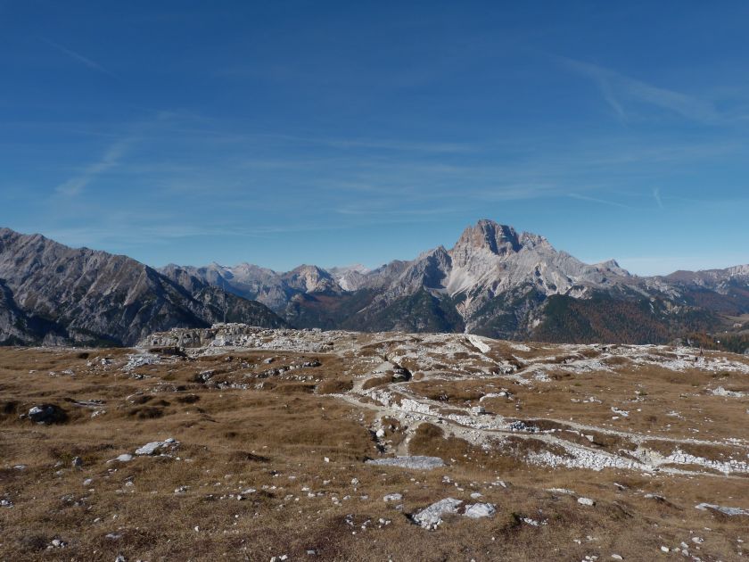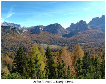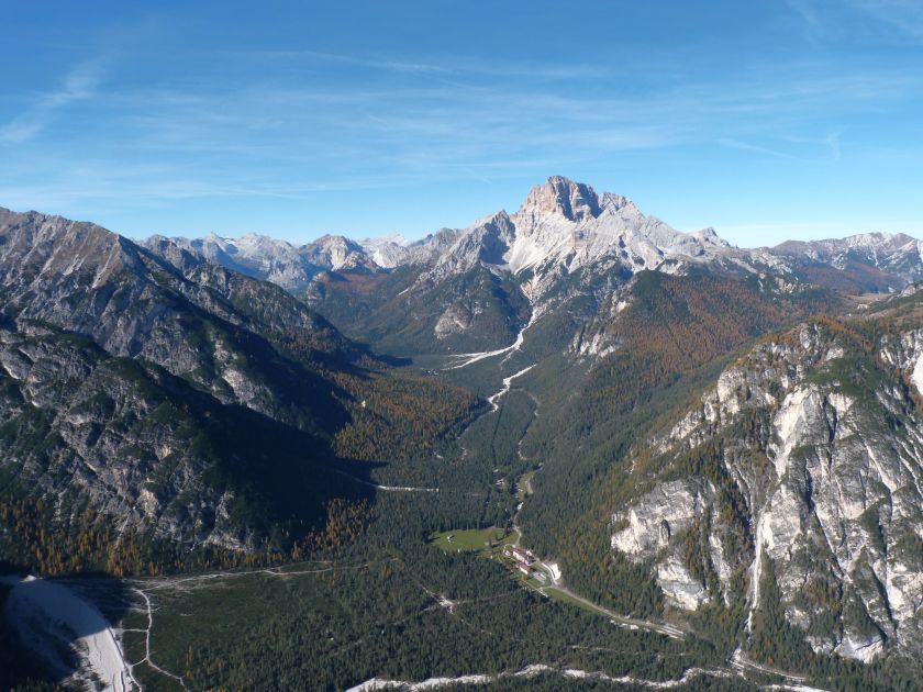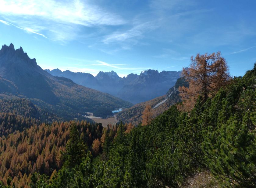 La presenza della coppia Monte Piana – Monte Piano è, nell’ambito delle Dolomiti, quanto meno bizzarra. Divise dalla poco marcata Forcella dei Castrati, sono due cime molto vicine fra loro e alte quasi uguali. A renderle atipiche se non uniche è la caratteristica di presentare delle sommità ampie e in pratica piatte. Le spianate sommitali contrastano con le precipiti pareti che le due montagne presentano verso occidente e verso settentrione. Trovandosi sulla loro vetta basta infatti spostarsi in queste direzioni per raggiungere il ciglio dell’impressionante baratro che precipita fino alla sottostante Val di Landro con l’omonimo lago e il paese di Carbonin. Due ambienti completamente opposti: quello delle praterie di vetta in contrasto con quello delle rupi strapiombanti. La coppia Monte Piana – Monte Piano è purtroppo famosa primariamente per le tragiche vicende che ne sconvolsero le pendici durante il Primo conflitto mondiale. In quest’area persero la vita qualcosa come 14000 soldati tra italiani e austro-ungarici. La salita, come descritta a seguire, tocca poco a valle di Monte Piana il Rifugio Bosi all’interno del quale è presente un piccolo museo privato che raccoglie fotografie, documenti e reperti della Grande Guerra. Proseguendo fin sul vasto pianoro del Monte Piana si osserva un impressionante reticolo di trincee, postazioni e gallerie riportate alla luce e ristrutturate permettendo un interessantissimo tour storico in un vero e proprio museo alla luce del sole. L’interesse dell’escursione è pertanto storico ma non è da meno il valore panoramico essendo osservabile dalle due sommità un grandioso panorama esteso alle vette circostanti tra le quali ricordiamo il Monte Cristallo e le Tre Cime di Lavaredo. Da notare che l’accesso al Monte Piana avviene per mezzo di una strada comunale asfaltata chiusa dal 1998 al traffico (anche delle biciclette) che ricalca quasi integralmente la vecchia strada militare costruita durante la guerra. Nel periodo estivo i 6 km di strada sono percorsi da un servizio di jeep-navetta a permettere un accesso fin troppo banale al Rifugio Bosi. L’interesse storico fa sì che l’area sia letteralmente presa d’assalto dai turisti. Nel nostro caso vi raccomandiamo l’ascesa in bassa stagione. Vi descriviamo la salita dal Lago d’Antorno toccando solo in parte la strada d’accesso che resta comunque sempre chiusa al traffico. Nella seconda metà di ottobre, in particolare, il silenzio torna ad avvolgere le cime permettendo un’esperienza decisamente più intima e meditativa. Avrete modo di osservare il foliage grazie ai lariceti che caratterizzano la parte inferiore del cammino. Tra i mille colori degli alberi e il silenzio talvolta malinconico del tardo autunno sembra incredibile pensare come quest’area sia stata muta testimone di uno dei più sanguinosi e violenti combattimenti della Prima Guerra Mondiale. Vi auguriamo di provare la pace e la meravigliosa solitudine che abbiamo provato noi risalendone lentamente i fianchi sino a godere dello spettacolare panorama di vetta. L’escursione in breve: Lago d’Antorno (m 1866) – Forcella Bassa (m 1880) - Forcella Àuta (m 1984) – Rifugio Monte Piana Angelo Bosi (m 2205) – Piramide Carducci (m 2323) – Monte Piana (m 2324) – Forcella de i Castrade (Forcella dei Castrati - m 2272) – Monte Piano (Croce di Dobbiaco – m 2305) Dati tecnici: Partenza dal Lago d’Antorno (m 1866): Difficoltà: E (Vai alla scala delle difficoltà). Segnaletica: totale. Dislivello assoluto: m 458. Dislivello realmente coperto in salita: m 550. Acqua potabile sul percorso: assente. Accesso alla partenza: Chi proviene da sud tocca il paese di Auronzo quindi sale al Lago di Misurina con la SR 48 delle Dolomiti. La strada segue la sponda occidentale del lago sino ad arrivare alla sua estremità settentrionale. Poco oltre troviamo sulla destra il bivio per le Tre Cime di Lavaredo. Abbandoniamo pertanto il proseguo che condurrebbe altrimenti a Carbonin e a Dobbiaco per volgere in questa direzione raggiungendo, dopo un paio di km, il bellissimo Lago d’Antorno posizionato a destra del piano stradale. Possiamo lasciare l’automobile nel parcheggio presso lo specchio d’acqua. Descrizione del percorso: Il Lago di Antorno (m 1866), punto iniziale della nostra escursione, merita senz’altro una visita percorrendo il breve sentiero che ne ricalca la sponda orientale. Le cime dei Cadini di Misurina e delle Tre Cime di Lavaredo si specchiano nelle sue acque in un ambiente ameno particolarmente apprezzabile in autunno quando è lontana la confusione del turismo agostano. Il sentiero appare a tratti agevolato da una bella passerella in legno che permette di superare senza difficoltà alcune frazioni torbose. Ritornati sulla strada asfaltata ne percorriamo un breve tratto in direzione delle Tre Cime di Lavaredo trovando, poco oltre, il cartello che segnala a sinistra il segnavia 122 diretto al Monte Piana e al Rifugio Bosi (m 1885 – ore 0,10 dalla partenza). Muoviamo in questa direzione con sentiero che si sviluppa, facile e con debole dislivello, nel folto del bosco di conifere. In breve accediamo alla Forcella Bassa (m 1880 – ore 0,25 dalla partenza) dove confluiamo in un’ampia forestale. Guidati dal cartello segnaletico procediamo verso destra su comoda carrareccia con tratti asfaltati osservando i primi scorci, tra le frasche dei larici e degli abeti, in direzione delle cime circostanti con specifico riferimento al Monte Cristallo e alle Tre Cime di Lavaredo. La forestale lambisce una zona prativa umida posta alla destra del tracciato quindi volgiamo verso nordovest scorgendo davanti a noi il Monte Piana che appare coperto nella fascia sommitale da una densa vegetazione a pino mugo. La salita resta nel complesso moderata. Nella seconda parte del mese di ottobre il cammino è allietato dalle sgargianti colorazioni dei larici a rendere affascinante un’ascesa che altrimenti potrebbe risultare
