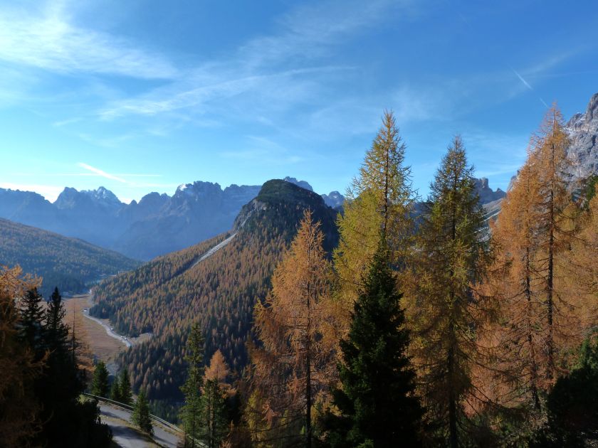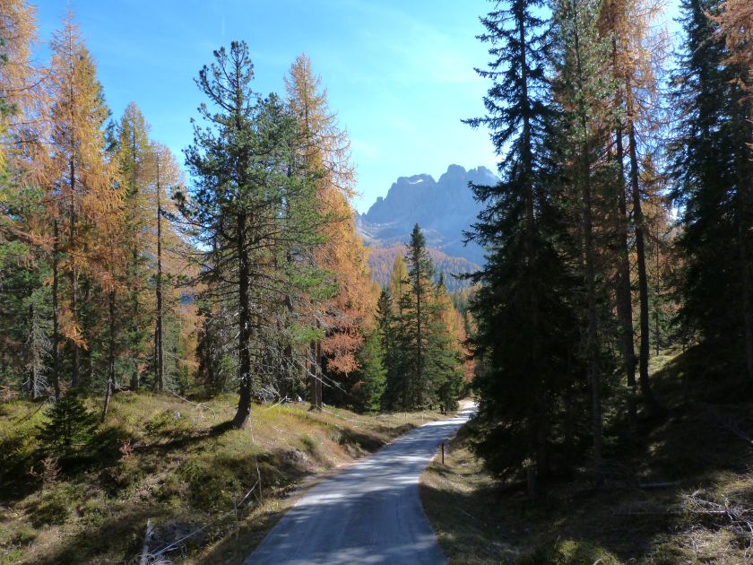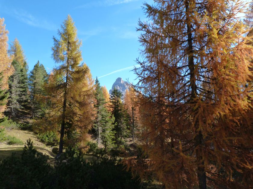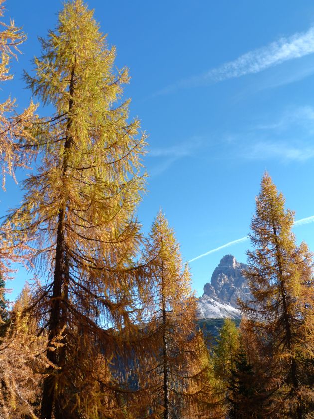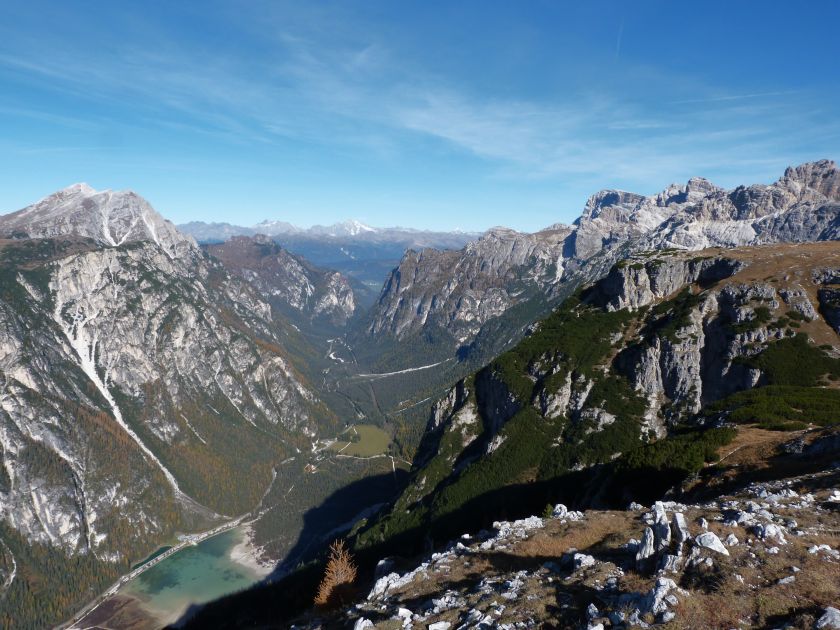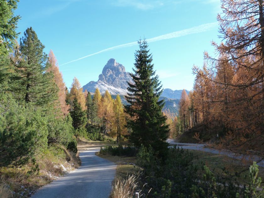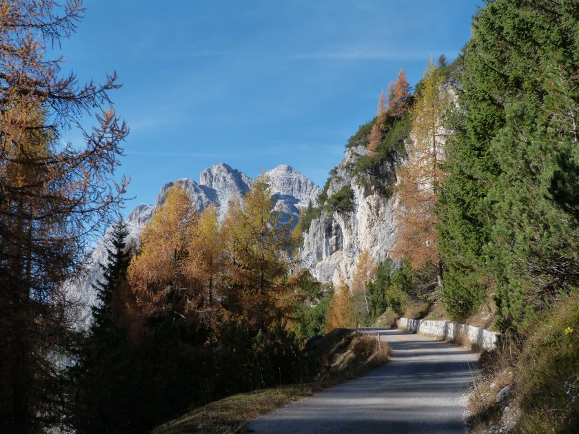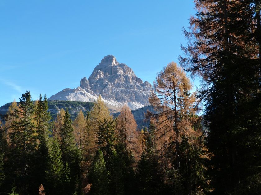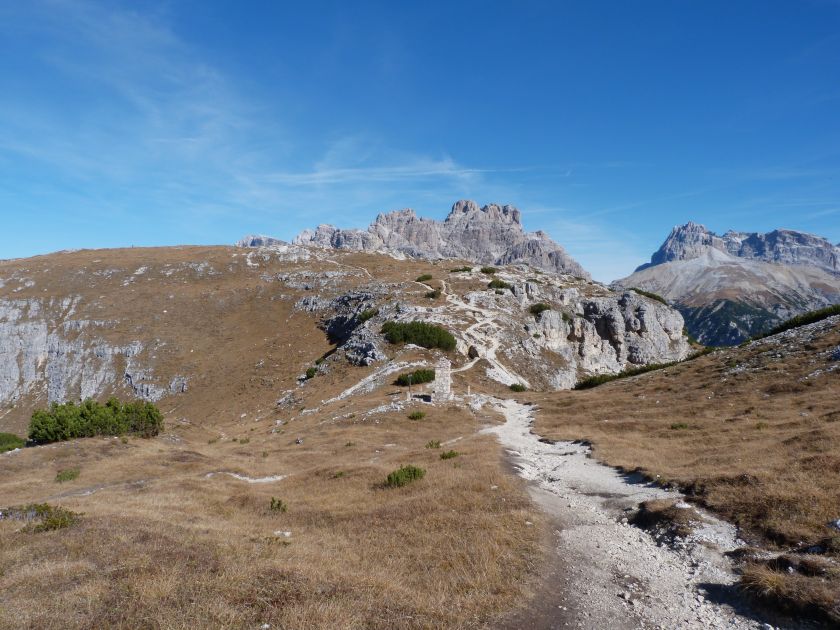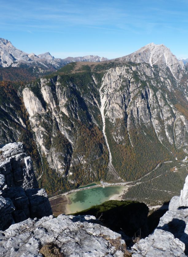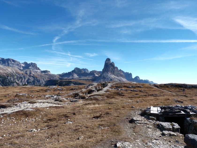 La presenza della coppia Monte Piana – Monte Piano è, nell’ambito delle Dolomiti, quanto meno bizzarra. Divise dalla poco marcata Forcella dei Castrati, sono due cime molto vicine fra loro e alte quasi uguali. A renderle atipiche se non uniche è la caratteristica di presentare delle sommità ampie e in pratica piatte. Le spianate sommitali contrastano con le precipiti pareti che le due montagne presentano verso occidente e verso settentrione. Trovandosi sulla loro vetta basta infatti spostarsi in queste direzioni per raggiungere il ciglio dell’impressionante baratro che precipita fino alla sottostante Val di Landro con l’omonimo lago e il paese di Carbonin. Due ambienti completamente opposti: quello delle praterie di vetta in contrasto con quello delle rupi strapiombanti. La coppia Monte Piana – Monte Piano è purtroppo famosa primariamente per le tragiche vicende che ne sconvolsero le pendici durante il Primo conflitto mondiale. In quest’area persero la vita qualcosa come 14000 soldati tra italiani e austro-ungarici. La salita, come descritta a seguire, tocca poco a valle di Monte Piana il Rifugio Bosi all’interno del quale è presente un piccolo museo privato che raccoglie fotografie, documenti e reperti della Grande Guerra. Proseguendo fin sul vasto pianoro del Monte Piana si osserva un impressionante reticolo di trincee, postazioni e gallerie riportate alla luce e ristrutturate permettendo un interessantissimo tour storico in un vero e proprio museo alla luce del sole. L’interesse dell’escursione è pertanto storico ma non è da meno il valore panoramico essendo osservabile dalle due sommità un grandioso panorama esteso alle vette circostanti tra le quali ricordiamo il Monte Cristallo e le Tre Cime di Lavaredo. Da notare che l’accesso al Monte Piana avviene per mezzo di una strada comunale asfaltata chiusa dal 1998 al traffico (anche delle biciclette) che ricalca quasi integralmente la vecchia strada militare costruita durante la guerra. Nel periodo estivo i 6 km di strada sono percorsi da un servizio di jeep-navetta a permettere un accesso fin troppo banale al Rifugio Bosi. L’interesse storico fa sì che l’area sia letteralmente presa d’assalto dai turisti. Nel nostro caso vi raccomandiamo l’ascesa in bassa stagione. Vi descriviamo la salita dal Lago d’Antorno toccando solo in parte la strada d’accesso che resta comunque sempre chiusa al traffico. Nella seconda metà di ottobre, in particolare, il silenzio torna ad avvolgere le cime permettendo un’esperienza decisamente più intima e meditativa. Avrete modo di osservare il foliage grazie ai lariceti che caratterizzano la parte inferiore del cammino. Tra i mille colori degli alberi e il silenzio talvolta malinconico del tardo autunno sembra incredibile pensare come quest’area sia stata muta testimone di uno dei più sanguinosi e violenti combattimenti della Prima Guerra Mondiale. Vi auguriamo di provare la pace e la meravigliosa solitudine che abbiamo provato noi risalendone lentamente i fianchi sino a godere dello spettacolare panorama di vetta. L’escursione in breve: Lago d’Antorno (m 1866) – Forcella Bassa (m 1880) - Forcella Àuta (m 1984) – Rifugio Monte Piana Angelo Bosi (m 2205) – Piramide Carducci (m 2323) – Monte Piana (m 2324) – Forcella de i Castrade (Forcella dei Castrati - m 2272) – Monte Piano (Croce di Dobbiaco – m 2305) Dati tecnici: Partenza dal Lago d’Antorno (m 1866): Difficoltà: E (Vai alla scala delle difficoltà). Segnaletica: totale. Dislivello assoluto: m 458. Dislivello realmente coperto in salita: m 550. Acqua potabile sul percorso: assente. Accesso alla partenza: Chi proviene da sud tocca il paese di Auronzo quindi sale al Lago di Misurina con la SR 48 delle Dolomiti. La strada segue la sponda occidentale del lago sino ad arrivare alla sua estremità settentrionale. Poco oltre troviamo sulla destra il bivio per le Tre Cime di Lavaredo. Abbandoniamo pertanto il proseguo che condurrebbe altrimenti a Carbonin e a Dobbiaco per volgere in questa direzione raggiungendo, dopo un paio di km, il bellissimo Lago d’Antorno posizionato a destra del piano stradale. Possiamo lasciare l’automobile nel parcheggio presso lo specchio d’acqua. Descrizione del percorso: Il Lago di Antorno (m 1866), punto iniziale della nostra escursione, merita senz’altro una visita percorrendo il breve sentiero che ne ricalca la sponda orientale. Le cime dei Cadini di Misurina e delle Tre Cime di Lavaredo si specchiano nelle sue acque in un ambiente ameno particolarmente apprezzabile in autunno quando è lontana la confusione del turismo agostano. Il sentiero appare a tratti agevolato da una bella passerella in legno che permette di superare senza difficoltà alcune frazioni torbose. Ritornati sulla strada asfaltata ne percorriamo un breve tratto in direzione delle Tre Cime di Lavaredo trovando, poco oltre, il cartello che segnala a sinistra il segnavia 122 diretto al Monte Piana e al Rifugio Bosi (m 1885 – ore 0,10 dalla partenza). Muoviamo in questa direzione con sentiero che si sviluppa, facile e con debole dislivello, nel folto del bosco di conifere. In breve accediamo alla Forcella Bassa (m 1880 – ore 0,25 dalla partenza) dove confluiamo in un’ampia forestale. Guidati dal cartello segnaletico procediamo verso destra su comoda carrareccia con tratti asfaltati osservando i primi scorci, tra le frasche dei larici e degli abeti, in direzione delle cime circostanti con specifico riferimento al Monte Cristallo e alle Tre Cime di Lavaredo. La forestale lambisce una zona prativa umida posta alla destra del tracciato quindi volgiamo verso nordovest scorgendo davanti a noi il Monte Piana che appare coperto nella fascia sommitale da una densa vegetazione a pino mugo. La salita resta nel complesso moderata. Nella seconda parte del mese di ottobre il cammino è allietato dalle sgargianti colorazioni dei larici a rendere affascinante un’ascesa che altrimenti potrebbe risultare