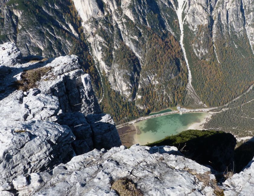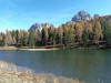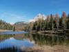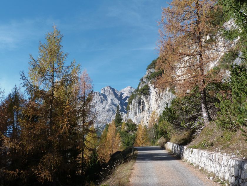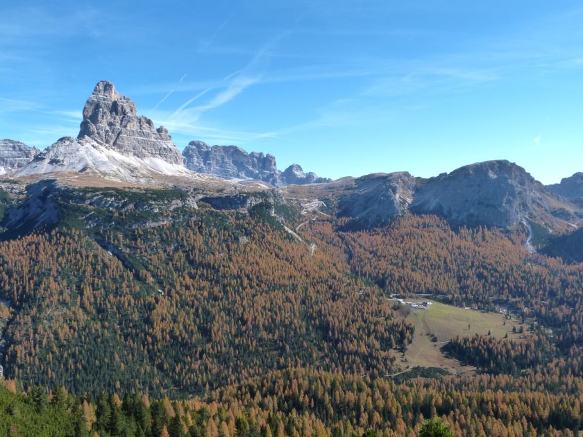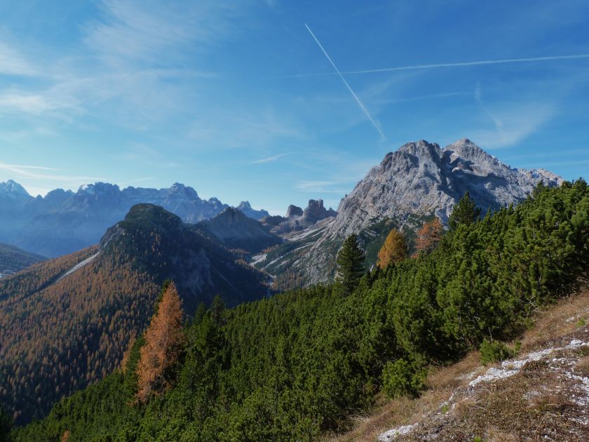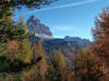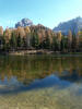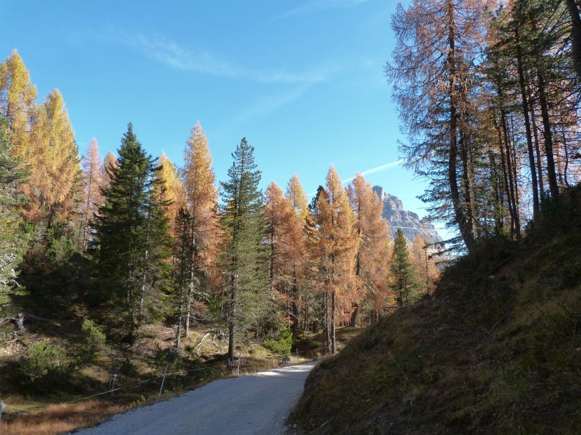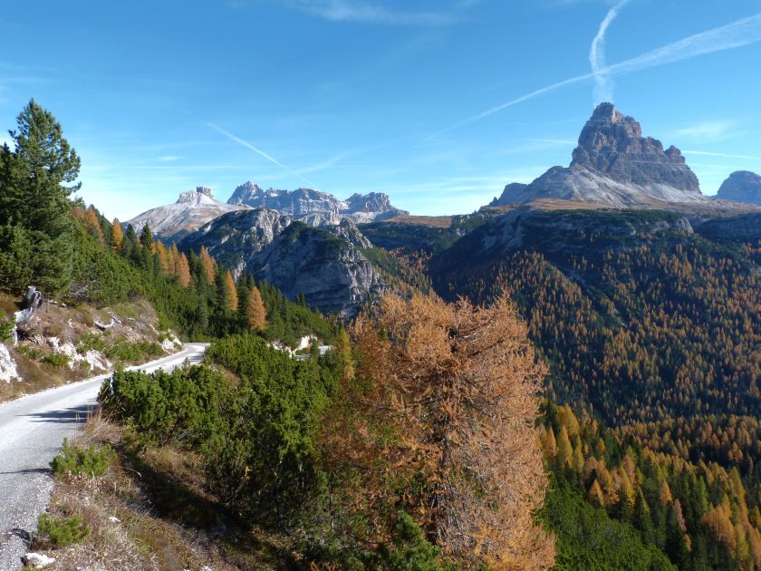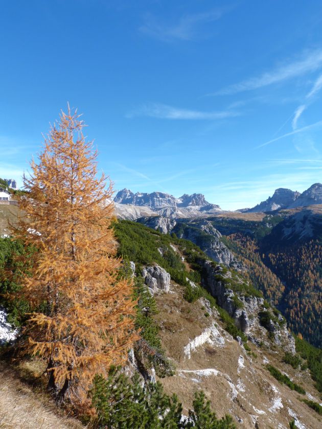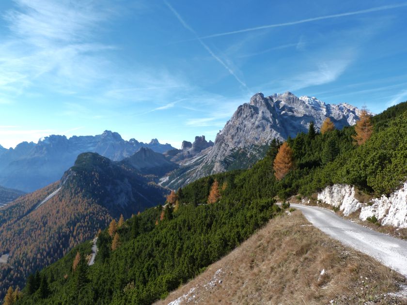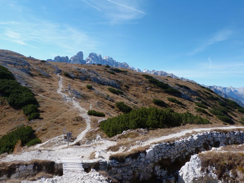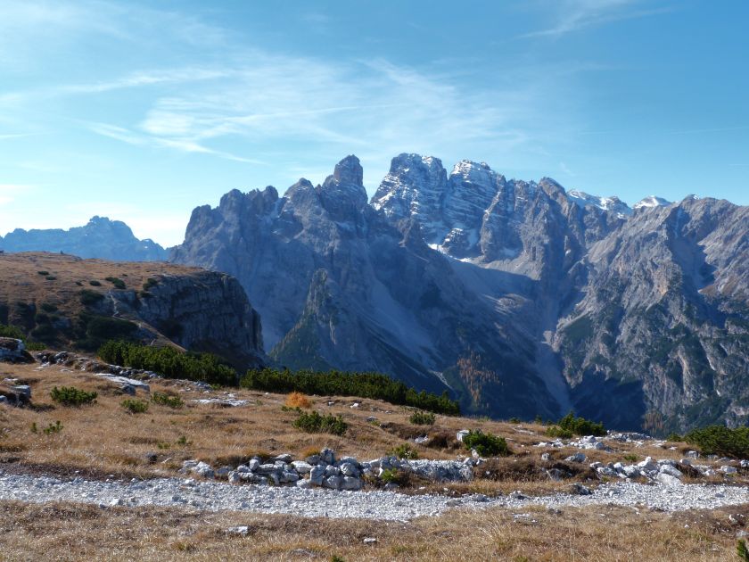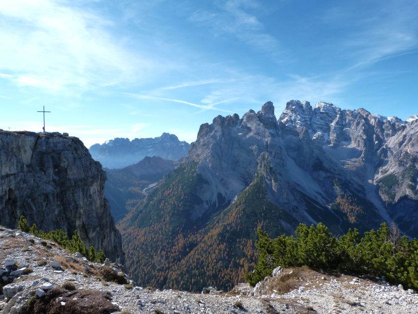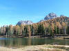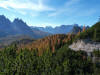 La presenza della coppia Monte Piana – Monte Piano è, nell’ambito delle Dolomiti, quanto meno bizzarra. Divise dalla poco marcata Forcella dei Castrati, sono due cime molto vicine fra loro e alte quasi uguali. A renderle atipiche se non uniche è la caratteristica di presentare delle sommità ampie e in pratica piatte. Le spianate sommitali contrastano con le precipiti pareti che le due montagne presentano verso occidente e verso settentrione. Trovandosi sulla loro vetta basta infatti spostarsi in queste direzioni per raggiungere il ciglio dell’impressionante baratro che precipita fino alla sottostante Val di Landro con l’omonimo lago e il paese di Carbonin. Due ambienti completamente opposti: quello delle praterie di vetta in contrasto con quello delle rupi strapiombanti. La coppia Monte Piana – Monte Piano è purtroppo famosa primariamente per le tragiche vicende che ne sconvolsero le pendici durante il Primo conflitto mondiale. In quest’area persero la vita qualcosa come 14000 soldati tra italiani e austro-ungarici. La salita, come descritta a seguire, tocca poco a valle di Monte Piana il Rifugio Bosi all’interno del quale è presente un piccolo museo privato che raccoglie fotografie, documenti e reperti della Grande Guerra. Proseguendo fin sul vasto pianoro del Monte Piana si osserva un impressionante reticolo di trincee, postazioni e gallerie riportate alla luce e ristrutturate permettendo un interessantissimo tour storico in un vero e proprio museo alla luce del sole. L’interesse dell’escursione è pertanto storico ma non è da meno il valore panoramico essendo osservabile dalle due sommità un grandioso panorama esteso alle vette circostanti tra le quali ricordiamo il Monte Cristallo e le Tre Cime di Lavaredo. Da notare che l’accesso al Monte Piana avviene per mezzo di una strada comunale asfaltata chiusa dal 1998 al traffico (anche delle biciclette) che ricalca quasi integralmente la vecchia strada militare costruita durante la guerra. Nel periodo estivo i 6 km di strada sono percorsi da un servizio di jeep-navetta a permettere un accesso fin troppo banale al Rifugio Bosi. L’interesse storico fa sì che l’area sia letteralmente presa d’assalto dai turisti. Nel nostro caso vi raccomandiamo l’ascesa in bassa stagione. Vi descriviamo la salita dal Lago d’Antorno toccando solo in parte la strada d’accesso che resta comunque sempre chiusa al traffico. Nella seconda metà di ottobre, in particolare, il silenzio torna ad avvolgere le cime permettendo un’esperienza decisamente più intima e meditativa. Avrete modo di osservare il foliage grazie ai lariceti che caratterizzano la parte inferiore del cammino. Tra i mille colori degli alberi e il silenzio talvolta malinconico del tardo autunno sembra incredibile pensare come quest’area sia stata muta testimone di uno dei più sanguinosi e violenti combattimenti della Prima Guerra Mondiale. Vi auguriamo di provare la pace e la meravigliosa solitudine che abbiamo provato noi risalendone lentamente i fianchi sino a godere dello spettacolare panorama di vetta. L’escursione in breve: Lago d’Antorno (m 1866) – Forcella Bassa (m 1880) - Forcella Àuta (m 1984) – Rifugio Monte Piana Angelo Bosi (m 2205) – Piramide Carducci (m 2323) – Monte Piana (m 2324) – Forcella de i Castrade (Forcella dei Castrati - m 2272) – Monte Piano (Croce di Dobbiaco – m 2305) Dati tecnici: Partenza dal Lago d’Antorno (m 1866): Difficoltà: E (Vai alla scala delle difficoltà). Segnaletica: totale. Dislivello assoluto: m 458. Dislivello realmente coperto in salita: m 550. Acqua potabile sul percorso: assente. Accesso alla partenza: Chi proviene da sud tocca il paese di Auronzo quindi sale al Lago di Misurina con la SR 48 delle Dolomiti. La strada segue la sponda occidentale del lago sino ad arrivare alla sua estremità settentrionale. Poco oltre troviamo sulla destra il bivio per le Tre Cime di Lavaredo. Abbandoniamo pertanto il proseguo che condurrebbe altrimenti a Carbonin e a Dobbiaco per volgere in questa direzione raggiungendo, dopo un paio di km, il bellissimo Lago d’Antorno posizionato a destra del piano stradale. Possiamo lasciare l’automobile nel parcheggio presso lo specchio d’acqua. Descrizione del percorso: Il Lago di Antorno (m 1866), punto iniziale della nostra escursione, merita senz’altro una visita percorrendo il breve sentiero che ne ricalca la sponda orientale. Le cime dei Cadini di Misurina e delle Tre Cime di Lavaredo si specchiano nelle sue acque in un ambiente ameno particolarmente apprezzabile in autunno quando è lontana la confusione del turismo agostano. Il sentiero appare a tratti agevolato da una bella passerella in legno che permette di superare senza difficoltà alcune frazioni torbose. Ritornati sulla strada asfaltata ne percorriamo un breve tratto in direzione delle Tre Cime di Lavaredo trovando, poco oltre, il cartello che segnala a sinistra il segnavia 122 diretto al Monte Piana e al Rifugio Bosi (m 1885 – ore 0,10 dalla partenza). Muoviamo in questa direzione con sentiero che si sviluppa, facile e con debole dislivello, nel folto del bosco di conifere. In breve accediamo alla Forcella Bassa (m 1880 – ore 0,25 dalla partenza) dove confluiamo in un’ampia forestale. Guidati dal cartello segnaletico procediamo verso destra su comoda carrareccia con tratti asfaltati osservando i primi scorci, tra le frasche dei larici e degli abeti, in direzione delle cime circostanti con specifico riferimento al Monte Cristallo e alle Tre Cime di Lavaredo. La forestale lambisce una zona prativa umida posta alla destra del tracciato quindi volgiamo verso nordovest scorgendo davanti a noi il Monte Piana che appare coperto nella fascia sommitale da una densa vegetazione a pino mugo. La salita resta nel complesso moderata. Nella seconda parte del mese di ottobre il cammino è allietato dalle sgargianti colorazioni dei larici a rendere affascinante un’ascesa che altrimenti potrebbe risultare