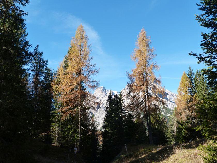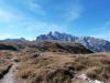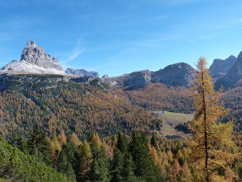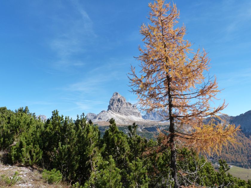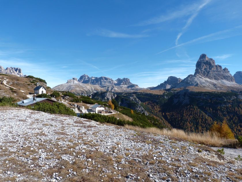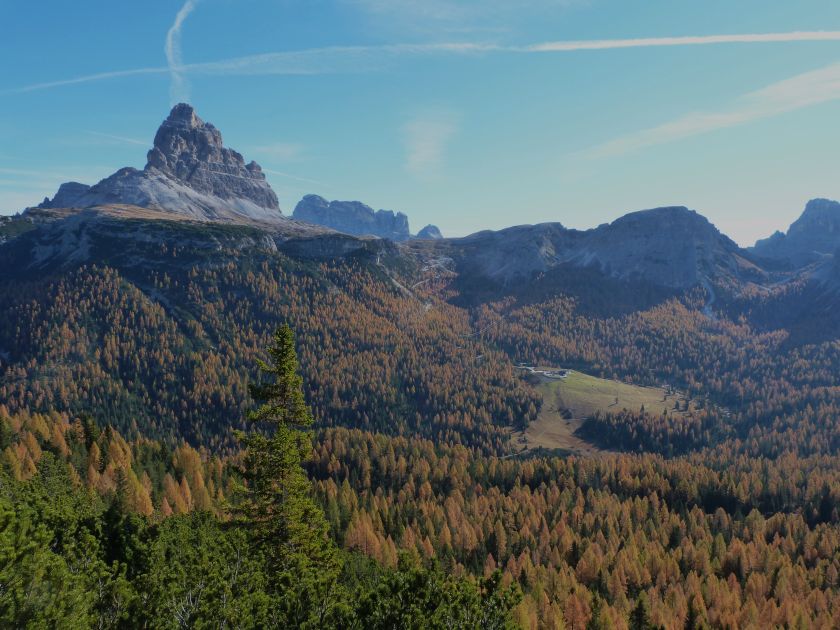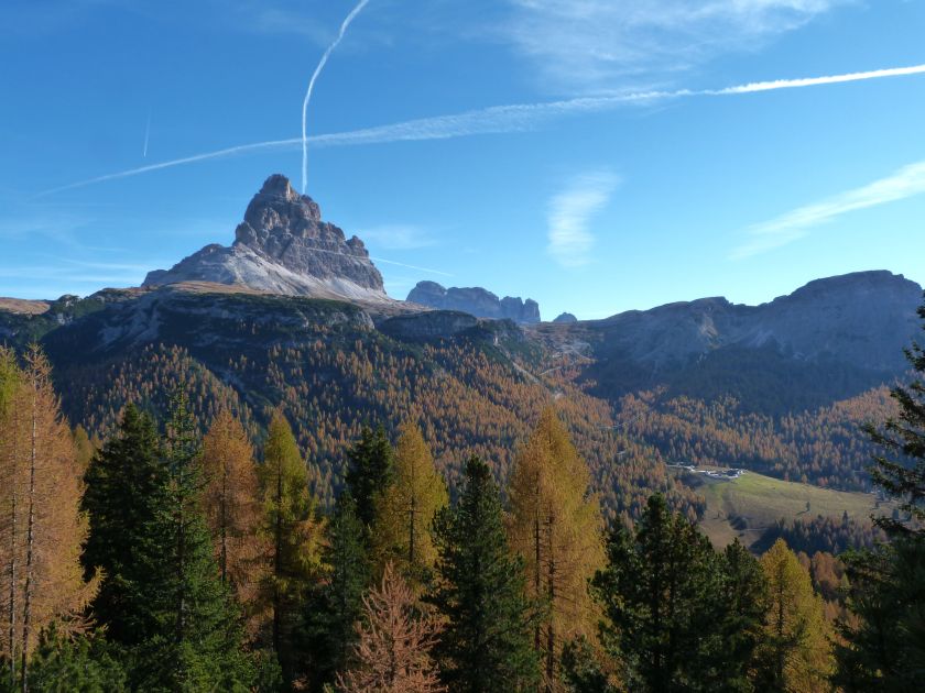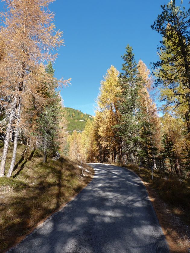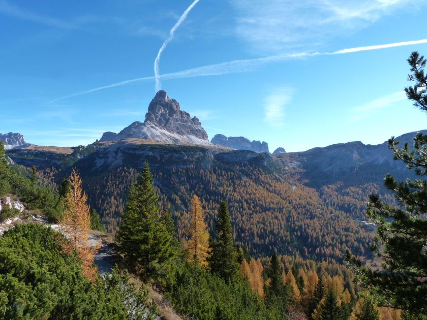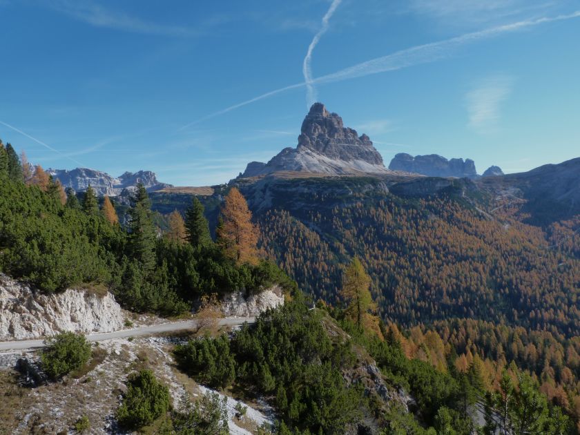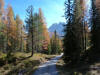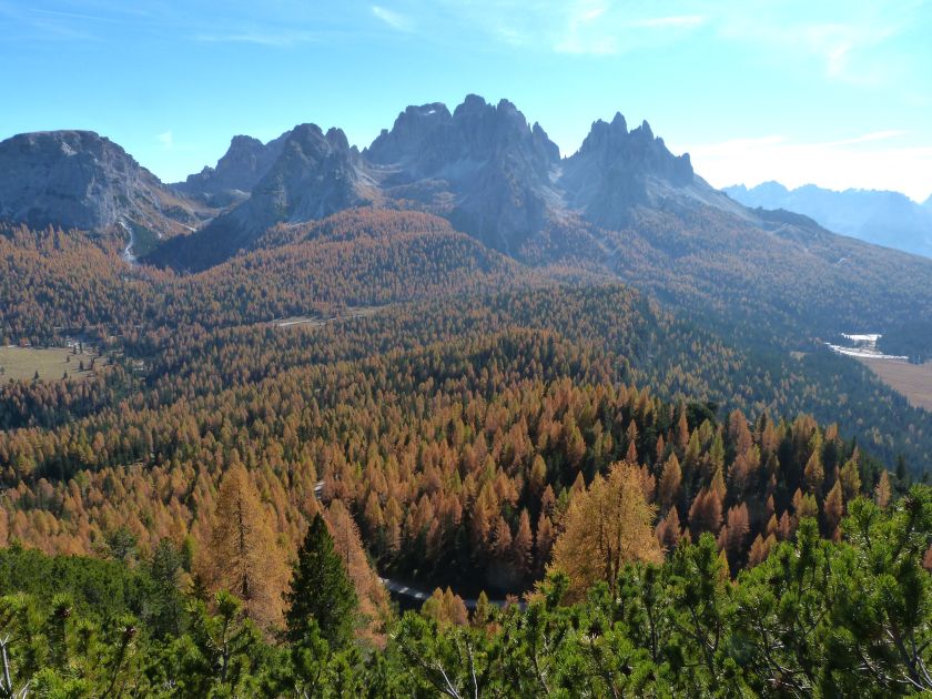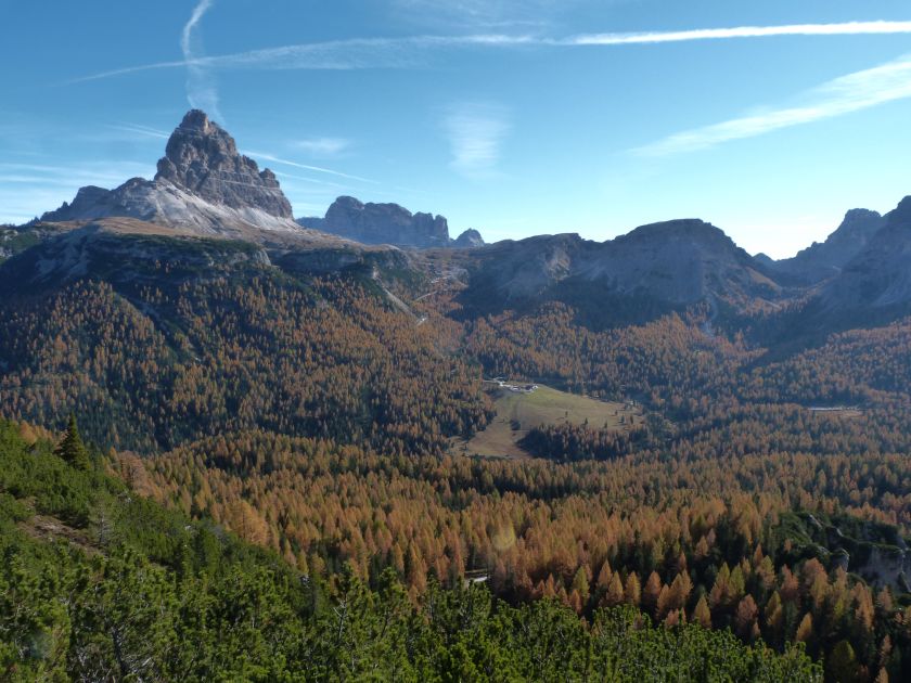 La presenza della coppia Monte Piana – Monte Piano è, nell’ambito delle Dolomiti, quanto meno bizzarra. Divise dalla poco marcata Forcella dei Castrati, sono due cime molto vicine fra loro e alte quasi uguali. A renderle atipiche se non uniche è la caratteristica di presentare delle sommità ampie e in pratica piatte. Le spianate sommitali contrastano con le precipiti pareti che le due montagne presentano verso occidente e verso settentrione. Trovandosi sulla loro vetta basta infatti spostarsi in queste direzioni per raggiungere il ciglio dell’impressionante baratro che precipita fino alla sottostante Val di Landro con l’omonimo lago e il paese di Carbonin. Due ambienti completamente opposti: quello delle praterie di vetta in contrasto con quello delle rupi strapiombanti. La coppia Monte Piana – Monte Piano è purtroppo famosa primariamente per le tragiche vicende che ne sconvolsero le pendici durante il Primo conflitto mondiale. In quest’area persero la vita qualcosa come 14000 soldati tra italiani e austro-ungarici. La salita, come descritta a seguire, tocca poco a valle di Monte Piana il Rifugio Bosi all’interno del quale è presente un piccolo museo privato che raccoglie fotografie, documenti e reperti della Grande Guerra. Proseguendo fin sul vasto pianoro del Monte Piana si osserva un impressionante reticolo di trincee, postazioni e gallerie riportate alla luce e ristrutturate permettendo un interessantissimo tour storico in un vero e proprio museo alla luce del sole. L’interesse dell’escursione è pertanto storico ma non è da meno il valore panoramico essendo osservabile dalle due sommità un grandioso panorama esteso alle vette circostanti tra le quali ricordiamo il Monte Cristallo e le Tre Cime di Lavaredo. Da notare che l’accesso al Monte Piana avviene per mezzo di una strada comunale asfaltata chiusa dal 1998 al traffico (anche delle biciclette) che ricalca quasi integralmente la vecchia strada militare costruita durante la guerra. Nel periodo estivo i 6 km di strada sono percorsi da un servizio di jeep-navetta a permettere un accesso fin troppo banale al Rifugio Bosi. L’interesse storico fa sì che l’area sia letteralmente presa d’assalto dai turisti. Nel nostro caso vi raccomandiamo l’ascesa in bassa stagione. Vi descriviamo la salita dal Lago d’Antorno toccando solo in parte la strada d’accesso che resta comunque sempre chiusa al traffico. Nella seconda metà di ottobre, in particolare, il silenzio torna ad avvolgere le cime permettendo un’esperienza decisamente più intima e meditativa. Avrete modo di osservare il foliage grazie ai lariceti che caratterizzano la parte inferiore del cammino. Tra i mille colori degli alberi e il silenzio talvolta malinconico del tardo autunno sembra incredibile pensare come quest’area sia stata muta testimone di uno dei più sanguinosi e violenti combattimenti della Prima Guerra Mondiale. Vi auguriamo di provare la pace e la meravigliosa solitudine che abbiamo provato noi risalendone lentamente i fianchi sino a godere dello spettacolare panorama di vetta. L’escursione in breve: Lago d’Antorno (m 1866) – Forcella Bassa (m 1880) - Forcella Àuta (m 1984) – Rifugio Monte Piana Angelo Bosi (m 2205) – Piramide Carducci (m 2323) – Monte Piana (m 2324) – Forcella de i Castrade (Forcella dei Castrati - m 2272) – Monte Piano (Croce di Dobbiaco – m 2305) Dati tecnici: Partenza dal Lago d’Antorno (m 1866): Difficoltà: E (Vai alla scala delle difficoltà). Segnaletica: totale. Dislivello assoluto: m 458. Dislivello realmente coperto in salita: m 550. Acqua potabile sul percorso: assente. Accesso alla partenza: Chi proviene da sud tocca il paese di Auronzo quindi sale al Lago di Misurina con la SR 48 delle Dolomiti. La strada segue la sponda occidentale del lago sino ad arrivare alla sua estremità settentrionale. Poco oltre troviamo sulla destra il bivio per le Tre Cime di Lavaredo. Abbandoniamo pertanto il proseguo che condurrebbe altrimenti a Carbonin e a Dobbiaco per volgere in questa direzione raggiungendo, dopo un paio di km, il bellissimo Lago d’Antorno posizionato a destra del piano stradale. Possiamo lasciare l’automobile nel parcheggio presso lo specchio d’acqua. Descrizione del percorso: Il Lago di Antorno (m 1866), punto iniziale della nostra escursione, merita senz’altro una visita percorrendo il breve sentiero che ne ricalca la sponda orientale. Le cime dei Cadini di Misurina e delle Tre Cime di Lavaredo si specchiano nelle sue acque in un ambiente ameno particolarmente apprezzabile in autunno quando è lontana la confusione del turismo agostano. Il sentiero appare a tratti agevolato da una bella passerella in legno che permette di superare senza difficoltà alcune frazioni torbose. Ritornati sulla strada asfaltata ne percorriamo un breve tratto in direzione delle Tre Cime di Lavaredo trovando, poco oltre, il cartello che segnala a sinistra il segnavia 122 diretto al Monte Piana e al Rifugio Bosi (m 1885 – ore 0,10 dalla partenza). Muoviamo in questa direzione con sentiero che si sviluppa, facile e con debole dislivello, nel folto del bosco di conifere. In breve accediamo alla Forcella Bassa (m 1880 – ore 0,25 dalla partenza) dove confluiamo in un’ampia forestale. Guidati dal cartello segnaletico procediamo verso destra su comoda carrareccia con tratti asfaltati osservando i primi scorci, tra le frasche dei larici e degli abeti, in direzione delle cime circostanti con specifico riferimento al Monte Cristallo e alle Tre Cime di Lavaredo. La forestale lambisce una zona prativa umida posta alla destra del tracciato quindi volgiamo verso nordovest scorgendo davanti a noi il Monte Piana che appare coperto nella fascia sommitale da una densa vegetazione a pino mugo. La salita resta nel complesso moderata. Nella seconda parte del mese di ottobre il cammino è allietato dalle sgargianti colorazioni dei larici a rendere affascinante un’ascesa che altrimenti potrebbe risultare
