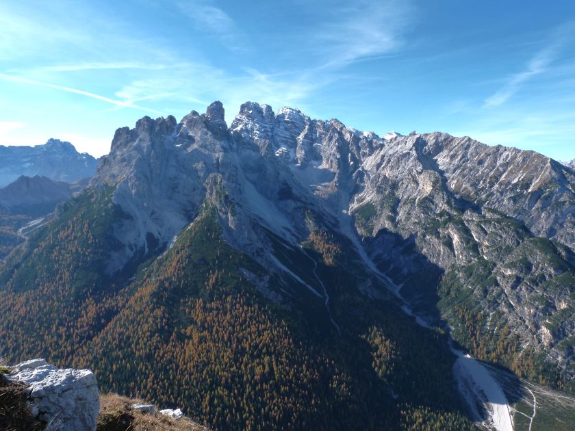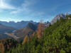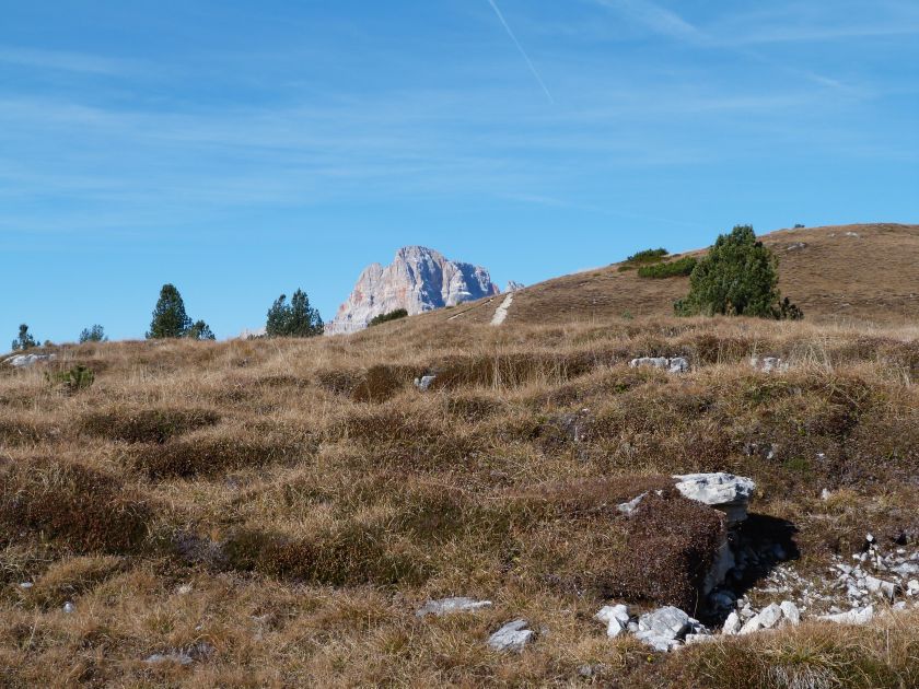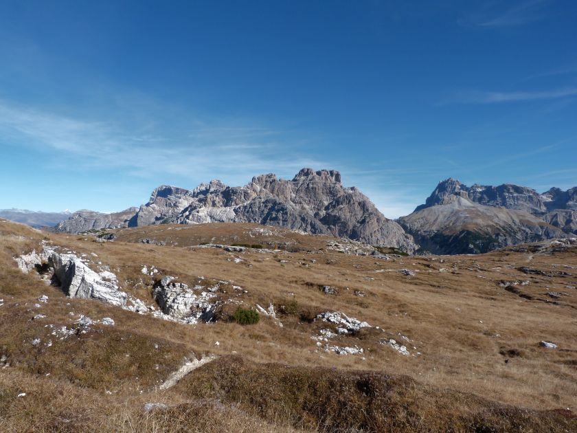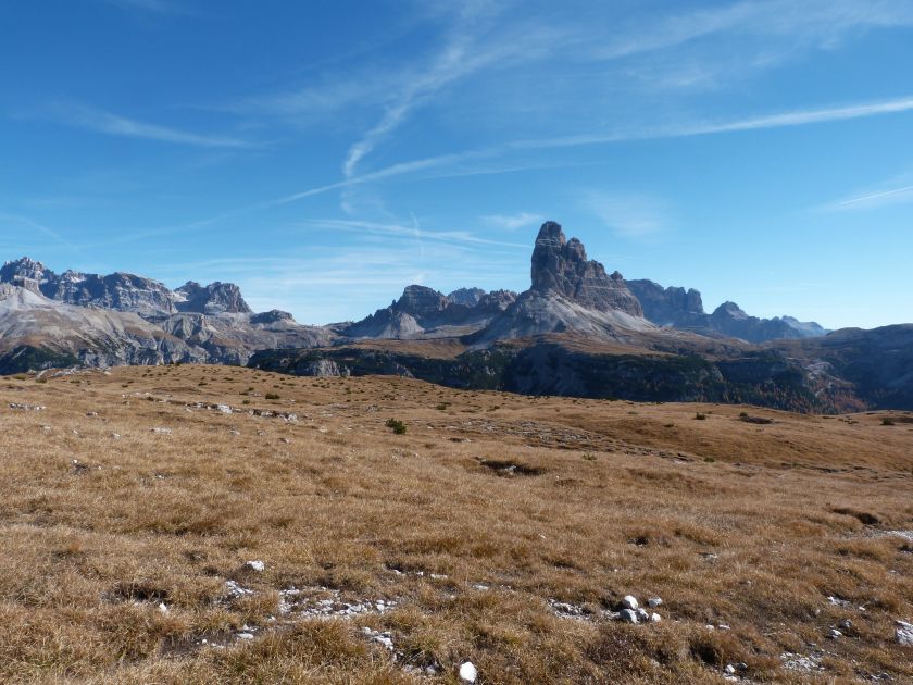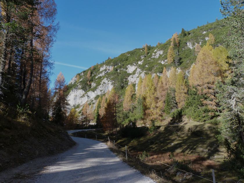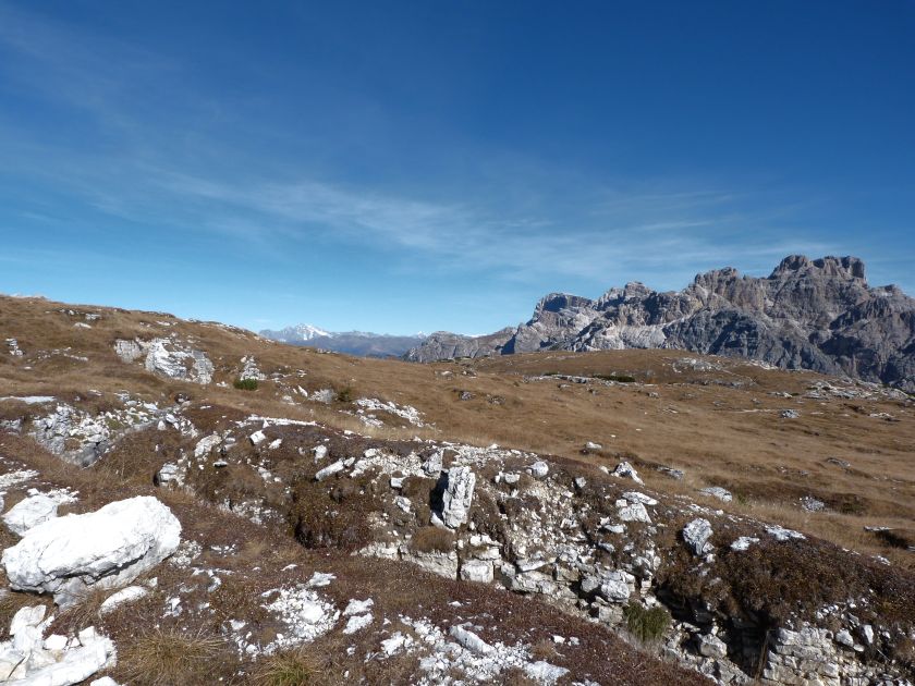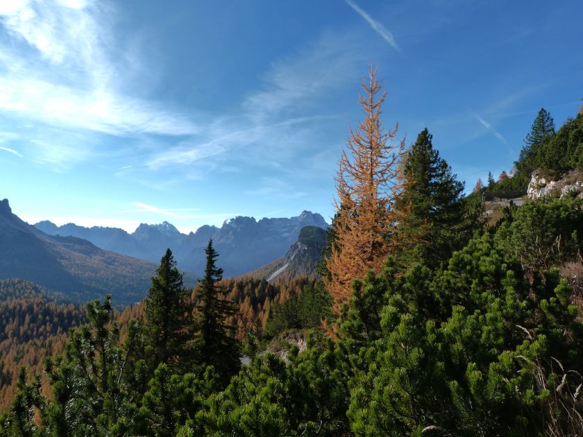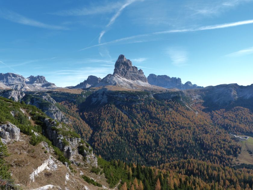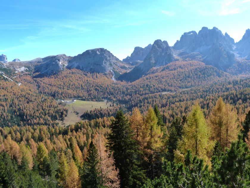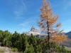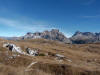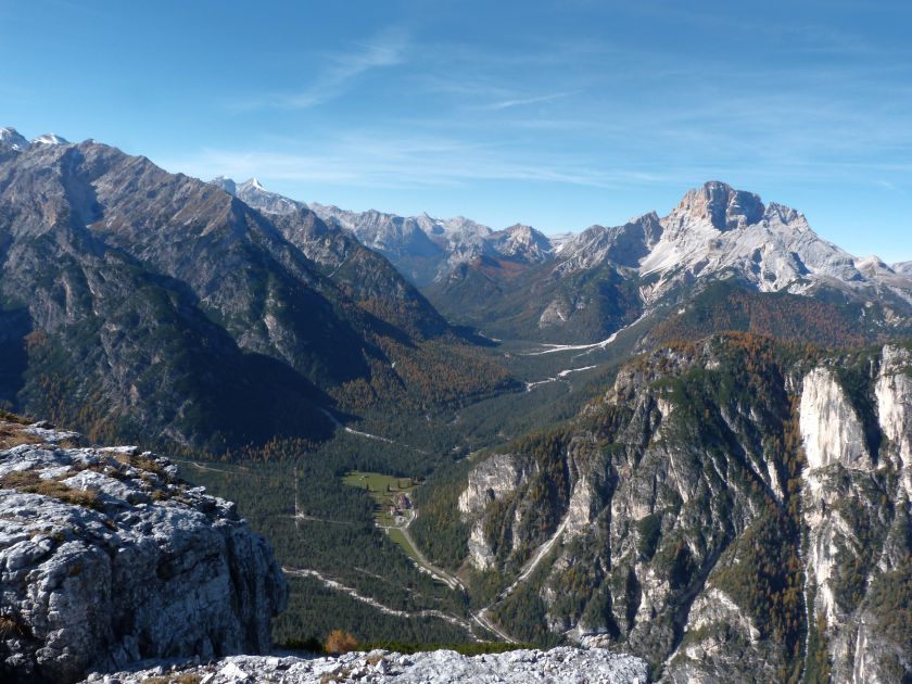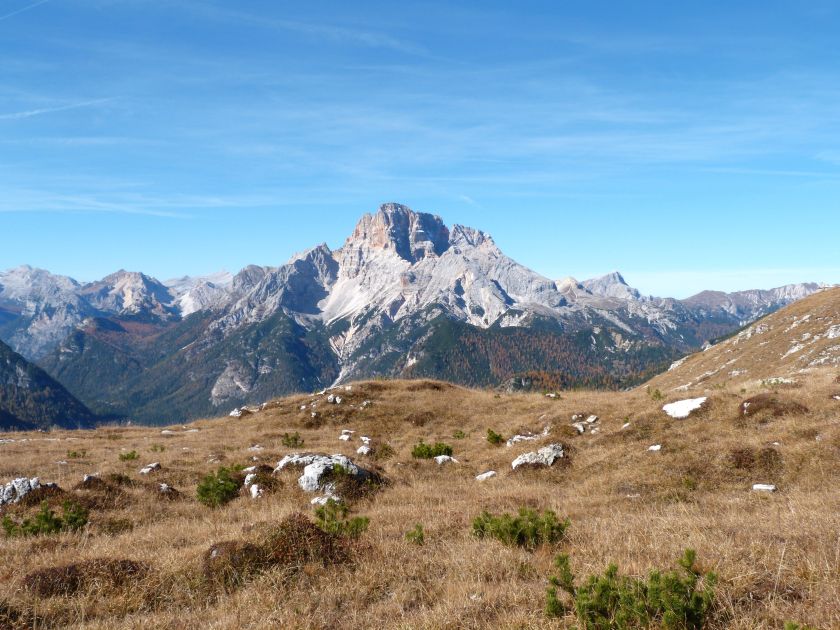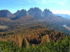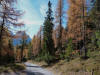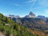 La presenza della coppia Monte Piana – Monte Piano è, nell’ambito delle Dolomiti, quanto meno bizzarra. Divise dalla poco marcata Forcella dei Castrati, sono due cime molto vicine fra loro e alte quasi uguali. A renderle atipiche se non uniche è la caratteristica di presentare delle sommità ampie e in pratica piatte. Le spianate sommitali contrastano con le precipiti pareti che le due montagne presentano verso occidente e verso settentrione. Trovandosi sulla loro vetta basta infatti spostarsi in queste direzioni per raggiungere il ciglio dell’impressionante baratro che precipita fino alla sottostante Val di Landro con l’omonimo lago e il paese di Carbonin. Due ambienti completamente opposti: quello delle praterie di vetta in contrasto con quello delle rupi strapiombanti. La coppia Monte Piana – Monte Piano è purtroppo famosa primariamente per le tragiche vicende che ne sconvolsero le pendici durante il Primo conflitto mondiale. In quest’area persero la vita qualcosa come 14000 soldati tra italiani e austro-ungarici. La salita, come descritta a seguire, tocca poco a valle di Monte Piana il Rifugio Bosi all’interno del quale è presente un piccolo museo privato che raccoglie fotografie, documenti e reperti della Grande Guerra. Proseguendo fin sul vasto pianoro del Monte Piana si osserva un impressionante reticolo di trincee, postazioni e gallerie riportate alla luce e ristrutturate permettendo un interessantissimo tour storico in un vero e proprio museo alla luce del sole. L’interesse dell’escursione è pertanto storico ma non è da meno il valore panoramico essendo osservabile dalle due sommità un grandioso panorama esteso alle vette circostanti tra le quali ricordiamo il Monte Cristallo e le Tre Cime di Lavaredo. Da notare che l’accesso al Monte Piana avviene per mezzo di una strada comunale asfaltata chiusa dal 1998 al traffico (anche delle biciclette) che ricalca quasi integralmente la vecchia strada militare costruita durante la guerra. Nel periodo estivo i 6 km di strada sono percorsi da un servizio di jeep-navetta a permettere un accesso fin troppo banale al Rifugio Bosi. L’interesse storico fa sì che l’area sia letteralmente presa d’assalto dai turisti. Nel nostro caso vi raccomandiamo l’ascesa in bassa stagione. Vi descriviamo la salita dal Lago d’Antorno toccando solo in parte la strada d’accesso che resta comunque sempre chiusa al traffico. Nella seconda metà di ottobre, in particolare, il silenzio torna ad avvolgere le cime permettendo un’esperienza decisamente più intima e meditativa. Avrete modo di osservare il foliage grazie ai lariceti che caratterizzano la parte inferiore del cammino. Tra i mille colori degli alberi e il silenzio talvolta malinconico del tardo autunno sembra incredibile pensare come quest’area sia stata muta testimone di uno dei più sanguinosi e violenti combattimenti della Prima Guerra Mondiale. Vi auguriamo di provare la pace e la meravigliosa solitudine che abbiamo provato noi risalendone lentamente i fianchi sino a godere dello spettacolare panorama di vetta. L’escursione in breve: Lago d’Antorno (m 1866) – Forcella Bassa (m 1880) - Forcella Àuta (m 1984) – Rifugio Monte Piana Angelo Bosi (m 2205) – Piramide Carducci (m 2323) – Monte Piana (m 2324) – Forcella de i Castrade (Forcella dei Castrati - m 2272) – Monte Piano (Croce di Dobbiaco – m 2305) Dati tecnici: Partenza dal Lago d’Antorno (m 1866): Difficoltà: E (Vai alla scala delle difficoltà). Segnaletica: totale. Dislivello assoluto: m 458. Dislivello realmente coperto in salita: m 550. Acqua potabile sul percorso: assente. Accesso alla partenza: Chi proviene da sud tocca il paese di Auronzo quindi sale al Lago di Misurina con la SR 48 delle Dolomiti. La strada segue la sponda occidentale del lago sino ad arrivare alla sua estremità settentrionale. Poco oltre troviamo sulla destra il bivio per le Tre Cime di Lavaredo. Abbandoniamo pertanto il proseguo che condurrebbe altrimenti a Carbonin e a Dobbiaco per volgere in questa direzione raggiungendo, dopo un paio di km, il bellissimo Lago d’Antorno posizionato a destra del piano stradale. Possiamo lasciare l’automobile nel parcheggio presso lo specchio d’acqua. Descrizione del percorso: Il Lago di Antorno (m 1866), punto iniziale della nostra escursione, merita senz’altro una visita percorrendo il breve sentiero che ne ricalca la sponda orientale. Le cime dei Cadini di Misurina e delle Tre Cime di Lavaredo si specchiano nelle sue acque in un ambiente ameno particolarmente apprezzabile in autunno quando è lontana la confusione del turismo agostano. Il sentiero appare a tratti agevolato da una bella passerella in legno che permette di superare senza difficoltà alcune frazioni torbose. Ritornati sulla strada asfaltata ne percorriamo un breve tratto in direzione delle Tre Cime di Lavaredo trovando, poco oltre, il cartello che segnala a sinistra il segnavia 122 diretto al Monte Piana e al Rifugio Bosi (m 1885 – ore 0,10 dalla partenza). Muoviamo in questa direzione con sentiero che si sviluppa, facile e con debole dislivello, nel folto del bosco di conifere. In breve accediamo alla Forcella Bassa (m 1880 – ore 0,25 dalla partenza) dove confluiamo in un’ampia forestale. Guidati dal cartello segnaletico procediamo verso destra su comoda carrareccia con tratti asfaltati osservando i primi scorci, tra le frasche dei larici e degli abeti, in direzione delle cime circostanti con specifico riferimento al Monte Cristallo e alle Tre Cime di Lavaredo. La forestale lambisce una zona prativa umida posta alla destra del tracciato quindi volgiamo verso nordovest scorgendo davanti a noi il Monte Piana che appare coperto nella fascia sommitale da una densa vegetazione a pino mugo. La salita resta nel complesso moderata. Nella seconda parte del mese di ottobre il cammino è allietato dalle sgargianti colorazioni dei larici a rendere affascinante un’ascesa che altrimenti potrebbe risultare