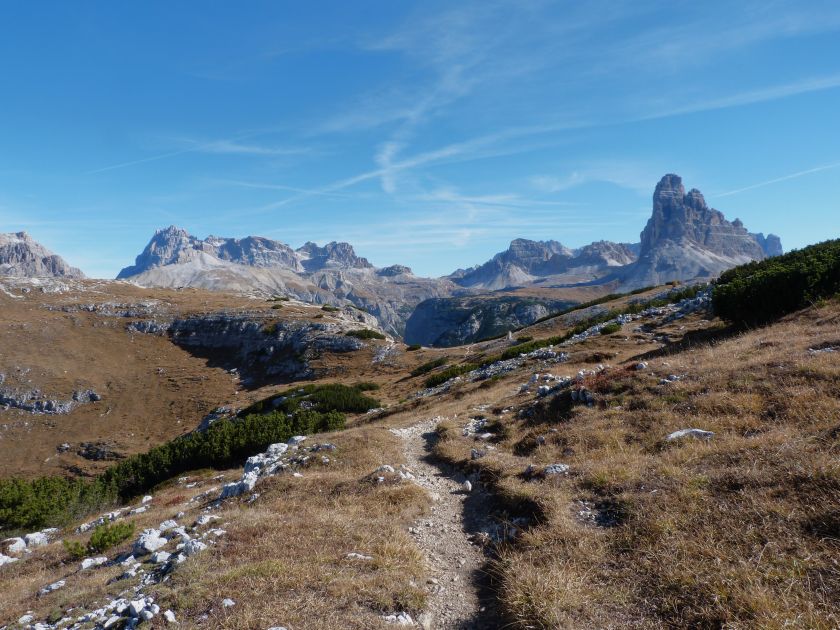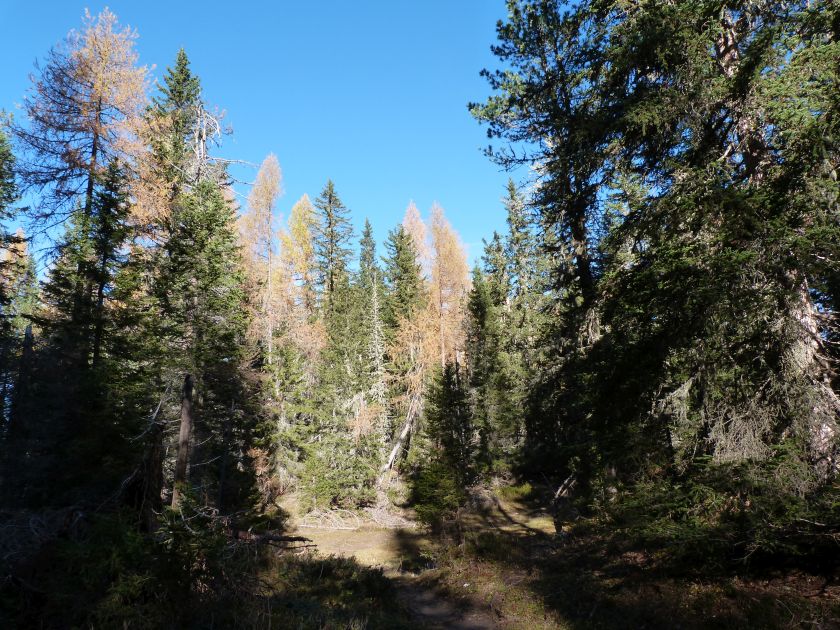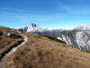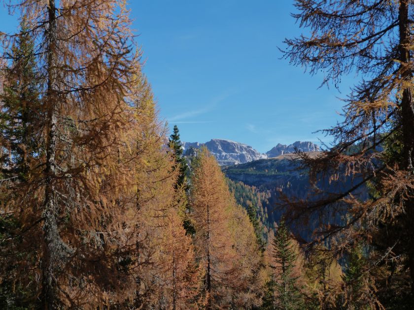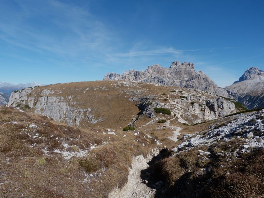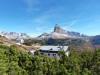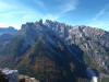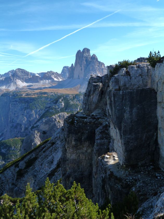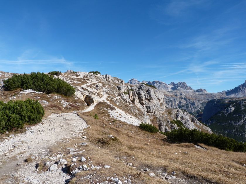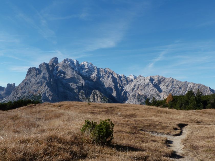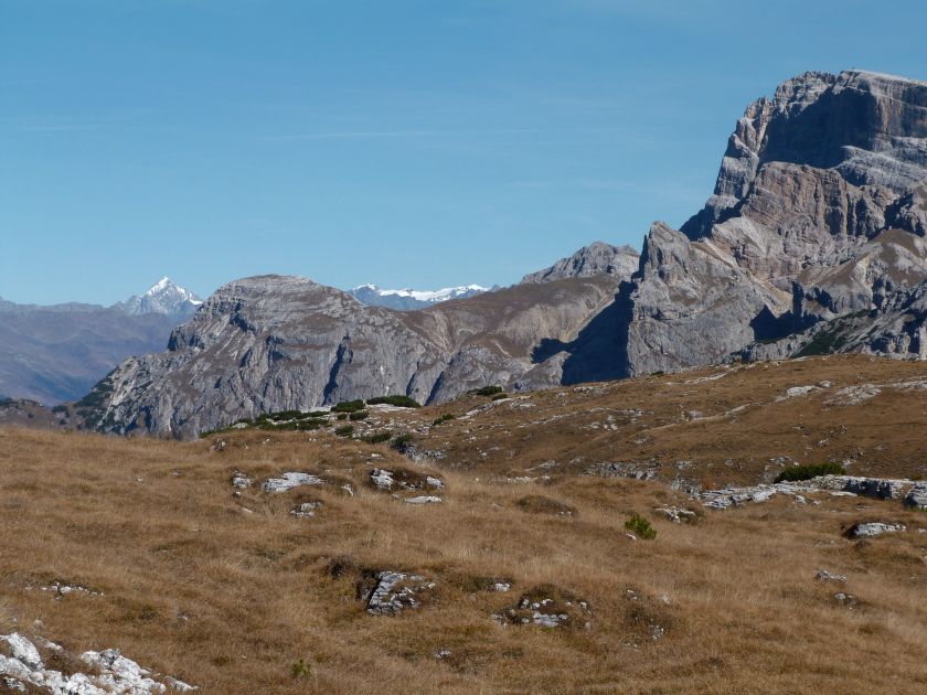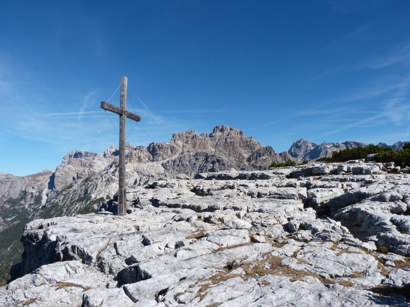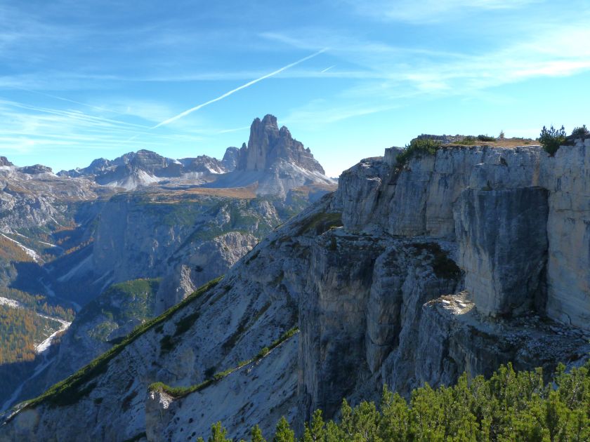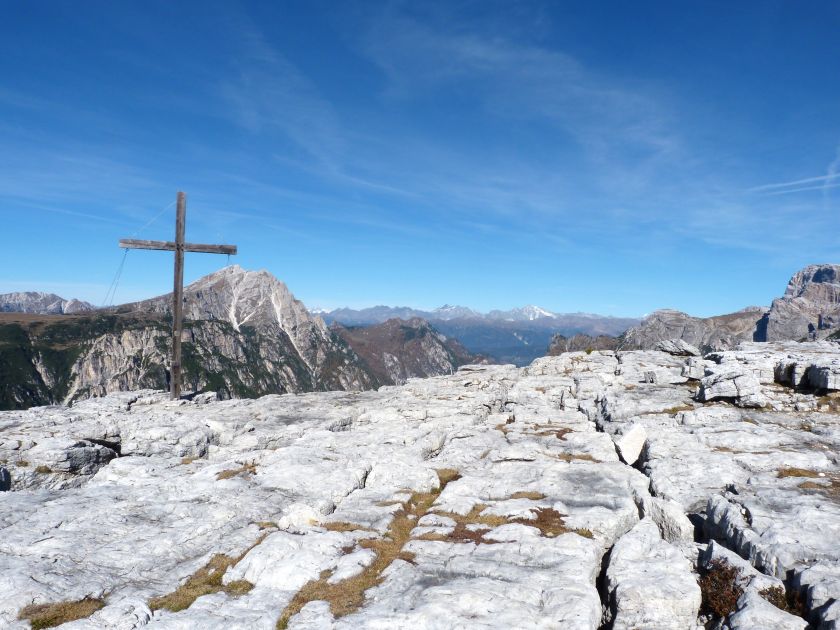 La presenza della coppia Monte Piana – Monte Piano è, nell’ambito delle Dolomiti, quanto meno bizzarra. Divise dalla poco marcata Forcella dei Castrati, sono due cime molto vicine fra loro e alte quasi uguali. A renderle atipiche se non uniche è la caratteristica di presentare delle sommità ampie e in pratica piatte. Le spianate sommitali contrastano con le precipiti pareti che le due montagne presentano verso occidente e verso settentrione. Trovandosi sulla loro vetta basta infatti spostarsi in queste direzioni per raggiungere il ciglio dell’impressionante baratro che precipita fino alla sottostante Val di Landro con l’omonimo lago e il paese di Carbonin. Due ambienti completamente opposti: quello delle praterie di vetta in contrasto con quello delle rupi strapiombanti. La coppia Monte Piana – Monte Piano è purtroppo famosa primariamente per le tragiche vicende che ne sconvolsero le pendici durante il Primo conflitto mondiale. In quest’area persero la vita qualcosa come 14000 soldati tra italiani e austro-ungarici. La salita, come descritta a seguire, tocca poco a valle di Monte Piana il Rifugio Bosi all’interno del quale è presente un piccolo museo privato che raccoglie fotografie, documenti e reperti della Grande Guerra. Proseguendo fin sul vasto pianoro del Monte Piana si osserva un impressionante reticolo di trincee, postazioni e gallerie riportate alla luce e ristrutturate permettendo un interessantissimo tour storico in un vero e proprio museo alla luce del sole. L’interesse dell’escursione è pertanto storico ma non è da meno il valore panoramico essendo osservabile dalle due sommità un grandioso panorama esteso alle vette circostanti tra le quali ricordiamo il Monte Cristallo e le Tre Cime di Lavaredo. Da notare che l’accesso al Monte Piana avviene per mezzo di una strada comunale asfaltata chiusa dal 1998 al traffico (anche delle biciclette) che ricalca quasi integralmente la vecchia strada militare costruita durante la guerra. Nel periodo estivo i 6 km di strada sono percorsi da un servizio di jeep-navetta a permettere un accesso fin troppo banale al Rifugio Bosi. L’interesse storico fa sì che l’area sia letteralmente presa d’assalto dai turisti. Nel nostro caso vi raccomandiamo l’ascesa in bassa stagione. Vi descriviamo la salita dal Lago d’Antorno toccando solo in parte la strada d’accesso che resta comunque sempre chiusa al traffico. Nella seconda metà di ottobre, in particolare, il silenzio torna ad avvolgere le cime permettendo un’esperienza decisamente più intima e meditativa. Avrete modo di osservare il foliage grazie ai lariceti che caratterizzano la parte inferiore del cammino. Tra i mille colori degli alberi e il silenzio talvolta malinconico del tardo autunno sembra incredibile pensare come quest’area sia stata muta testimone di uno dei più sanguinosi e violenti combattimenti della Prima Guerra Mondiale. Vi auguriamo di provare la pace e la meravigliosa solitudine che abbiamo provato noi risalendone lentamente i fianchi sino a godere dello spettacolare panorama di vetta. L’escursione in breve: Lago d’Antorno (m 1866) – Forcella Bassa (m 1880) - Forcella Àuta (m 1984) – Rifugio Monte Piana Angelo Bosi (m 2205) – Piramide Carducci (m 2323) – Monte Piana (m 2324) – Forcella de i Castrade (Forcella dei Castrati - m 2272) – Monte Piano (Croce di Dobbiaco – m 2305) Dati tecnici: Partenza dal Lago d’Antorno (m 1866): Difficoltà: E (Vai alla scala delle difficoltà). Segnaletica: totale. Dislivello assoluto: m 458. Dislivello realmente coperto in salita: m 550. Acqua potabile sul percorso: assente. Accesso alla partenza: Chi proviene da sud tocca il paese di Auronzo quindi sale al Lago di Misurina con la SR 48 delle Dolomiti. La strada segue la sponda occidentale del lago sino ad arrivare alla sua estremità settentrionale. Poco oltre troviamo sulla destra il bivio per le Tre Cime di Lavaredo. Abbandoniamo pertanto il proseguo che condurrebbe altrimenti a Carbonin e a Dobbiaco per volgere in questa direzione raggiungendo, dopo un paio di km, il bellissimo Lago d’Antorno posizionato a destra del piano stradale. Possiamo lasciare l’automobile nel parcheggio presso lo specchio d’acqua. Descrizione del percorso: Il Lago di Antorno (m 1866), punto iniziale della nostra escursione, merita senz’altro una visita percorrendo il breve sentiero che ne ricalca la sponda orientale. Le cime dei Cadini di Misurina e delle Tre Cime di Lavaredo si specchiano nelle sue acque in un ambiente ameno particolarmente apprezzabile in autunno quando è lontana la confusione del turismo agostano. Il sentiero appare a tratti agevolato da una bella passerella in legno che permette di superare senza difficoltà alcune frazioni torbose. Ritornati sulla strada asfaltata ne percorriamo un breve tratto in direzione delle Tre Cime di Lavaredo trovando, poco oltre, il cartello che segnala a sinistra il segnavia 122 diretto al Monte Piana e al Rifugio Bosi (m 1885 – ore 0,10 dalla partenza). Muoviamo in questa direzione con sentiero che si sviluppa, facile e con debole dislivello, nel folto del bosco di conifere. In breve accediamo alla Forcella Bassa (m 1880 – ore 0,25 dalla partenza) dove confluiamo in un’ampia forestale. Guidati dal cartello segnaletico procediamo verso destra su comoda carrareccia con tratti asfaltati osservando i primi scorci, tra le frasche dei larici e degli abeti, in direzione delle cime circostanti con specifico riferimento al Monte Cristallo e alle Tre Cime di Lavaredo. La forestale lambisce una zona prativa umida posta alla destra del tracciato quindi volgiamo verso nordovest scorgendo davanti a noi il Monte Piana che appare coperto nella fascia sommitale da una densa vegetazione a pino mugo. La salita resta nel complesso moderata. Nella seconda parte del mese di ottobre il cammino è allietato dalle sgargianti colorazioni dei larici a rendere affascinante un’ascesa che altrimenti potrebbe risultare