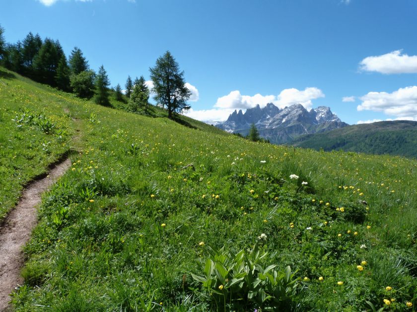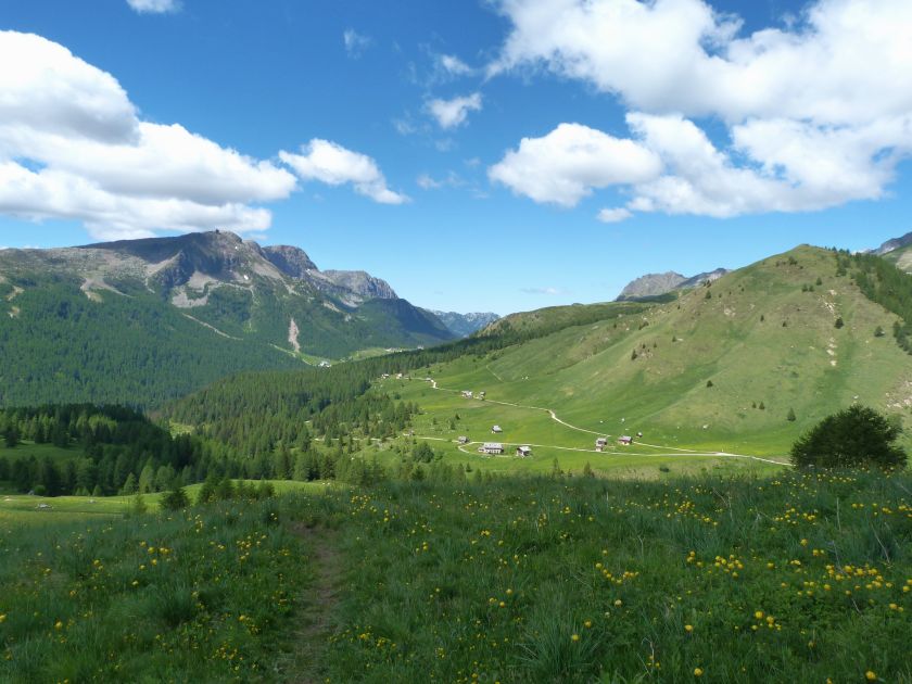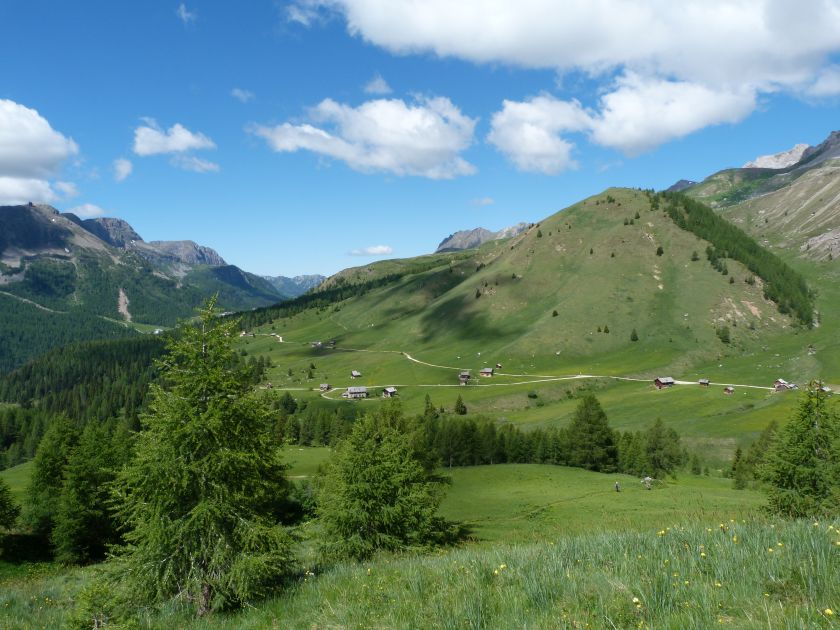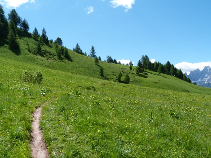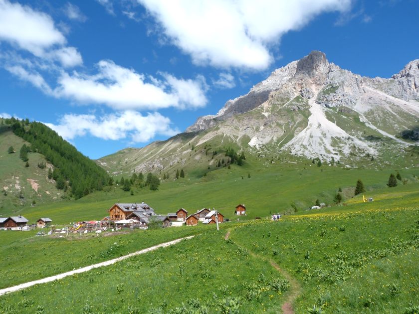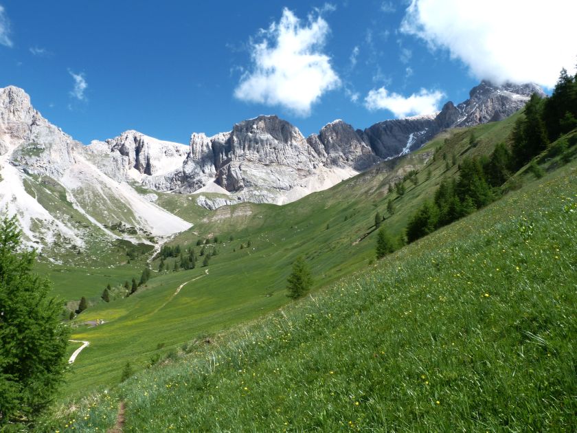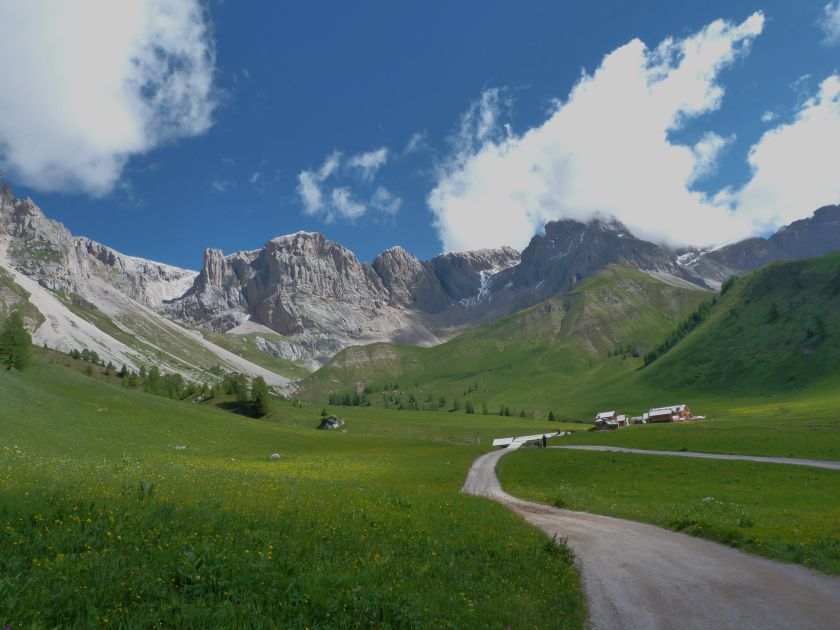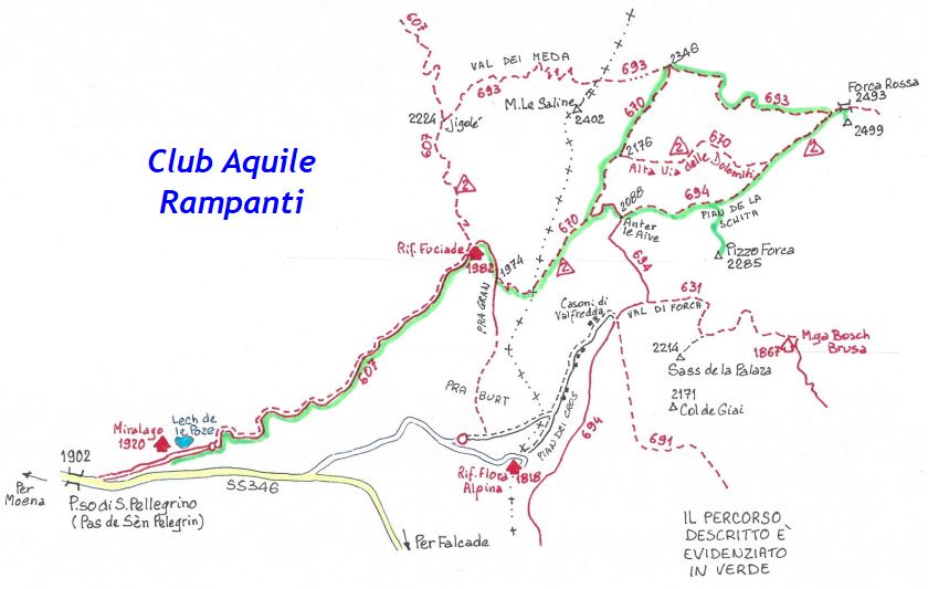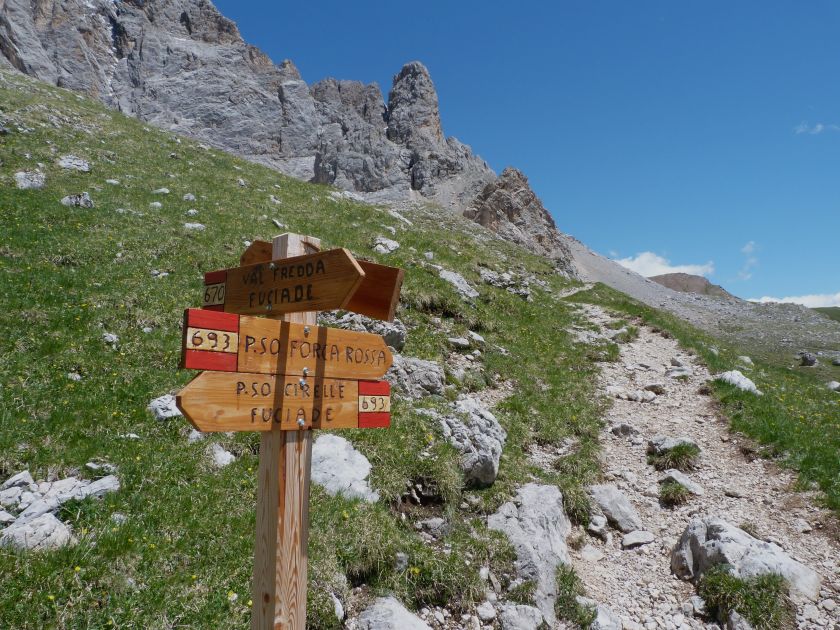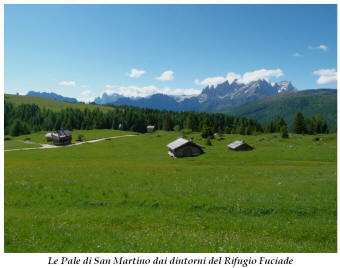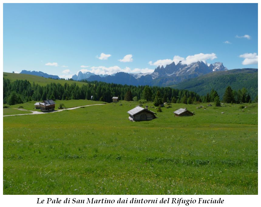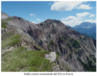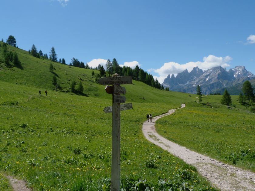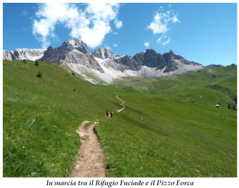 Ci sentiamo di indicarvi questa escursione come una delle più belle delle intere Dolomiti. La prima parte del percorso ricalca uno dei sentieri che gode nell’area di maggiore notorietà. La forestale che conduce al Rifugio Fuciade è sempre percorsa, estate e inverno, dai tanti turisti che affollano l’area del Passo di San Pellegrino. Il tracciato, ampio e quasi senza dislivello, dopo una prima parte prevalentemente boschiva raggiunge i bellissimi prati che caratterizzano la zona del Rifugio. Nei giorni tersi l’ambiente è paradisiaco e avrete la sensazione di trovarvi in qualche pascolo del Canada o della Scandinavia. Il rifugio è la meta di gran parte dei frequentatori della zona di conseguenza, nel proseguo, la presenza umana diviene meno forte e anzi, nella deviazione al Pizzo Forca vi sembrerà di essere in un altro luogo rispetto alla partenza. L’assenza di una traccia e di qualsiasi tipo di segnaletica rende la cima del tutto dimenticata e anche in piena estate non è raro trovarsi in completa solitudine. Nonostante il relativo isolamento la sommità resta alla portata, con tempo buono, di un escursionista di media esperienza in grado di destreggiarsi su terreno libero ma comunque senza salti rocciosi esposti. A completamento dell’avventura si riprende il sentiero segnato per guadagnare il valico della Forca Rossa godendo di nuovi splendidi scorci sui gruppi dolomitici circostanti. Nella stessa escursione potrete scorgere Civetta, Pelmo e Pale di San Martino solo per indicare i massicci più rilevanti. Quando eseguire questa camminata? Il tracciato è naturalmente accessibile per tutto il periodo compreso tra giugno e ottobre senza correre il rischio di incontrare tratti ghiacciati o innevati. La seconda metà di giugno è tuttavia il periodo più bello. La natura si risveglia dopo il lungo inverno alpino e il tracciato si riempie delle sfumature di migliaia di fiori a contrastare con la neve ancora presente sulle cime circostanti. In una giornata tersa si tratta di un’esperienza indimenticabile che ci sentiamo di raccomandare vivamente. L’escursione in breve: Parcheggio presso Albergo Miralago (m 1905) – Lago delle Pozze - Val dai Bè (m 1901) – Costa da Ciasaea (m 1910) – Pecol (m 1925) – Sbrinz (m 1970) – Rifugio Fuciade (m 1982) – innesto sentiero n° 670 (m 1974) – Anter le Aive (m 2088) – sentiero n° 694 – Pizzo Forca (m 2285) – Forca Rossa (m 2493) – sentiero n° 693 – innesto sentiero n° 670 (m 2346) – Rifugio Fuciade (m 1982) – a ritroso sino alla partenza. Dati tecnici: Partenza dal parcheggio presso l’Albergo Miralago (m 1905): Difficoltà: EE (Vai alla scala delle difficoltà). Sino al Rifugio Fuciade T, quindi E nella frazione successiva tranne nella deviazione dal sentiero 694 per raggiungere il Pizzo Forca dove la difficoltà diviene EE. Segnaletica: totale tranne nella deviazione dal sentiero 694 per raggiungere il Pizzo Forca dove non si incontra nessun tipo di segnaletica. Dislivello assoluto: m 598. Acqua potabile sul percorso: alla partenza e al Rifugio Fuciade. Durante il percorso si incontrano alcuni torrenti non sempre accessibili. Accesso alla partenza: Dal paese di Moena si segue la SS 346 raggiungendo il Passo di San Pellegrino. Procediamo oltre il valico per circa 200 metri trovando sulla sinistra, immediatamente dopo il ponticello in legno delle piste di sci, il bivio con cartello indicante “Lach de le Poze – Fuciada” nonché un pannello in legno che segnala l’Albergo Miralago. Abbandoniamo la statale per procedere in questa direzione. Il tratto transitabile in automobile è solo di poche centinaia di metri sino ad accedere al parcheggio posto presso l’Albergo Miralago dove possiamo lasciare l’automobile (m 1905). Subito prima della struttura si separa sulla destra la forestale a fondo naturale dove ha inizio il nostro cammino con indicazioni per il Rifugio Fuciade. Consigliamo in ogni caso la breve digressione all’Albergo Miralago per ammirare, presso la struttura, il piccolo ma pittoresco Lago delle Pozze. Chi proviene da Cencenighe Agordino raggiunge dapprima Falcade quindi si sale verso il Passo di San Pellegrino trovando la deviazione con cartello indicante “Lach de le Poze – Fuciada” sulla destra 200 metri prima dal valico. Il proesguo ricalca quanto detto sopra Descrizione del percorso: Il tratto compreso tra la partenza e il Rifugio Fuciade è uno dei sentieri più semplici e al tempo stesso spettacolari dell’intero circondario. Nel pieno della stagione estiva si rivela una processione continua di turisti attratti dalla straordinaria bellezza del circondario unitamente ad un percorso comodo e e adatto anche a vecchi e bambini. L’itinerario presenta inizialmente dislivelli davvero minimi. Si procede quasi in piano ignorando, in località Val dai Bè (m 1901) il bivio a destra per Malga Boer. Manteniamo l’ampia carrareccia a fondo naturale che si articola tra prati e boschi di conifere raggiungendo una bella schiarita subito oltre la località Costa de Ciasaea (m 1910). Una bella panchina in legno invita alla sosta permettendo un magnifico scorcio a distanza sulle vette delle Pale di San Martino. Si prosegue superando la località Pecol (m 1925) affrontando una breve frazione in modesta salita restando nel bosco di conifere. Poco oltre si dirada l’alberatura raggiungendo il bellissimo piano prativo dominato sullo sfondo dalla Catena della Cima dell’Uomo. Il paesaggio è bucolico: nel verde di prati si incontrano ad intervalli regolari alcuni fienili in legno muti testimoni di un’epoca in cui i contadini vivevano e lavoravano in questi magnifici prati. Le strutture sono state recuperate risultando splendidamente inserite in un idilliaco paesaggio che infonde profonda calma e serenità. Da rilevare la spettacolare vista, verso meridione, delle Pale di San Martino e dell’omonimo altopiano. Procediamo tra le morbide ondulazioni prative in pratica senza dislivelli; da ril