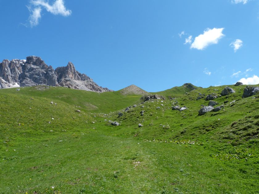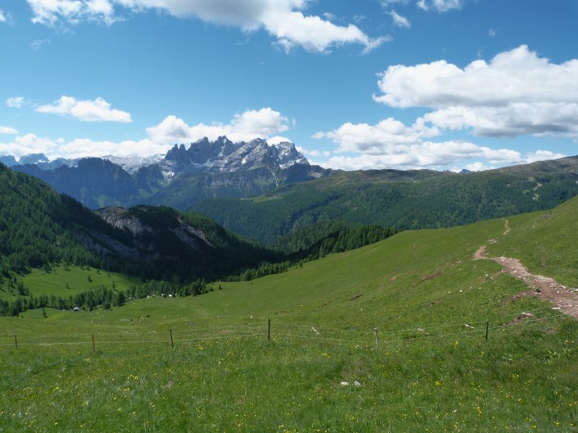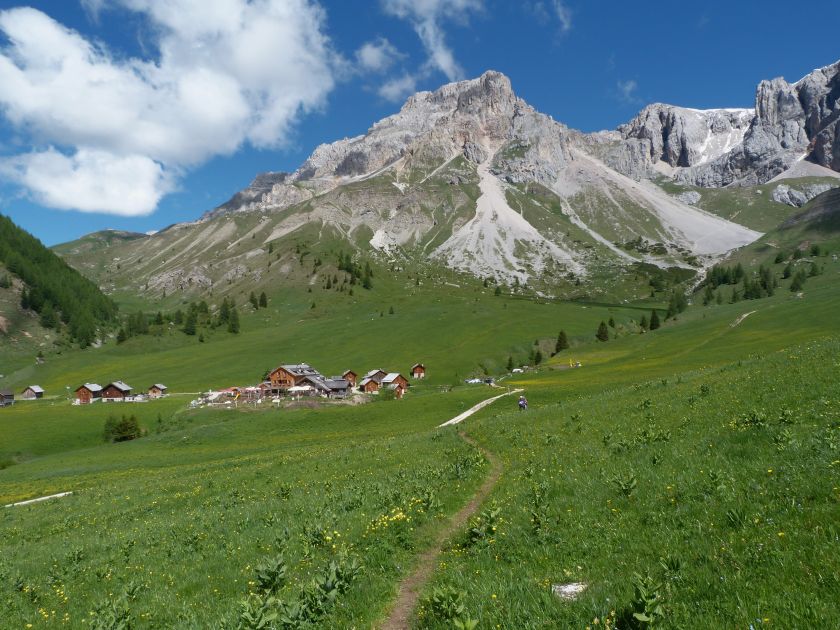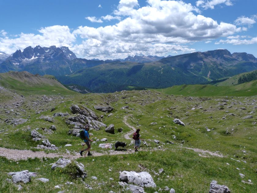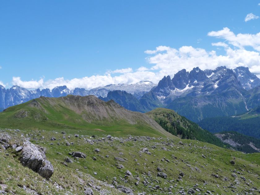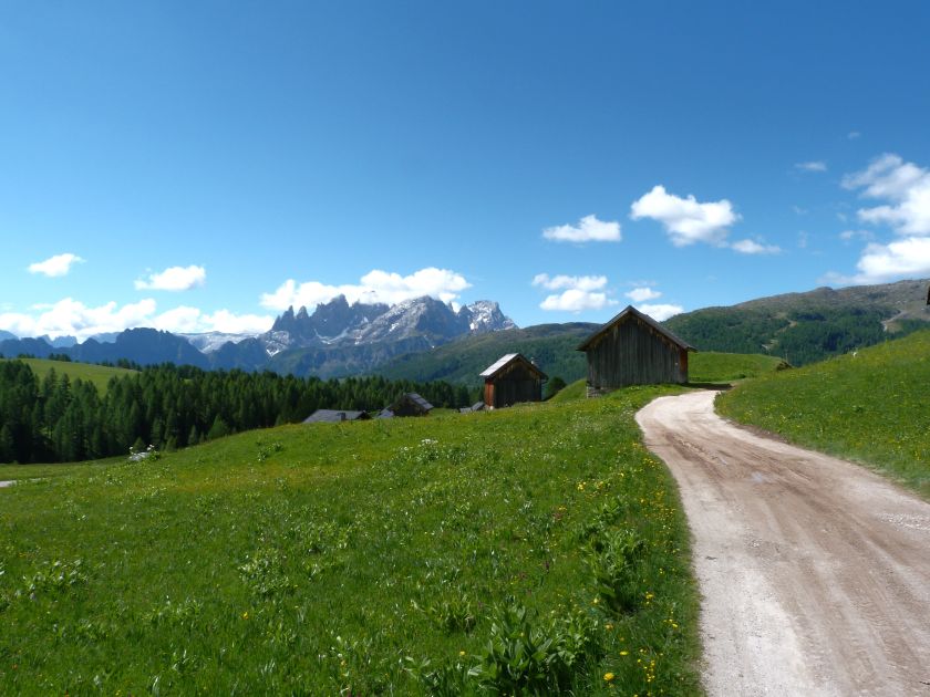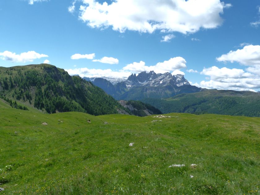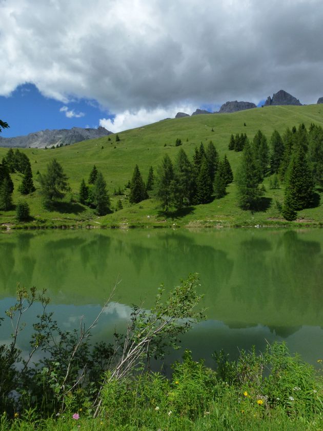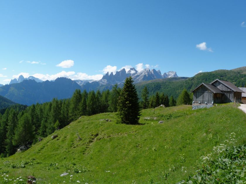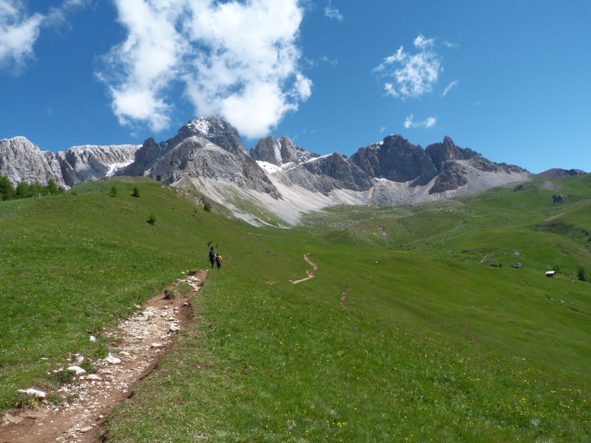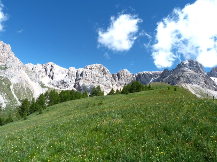 Ci sentiamo di indicarvi questa escursione come una delle più belle delle intere Dolomiti. La prima parte del percorso ricalca uno dei sentieri che gode nell’area di maggiore notorietà. La forestale che conduce al Rifugio Fuciade è sempre percorsa, estate e inverno, dai tanti turisti che affollano l’area del Passo di San Pellegrino. Il tracciato, ampio e quasi senza dislivello, dopo una prima parte prevalentemente boschiva raggiunge i bellissimi prati che caratterizzano la zona del Rifugio. Nei giorni tersi l’ambiente è paradisiaco e avrete la sensazione di trovarvi in qualche pascolo del Canada o della Scandinavia. Il rifugio è la meta di gran parte dei frequentatori della zona di conseguenza, nel proseguo, la presenza umana diviene meno forte e anzi, nella deviazione al Pizzo Forca vi sembrerà di essere in un altro luogo rispetto alla partenza. L’assenza di una traccia e di qualsiasi tipo di segnaletica rende la cima del tutto dimenticata e anche in piena estate non è raro trovarsi in completa solitudine. Nonostante il relativo isolamento la sommità resta alla portata, con tempo buono, di un escursionista di media esperienza in grado di destreggiarsi su terreno libero ma comunque senza salti rocciosi esposti. A completamento dell’avventura si riprende il sentiero segnato per guadagnare il valico della Forca Rossa godendo di nuovi splendidi scorci sui gruppi dolomitici circostanti. Nella stessa escursione potrete scorgere Civetta, Pelmo e Pale di San Martino solo per indicare i massicci più rilevanti. Quando eseguire questa camminata? Il tracciato è naturalmente accessibile per tutto il periodo compreso tra giugno e ottobre senza correre il rischio di incontrare tratti ghiacciati o innevati. La seconda metà di giugno è tuttavia il periodo più bello. La natura si risveglia dopo il lungo inverno alpino e il tracciato si riempie delle sfumature di migliaia di fiori a contrastare con la neve ancora presente sulle cime circostanti. In una giornata tersa si tratta di un’esperienza indimenticabile che ci sentiamo di raccomandare vivamente. L’escursione in breve: Parcheggio presso Albergo Miralago (m 1905) – Lago delle Pozze - Val dai Bè (m 1901) – Costa da Ciasaea (m 1910) – Pecol (m 1925) – Sbrinz (m 1970) – Rifugio Fuciade (m 1982) – innesto sentiero n° 670 (m 1974) – Anter le Aive (m 2088) – sentiero n° 694 – Pizzo Forca (m 2285) – Forca Rossa (m 2493) – sentiero n° 693 – innesto sentiero n° 670 (m 2346) – Rifugio Fuciade (m 1982) – a ritroso sino alla partenza. Dati tecnici: Partenza dal parcheggio presso l’Albergo Miralago (m 1905): Difficoltà: EE (Vai alla scala delle difficoltà). Sino al Rifugio Fuciade T, quindi E nella frazione successiva tranne nella deviazione dal sentiero 694 per raggiungere il Pizzo Forca dove la difficoltà diviene EE. Segnaletica: totale tranne nella deviazione dal sentiero 694 per raggiungere il Pizzo Forca dove non si incontra nessun tipo di segnaletica. Dislivello assoluto: m 598. Acqua potabile sul percorso: alla partenza e al Rifugio Fuciade. Durante il percorso si incontrano alcuni torrenti non sempre accessibili. Accesso alla partenza: Dal paese di Moena si segue la SS 346 raggiungendo il Passo di San Pellegrino. Procediamo oltre il valico per circa 200 metri trovando sulla sinistra, immediatamente dopo il ponticello in legno delle piste di sci, il bivio con cartello indicante “Lach de le Poze – Fuciada” nonché un pannello in legno che segnala l’Albergo Miralago. Abbandoniamo la statale per procedere in questa direzione. Il tratto transitabile in automobile è solo di poche centinaia di metri sino ad accedere al parcheggio posto presso l’Albergo Miralago dove possiamo lasciare l’automobile (m 1905). Subito prima della struttura si separa sulla destra la forestale a fondo naturale dove ha inizio il nostro cammino con indicazioni per il Rifugio Fuciade. Consigliamo in ogni caso la breve digressione all’Albergo Miralago per ammirare, presso la struttura, il piccolo ma pittoresco Lago delle Pozze. Chi proviene da Cencenighe Agordino raggiunge dapprima Falcade quindi si sale verso il Passo di San Pellegrino trovando la deviazione con cartello indicante “Lach de le Poze – Fuciada” sulla destra 200 metri prima dal valico. Il proesguo ricalca quanto detto sopra Descrizione del percorso: Il tratto compreso tra la partenza e il Rifugio Fuciade è uno dei sentieri più semplici e al tempo stesso spettacolari dell’intero circondario. Nel pieno della stagione estiva si rivela una processione continua di turisti attratti dalla straordinaria bellezza del circondario unitamente ad un percorso comodo e e adatto anche a vecchi e bambini. L’itinerario presenta inizialmente dislivelli davvero minimi. Si procede quasi in piano ignorando, in località Val dai Bè (m 1901) il bivio a destra per Malga Boer. Manteniamo l’ampia carrareccia a fondo naturale che si articola tra prati e boschi di conifere raggiungendo una bella schiarita subito oltre la località Costa de Ciasaea (m 1910). Una bella panchina in legno invita alla sosta permettendo un magnifico scorcio a distanza sulle vette delle Pale di San Martino. Si prosegue superando la località Pecol (m 1925) affrontando una breve frazione in modesta salita restando nel bosco di conifere. Poco oltre si dirada l’alberatura raggiungendo il bellissimo piano prativo dominato sullo sfondo dalla Catena della Cima dell’Uomo. Il paesaggio è bucolico: nel verde di prati si incontrano ad intervalli regolari alcuni fienili in legno muti testimoni di un’epoca in cui i contadini vivevano e lavoravano in questi magnifici prati. Le strutture sono state recuperate risultando splendidamente inserite in un idilliaco paesaggio che infonde profonda calma e serenità. Da rilevare la spettacolare vista, verso meridione, delle Pale di San Martino e dell’omonimo altopiano. Procediamo tra le morbide ondulazioni prative in pratica senza dislivelli; da ril