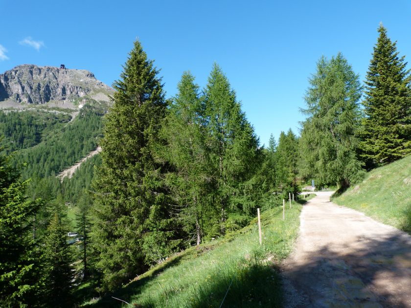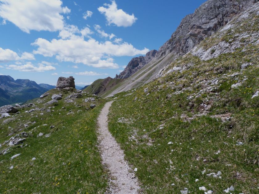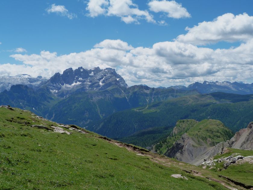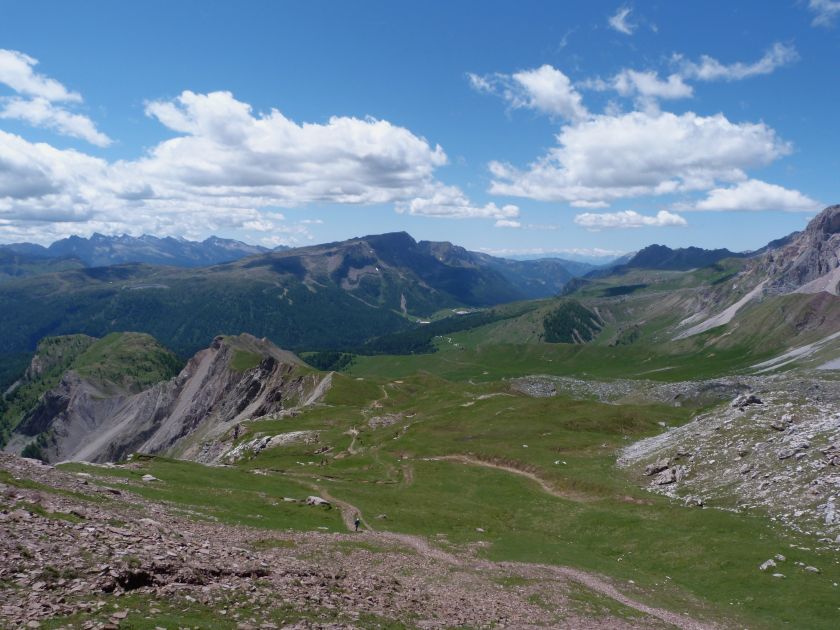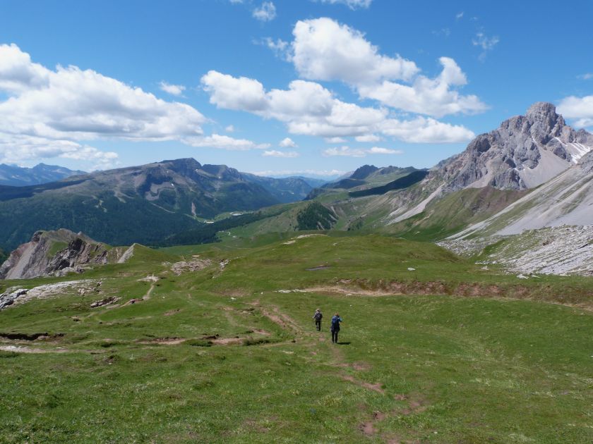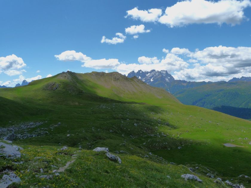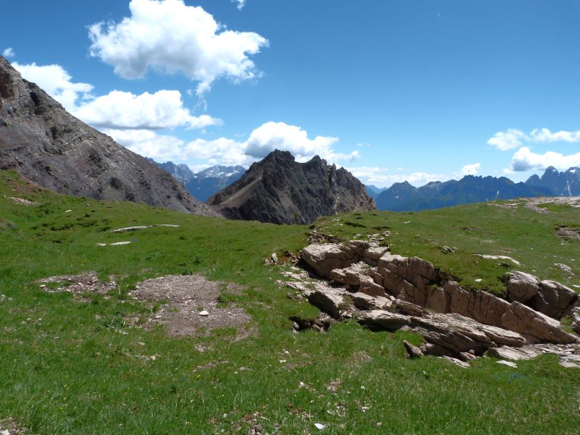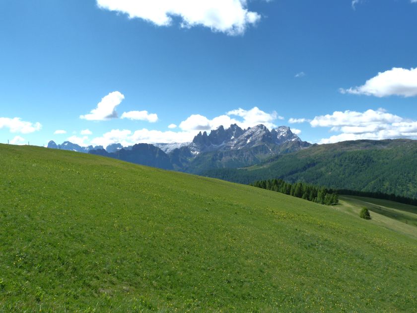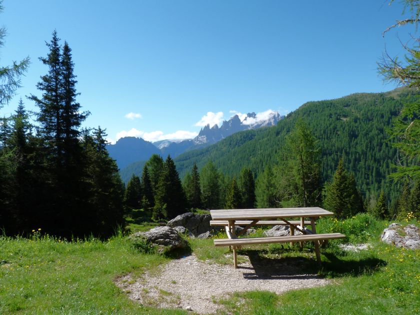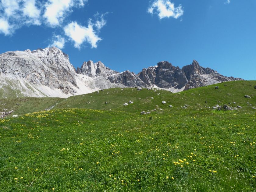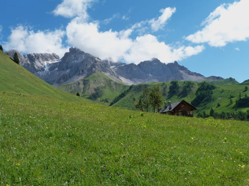 Ci sentiamo di indicarvi questa escursione come una delle più belle delle intere Dolomiti. La prima parte del percorso ricalca uno dei sentieri che gode nell’area di maggiore notorietà. La forestale che conduce al Rifugio Fuciade è sempre percorsa, estate e inverno, dai tanti turisti che affollano l’area del Passo di San Pellegrino. Il tracciato, ampio e quasi senza dislivello, dopo una prima parte prevalentemente boschiva raggiunge i bellissimi prati che caratterizzano la zona del Rifugio. Nei giorni tersi l’ambiente è paradisiaco e avrete la sensazione di trovarvi in qualche pascolo del Canada o della Scandinavia. Il rifugio è la meta di gran parte dei frequentatori della zona di conseguenza, nel proseguo, la presenza umana diviene meno forte e anzi, nella deviazione al Pizzo Forca vi sembrerà di essere in un altro luogo rispetto alla partenza. L’assenza di una traccia e di qualsiasi tipo di segnaletica rende la cima del tutto dimenticata e anche in piena estate non è raro trovarsi in completa solitudine. Nonostante il relativo isolamento la sommità resta alla portata, con tempo buono, di un escursionista di media esperienza in grado di destreggiarsi su terreno libero ma comunque senza salti rocciosi esposti. A completamento dell’avventura si riprende il sentiero segnato per guadagnare il valico della Forca Rossa godendo di nuovi splendidi scorci sui gruppi dolomitici circostanti. Nella stessa escursione potrete scorgere Civetta, Pelmo e Pale di San Martino solo per indicare i massicci più rilevanti. Quando eseguire questa camminata? Il tracciato è naturalmente accessibile per tutto il periodo compreso tra giugno e ottobre senza correre il rischio di incontrare tratti ghiacciati o innevati. La seconda metà di giugno è tuttavia il periodo più bello. La natura si risveglia dopo il lungo inverno alpino e il tracciato si riempie delle sfumature di migliaia di fiori a contrastare con la neve ancora presente sulle cime circostanti. In una giornata tersa si tratta di un’esperienza indimenticabile che ci sentiamo di raccomandare vivamente. L’escursione in breve: Parcheggio presso Albergo Miralago (m 1905) – Lago delle Pozze - Val dai Bè (m 1901) – Costa da Ciasaea (m 1910) – Pecol (m 1925) – Sbrinz (m 1970) – Rifugio Fuciade (m 1982) – innesto sentiero n° 670 (m 1974) – Anter le Aive (m 2088) – sentiero n° 694 – Pizzo Forca (m 2285) – Forca Rossa (m 2493) – sentiero n° 693 – innesto sentiero n° 670 (m 2346) – Rifugio Fuciade (m 1982) – a ritroso sino alla partenza. Dati tecnici: Partenza dal parcheggio presso l’Albergo Miralago (m 1905): Difficoltà: EE (Vai alla scala delle difficoltà). Sino al Rifugio Fuciade T, quindi E nella frazione successiva tranne nella deviazione dal sentiero 694 per raggiungere il Pizzo Forca dove la difficoltà diviene EE. Segnaletica: totale tranne nella deviazione dal sentiero 694 per raggiungere il Pizzo Forca dove non si incontra nessun tipo di segnaletica. Dislivello assoluto: m 598. Acqua potabile sul percorso: alla partenza e al Rifugio Fuciade. Durante il percorso si incontrano alcuni torrenti non sempre accessibili. Accesso alla partenza: Dal paese di Moena si segue la SS 346 raggiungendo il Passo di San Pellegrino. Procediamo oltre il valico per circa 200 metri trovando sulla sinistra, immediatamente dopo il ponticello in legno delle piste di sci, il bivio con cartello indicante “Lach de le Poze – Fuciada” nonché un pannello in legno che segnala l’Albergo Miralago. Abbandoniamo la statale per procedere in questa direzione. Il tratto transitabile in automobile è solo di poche centinaia di metri sino ad accedere al parcheggio posto presso l’Albergo Miralago dove possiamo lasciare l’automobile (m 1905). Subito prima della struttura si separa sulla destra la forestale a fondo naturale dove ha inizio il nostro cammino con indicazioni per il Rifugio Fuciade. Consigliamo in ogni caso la breve digressione all’Albergo Miralago per ammirare, presso la struttura, il piccolo ma pittoresco Lago delle Pozze. Chi proviene da Cencenighe Agordino raggiunge dapprima Falcade quindi si sale verso il Passo di San Pellegrino trovando la deviazione con cartello indicante “Lach de le Poze – Fuciada” sulla destra 200 metri prima dal valico. Il proesguo ricalca quanto detto sopra Descrizione del percorso: Il tratto compreso tra la partenza e il Rifugio Fuciade è uno dei sentieri più semplici e al tempo stesso spettacolari dell’intero circondario. Nel pieno della stagione estiva si rivela una processione continua di turisti attratti dalla straordinaria bellezza del circondario unitamente ad un percorso comodo e e adatto anche a vecchi e bambini. L’itinerario presenta inizialmente dislivelli davvero minimi. Si procede quasi in piano ignorando, in località Val dai Bè (m 1901) il bivio a destra per Malga Boer. Manteniamo l’ampia carrareccia a fondo naturale che si articola tra prati e boschi di conifere raggiungendo una bella schiarita subito oltre la località Costa de Ciasaea (m 1910). Una bella panchina in legno invita alla sosta permettendo un magnifico scorcio a distanza sulle vette delle Pale di San Martino. Si prosegue superando la località Pecol (m 1925) affrontando una breve frazione in modesta salita restando nel bosco di conifere. Poco oltre si dirada l’alberatura raggiungendo il bellissimo piano prativo dominato sullo sfondo dalla Catena della Cima dell’Uomo. Il paesaggio è bucolico: nel verde di prati si incontrano ad intervalli regolari alcuni fienili in legno muti testimoni di un’epoca in cui i contadini vivevano e lavoravano in questi magnifici prati. Le strutture sono state recuperate risultando splendidamente inserite in un idilliaco paesaggio che infonde profonda calma e serenità. Da rilevare la spettacolare vista, verso meridione, delle Pale di San Martino e dell’omonimo altopiano. Procediamo tra le morbide ondulazioni prative in pratica senza dislivelli; da ril