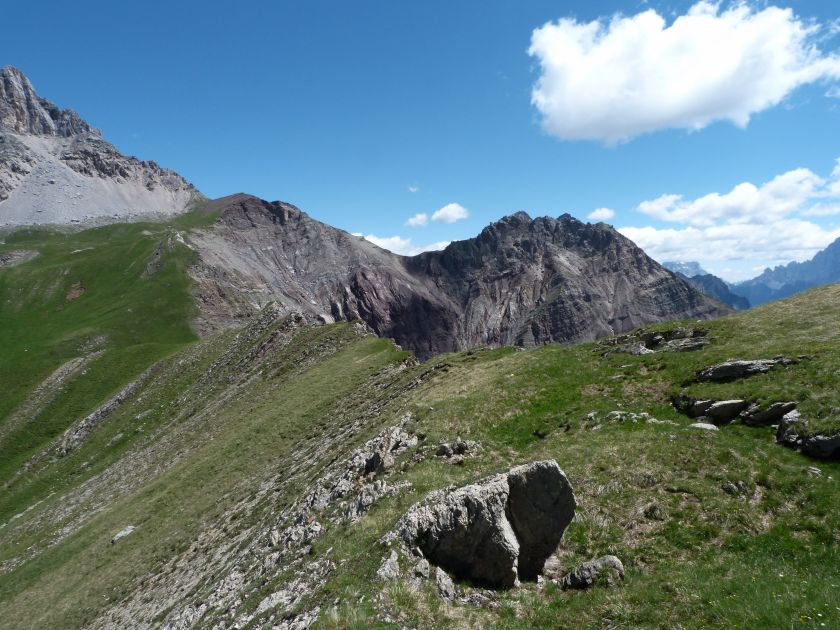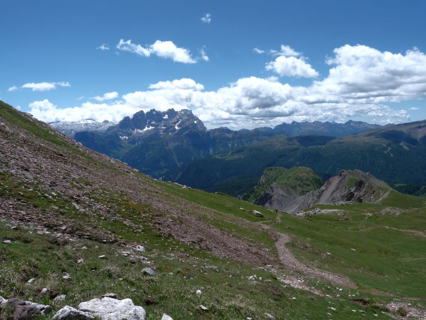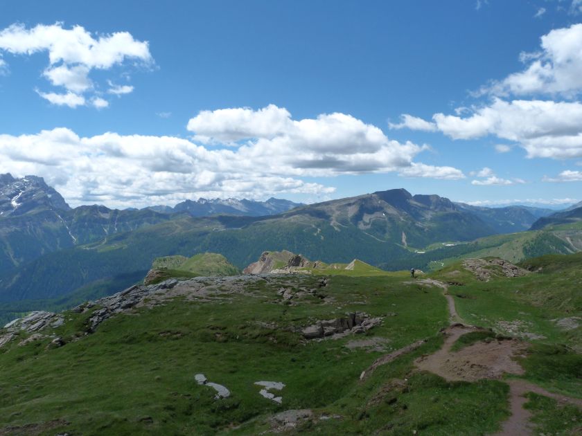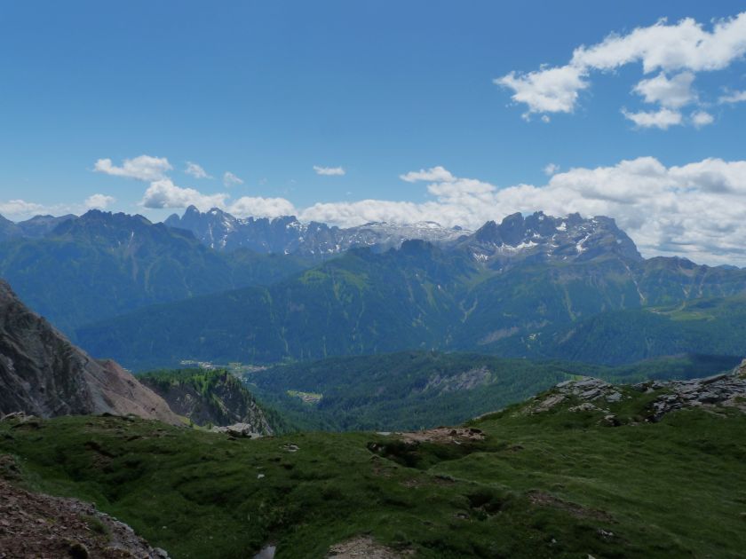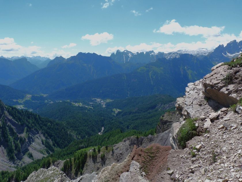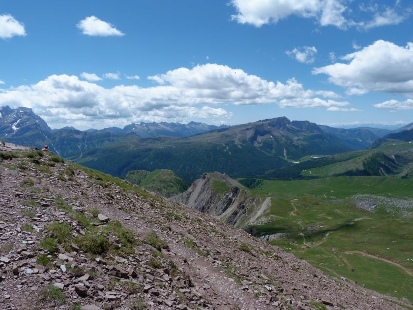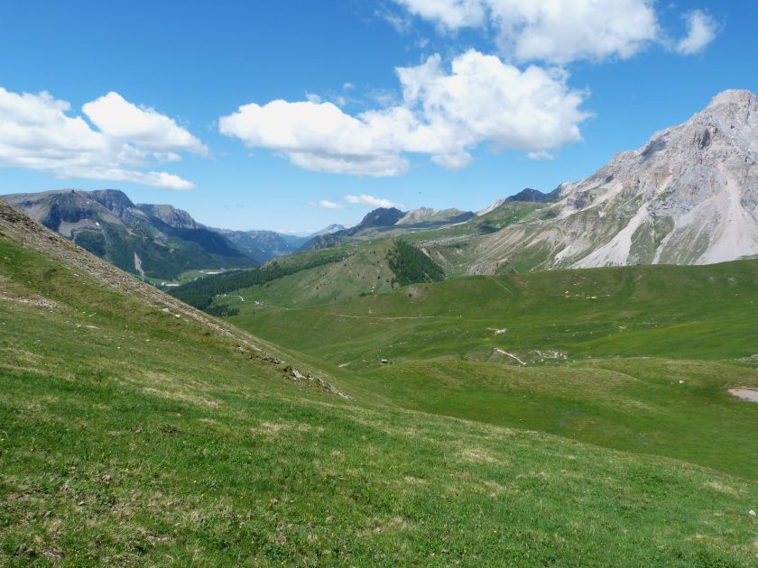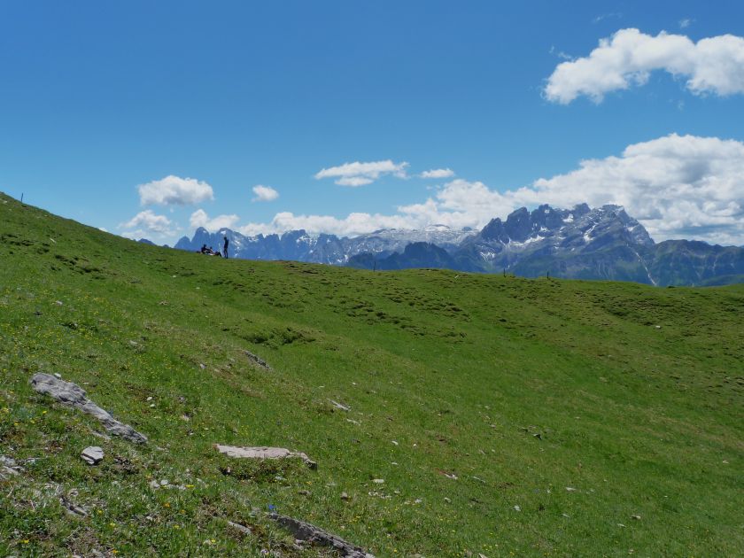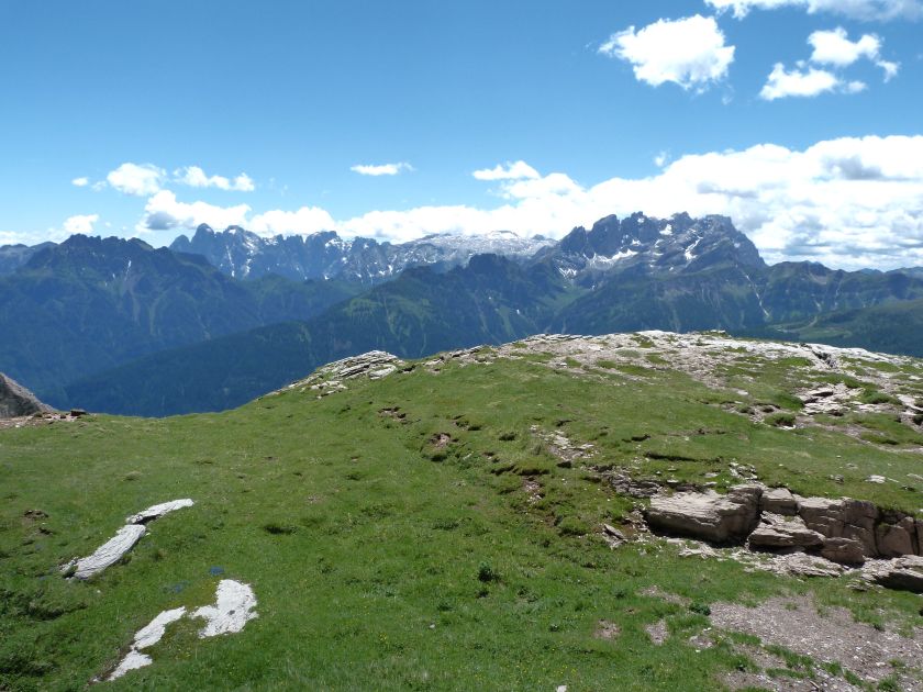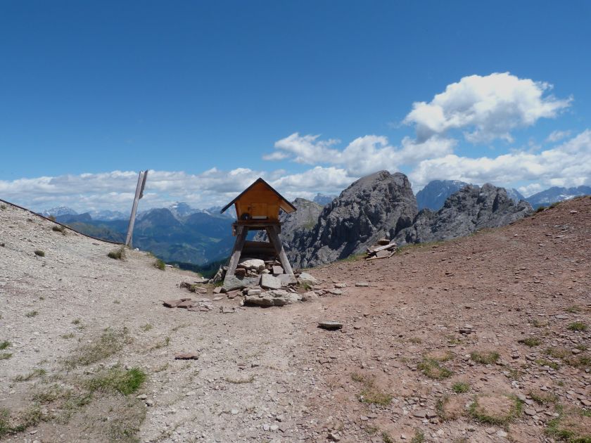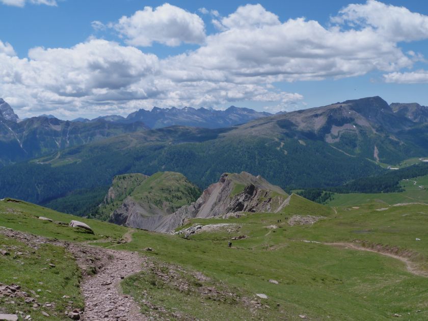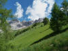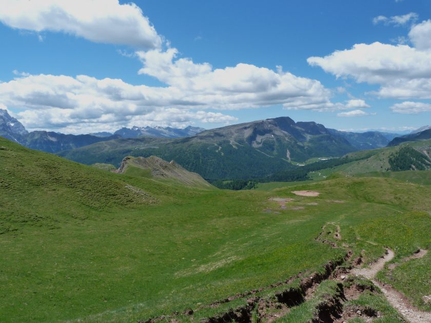 Ci sentiamo di indicarvi questa escursione come una delle più belle delle intere Dolomiti. La prima parte del percorso ricalca uno dei sentieri che gode nell’area di maggiore notorietà. La forestale che conduce al Rifugio Fuciade è sempre percorsa, estate e inverno, dai tanti turisti che affollano l’area del Passo di San Pellegrino. Il tracciato, ampio e quasi senza dislivello, dopo una prima parte prevalentemente boschiva raggiunge i bellissimi prati che caratterizzano la zona del Rifugio. Nei giorni tersi l’ambiente è paradisiaco e avrete la sensazione di trovarvi in qualche pascolo del Canada o della Scandinavia. Il rifugio è la meta di gran parte dei frequentatori della zona di conseguenza, nel proseguo, la presenza umana diviene meno forte e anzi, nella deviazione al Pizzo Forca vi sembrerà di essere in un altro luogo rispetto alla partenza. L’assenza di una traccia e di qualsiasi tipo di segnaletica rende la cima del tutto dimenticata e anche in piena estate non è raro trovarsi in completa solitudine. Nonostante il relativo isolamento la sommità resta alla portata, con tempo buono, di un escursionista di media esperienza in grado di destreggiarsi su terreno libero ma comunque senza salti rocciosi esposti. A completamento dell’avventura si riprende il sentiero segnato per guadagnare il valico della Forca Rossa godendo di nuovi splendidi scorci sui gruppi dolomitici circostanti. Nella stessa escursione potrete scorgere Civetta, Pelmo e Pale di San Martino solo per indicare i massicci più rilevanti. Quando eseguire questa camminata? Il tracciato è naturalmente accessibile per tutto il periodo compreso tra giugno e ottobre senza correre il rischio di incontrare tratti ghiacciati o innevati. La seconda metà di giugno è tuttavia il periodo più bello. La natura si risveglia dopo il lungo inverno alpino e il tracciato si riempie delle sfumature di migliaia di fiori a contrastare con la neve ancora presente sulle cime circostanti. In una giornata tersa si tratta di un’esperienza indimenticabile che ci sentiamo di raccomandare vivamente. L’escursione in breve: Parcheggio presso Albergo Miralago (m 1905) – Lago delle Pozze - Val dai Bè (m 1901) – Costa da Ciasaea (m 1910) – Pecol (m 1925) – Sbrinz (m 1970) – Rifugio Fuciade (m 1982) – innesto sentiero n° 670 (m 1974) – Anter le Aive (m 2088) – sentiero n° 694 – Pizzo Forca (m 2285) – Forca Rossa (m 2493) – sentiero n° 693 – innesto sentiero n° 670 (m 2346) – Rifugio Fuciade (m 1982) – a ritroso sino alla partenza. Dati tecnici: Partenza dal parcheggio presso l’Albergo Miralago (m 1905): Difficoltà: EE (Vai alla scala delle difficoltà). Sino al Rifugio Fuciade T, quindi E nella frazione successiva tranne nella deviazione dal sentiero 694 per raggiungere il Pizzo Forca dove la difficoltà diviene EE. Segnaletica: totale tranne nella deviazione dal sentiero 694 per raggiungere il Pizzo Forca dove non si incontra nessun tipo di segnaletica. Dislivello assoluto: m 598. Acqua potabile sul percorso: alla partenza e al Rifugio Fuciade. Durante il percorso si incontrano alcuni torrenti non sempre accessibili. Accesso alla partenza: Dal paese di Moena si segue la SS 346 raggiungendo il Passo di San Pellegrino. Procediamo oltre il valico per circa 200 metri trovando sulla sinistra, immediatamente dopo il ponticello in legno delle piste di sci, il bivio con cartello indicante “Lach de le Poze – Fuciada” nonché un pannello in legno che segnala l’Albergo Miralago. Abbandoniamo la statale per procedere in questa direzione. Il tratto transitabile in automobile è solo di poche centinaia di metri sino ad accedere al parcheggio posto presso l’Albergo Miralago dove possiamo lasciare l’automobile (m 1905). Subito prima della struttura si separa sulla destra la forestale a fondo naturale dove ha inizio il nostro cammino con indicazioni per il Rifugio Fuciade. Consigliamo in ogni caso la breve digressione all’Albergo Miralago per ammirare, presso la struttura, il piccolo ma pittoresco Lago delle Pozze. Chi proviene da Cencenighe Agordino raggiunge dapprima Falcade quindi si sale verso il Passo di San Pellegrino trovando la deviazione con cartello indicante “Lach de le Poze – Fuciada” sulla destra 200 metri prima dal valico. Il proesguo ricalca quanto detto sopra Descrizione del percorso: Il tratto compreso tra la partenza e il Rifugio Fuciade è uno dei sentieri più semplici e al tempo stesso spettacolari dell’intero circondario. Nel pieno della stagione estiva si rivela una processione continua di turisti attratti dalla straordinaria bellezza del circondario unitamente ad un percorso comodo e e adatto anche a vecchi e bambini. L’itinerario presenta inizialmente dislivelli davvero minimi. Si procede quasi in piano ignorando, in località Val dai Bè (m 1901) il bivio a destra per Malga Boer. Manteniamo l’ampia carrareccia a fondo naturale che si articola tra prati e boschi di conifere raggiungendo una bella schiarita subito oltre la località Costa de Ciasaea (m 1910). Una bella panchina in legno invita alla sosta permettendo un magnifico scorcio a distanza sulle vette delle Pale di San Martino. Si prosegue superando la località Pecol (m 1925) affrontando una breve frazione in modesta salita restando nel bosco di conifere. Poco oltre si dirada l’alberatura raggiungendo il bellissimo piano prativo dominato sullo sfondo dalla Catena della Cima dell’Uomo. Il paesaggio è bucolico: nel verde di prati si incontrano ad intervalli regolari alcuni fienili in legno muti testimoni di un’epoca in cui i contadini vivevano e lavoravano in questi magnifici prati. Le strutture sono state recuperate risultando splendidamente inserite in un idilliaco paesaggio che infonde profonda calma e serenità. Da rilevare la spettacolare vista, verso meridione, delle Pale di San Martino e dell’omonimo altopiano. Procediamo tra le morbide ondulazioni prative in pratica senza dislivelli; da ril