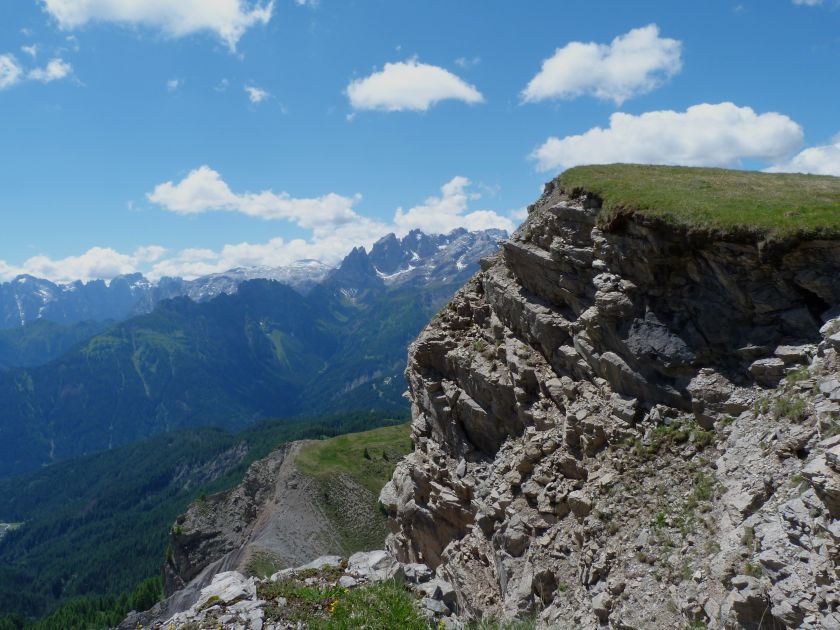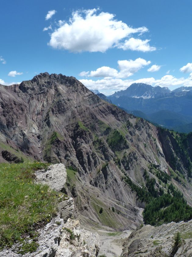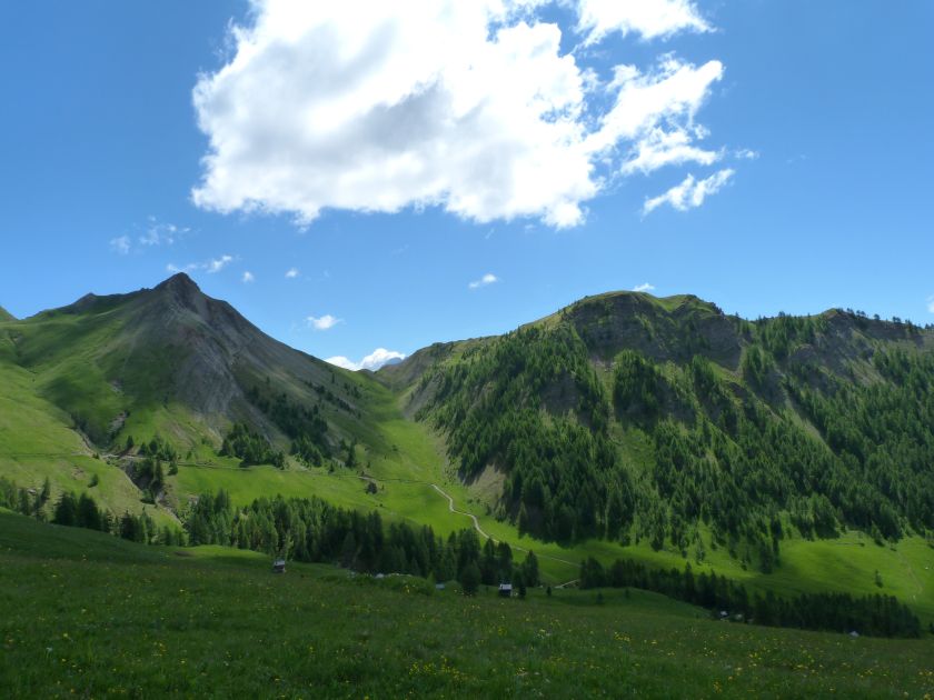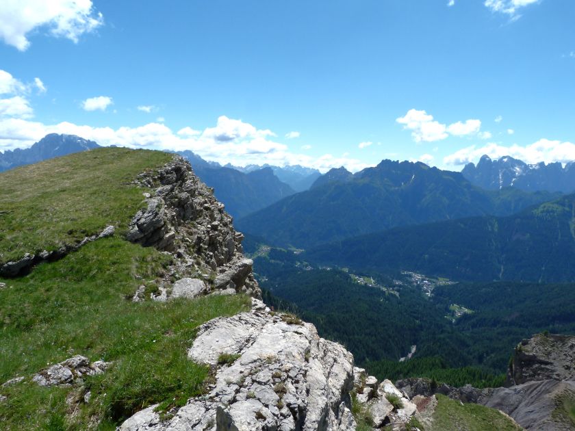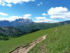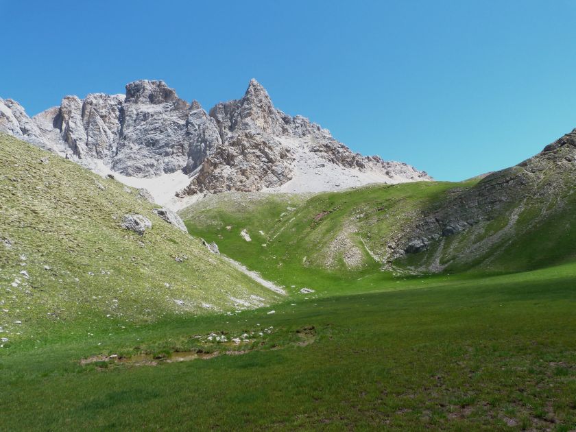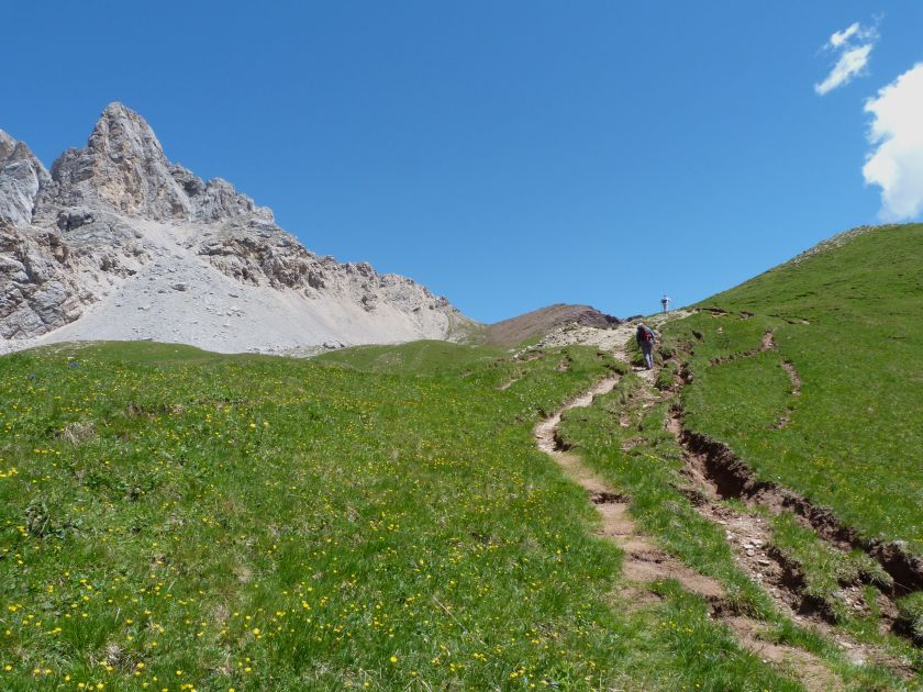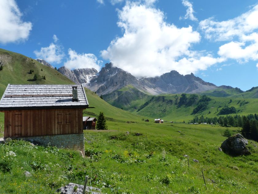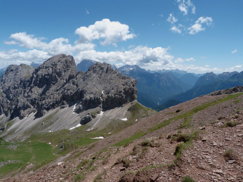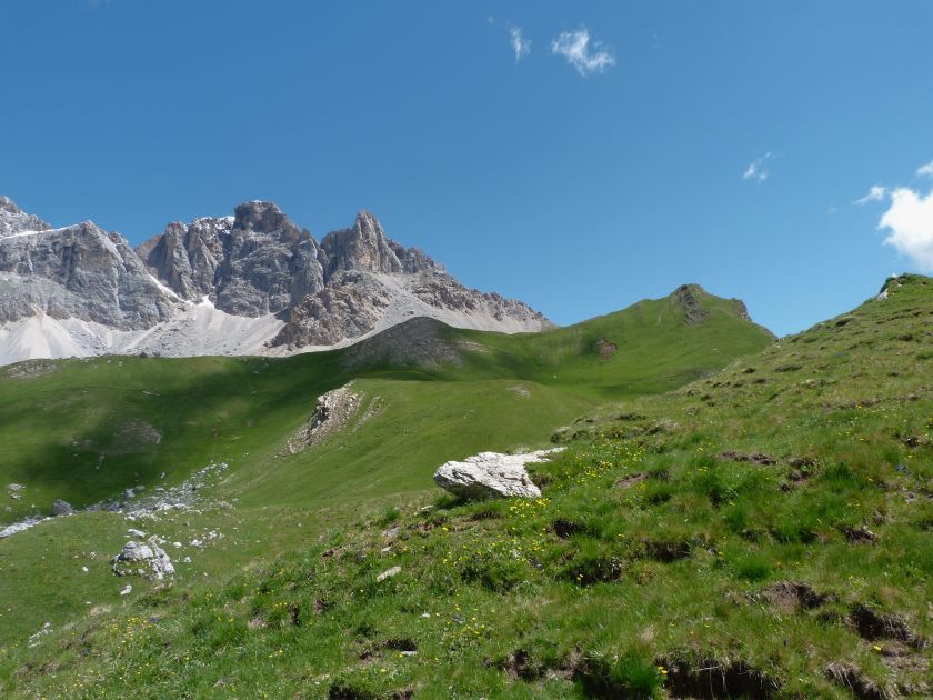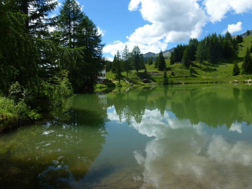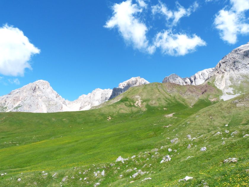 Ci sentiamo di indicarvi questa escursione come una delle più belle delle intere Dolomiti. La prima parte del percorso ricalca uno dei sentieri che gode nell’area di maggiore notorietà. La forestale che conduce al Rifugio Fuciade è sempre percorsa, estate e inverno, dai tanti turisti che affollano l’area del Passo di San Pellegrino. Il tracciato, ampio e quasi senza dislivello, dopo una prima parte prevalentemente boschiva raggiunge i bellissimi prati che caratterizzano la zona del Rifugio. Nei giorni tersi l’ambiente è paradisiaco e avrete la sensazione di trovarvi in qualche pascolo del Canada o della Scandinavia. Il rifugio è la meta di gran parte dei frequentatori della zona di conseguenza, nel proseguo, la presenza umana diviene meno forte e anzi, nella deviazione al Pizzo Forca vi sembrerà di essere in un altro luogo rispetto alla partenza. L’assenza di una traccia e di qualsiasi tipo di segnaletica rende la cima del tutto dimenticata e anche in piena estate non è raro trovarsi in completa solitudine. Nonostante il relativo isolamento la sommità resta alla portata, con tempo buono, di un escursionista di media esperienza in grado di destreggiarsi su terreno libero ma comunque senza salti rocciosi esposti. A completamento dell’avventura si riprende il sentiero segnato per guadagnare il valico della Forca Rossa godendo di nuovi splendidi scorci sui gruppi dolomitici circostanti. Nella stessa escursione potrete scorgere Civetta, Pelmo e Pale di San Martino solo per indicare i massicci più rilevanti. Quando eseguire questa camminata? Il tracciato è naturalmente accessibile per tutto il periodo compreso tra giugno e ottobre senza correre il rischio di incontrare tratti ghiacciati o innevati. La seconda metà di giugno è tuttavia il periodo più bello. La natura si risveglia dopo il lungo inverno alpino e il tracciato si riempie delle sfumature di migliaia di fiori a contrastare con la neve ancora presente sulle cime circostanti. In una giornata tersa si tratta di un’esperienza indimenticabile che ci sentiamo di raccomandare vivamente. L’escursione in breve: Parcheggio presso Albergo Miralago (m 1905) – Lago delle Pozze - Val dai Bè (m 1901) – Costa da Ciasaea (m 1910) – Pecol (m 1925) – Sbrinz (m 1970) – Rifugio Fuciade (m 1982) – innesto sentiero n° 670 (m 1974) – Anter le Aive (m 2088) – sentiero n° 694 – Pizzo Forca (m 2285) – Forca Rossa (m 2493) – sentiero n° 693 – innesto sentiero n° 670 (m 2346) – Rifugio Fuciade (m 1982) – a ritroso sino alla partenza. Dati tecnici: Partenza dal parcheggio presso l’Albergo Miralago (m 1905): Difficoltà: EE (Vai alla scala delle difficoltà). Sino al Rifugio Fuciade T, quindi E nella frazione successiva tranne nella deviazione dal sentiero 694 per raggiungere il Pizzo Forca dove la difficoltà diviene EE. Segnaletica: totale tranne nella deviazione dal sentiero 694 per raggiungere il Pizzo Forca dove non si incontra nessun tipo di segnaletica. Dislivello assoluto: m 598. Acqua potabile sul percorso: alla partenza e al Rifugio Fuciade. Durante il percorso si incontrano alcuni torrenti non sempre accessibili. Accesso alla partenza: Dal paese di Moena si segue la SS 346 raggiungendo il Passo di San Pellegrino. Procediamo oltre il valico per circa 200 metri trovando sulla sinistra, immediatamente dopo il ponticello in legno delle piste di sci, il bivio con cartello indicante “Lach de le Poze – Fuciada” nonché un pannello in legno che segnala l’Albergo Miralago. Abbandoniamo la statale per procedere in questa direzione. Il tratto transitabile in automobile è solo di poche centinaia di metri sino ad accedere al parcheggio posto presso l’Albergo Miralago dove possiamo lasciare l’automobile (m 1905). Subito prima della struttura si separa sulla destra la forestale a fondo naturale dove ha inizio il nostro cammino con indicazioni per il Rifugio Fuciade. Consigliamo in ogni caso la breve digressione all’Albergo Miralago per ammirare, presso la struttura, il piccolo ma pittoresco Lago delle Pozze. Chi proviene da Cencenighe Agordino raggiunge dapprima Falcade quindi si sale verso il Passo di San Pellegrino trovando la deviazione con cartello indicante “Lach de le Poze – Fuciada” sulla destra 200 metri prima dal valico. Il proesguo ricalca quanto detto sopra Descrizione del percorso: Il tratto compreso tra la partenza e il Rifugio Fuciade è uno dei sentieri più semplici e al tempo stesso spettacolari dell’intero circondario. Nel pieno della stagione estiva si rivela una processione continua di turisti attratti dalla straordinaria bellezza del circondario unitamente ad un percorso comodo e e adatto anche a vecchi e bambini. L’itinerario presenta inizialmente dislivelli davvero minimi. Si procede quasi in piano ignorando, in località Val dai Bè (m 1901) il bivio a destra per Malga Boer. Manteniamo l’ampia carrareccia a fondo naturale che si articola tra prati e boschi di conifere raggiungendo una bella schiarita subito oltre la località Costa de Ciasaea (m 1910). Una bella panchina in legno invita alla sosta permettendo un magnifico scorcio a distanza sulle vette delle Pale di San Martino. Si prosegue superando la località Pecol (m 1925) affrontando una breve frazione in modesta salita restando nel bosco di conifere. Poco oltre si dirada l’alberatura raggiungendo il bellissimo piano prativo dominato sullo sfondo dalla Catena della Cima dell’Uomo. Il paesaggio è bucolico: nel verde di prati si incontrano ad intervalli regolari alcuni fienili in legno muti testimoni di un’epoca in cui i contadini vivevano e lavoravano in questi magnifici prati. Le strutture sono state recuperate risultando splendidamente inserite in un idilliaco paesaggio che infonde profonda calma e serenità. Da rilevare la spettacolare vista, verso meridione, delle Pale di San Martino e dell’omonimo altopiano. Procediamo tra le morbide ondulazioni prative in pratica senza dislivelli; da ril