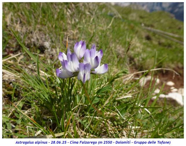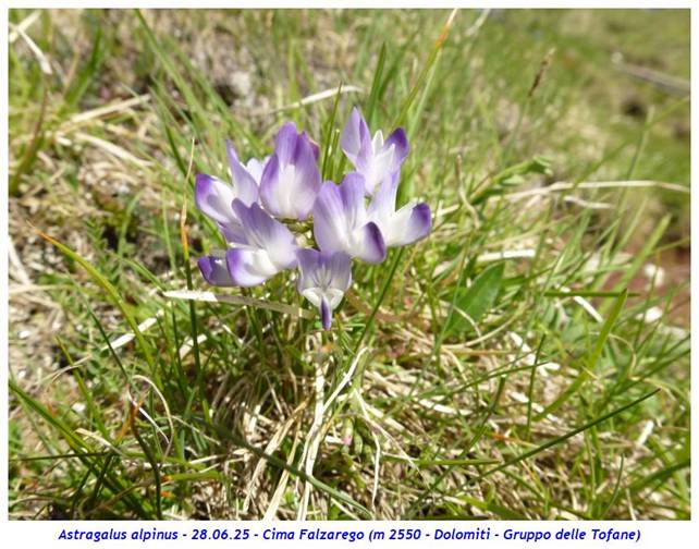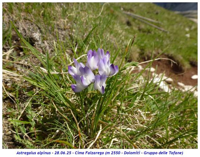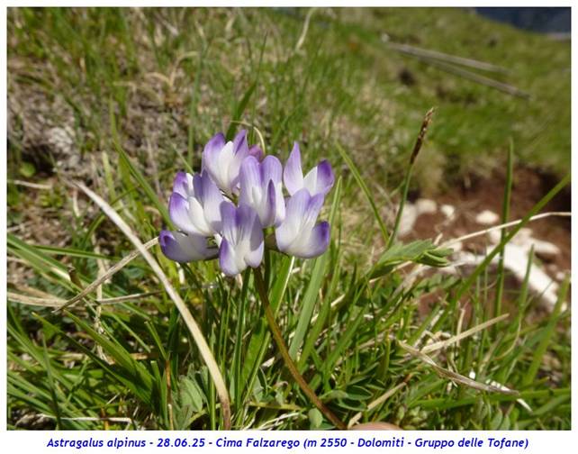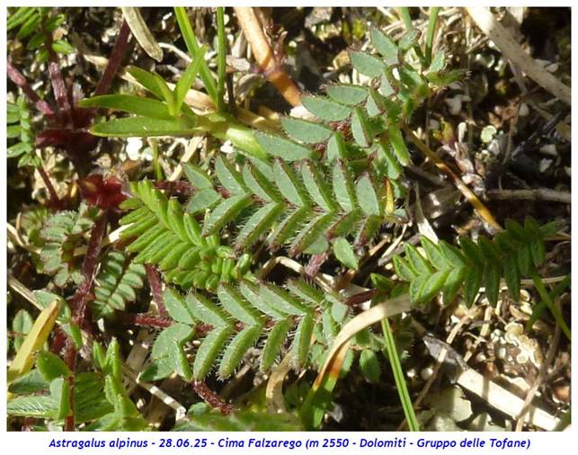 Nome scientifico: Astragalus alpinus L. (Sinonimi: Phaca astragalina L.) Famiglia: Fabaceae Altro nome comune: Astragalo delle Alpi Habitat naturale: Prati e pascoli asciutti, creste, luoghi aridi e rocciosi su substrato preferibilmente calcareo da 1700 a 3100 metri. Presente in Italia in Piemonte, Valle d’Aosta, Lombardia, Trentino Alto Adige, Veneto e Friuli. Dubbia la presenza della specie in Abruzzo. Periodo di fioritura: Da giugno ad agosto Descrizione della pianta: Pianta erbacea perenne artico alpina alta 5 – 25 cm con fusto prostrato-ascendente leggermente legnoso alla base.e scarsamente peloso. Le foglie, lunghe 10 – 13 mm e larghe 3 – 4 mm, sono stipolate, imparipennate con 7 – 12 paia di foglioline ellittiche, ottuse, glabrescenti nella pagina superiore tomentose in quella inferiore e con apice retuso. È presente un racemo globoso poco denso con 5 – 15 fiori, sostenuto da un lungo peduncolo e con i fiori inferiori lievemente penduli. La corolla, lunga circa 9 mm, è violetta all’apice di carena e vessillo, per il resto più chiara fino a bianco crema. Il calice, con tubo di 2,8 mm e denti di 2,5 mm, è diviso in 5 lobi e con pelosità sparsa piuttosto scura. Note: Il nome generico deriva dal greco “astrágalos” ovvero astragalo, un osso del tarso, probabilmente per l’aspetto angoloso dei semi. Dove l’abbiamo osservata: Le fotografie sono state realizzate lungo le pendici di Cima Falzarego (m 2550 – Dolomiti – Gruppo delle Tofane). ![]()