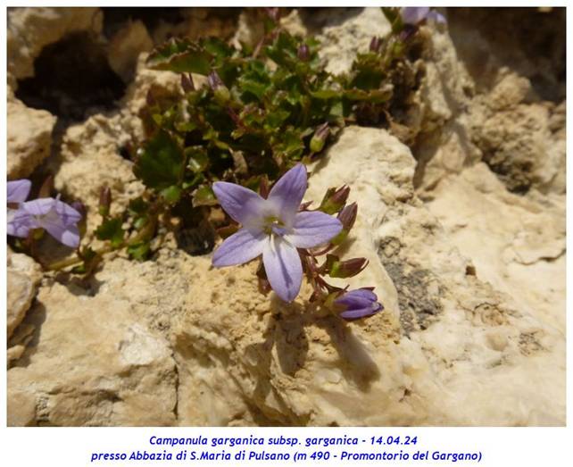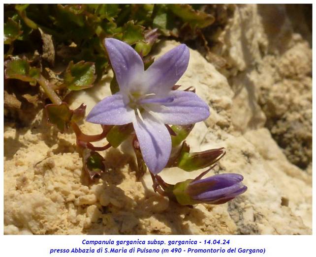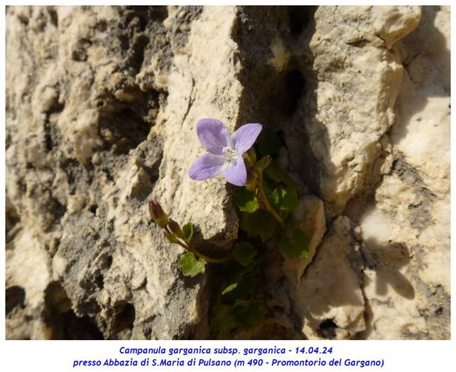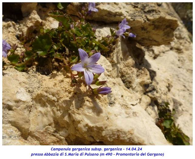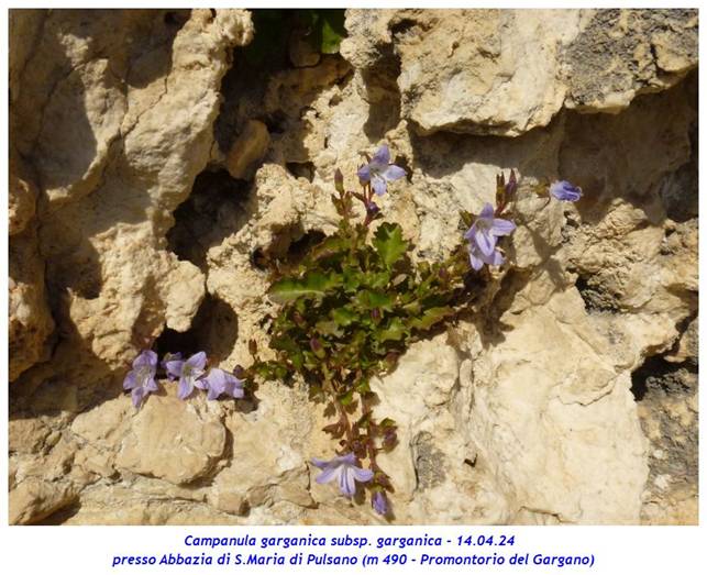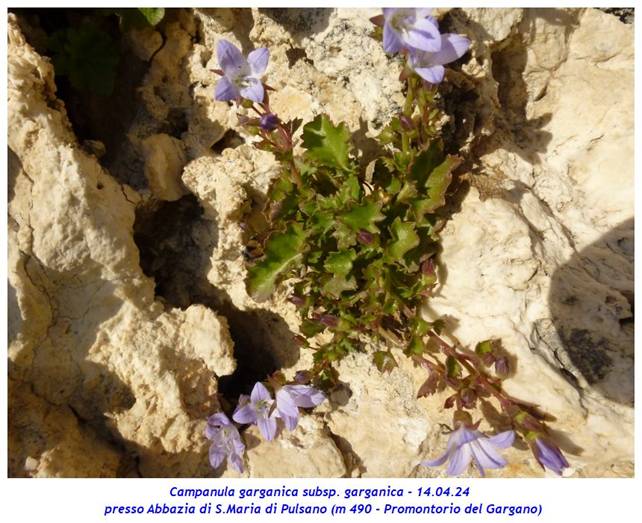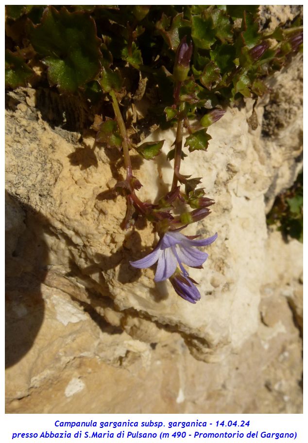 Nome scientifico: Campanula garganica Ten. subsp. garganica (Sinonimo: Campanula barbeyi Ferr) Famiglia: Campanulaceae Altro nome comune: Campanula garganica Habitat naturale: Rupi calcaree, muri, tagli di strada con inclinazioni molto elevate (prossime o superiori a 90°) da 0 a 850 metri. A livello di sottospecie è un endemismo in senso stretto del Promontorio del Gargano (Puglia). Le stazioni sono riunite in due nuclei principali, uno nel Gargano sud-orientale tra Pulsano e Mattinatella, e un altro nel Gargano nord-orientale tra San Menaio e Santa Maria di Merino. Altre stazioni più isolate sono presenti ad esempio a ovest – nordovest di Monte Sant’Angelo e nella Valle di San Giovanni a sud di Cagnano Varano. In Grecia sono presenti due entità molto simili spesso considerate sottospecie di Campanula garganica. Si tratta di Campanula cephallenica Ferr sulle Isole Ionie di Cefalonia, Leucade e Zante, e di Campanula acarnanica Damboldt presente lungo la costa occidentale della Grecia continentale antistante l’isola di Leucade. Periodo di fioritura: Da maggio a luglio Descrizione della pianta: Pianta erbacea perenne e rustica alta 10 – 20 cm con rizoma ramoso inserito nella roccia. Sono presenti rosette sterili all’ascella dei fusti che si presentano prostrato-penduli e più o meno pubescenti. Le foglie basali hanno lamina ovata o reniforme lunga 2 – 4 cm con bordo crenato o seghettato. Sono portate da piccioli lunghi 2 – 10 cm. Le foglie cauline sono alterne, con dimensioni progressivamente ridotte, con lamina ovale e margine dentato. La corolla, con diametro di 20 – 22 mm, è imbutiforme-stellata di colore compreso tra l’azzurro, il violetto pallido e il bianco con apice inferiormente più o meno pubescente. Il tubo corollino, lungo 1/3 del totale, presenta forma conica. Sono presenti lacinie acute, larghe alla base 4 – 5 mm e più o meno patenti. Lo stilo è sporgente, eretto, di colore violaceo e lungo fino a 12 mm. Le antere, lunghe circa 4 mm, presentano polline giallo e sono portate da filamenti con espansione pentagonale alla base. Il calice presenta denti larghi e riflessi o patenti (2 x 6 mm). Note: È specie spesso coltivata nei giardini rocciosi e con tendenza a spontaneizzarsi, sempre vicino alle abitazioni, sia in forme abbastanza simili alla stirpe selvatica sia in ibridi con specie vicine o cultivar di origine orticola. È stata dimostrata l’affinità genetica di Campanula garganica con le illiriche Campanula fenestrellata subsp. istriaca e Campanula portenschlagiana a sostegno dell’ipotesi della maggior affinità floristica del Gargano con la Penisola Balcanica rispetto all’Italia continentale. Dove l’abbiamo osservata: Le fotografie sono state realizzate presso l’Abbazia di Santa Maria di Pulsano, nelle rocce che sovrastano il sentiero che conduce a Tomaiuolo (m 490 – Promontorio del Gargano). ![]()