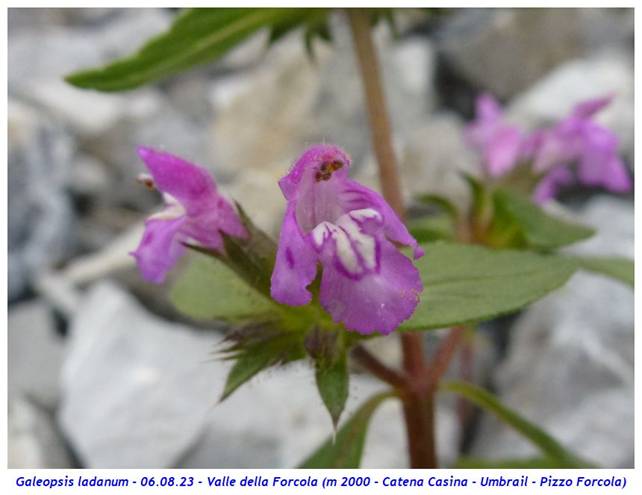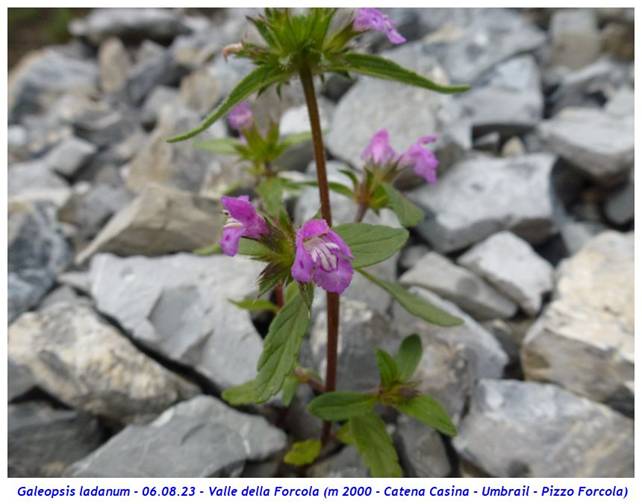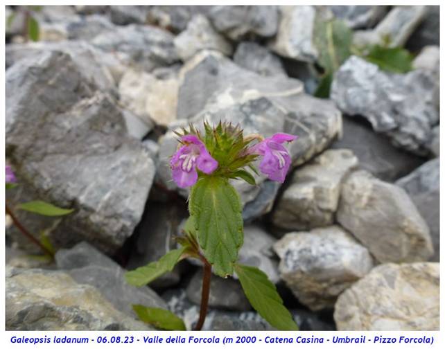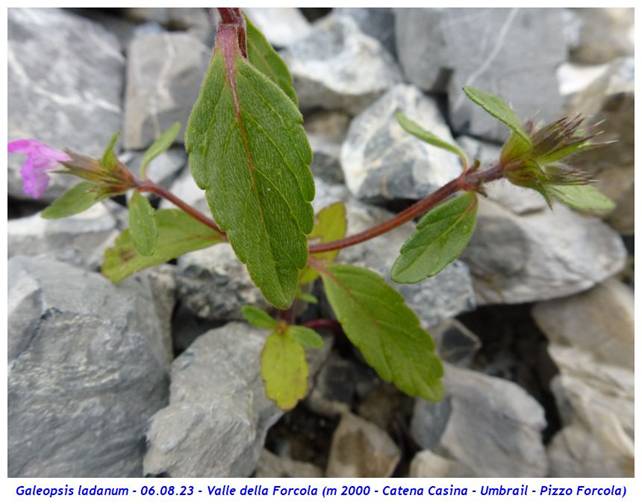 Nome scientifico: Galeopsis ladanum L. (Sinonimi: Galeopsis intermedia Vill. – Dalanum ladanum (L.) Dostál – Galeopsis agrigena Koso-Pol. – Galeopsis albertii Sennen – Galeopsis arvensis Salisb. – Galeoopsis balatonensis Borbás – Galeopsis glandulosa K.Koch – Galeopsis costei Senne – Galeopsis filholiana Timb.-Lagr. – Galeopsis flanatica Borbás – Galeopsis grandiflora M.Bieb. – Galeopsis latifolia Hoffm. – Galeopsis litoralis Borbás – Ladanum intermedium Slavikova – Ladanum purpureum Gilib. – Lamium ladanum (L.) Crantz – Tetrahit ladanum (L.) Moench – Tetrahit vulgare Bubani) Famiglia: Lamiaceae Altri nomi comuni: Galeopside ladano – Galeopsis ladano Habitat naturale: Macereti, pietraie, ghiaie, ruderi, incolti, talvolta come infestante dei coltivi da 0 a 2300 metri. Presente in tutte le regioni d’Italia tranne in Sicilia e in Sardegna; non più ritrovata anche nel Lazio. Incerta la presenza in Puglia. Periodo di fioritura: Da aprile a luglio Descrizione della pianta: Pianta erbacea annua alta 3 – 80 cm (solitamente tra 10 e 40 cm). Il fusto è eretto, non ginocchiato ai nodi, ramificato fin dalla base e ricoperto da peli ghiandolari bianchicci e ricurvi, appressati o patenti con ghiandola globosa scura. Le foglie, lunghe 2,7 – 8,3 cm e larghe 0,3 – 3,5 cm, sono sostenute da piccioli lunghi 0,3 – 3 cm e presentano lamina ovato-lanceolata con bordo che presenta 3 – 10 denti ottusi molto pronunciati e con nervature ben evidenti; sulla pagina fogliare sono presenti peli ghiandolari sparsi, più densi nella pagina inferiore. L’infiorescenza è data da verticilli con 6 – 8 fiori con brattee simili alle foglie e bratteole lanceolate spinescenti più lunghe del calice. La corolla è bilabiata, lunga 9,5 – 28 mm con screziatura porporina e giallo chiara nella fauce; il labbro superiore ha la forma di un elmo di 2,5 – 7 mm con all’esterno peli semplici nella parte superiore. Il labbro inferiore, lungo 3 – 11 mm, è perpendicolare al tubo ed è trilobato con 2 gibbosità sporgenti di colore compreso tra il rosa e il bianco-giallastro. Il lobo mediano è più grande e sfrangiato rispetto ai laterali che appaiono più brevi, rivolti verso il basso e ben distanziati dal lobo centrale. Sono presenti 4 stami nel labbro superiore con filamenti peloso-papillosi e antere giallastre ciliate. Note: Il nome generico della specie deriva dal greco “galè” (donnola) e “òpsis” (aspetto) ovvero “fiori con aspetto di donnola” per via dell’aspetto dei fiori osservato di profilo. Il nome specifico è un riferimento al “ladanum”, una sostanza resinosa emessa da alcune piante e usata come fissativo in profumeria. La specie contiene tannini, silicio e saponine ed è utilizzata per curare l’apparato respiratorio. È possibile la confusione con Galeopsis angustifolia Hoffm. che presenta tuttavia peli crespi sul fusto appressati ma solo raramente ghiandolari; le foglie presentano lamina lineare-lanceolata e sono 5 – 10 volte più lunghe che larghe oltre ad avere sul bordo 3 – 8 dentelli per lato. Dove l’abbiamo osservata: Tutte le fotografie sono state realizzate nella Valle della Forcola (m 2000 – Catena Casina – Umbrail – Pizzo Forcola). ![]()