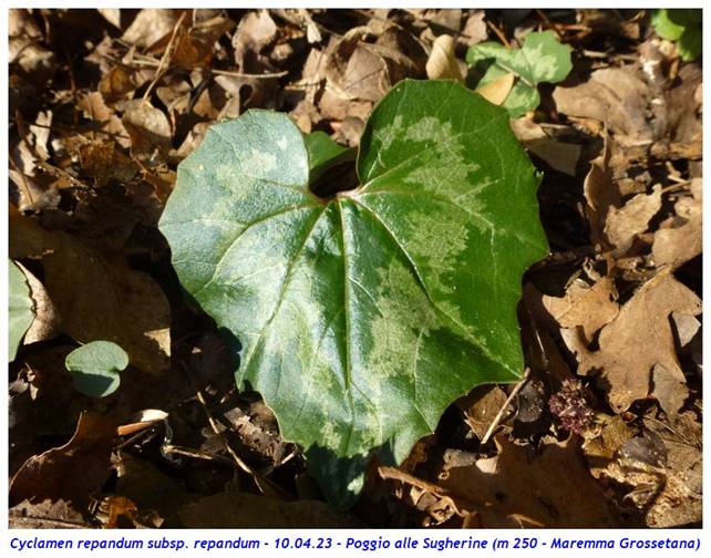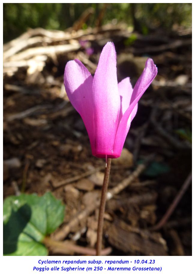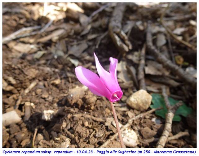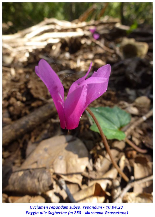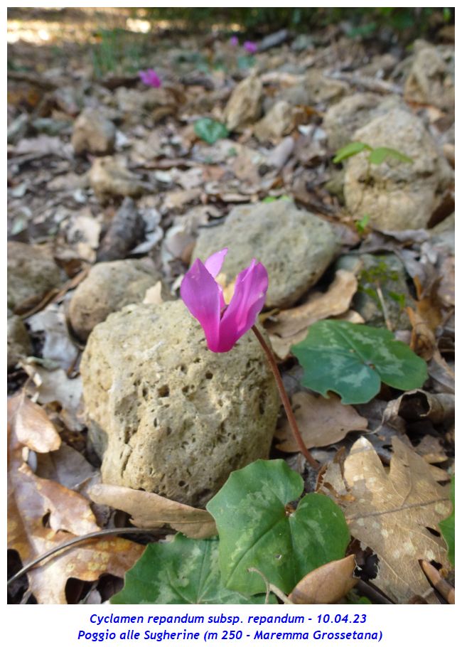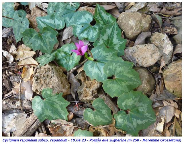 Nome scientifico: Cyclamen repandum Sm. subsp. repandum (Sinonimi: Cyclamen vernale O.Schwarz – Cyclamen vernum Rchb. – Cyclamen romanum Griesb.) Famiglia: Primulaceae Habitat naturale: Macchie, leccete, boschi di caducifoglie, cespuglieti ombrosi da 0 a 1200 metri. Presente in tutte le regioni del centro sud Italia, a partire da Toscana e Marche comprese scendendo verso meridione. Presente anche in Sicilia e Sardegna. Sono segnalate infine alcune stazioni nella Romagna orientale e una stazione è presente in Veneto in Valdobbiadene. Periodo di fioritura: Da marzo a maggio Descrizione della pianta: Pianta erbacea perenne alta 10 – 20 cm con tubero orbiculare largo 2 – 6 cm con radici presenti solo al centro della parte inferiore. Le foglie sono glabre, sostenute da piccioli lunghi 6 – 16 cm; la lamina è grosso modo triangolare, lunga 4 – 8 cm e larga 4 – 9 cm, profondamente dentata e con apice acuto. La pagina superiore è verde con macchie grigio chiare mentre la pagina inferiore è glabra di colore variabile tra il verde grigiastro e il rossastro. Il fiore è solitario, inodore, reclinato, sostenuto da un peduncolo lungo 12 – 20 cm; la corolla è porporina, più scura alla fauce, con 5 petali a base non auricolata con lacinie bislungo-lanceolate riflesse e lievemente ritorte lunghe 18 – 22 mm e larghe 5 – 6 mm. Lo stilo sporge dalla fauce; sono inoltre presenti 5 stami. Note: Il nome generico “Cyclamen” deriva dal vocabolo greco “circolare” in riferimento ai bulbi rotondeggianti. Il nome specifico deriva dal latino “repandum” ovvero “ripiegato all’insù” in riferimento ai petali riflessi. La specie è molto tossica per la presenza della ciclamina. Dove l’abbiamo osservata: Tutte le fotografie sono state realizzate nella zona di Alberese lungo le pendici del Poggio alle Sugherine (m 250 – Maremma Grossetana). ![]()