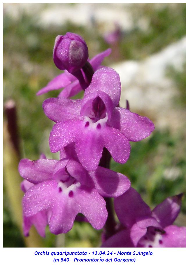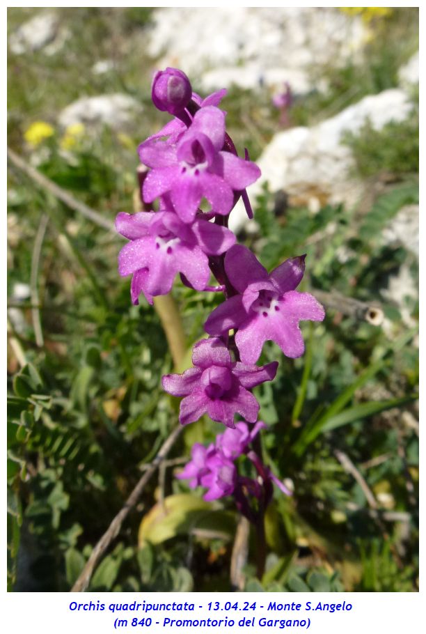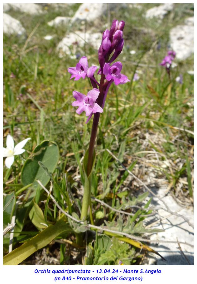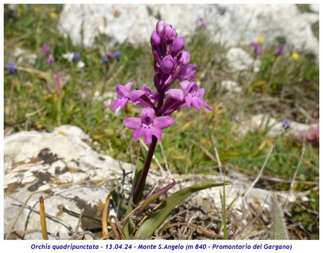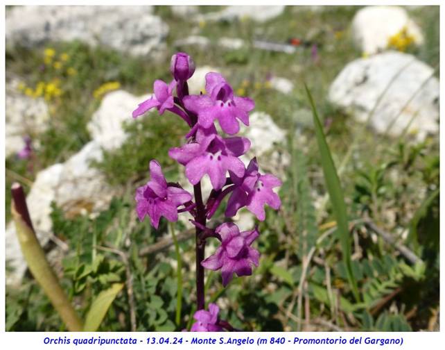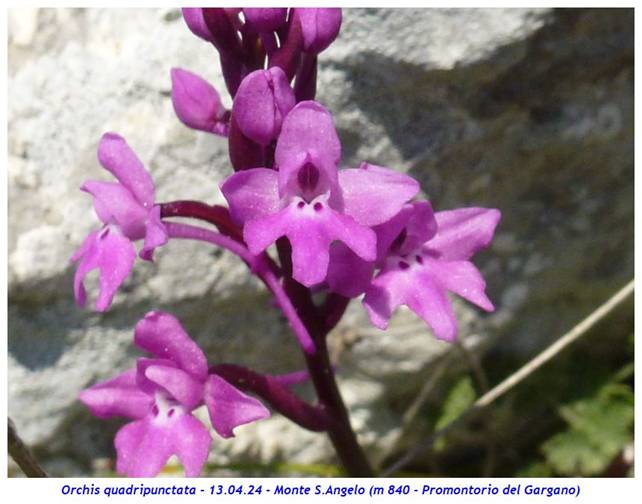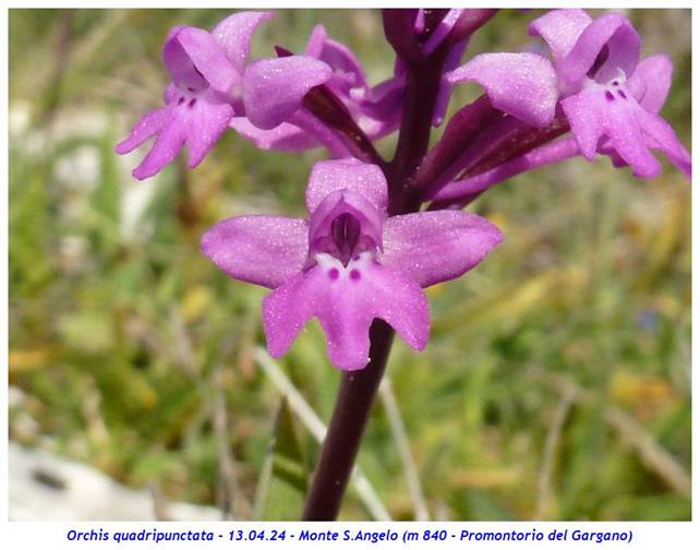 Nome scientifico: Orchis quadripunctata Cirillo ex Ten. (Sinonimi: Anacamptis quadripunctata Lindl. – Orchis bracifortii Biv. – Orchis hostii Tratt.) Famiglia: Orchidaceae itat naturale: Pascoli rocciosi, garighe, macchie, margini boschivi, bordi delle strade su substrato calcareo da 200 a 900 metri. Presente in Italia in Abruzzo (provincia di Chieti), Puglia (provincia di Foggia), Campania (province di Benevento, Avellino e Salerno), Basilicata e Calabria (provincia di Cosenza) Periodo di fioritura: Da marzo a giugno Descrizione della pianta: Pianta erbacea perenne alta fino a 30 cm con 2 rizotuberi ovoidali subglobosi e con fusto gracile, sottile e slanciato, solitamente di colore rosso violaceo verso la sommità. È presente una rosetta basale con 2 – 6 foglie lunghe 4 – 12 cm e larghe 1 – 3 cm oblungo-lanceolate di solito maculate, qualche volta no; le foglie cauline, lunghe 5 – 10 cm e larghe circa 1 cm, sono più piccole e guainanti. L’infiorescenza, lunga fino a 10 cm, è lassa con 5 – 35 fiori di colore variabile tra il rosa e il rosso-violetto; raramente si incontrano individui del tutto bianchi. I tepali esterni, lunghi 3 - 5 mm, sono ovati e patenti mentre i tepali interni sono lunghi la metà dei precedenti e sono conniventi. Il labello è speculare ai sepali, lungo 4 – 5 mm o meno, ed è sempre trilobato con lobi di dimensione simile tra loro; di solito presenta base bianca con quattro evidenti punti di colore porporino scuro due dei quali sono ben evidenti alla base del labello mentre gli altri 2 sono meno visibili, posti verso l’ingresso dello sperone. Lo sperone, lungo 8 – 14 mm, è filiforme, rossiccio, lungo circa come l’ovario e di solito discendente. Note: Il nome specifico della specie si riferisce ai quattro punti scuri posti alla base del labello. La variabilità della specie si limita all’intensità del colore dei fiori variabile tra il biancastro, il rosato e il purpureo oltre alla lobatura più o meno marcata del labello. Sono segnalati ibridi con Orchis pauciflora e Orchis provincialis Dove l’abbiamo osservata: Le fotografie sono state realizzate presso Monte Sant’Angelo (m 840 – Promontorio del Gargano). ![]()