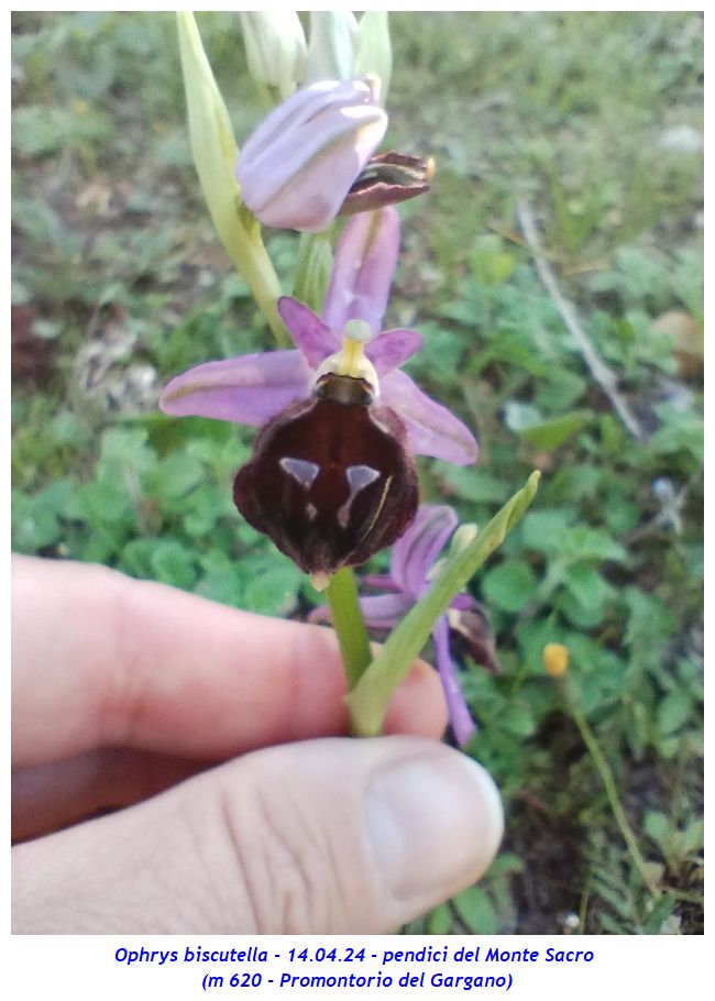 Nome scientifico: Ophrys biscutella O.Danesch & E.Danesch (Sinonimi: Ophrys argolica subsp. biscutella (O.Danesch & E.Danesch) Kreutz – Ophrys fuciflora (F. W.Schmidt) Moench. subsp. pollinensis E. Nelson – Ophrys exaltata Ten. subsp. sundermanni Soó – Ophrys crabronifera Mauri subsp. sundermanni (Soó) Del Prete) Famiglia: Orchidaceae Altro nome comune: Orchidea dalle due macchie Habitat naturale: Pascoli sassosi, prati aridi, garighe, bordi delle strade, radure delle pinete e dei querceti su suolo calcareo o scistoso da 280 a 1100 metri. Endemismo dell’Italia meridionale presente in Puglia (Gargano – provincia di Foggia), Campania (province di Caserta e Salerno), Basilicata (provincia di Potenza) e Calabria (provincia di Cosenza). La specie è frequente solo sul Gargano, nelle altre zone indicate è segnalata sporadicamente. Periodo di fioritura: Da marzo a maggio Descrizione della pianta: Pianta erbacea perenne robusta alta 10 – 30 cm. Le foglie basali sono ovate; sono presenti brattee più lunghe dell’ovario. I fiori, in numero da 2 a 10, presentano sepali lunghi 13 – 18 mm e larghi 6 – 9 mm di colore bianco o rosato. I petali, lunghi 6 – 11 mm e larghi 2 – 4,5 mm, sono più scuri. Il labello è più grande dei petali (12 – 15 mm x 15 – 20 mm); presenta forma suborbicolare, in apparenza trapezoidale per le spalle basali più squadrate. La macula è spesso ridotta a due rombi o losanghe talvolta uniti come degli occhiali da cui deriva il nome italiano della specie. A volte è presente un ocello centrale. L’apicolo è ridotto e solitamente appare rivolto verso il basso. La cavità stigmatica presenta base molto stretta mentre gli pseudo-occhi sono ben evidenti, spesso nerastri. Note: Il nome specifico della specie “biscutella” deriva dal latino e significa “due piccoli scudi”, in riferimento alla forma della macula nel labello. L’impollinazione avviene ad opera di Antropophora retusa. Le popolazioni più numerose e di facile identificazione sono quelle garganiche mentre nelle altre aree risulta più sporadica. Dove viene a contatto con Ophrys crabronifera o con Ophrys pollinensis il riconoscimento diviene arduo in quanto i caratteri delle specie si mescolano creando popolazioni con caratteristiche intermedie. È il caso ad esempio delle popolazioni presenti in Abruzzo presso Popoli e Collepietro i cui fiori sono molto simili a Ophrys biscutella ma con caratteri propri di Ophrys crabronifera. Dove l’abbiamo osservata: Le fotografie sono state realizzate alle pendici del Monte Sacro (m 620 – Promontorio del Gargano). ![]()