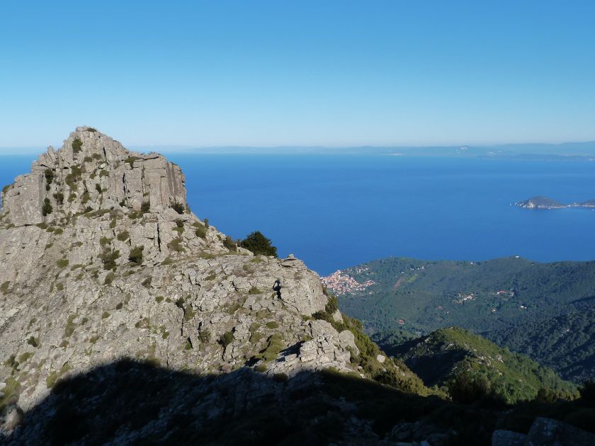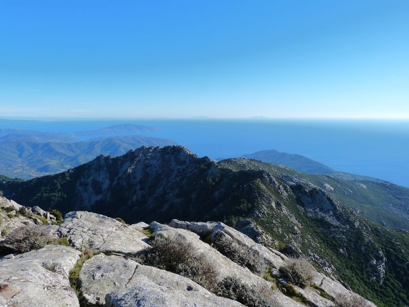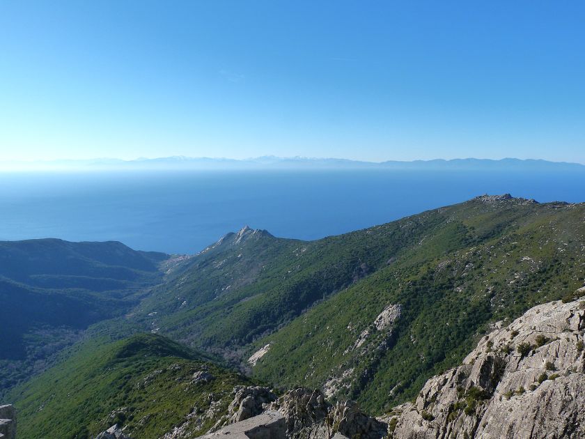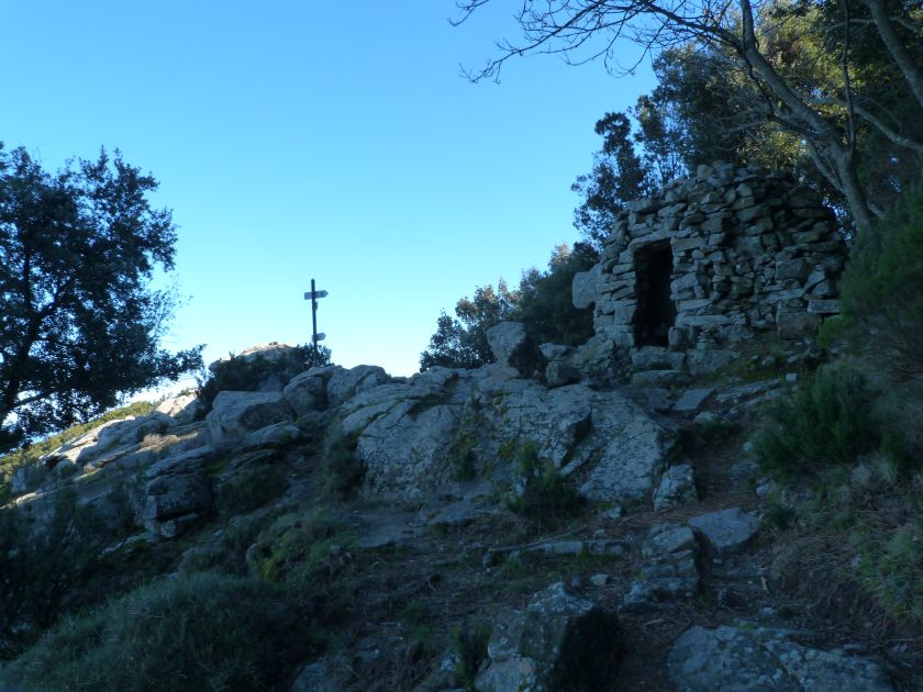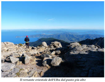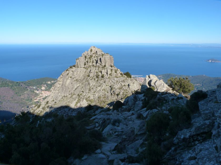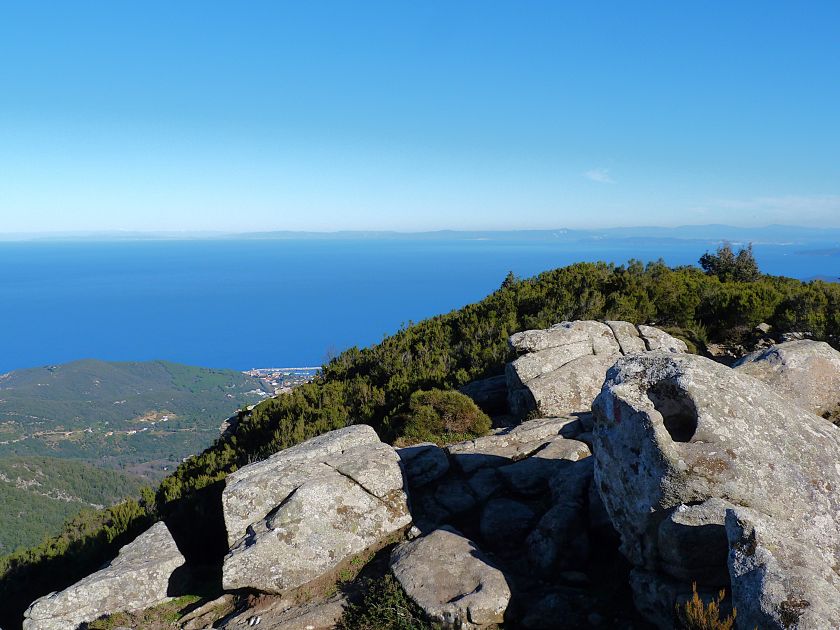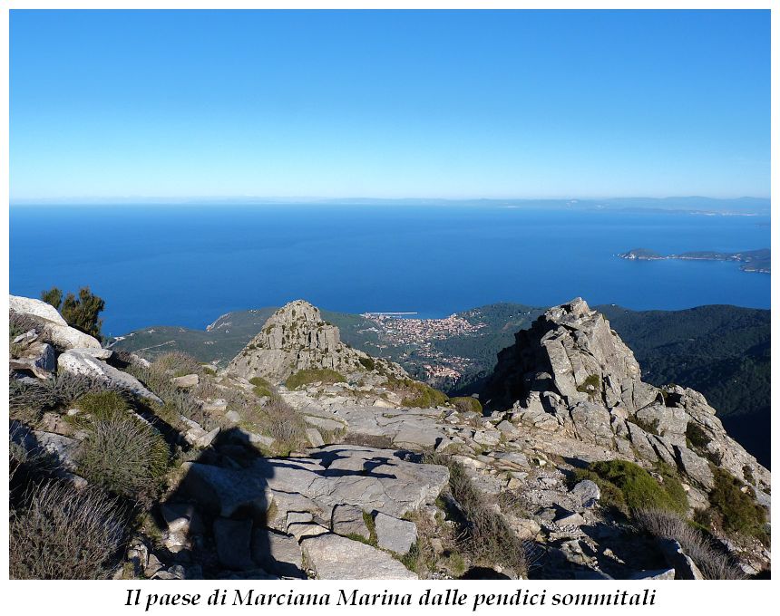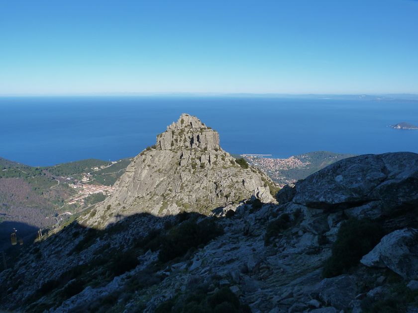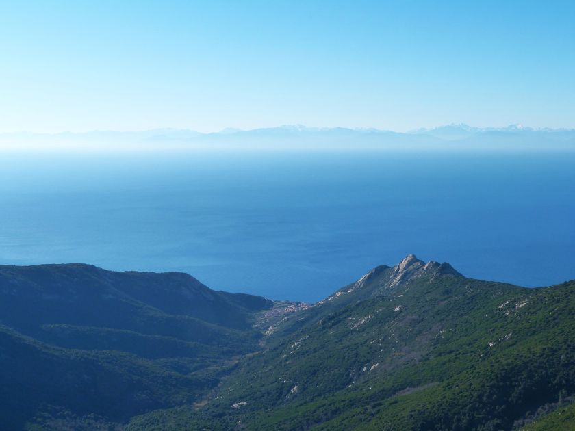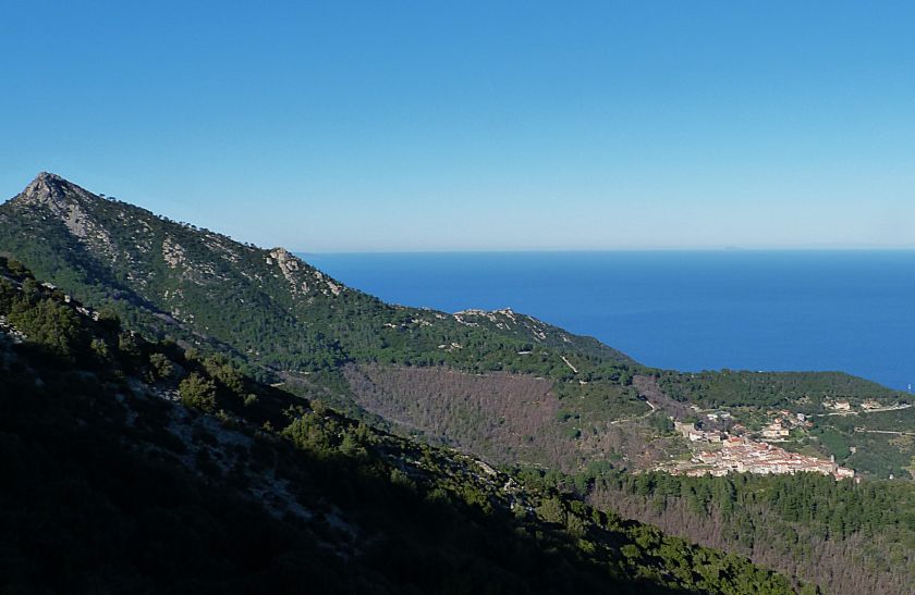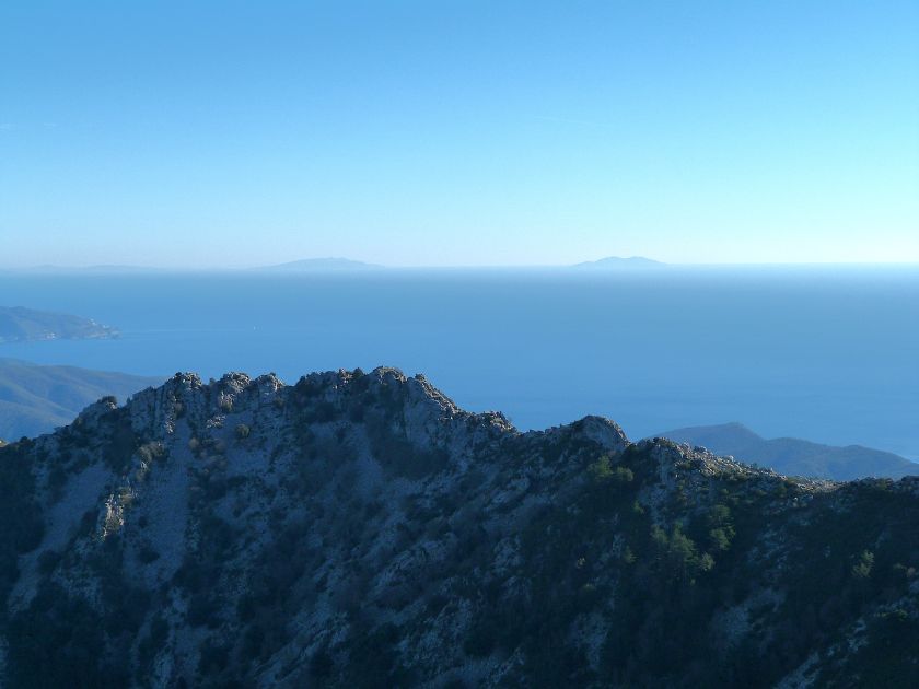 Tra gli itinerari escursionistici più spettacolari nell’ambito dell’Isola d’Elba non può certo mancare la salita al Monte Capanne. Posto nel lato occidentale dell’isola è il tetto non solo dell’intero Arcipelago Toscano ma anche, curiosamente, dell’intera provincia di Livorno che non offre nemmeno nella sua fascia continentale un’elevazione più alta. Il panorama di vetta non è semplicemente “bello”; stiamo parlando piuttosto di qualcosa che desta profonda sensazione per l’incredibile ampiezza della vista. In una giornata tersa dalla cima del Capanne si osservano le isole di Gorgona, Capraia, Pianosa, Montecristo e Giglio oltre alle grandi vette della Corsica. Verso nord l’orizzonte è occupato dal crinale appenninico tosco emiliano mentre a sud scorgiamo il promontorio dell’Argentario. È un qualcosa di indimenticabile così come particolare è la frazione sommitale del sentiero. Grandi massi di granito rendono l’ambiente tutt’altro che mediterraneo. Le pendenze e il fondo roccioso attribuiscono all’ascesa un sapore decisamente alpestre che nulla ha a che fare con i sentieri nella macchia che caratterizzano le quote inferiori dell’Isola d’Elba. In inverno la neve ricopre talvolta il settore sommitale rendendo l’ascesa assai impegnativa. Nel nostro caso siamo saliti in vetta nel mese di dicembre approfittando tuttavia di una fase secca. Nonostante ciò era presente presso la cima parecchia brina creando un particolarissimo contrasto con la grande mitezza della costa sottostante. Da rilevare la presenza della cabinovia che conduce in circa 18 minuti poco sotto il punto più alto. L’impianto è aperto normalmente nel periodo compreso tra aprile e ottobre. Qualcuno potrebbe prendere in considerazione l’ipotesi di salire con l’impianto per raggiungere in una decina di minuti la vetta e discendere a valle con il sentiero. Ci sentiamo tuttavia di sconsigliare questa ipotesi per via della segnaletica pressoché inesistente in alcune buie frazioni boschive. Conviene affrontare la faticosa salita memorizzando negli ombrosi tratti nella vegetazione alcuni riferimenti che permetteranno in discesa di non faticare troppo nel ritrovare la via. Nella speranza il sentiero venga al più presto segnato di fresco la salita resta un’impresa atipica di grande suggestione da eseguirsi nelle mezze stagioni o, con molta cautela, in inverno. Meno consigliabile è la stagione estiva nonostante gran parte dell’ascesa si sviluppi all’ombra del bosco in quanto umidità e foschia spesso riducono sensibilmente la visibilità. Occorre ricordare come tutta l’escursione si sviluppi nell’ambito del Parco Nazionale dell’Arcipelago Toscano; siamo pertanto in un’area protetta per le sue peculiarità faunistiche e botaniche ed è scontato ricordare l’importanza di accostarsi in questo ambiente con discrezione evitando in tutti i modi di lasciare traccia del nostro passaggio. L’escursione in breve: Marciana (m 360) – Romitorio di San Cerbone (m 529) – incrocio nel bosco con GTE Nord (m 645) – terzo incrocio con GTE (m 762) – stazione a monte della seggiovia (località Torretta – m 963) – Monte Capanne (m 1019) Partenza da Marciana (m 360): Difficoltà: EE sebbene in assenza di passaggi impegnativi per via della segnaletica a tratti poco evidente (Vai alla scala delle difficoltà). Segnaletica: tutti i bivi sono segnalati con cartelli tuttavia la segnaletica appare nel complesso scarsa e poco evidente (dicembre 2024). Dislivello assoluto: m 659. Acqua sul percorso: assente Accesso: Da Portoferraio si segue la SP 24 sino a Procchio quindi si procede sulla SP 25 raggiungendo Marciana Marina. La strada procede abbandonando il paese per inoltrarsi in ripida salita nella parte interna dell’isola. Tocchiamo la frazione di Poggio e in breve siamo a Marciana dove possiamo parcheggiare l’automobile. L’escursione ha inizio presso il punto in cui, sulla sinistra, si separa dalla provinciale Via Cà de Santi proprio in coincidenza della bella piazzetta dove troviamo la farmacia del paese. Un cartello escursionistico indicante il Romitorio di San Cerbone ad un’ora di marcia e il Monte Capanne a ore 2.45 elimina ogni dubbio sulla direzione da seguire (m 360). Descrizione del percorso: L’escursione alla cima più alta dell’Isola d’Elba segue integralmente il segnavia 101. Inizialmente il percorso serpeggia tra i vicoletti chiusi al traffico dell’abitato di Marciana. In coincidenza della Piazza Vittorio Emanuele II° invece di procedere risalendo la scalinata si volge a sinistra trovando il segnavia con indicata la deviazione proprio sul muro presso l’angolo della casa. In generale la segnaletica è fin troppo essenziale e così sarà fino in cima; sarebbe senz’altro raccomandabile l’aggiunta di qualche segnavia in più. Nel proseguo siamo tra le ultime case dell’abitato. Intercettiamo il vertice di Via della Rena ignorandone il tratto asfaltato che cala a sinistra. Restiamo sul tratto cementato che sale a destra e che lascia spazio, subito oltre, al sentiero vero e proprio. Il tracciato si inoltra nella boscaglia con pendenze inizialmente molto contenute. Tra l’alberatura abbiamo qualche scorcio verso la cima del Monte Capanne. La montagna appare spesso in ombra al mattino specialmente salendo nella stagione fredda quando il sole è particolarmente basso. La salita si articola in effetti nel versante settentrionale della montagna in ambiente non a caso umido e boscoso. Il tracciato si sviluppa per lunghi tratti pressoché in piano superando un primo solco con l’ausilio di un ponticello in legno. Poco oltre incontriamo un torrente che scavalchiamo senza troppe difficoltà cercando gli appoggi migliori tra i massi. Procediamo lungamente con il sentiero che comincia a risalire il pendio e con rari scorci tra le frasche in direzione del Capo d’Enfola. In inverno l’abbondante fogliame caduto copre i massi rendendo la marcia a tratti un po’