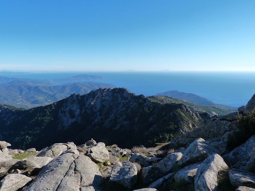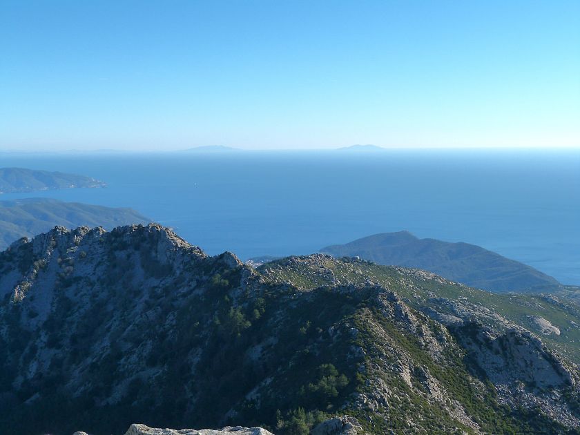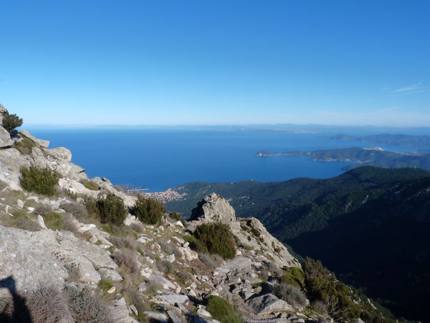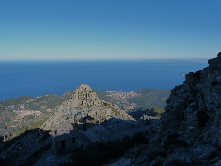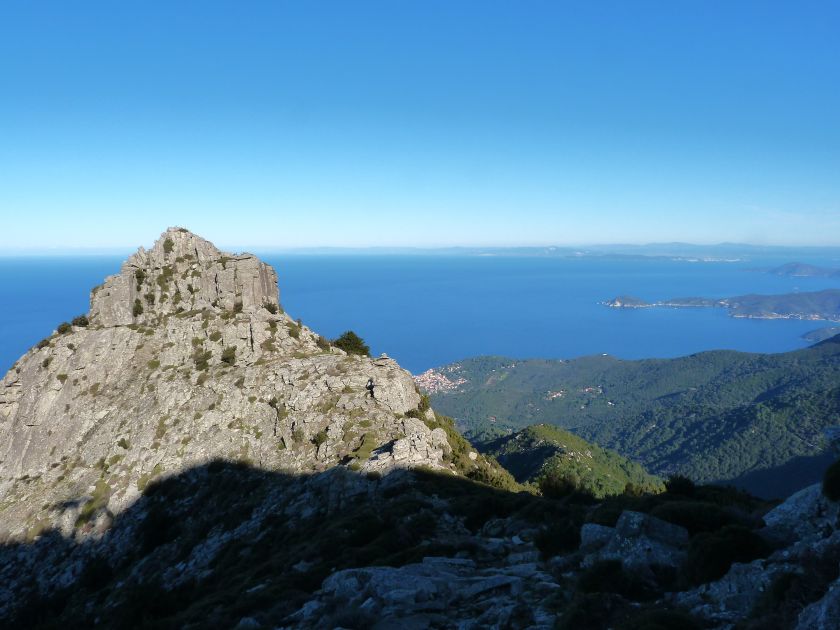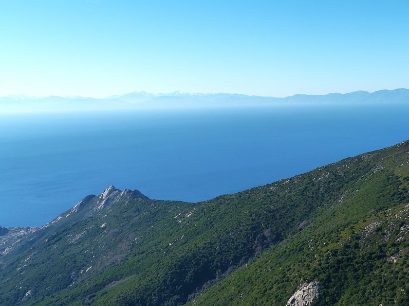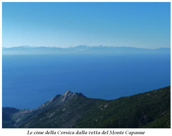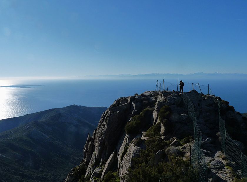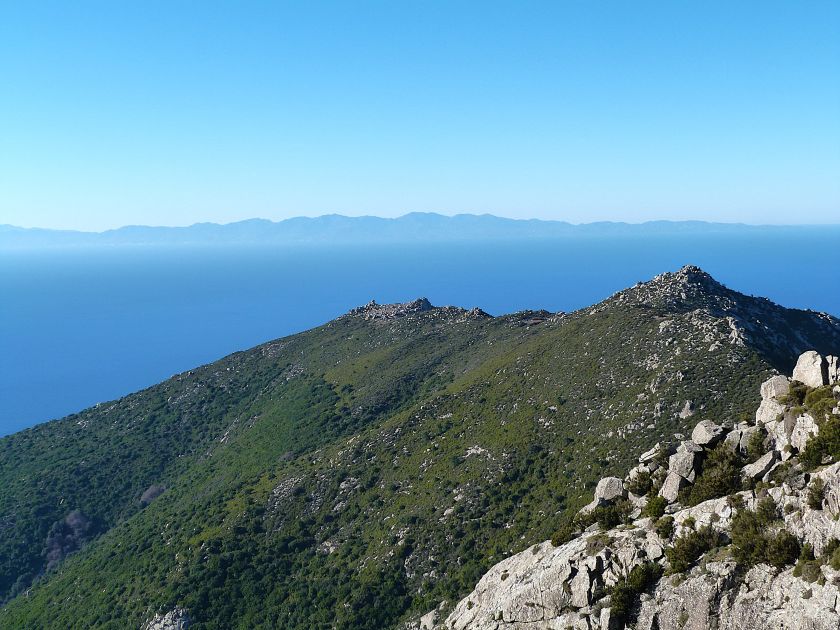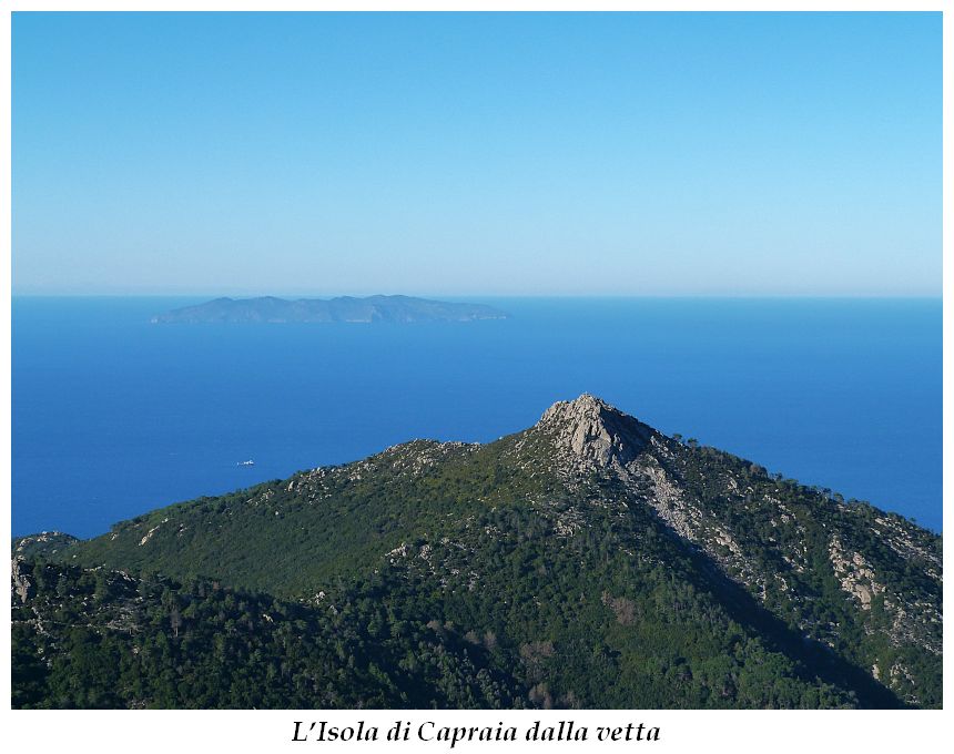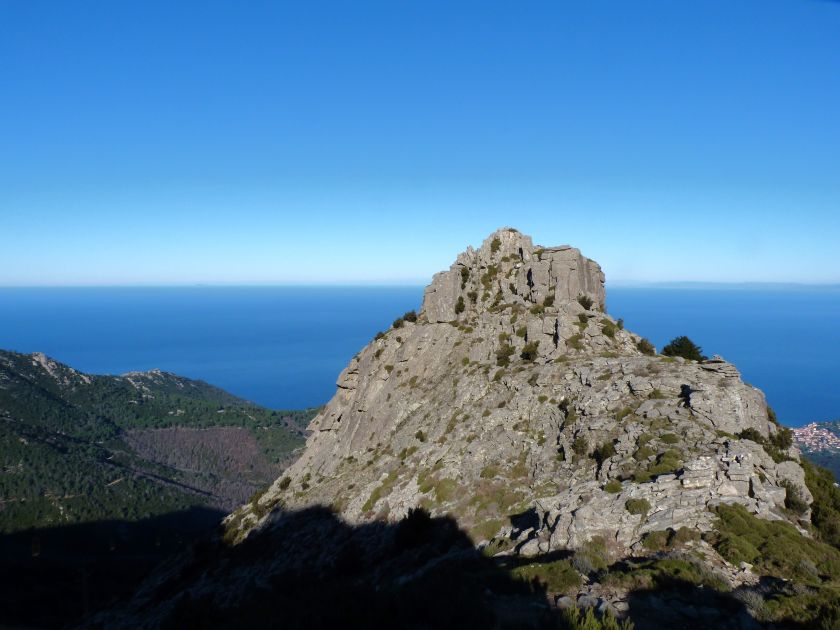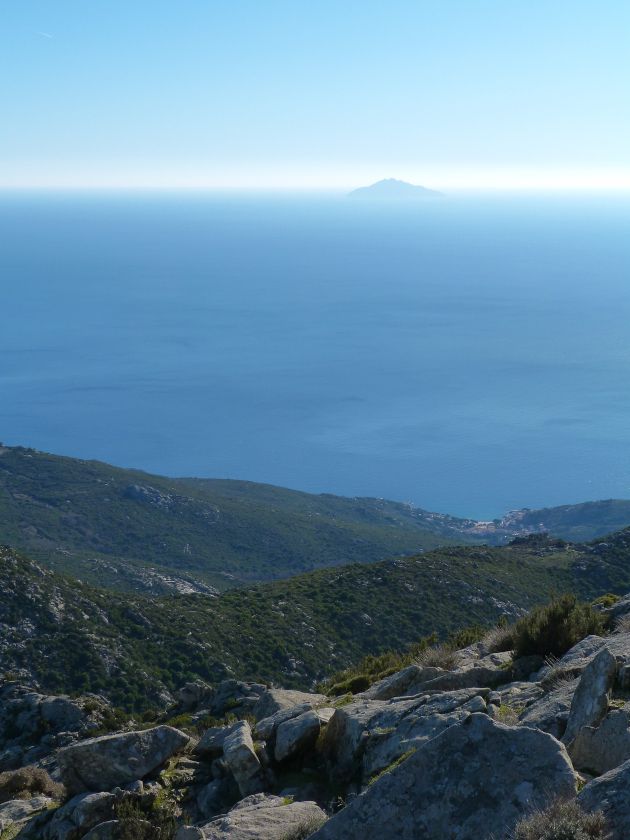Tra gli itinerari escursionistici più spettacolari nell’ambito dell’Isola d’Elba non può certo mancare la salita al Monte Capanne. Posto nel lato occidentale dell’isola è il tetto non solo dell’intero Arcipelago Toscano ma anche, curiosamente, dell’intera provincia di Livorno che non offre nemmeno nella sua fascia continentale un’elevazione più alta. Il panorama di vetta non è semplicemente “bello”; stiamo parlando piuttosto di qualcosa che desta profonda sensazione per l’incredibile ampiezza della vista. In una giornata tersa dalla cima del Capanne si osservano le isole di Gorgona, Capraia, Pianosa, Montecristo e Giglio oltre alle grandi vette della Corsica. Verso nord l’orizzonte è occupato dal crinale appenninico tosco emiliano mentre a sud scorgiamo il promontorio dell’Argentario. È un qualcosa di indimenticabile così come particolare è la frazione sommitale del sentiero. Grandi massi di granito rendono l’ambiente tutt’altro che mediterraneo. Le pendenze e il fondo roccioso attribuiscono all’ascesa un sapore decisamente alpestre che nulla ha a che fare con i sentieri nella macchia che caratterizzano le quote inferiori dell’Isola d’Elba. In inverno la neve ricopre talvolta il settore sommitale rendendo l’ascesa assai impegnativa. Nel nostro caso siamo saliti in vetta nel mese di dicembre approfittando tuttavia di una fase secca. Nonostante ciò era presente presso la cima parecchia brina creando un particolarissimo contrasto con la grande mitezza della costa sottostante. Da rilevare la presenza della cabinovia che conduce in circa 18 minuti poco sotto il punto più alto. L’impianto è aperto normalmente nel periodo compreso tra aprile e ottobre. Qualcuno potrebbe prendere in considerazione l’ipotesi di salire con l’impianto per raggiungere in una decina di minuti la vetta e discendere a valle con il sentiero. Ci sentiamo tuttavia di sconsigliare questa ipotesi per via della segnaletica pressoché inesistente in alcune buie frazioni boschive. Conviene affrontare la faticosa salita memorizzando negli ombrosi tratti nella vegetazione alcuni riferimenti che permetteranno in discesa di non faticare troppo nel ritrovare la via. Nella speranza il sentiero venga al più presto segnato di fresco la salita resta un’impresa atipica di grande suggestione da eseguirsi nelle mezze stagioni o, con molta cautela, in inverno. Meno consigliabile è la stagione estiva nonostante gran parte dell’ascesa si sviluppi all’ombra del bosco in quanto umidità e foschia spesso riducono sensibilmente la visibilità. Occorre ricordare come tutta l’escursione si sviluppi nell’ambito del Parco Nazionale dell’Arcipelago Toscano; siamo pertanto in un’area protetta per le sue peculiarità faunistiche e botaniche ed è scontato ricordare l’importanza di accostarsi in questo ambiente con discrezione evitando in tutti i modi di lasciare traccia del nostro passaggio. L’escursione in breve: Marciana (m 360) – Romitorio di San Cerbone (m 529) – incrocio nel bosco con GTE Nord (m 645) – terzo incrocio con GTE (m 762) – stazione a monte della seggiovia (località Torretta – m 963) – Monte Capanne (m 1019) Partenza da Marciana (m 360): Difficoltà: EE sebbene in assenza di passaggi impegnativi per via della segnaletica a tratti poco evidente (Vai alla scala delle difficoltà). Segnaletica: tutti i bivi sono segnalati con cartelli tuttavia la segnaletica appare nel complesso scarsa e poco evidente (dicembre 2024). Dislivello assoluto: m 659. Acqua sul percorso: assente Accesso: Da Portoferraio si segue la SP 24 sino a Procchio quindi si procede sulla SP 25 raggiungendo Marciana Marina. La strada procede abbandonando il paese per inoltrarsi in ripida salita nella parte interna dell’isola. Tocchiamo la frazione di Poggio e in breve siamo a Marciana dove possiamo parcheggiare l’automobile. L’escursione ha inizio presso il punto in cui, sulla sinistra, si separa dalla provinciale Via Cà de Santi proprio in coincidenza della bella piazzetta dove troviamo la farmacia del paese. Un cartello escursionistico indicante il Romitorio di San Cerbone ad un’ora di marcia e il Monte Capanne a ore 2.45 elimina ogni dubbio sulla direzione da seguire (m 360). Descrizione del percorso: L’escursione alla cima più alta dell’Isola d’Elba segue integralmente il segnavia 101. Inizialmente il percorso serpeggia tra i vicoletti chiusi al traffico dell’abitato di Marciana. In coincidenza della Piazza Vittorio Emanuele II° invece di procedere risalendo la scalinata si volge a sinistra trovando il segnavia con indicata la deviazione proprio sul muro presso l’angolo della casa. In generale la segnaletica è fin troppo essenziale e così sarà fino in cima; sarebbe senz’altro raccomandabile l’aggiunta di qualche segnavia in più. Nel proseguo siamo tra le ultime case dell’abitato. Intercettiamo il vertice di Via della Rena ignorandone il tratto asfaltato che cala a sinistra. Restiamo sul tratto cementato che sale a destra e che lascia spazio, subito oltre, al sentiero vero e proprio. Il tracciato si inoltra nella boscaglia con pendenze inizialmente molto contenute. Tra l’alberatura abbiamo qualche scorcio verso la cima del Monte Capanne. La montagna appare spesso in ombra al mattino specialmente salendo nella stagione fredda quando il sole è particolarmente basso. La salita si articola in effetti nel versante settentrionale della montagna in ambiente non a caso umido e boscoso. Il tracciato si sviluppa per lunghi tratti pressoché in piano superando un primo solco con l’ausilio di un ponticello in legno. Poco oltre incontriamo un torrente che scavalchiamo senza troppe difficoltà cercando gli appoggi migliori tra i massi. Procediamo lungamente con il sentiero che comincia a risalire il pendio e con rari scorci tra le frasche in direzione del Capo d’Enfola. In inverno l’abbondante fogliame caduto copre i massi rendendo la marcia a tratti un po’