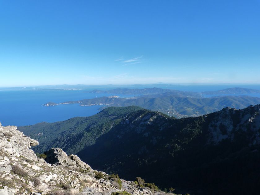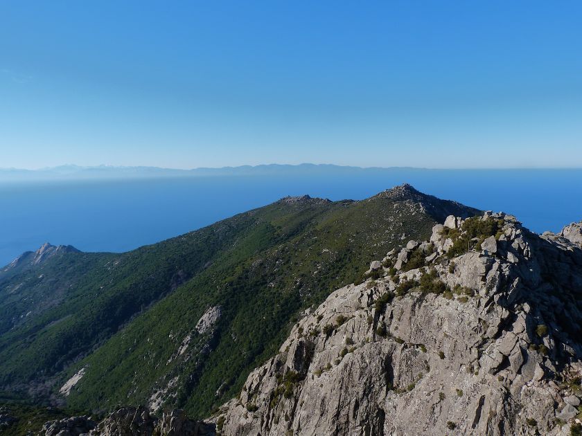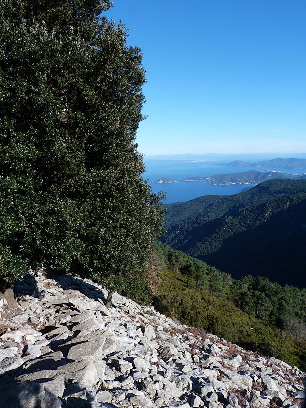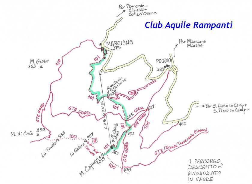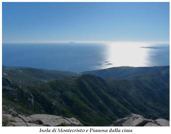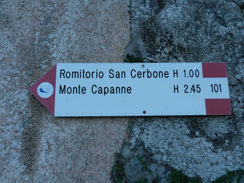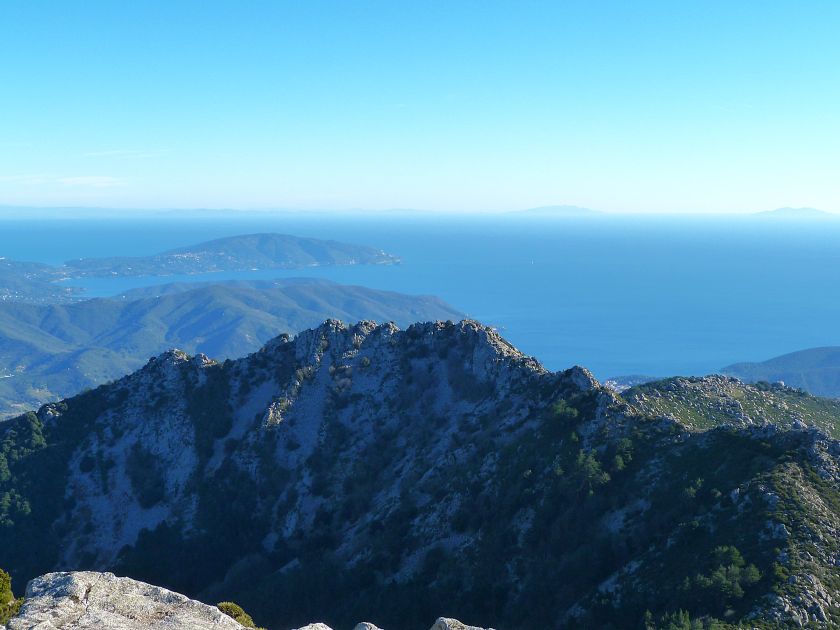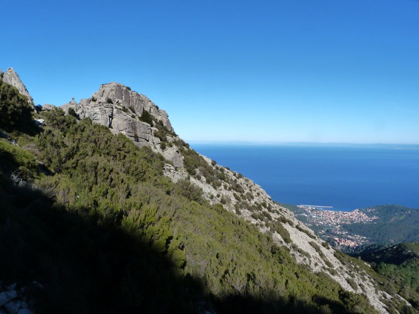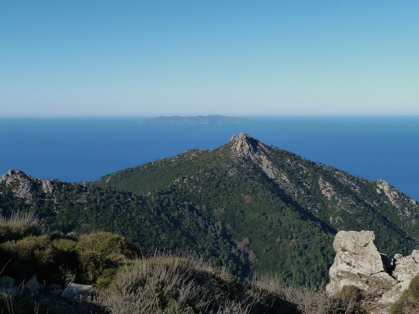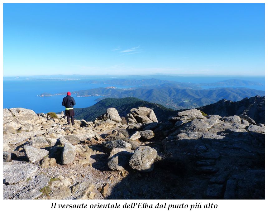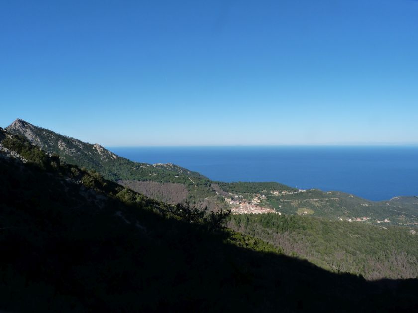 Tra gli itinerari escursionistici più spettacolari nell’ambito dell’Isola d’Elba non può certo mancare la salita al Monte Capanne. Posto nel lato occidentale dell’isola è il tetto non solo dell’intero Arcipelago Toscano ma anche, curiosamente, dell’intera provincia di Livorno che non offre nemmeno nella sua fascia continentale un’elevazione più alta. Il panorama di vetta non è semplicemente “bello”; stiamo parlando piuttosto di qualcosa che desta profonda sensazione per l’incredibile ampiezza della vista. In una giornata tersa dalla cima del Capanne si osservano le isole di Gorgona, Capraia, Pianosa, Montecristo e Giglio oltre alle grandi vette della Corsica. Verso nord l’orizzonte è occupato dal crinale appenninico tosco emiliano mentre a sud scorgiamo il promontorio dell’Argentario. È un qualcosa di indimenticabile così come particolare è la frazione sommitale del sentiero. Grandi massi di granito rendono l’ambiente tutt’altro che mediterraneo. Le pendenze e il fondo roccioso attribuiscono all’ascesa un sapore decisamente alpestre che nulla ha a che fare con i sentieri nella macchia che caratterizzano le quote inferiori dell’Isola d’Elba. In inverno la neve ricopre talvolta il settore sommitale rendendo l’ascesa assai impegnativa. Nel nostro caso siamo saliti in vetta nel mese di dicembre approfittando tuttavia di una fase secca. Nonostante ciò era presente presso la cima parecchia brina creando un particolarissimo contrasto con la grande mitezza della costa sottostante. Da rilevare la presenza della cabinovia che conduce in circa 18 minuti poco sotto il punto più alto. L’impianto è aperto normalmente nel periodo compreso tra aprile e ottobre. Qualcuno potrebbe prendere in considerazione l’ipotesi di salire con l’impianto per raggiungere in una decina di minuti la vetta e discendere a valle con il sentiero. Ci sentiamo tuttavia di sconsigliare questa ipotesi per via della segnaletica pressoché inesistente in alcune buie frazioni boschive. Conviene affrontare la faticosa salita memorizzando negli ombrosi tratti nella vegetazione alcuni riferimenti che permetteranno in discesa di non faticare troppo nel ritrovare la via. Nella speranza il sentiero venga al più presto segnato di fresco la salita resta un’impresa atipica di grande suggestione da eseguirsi nelle mezze stagioni o, con molta cautela, in inverno. Meno consigliabile è la stagione estiva nonostante gran parte dell’ascesa si sviluppi all’ombra del bosco in quanto umidità e foschia spesso riducono sensibilmente la visibilità. Occorre ricordare come tutta l’escursione si sviluppi nell’ambito del Parco Nazionale dell’Arcipelago Toscano; siamo pertanto in un’area protetta per le sue peculiarità faunistiche e botaniche ed è scontato ricordare l’importanza di accostarsi in questo ambiente con discrezione evitando in tutti i modi di lasciare traccia del nostro passaggio. L’escursione in breve: Marciana (m 360) – Romitorio di San Cerbone (m 529) – incrocio nel bosco con GTE Nord (m 645) – terzo incrocio con GTE (m 762) – stazione a monte della seggiovia (località Torretta – m 963) – Monte Capanne (m 1019) Partenza da Marciana (m 360): Difficoltà: EE sebbene in assenza di passaggi impegnativi per via della segnaletica a tratti poco evidente (Vai alla scala delle difficoltà). Segnaletica: tutti i bivi sono segnalati con cartelli tuttavia la segnaletica appare nel complesso scarsa e poco evidente (dicembre 2024). Dislivello assoluto: m 659. Acqua sul percorso: assente Accesso: Da Portoferraio si segue la SP 24 sino a Procchio quindi si procede sulla SP 25 raggiungendo Marciana Marina. La strada procede abbandonando il paese per inoltrarsi in ripida salita nella parte interna dell’isola. Tocchiamo la frazione di Poggio e in breve siamo a Marciana dove possiamo parcheggiare l’automobile. L’escursione ha inizio presso il punto in cui, sulla sinistra, si separa dalla provinciale Via Cà de Santi proprio in coincidenza della bella piazzetta dove troviamo la farmacia del paese. Un cartello escursionistico indicante il Romitorio di San Cerbone ad un’ora di marcia e il Monte Capanne a ore 2.45 elimina ogni dubbio sulla direzione da seguire (m 360). Descrizione del percorso: L’escursione alla cima più alta dell’Isola d’Elba segue integralmente il segnavia 101. Inizialmente il percorso serpeggia tra i vicoletti chiusi al traffico dell’abitato di Marciana. In coincidenza della Piazza Vittorio Emanuele II° invece di procedere risalendo la scalinata si volge a sinistra trovando il segnavia con indicata la deviazione proprio sul muro presso l’angolo della casa. In generale la segnaletica è fin troppo essenziale e così sarà fino in cima; sarebbe senz’altro raccomandabile l’aggiunta di qualche segnavia in più. Nel proseguo siamo tra le ultime case dell’abitato. Intercettiamo il vertice di Via della Rena ignorandone il tratto asfaltato che cala a sinistra. Restiamo sul tratto cementato che sale a destra e che lascia spazio, subito oltre, al sentiero vero e proprio. Il tracciato si inoltra nella boscaglia con pendenze inizialmente molto contenute. Tra l’alberatura abbiamo qualche scorcio verso la cima del Monte Capanne. La montagna appare spesso in ombra al mattino specialmente salendo nella stagione fredda quando il sole è particolarmente basso. La salita si articola in effetti nel versante settentrionale della montagna in ambiente non a caso umido e boscoso. Il tracciato si sviluppa per lunghi tratti pressoché in piano superando un primo solco con l’ausilio di un ponticello in legno. Poco oltre incontriamo un torrente che scavalchiamo senza troppe difficoltà cercando gli appoggi migliori tra i massi. Procediamo lungamente con il sentiero che comincia a risalire il pendio e con rari scorci tra le frasche in direzione del Capo d’Enfola. In inverno l’abbondante fogliame caduto copre i massi rendendo la marcia a tratti un po’