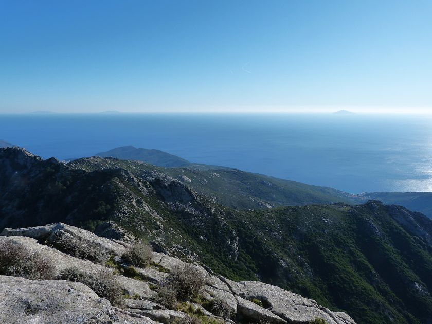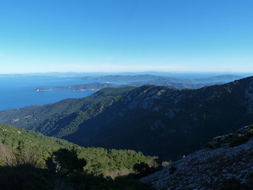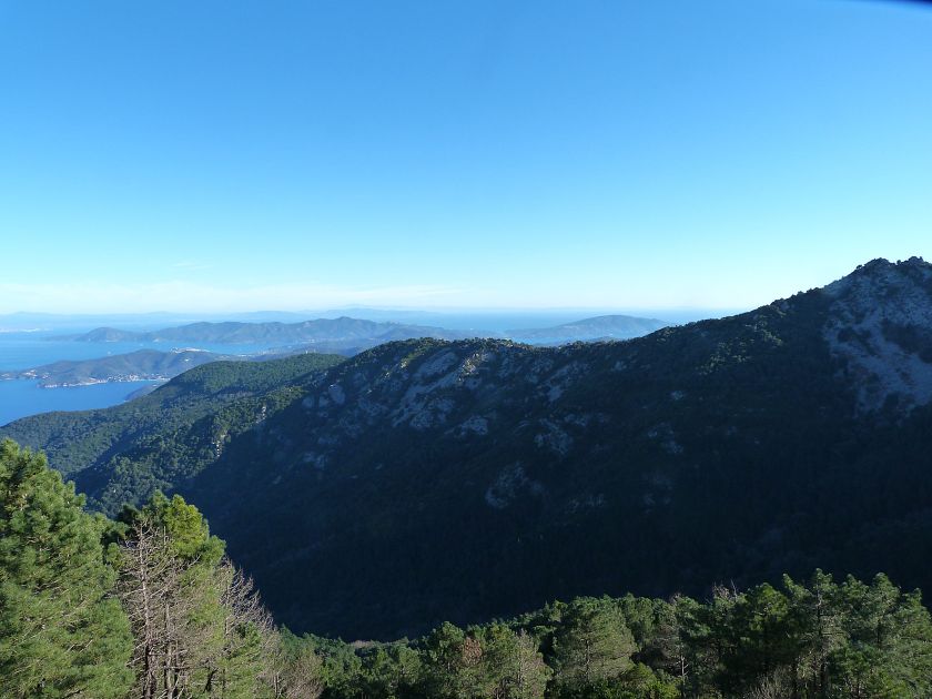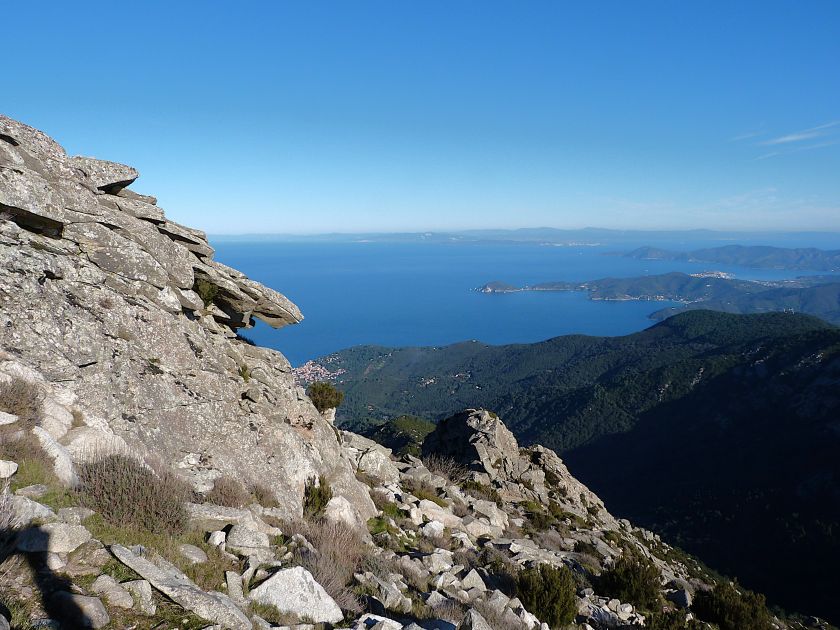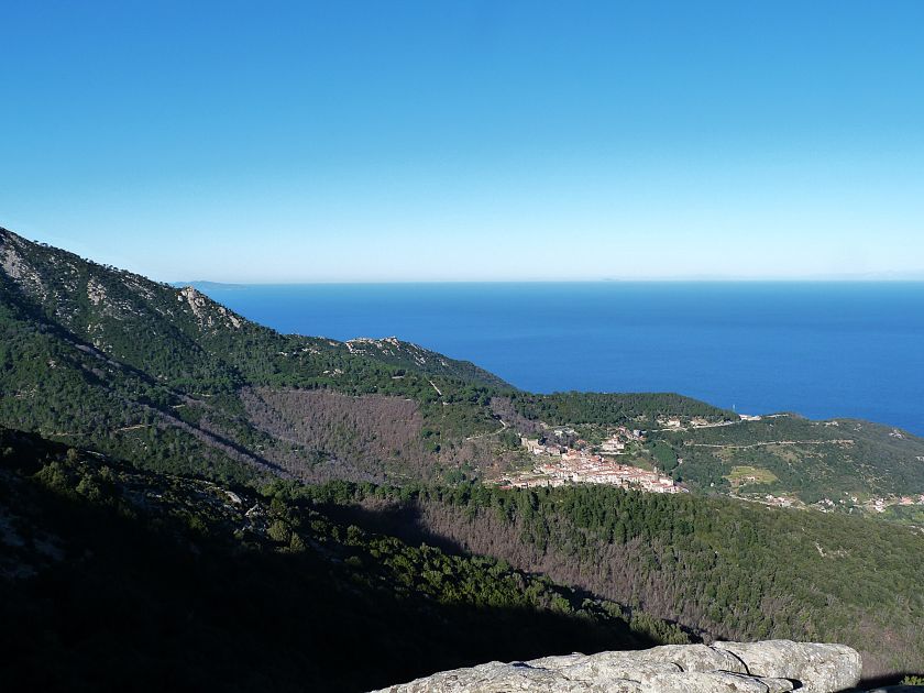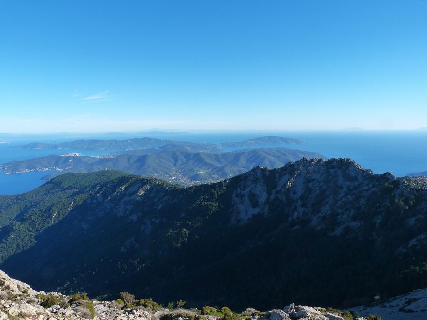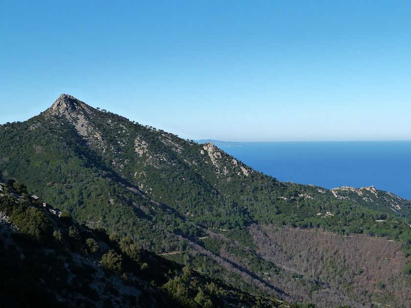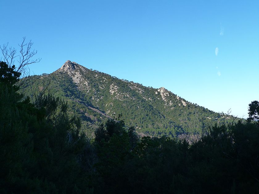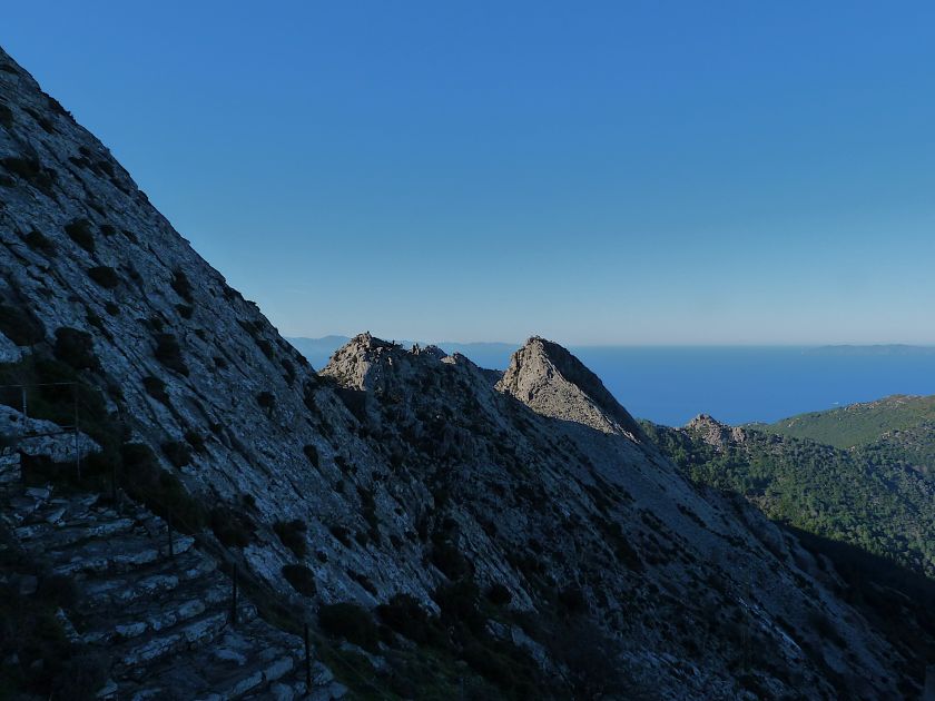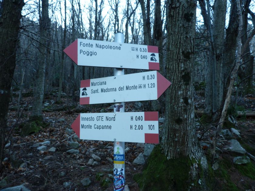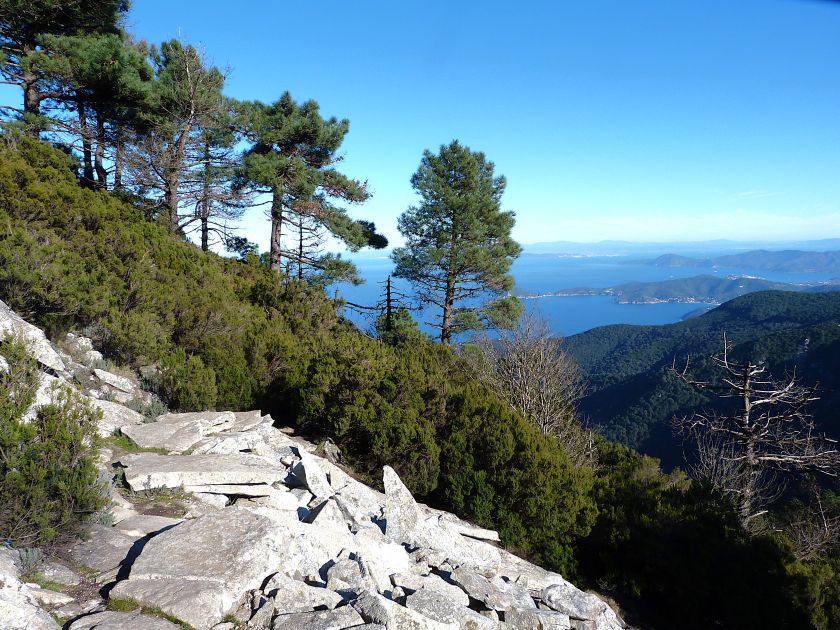 Tra gli itinerari escursionistici più spettacolari nell’ambito dell’Isola d’Elba non può certo mancare la salita al Monte Capanne. Posto nel lato occidentale dell’isola è il tetto non solo dell’intero Arcipelago Toscano ma anche, curiosamente, dell’intera provincia di Livorno che non offre nemmeno nella sua fascia continentale un’elevazione più alta. Il panorama di vetta non è semplicemente “bello”; stiamo parlando piuttosto di qualcosa che desta profonda sensazione per l’incredibile ampiezza della vista. In una giornata tersa dalla cima del Capanne si osservano le isole di Gorgona, Capraia, Pianosa, Montecristo e Giglio oltre alle grandi vette della Corsica. Verso nord l’orizzonte è occupato dal crinale appenninico tosco emiliano mentre a sud scorgiamo il promontorio dell’Argentario. È un qualcosa di indimenticabile così come particolare è la frazione sommitale del sentiero. Grandi massi di granito rendono l’ambiente tutt’altro che mediterraneo. Le pendenze e il fondo roccioso attribuiscono all’ascesa un sapore decisamente alpestre che nulla ha a che fare con i sentieri nella macchia che caratterizzano le quote inferiori dell’Isola d’Elba. In inverno la neve ricopre talvolta il settore sommitale rendendo l’ascesa assai impegnativa. Nel nostro caso siamo saliti in vetta nel mese di dicembre approfittando tuttavia di una fase secca. Nonostante ciò era presente presso la cima parecchia brina creando un particolarissimo contrasto con la grande mitezza della costa sottostante. Da rilevare la presenza della cabinovia che conduce in circa 18 minuti poco sotto il punto più alto. L’impianto è aperto normalmente nel periodo compreso tra aprile e ottobre. Qualcuno potrebbe prendere in considerazione l’ipotesi di salire con l’impianto per raggiungere in una decina di minuti la vetta e discendere a valle con il sentiero. Ci sentiamo tuttavia di sconsigliare questa ipotesi per via della segnaletica pressoché inesistente in alcune buie frazioni boschive. Conviene affrontare la faticosa salita memorizzando negli ombrosi tratti nella vegetazione alcuni riferimenti che permetteranno in discesa di non faticare troppo nel ritrovare la via. Nella speranza il sentiero venga al più presto segnato di fresco la salita resta un’impresa atipica di grande suggestione da eseguirsi nelle mezze stagioni o, con molta cautela, in inverno. Meno consigliabile è la stagione estiva nonostante gran parte dell’ascesa si sviluppi all’ombra del bosco in quanto umidità e foschia spesso riducono sensibilmente la visibilità. Occorre ricordare come tutta l’escursione si sviluppi nell’ambito del Parco Nazionale dell’Arcipelago Toscano; siamo pertanto in un’area protetta per le sue peculiarità faunistiche e botaniche ed è scontato ricordare l’importanza di accostarsi in questo ambiente con discrezione evitando in tutti i modi di lasciare traccia del nostro passaggio. L’escursione in breve: Marciana (m 360) – Romitorio di San Cerbone (m 529) – incrocio nel bosco con GTE Nord (m 645) – terzo incrocio con GTE (m 762) – stazione a monte della seggiovia (località Torretta – m 963) – Monte Capanne (m 1019) Partenza da Marciana (m 360): Difficoltà: EE sebbene in assenza di passaggi impegnativi per via della segnaletica a tratti poco evidente (Vai alla scala delle difficoltà). Segnaletica: tutti i bivi sono segnalati con cartelli tuttavia la segnaletica appare nel complesso scarsa e poco evidente (dicembre 2024). Dislivello assoluto: m 659. Acqua sul percorso: assente Accesso: Da Portoferraio si segue la SP 24 sino a Procchio quindi si procede sulla SP 25 raggiungendo Marciana Marina. La strada procede abbandonando il paese per inoltrarsi in ripida salita nella parte interna dell’isola. Tocchiamo la frazione di Poggio e in breve siamo a Marciana dove possiamo parcheggiare l’automobile. L’escursione ha inizio presso il punto in cui, sulla sinistra, si separa dalla provinciale Via Cà de Santi proprio in coincidenza della bella piazzetta dove troviamo la farmacia del paese. Un cartello escursionistico indicante il Romitorio di San Cerbone ad un’ora di marcia e il Monte Capanne a ore 2.45 elimina ogni dubbio sulla direzione da seguire (m 360). Descrizione del percorso: L’escursione alla cima più alta dell’Isola d’Elba segue integralmente il segnavia 101. Inizialmente il percorso serpeggia tra i vicoletti chiusi al traffico dell’abitato di Marciana. In coincidenza della Piazza Vittorio Emanuele II° invece di procedere risalendo la scalinata si volge a sinistra trovando il segnavia con indicata la deviazione proprio sul muro presso l’angolo della casa. In generale la segnaletica è fin troppo essenziale e così sarà fino in cima; sarebbe senz’altro raccomandabile l’aggiunta di qualche segnavia in più. Nel proseguo siamo tra le ultime case dell’abitato. Intercettiamo il vertice di Via della Rena ignorandone il tratto asfaltato che cala a sinistra. Restiamo sul tratto cementato che sale a destra e che lascia spazio, subito oltre, al sentiero vero e proprio. Il tracciato si inoltra nella boscaglia con pendenze inizialmente molto contenute. Tra l’alberatura abbiamo qualche scorcio verso la cima del Monte Capanne. La montagna appare spesso in ombra al mattino specialmente salendo nella stagione fredda quando il sole è particolarmente basso. La salita si articola in effetti nel versante settentrionale della montagna in ambiente non a caso umido e boscoso. Il tracciato si sviluppa per lunghi tratti pressoché in piano superando un primo solco con l’ausilio di un ponticello in legno. Poco oltre incontriamo un torrente che scavalchiamo senza troppe difficoltà cercando gli appoggi migliori tra i massi. Procediamo lungamente con il sentiero che comincia a risalire il pendio e con rari scorci tra le frasche in direzione del Capo d’Enfola. In inverno l’abbondante fogliame caduto copre i massi rendendo la marcia a tratti un po’