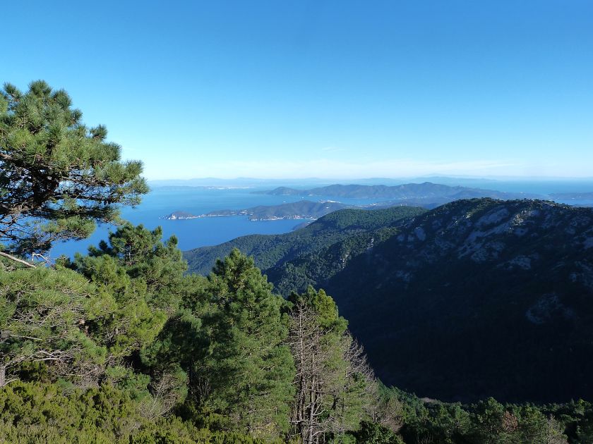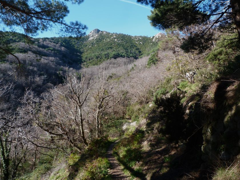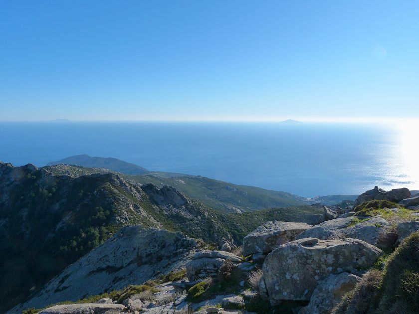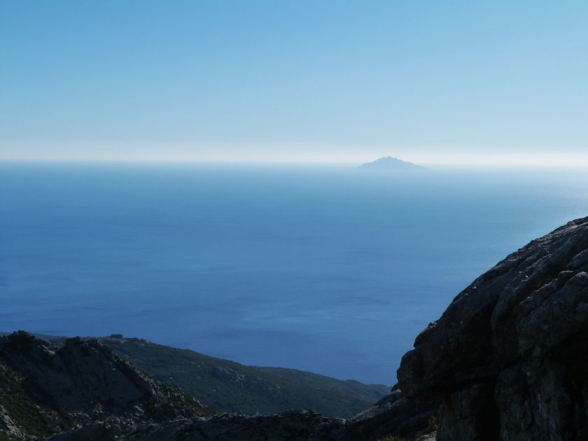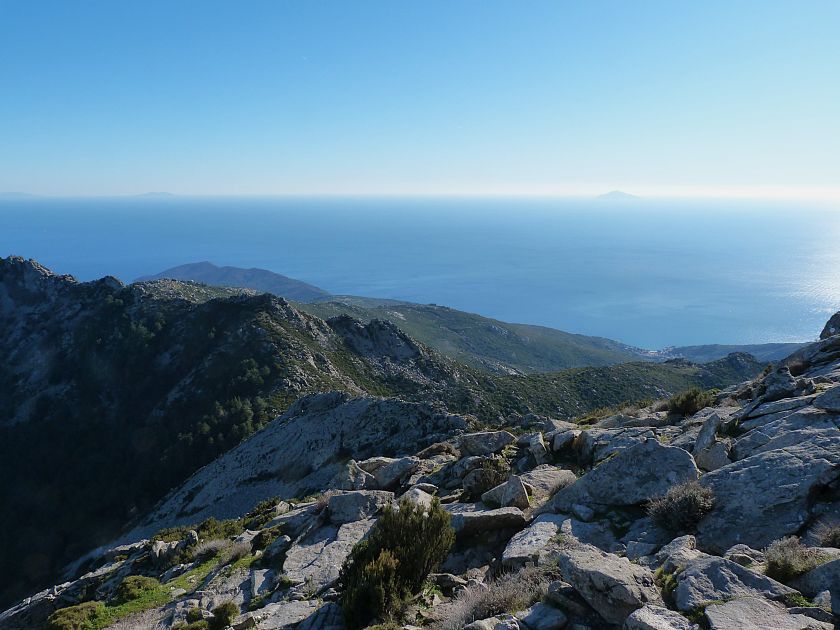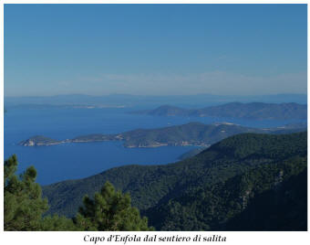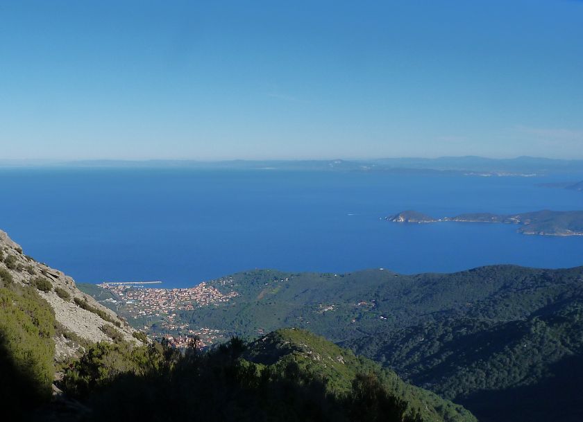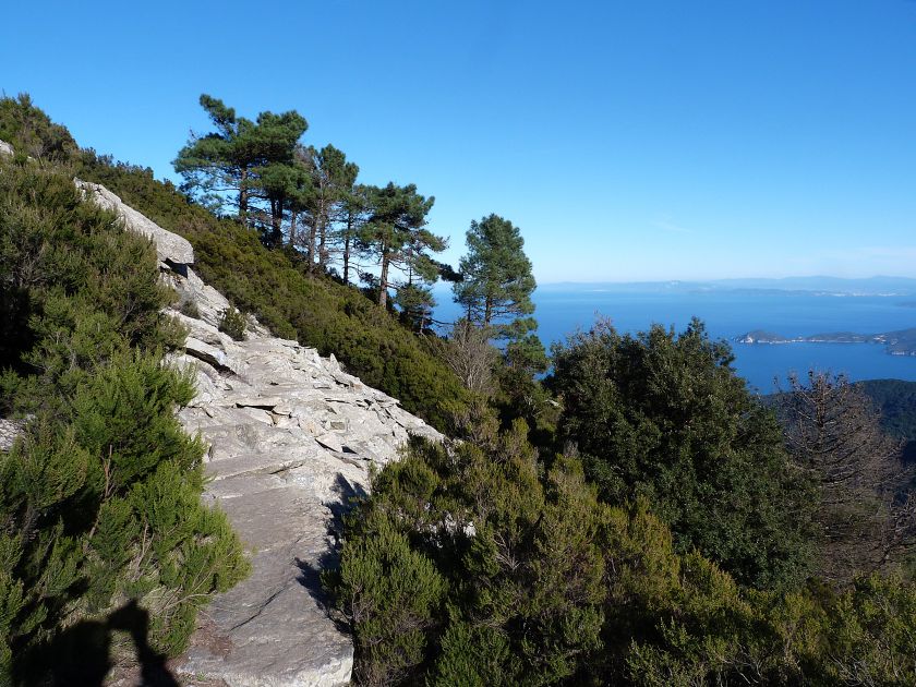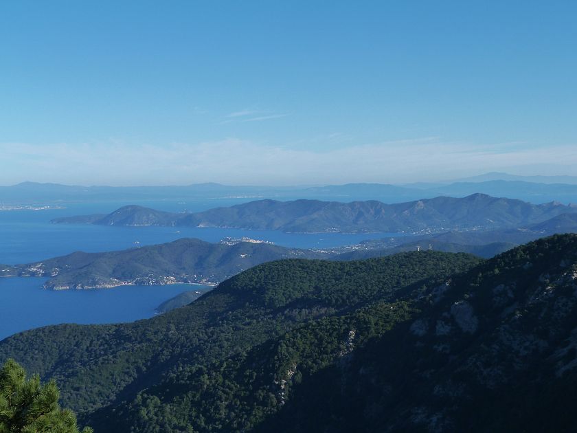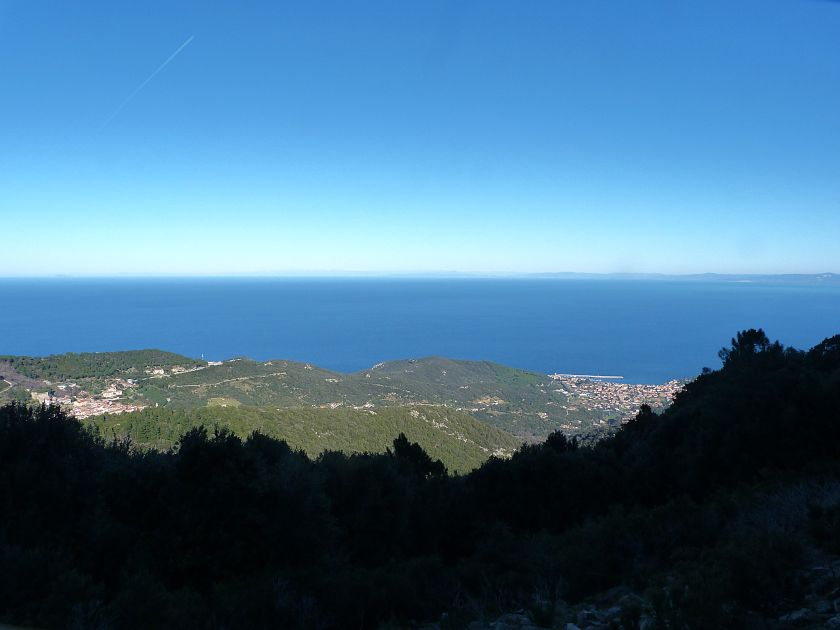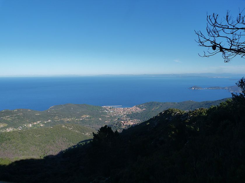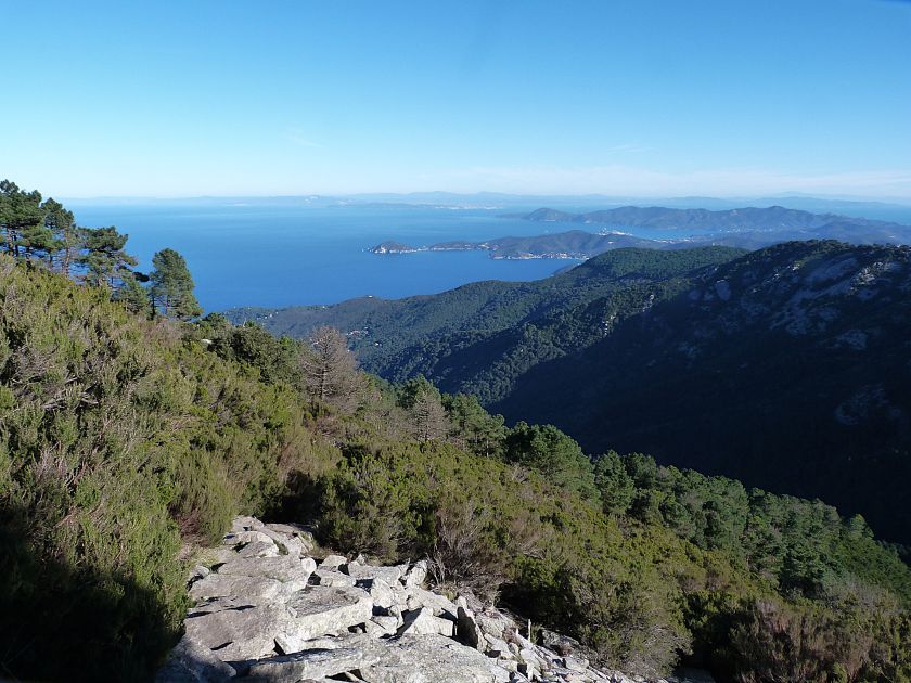 Tra gli itinerari escursionistici più spettacolari nell’ambito dell’Isola d’Elba non può certo mancare la salita al Monte Capanne. Posto nel lato occidentale dell’isola è il tetto non solo dell’intero Arcipelago Toscano ma anche, curiosamente, dell’intera provincia di Livorno che non offre nemmeno nella sua fascia continentale un’elevazione più alta. Il panorama di vetta non è semplicemente “bello”; stiamo parlando piuttosto di qualcosa che desta profonda sensazione per l’incredibile ampiezza della vista. In una giornata tersa dalla cima del Capanne si osservano le isole di Gorgona, Capraia, Pianosa, Montecristo e Giglio oltre alle grandi vette della Corsica. Verso nord l’orizzonte è occupato dal crinale appenninico tosco emiliano mentre a sud scorgiamo il promontorio dell’Argentario. È un qualcosa di indimenticabile così come particolare è la frazione sommitale del sentiero. Grandi massi di granito rendono l’ambiente tutt’altro che mediterraneo. Le pendenze e il fondo roccioso attribuiscono all’ascesa un sapore decisamente alpestre che nulla ha a che fare con i sentieri nella macchia che caratterizzano le quote inferiori dell’Isola d’Elba. In inverno la neve ricopre talvolta il settore sommitale rendendo l’ascesa assai impegnativa. Nel nostro caso siamo saliti in vetta nel mese di dicembre approfittando tuttavia di una fase secca. Nonostante ciò era presente presso la cima parecchia brina creando un particolarissimo contrasto con la grande mitezza della costa sottostante. Da rilevare la presenza della cabinovia che conduce in circa 18 minuti poco sotto il punto più alto. L’impianto è aperto normalmente nel periodo compreso tra aprile e ottobre. Qualcuno potrebbe prendere in considerazione l’ipotesi di salire con l’impianto per raggiungere in una decina di minuti la vetta e discendere a valle con il sentiero. Ci sentiamo tuttavia di sconsigliare questa ipotesi per via della segnaletica pressoché inesistente in alcune buie frazioni boschive. Conviene affrontare la faticosa salita memorizzando negli ombrosi tratti nella vegetazione alcuni riferimenti che permetteranno in discesa di non faticare troppo nel ritrovare la via. Nella speranza il sentiero venga al più presto segnato di fresco la salita resta un’impresa atipica di grande suggestione da eseguirsi nelle mezze stagioni o, con molta cautela, in inverno. Meno consigliabile è la stagione estiva nonostante gran parte dell’ascesa si sviluppi all’ombra del bosco in quanto umidità e foschia spesso riducono sensibilmente la visibilità. Occorre ricordare come tutta l’escursione si sviluppi nell’ambito del Parco Nazionale dell’Arcipelago Toscano; siamo pertanto in un’area protetta per le sue peculiarità faunistiche e botaniche ed è scontato ricordare l’importanza di accostarsi in questo ambiente con discrezione evitando in tutti i modi di lasciare traccia del nostro passaggio. L’escursione in breve: Marciana (m 360) – Romitorio di San Cerbone (m 529) – incrocio nel bosco con GTE Nord (m 645) – terzo incrocio con GTE (m 762) – stazione a monte della seggiovia (località Torretta – m 963) – Monte Capanne (m 1019) Partenza da Marciana (m 360): Difficoltà: EE sebbene in assenza di passaggi impegnativi per via della segnaletica a tratti poco evidente (Vai alla scala delle difficoltà). Segnaletica: tutti i bivi sono segnalati con cartelli tuttavia la segnaletica appare nel complesso scarsa e poco evidente (dicembre 2024). Dislivello assoluto: m 659. Acqua sul percorso: assente Accesso: Da Portoferraio si segue la SP 24 sino a Procchio quindi si procede sulla SP 25 raggiungendo Marciana Marina. La strada procede abbandonando il paese per inoltrarsi in ripida salita nella parte interna dell’isola. Tocchiamo la frazione di Poggio e in breve siamo a Marciana dove possiamo parcheggiare l’automobile. L’escursione ha inizio presso il punto in cui, sulla sinistra, si separa dalla provinciale Via Cà de Santi proprio in coincidenza della bella piazzetta dove troviamo la farmacia del paese. Un cartello escursionistico indicante il Romitorio di San Cerbone ad un’ora di marcia e il Monte Capanne a ore 2.45 elimina ogni dubbio sulla direzione da seguire (m 360). Descrizione del percorso: L’escursione alla cima più alta dell’Isola d’Elba segue integralmente il segnavia 101. Inizialmente il percorso serpeggia tra i vicoletti chiusi al traffico dell’abitato di Marciana. In coincidenza della Piazza Vittorio Emanuele II° invece di procedere risalendo la scalinata si volge a sinistra trovando il segnavia con indicata la deviazione proprio sul muro presso l’angolo della casa. In generale la segnaletica è fin troppo essenziale e così sarà fino in cima; sarebbe senz’altro raccomandabile l’aggiunta di qualche segnavia in più. Nel proseguo siamo tra le ultime case dell’abitato. Intercettiamo il vertice di Via della Rena ignorandone il tratto asfaltato che cala a sinistra. Restiamo sul tratto cementato che sale a destra e che lascia spazio, subito oltre, al sentiero vero e proprio. Il tracciato si inoltra nella boscaglia con pendenze inizialmente molto contenute. Tra l’alberatura abbiamo qualche scorcio verso la cima del Monte Capanne. La montagna appare spesso in ombra al mattino specialmente salendo nella stagione fredda quando il sole è particolarmente basso. La salita si articola in effetti nel versante settentrionale della montagna in ambiente non a caso umido e boscoso. Il tracciato si sviluppa per lunghi tratti pressoché in piano superando un primo solco con l’ausilio di un ponticello in legno. Poco oltre incontriamo un torrente che scavalchiamo senza troppe difficoltà cercando gli appoggi migliori tra i massi. Procediamo lungamente con il sentiero che comincia a risalire il pendio e con rari scorci tra le frasche in direzione del Capo d’Enfola. In inverno l’abbondante fogliame caduto copre i massi rendendo la marcia a tratti un po’