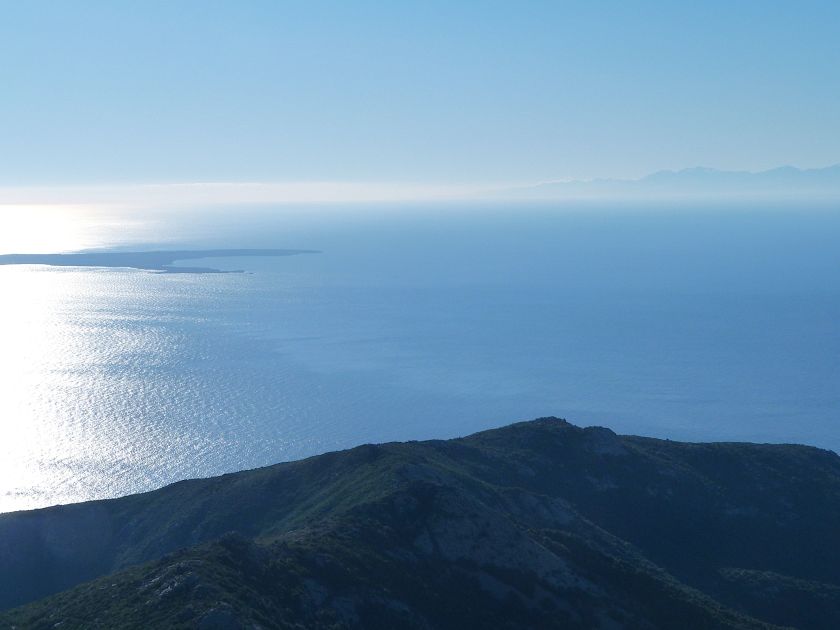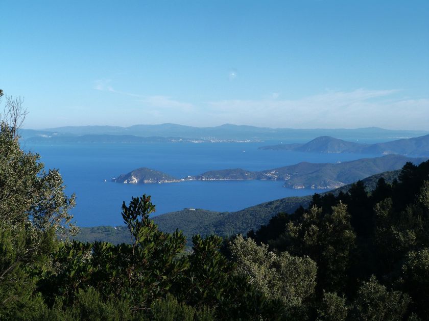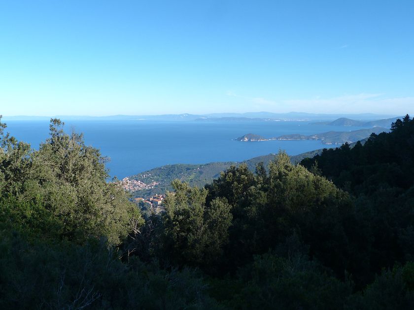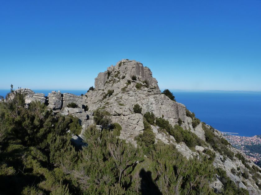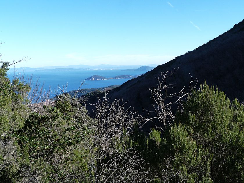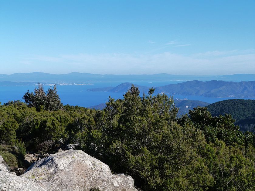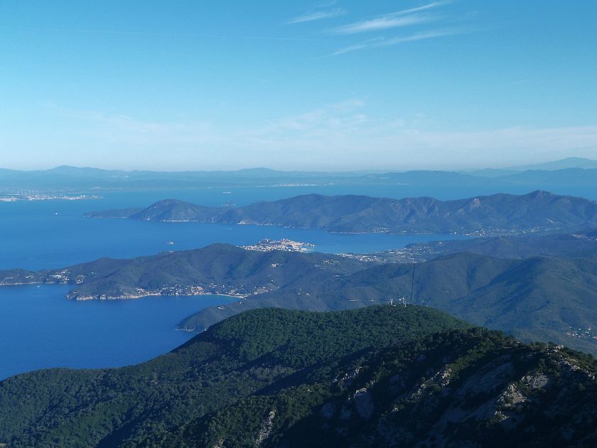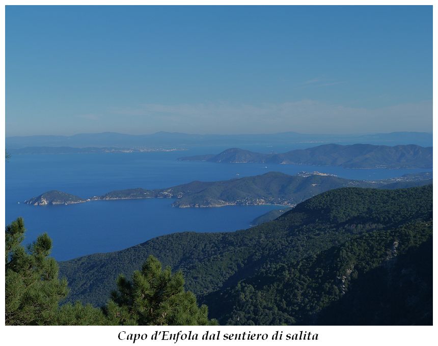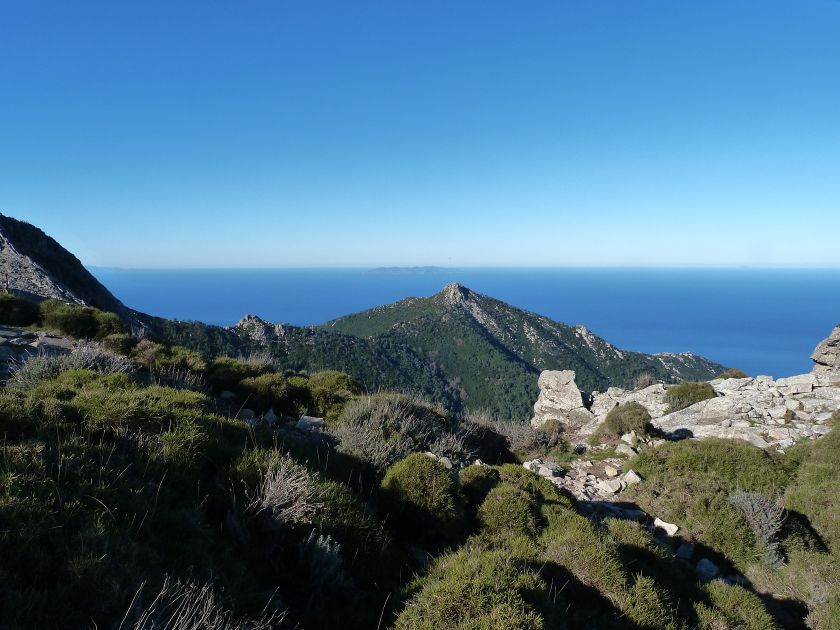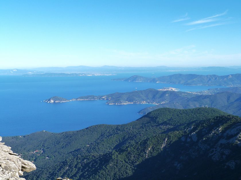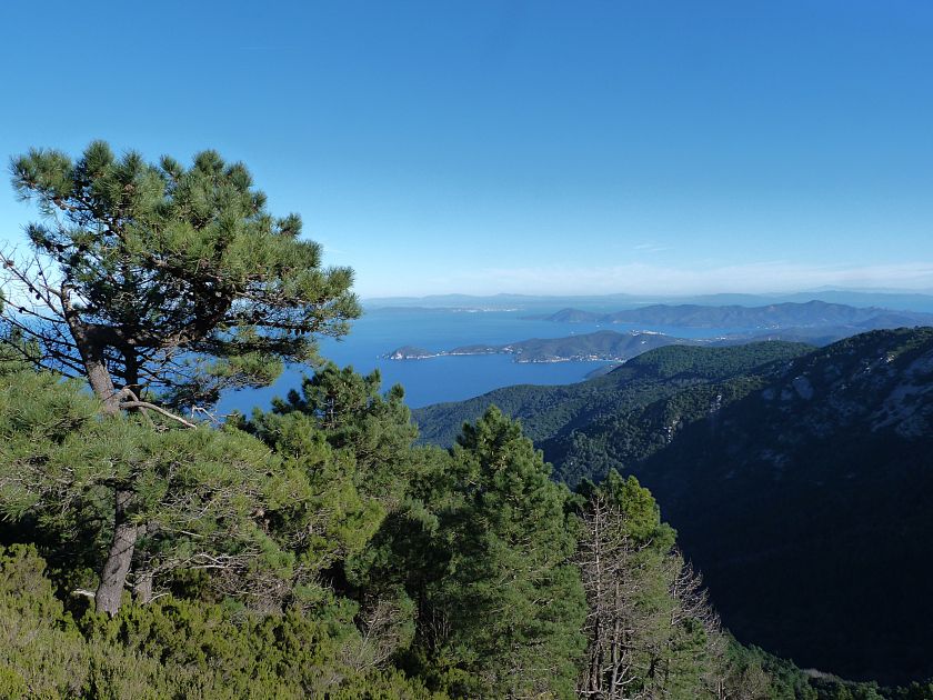 Tra gli itinerari escursionistici più spettacolari nell’ambito dell’Isola d’Elba non può certo mancare la salita al Monte Capanne. Posto nel lato occidentale dell’isola è il tetto non solo dell’intero Arcipelago Toscano ma anche, curiosamente, dell’intera provincia di Livorno che non offre nemmeno nella sua fascia continentale un’elevazione più alta. Il panorama di vetta non è semplicemente “bello”; stiamo parlando piuttosto di qualcosa che desta profonda sensazione per l’incredibile ampiezza della vista. In una giornata tersa dalla cima del Capanne si osservano le isole di Gorgona, Capraia, Pianosa, Montecristo e Giglio oltre alle grandi vette della Corsica. Verso nord l’orizzonte è occupato dal crinale appenninico tosco emiliano mentre a sud scorgiamo il promontorio dell’Argentario. È un qualcosa di indimenticabile così come particolare è la frazione sommitale del sentiero. Grandi massi di granito rendono l’ambiente tutt’altro che mediterraneo. Le pendenze e il fondo roccioso attribuiscono all’ascesa un sapore decisamente alpestre che nulla ha a che fare con i sentieri nella macchia che caratterizzano le quote inferiori dell’Isola d’Elba. In inverno la neve ricopre talvolta il settore sommitale rendendo l’ascesa assai impegnativa. Nel nostro caso siamo saliti in vetta nel mese di dicembre approfittando tuttavia di una fase secca. Nonostante ciò era presente presso la cima parecchia brina creando un particolarissimo contrasto con la grande mitezza della costa sottostante. Da rilevare la presenza della cabinovia che conduce in circa 18 minuti poco sotto il punto più alto. L’impianto è aperto normalmente nel periodo compreso tra aprile e ottobre. Qualcuno potrebbe prendere in considerazione l’ipotesi di salire con l’impianto per raggiungere in una decina di minuti la vetta e discendere a valle con il sentiero. Ci sentiamo tuttavia di sconsigliare questa ipotesi per via della segnaletica pressoché inesistente in alcune buie frazioni boschive. Conviene affrontare la faticosa salita memorizzando negli ombrosi tratti nella vegetazione alcuni riferimenti che permetteranno in discesa di non faticare troppo nel ritrovare la via. Nella speranza il sentiero venga al più presto segnato di fresco la salita resta un’impresa atipica di grande suggestione da eseguirsi nelle mezze stagioni o, con molta cautela, in inverno. Meno consigliabile è la stagione estiva nonostante gran parte dell’ascesa si sviluppi all’ombra del bosco in quanto umidità e foschia spesso riducono sensibilmente la visibilità. Occorre ricordare come tutta l’escursione si sviluppi nell’ambito del Parco Nazionale dell’Arcipelago Toscano; siamo pertanto in un’area protetta per le sue peculiarità faunistiche e botaniche ed è scontato ricordare l’importanza di accostarsi in questo ambiente con discrezione evitando in tutti i modi di lasciare traccia del nostro passaggio. L’escursione in breve: Marciana (m 360) – Romitorio di San Cerbone (m 529) – incrocio nel bosco con GTE Nord (m 645) – terzo incrocio con GTE (m 762) – stazione a monte della seggiovia (località Torretta – m 963) – Monte Capanne (m 1019) Partenza da Marciana (m 360): Difficoltà: EE sebbene in assenza di passaggi impegnativi per via della segnaletica a tratti poco evidente (Vai alla scala delle difficoltà). Segnaletica: tutti i bivi sono segnalati con cartelli tuttavia la segnaletica appare nel complesso scarsa e poco evidente (dicembre 2024). Dislivello assoluto: m 659. Acqua sul percorso: assente Accesso: Da Portoferraio si segue la SP 24 sino a Procchio quindi si procede sulla SP 25 raggiungendo Marciana Marina. La strada procede abbandonando il paese per inoltrarsi in ripida salita nella parte interna dell’isola. Tocchiamo la frazione di Poggio e in breve siamo a Marciana dove possiamo parcheggiare l’automobile. L’escursione ha inizio presso il punto in cui, sulla sinistra, si separa dalla provinciale Via Cà de Santi proprio in coincidenza della bella piazzetta dove troviamo la farmacia del paese. Un cartello escursionistico indicante il Romitorio di San Cerbone ad un’ora di marcia e il Monte Capanne a ore 2.45 elimina ogni dubbio sulla direzione da seguire (m 360). Descrizione del percorso: L’escursione alla cima più alta dell’Isola d’Elba segue integralmente il segnavia 101. Inizialmente il percorso serpeggia tra i vicoletti chiusi al traffico dell’abitato di Marciana. In coincidenza della Piazza Vittorio Emanuele II° invece di procedere risalendo la scalinata si volge a sinistra trovando il segnavia con indicata la deviazione proprio sul muro presso l’angolo della casa. In generale la segnaletica è fin troppo essenziale e così sarà fino in cima; sarebbe senz’altro raccomandabile l’aggiunta di qualche segnavia in più. Nel proseguo siamo tra le ultime case dell’abitato. Intercettiamo il vertice di Via della Rena ignorandone il tratto asfaltato che cala a sinistra. Restiamo sul tratto cementato che sale a destra e che lascia spazio, subito oltre, al sentiero vero e proprio. Il tracciato si inoltra nella boscaglia con pendenze inizialmente molto contenute. Tra l’alberatura abbiamo qualche scorcio verso la cima del Monte Capanne. La montagna appare spesso in ombra al mattino specialmente salendo nella stagione fredda quando il sole è particolarmente basso. La salita si articola in effetti nel versante settentrionale della montagna in ambiente non a caso umido e boscoso. Il tracciato si sviluppa per lunghi tratti pressoché in piano superando un primo solco con l’ausilio di un ponticello in legno. Poco oltre incontriamo un torrente che scavalchiamo senza troppe difficoltà cercando gli appoggi migliori tra i massi. Procediamo lungamente con il sentiero che comincia a risalire il pendio e con rari scorci tra le frasche in direzione del Capo d’Enfola. In inverno l’abbondante fogliame caduto copre i massi rendendo la marcia a tratti un po’