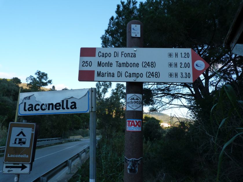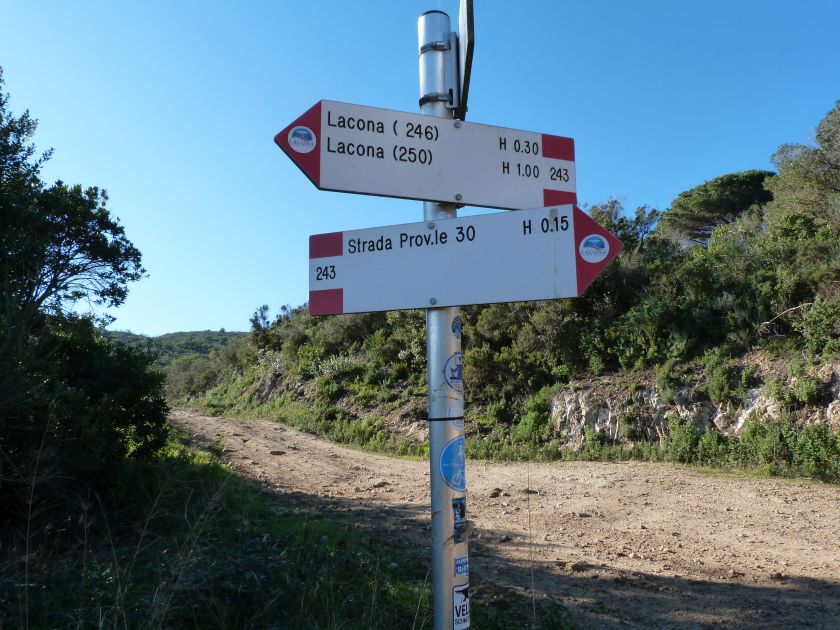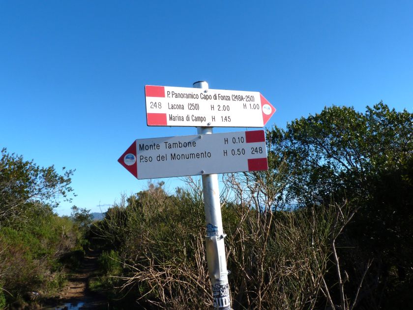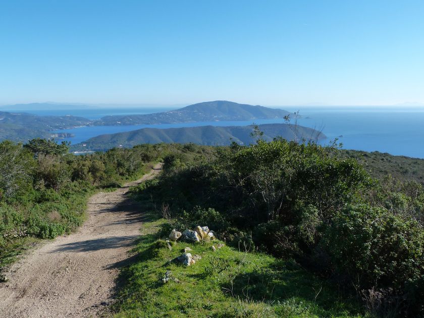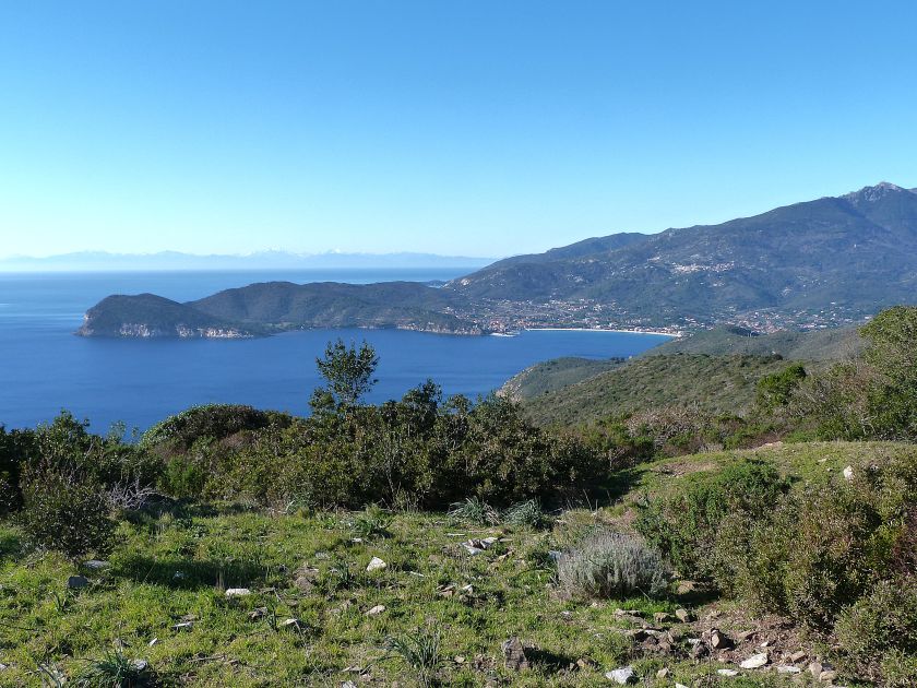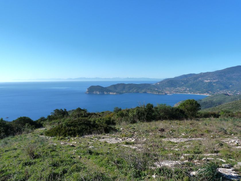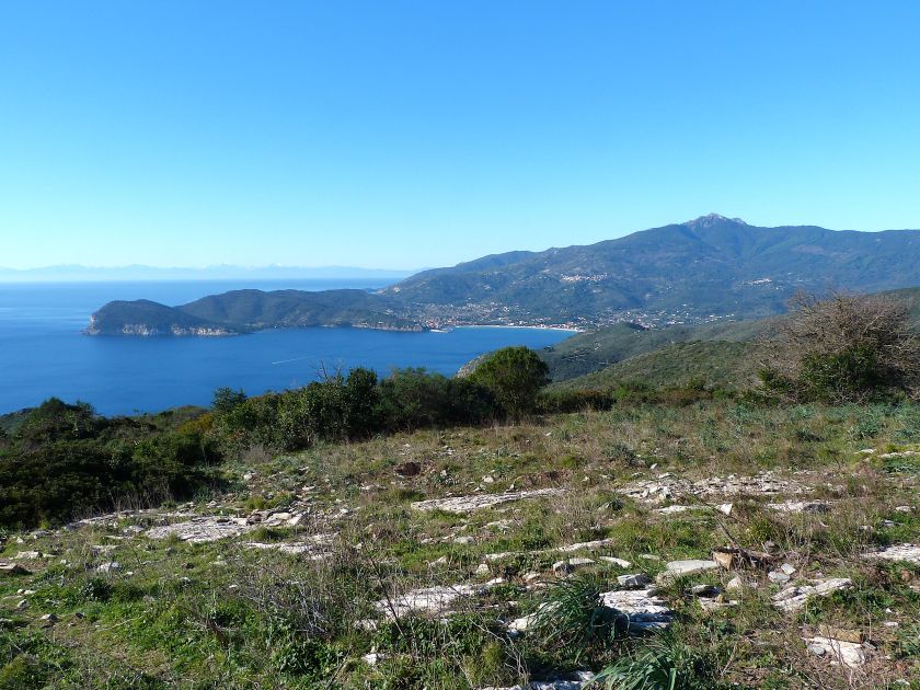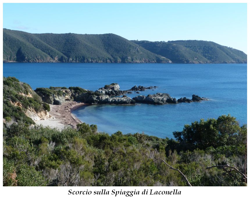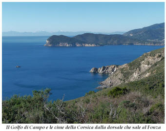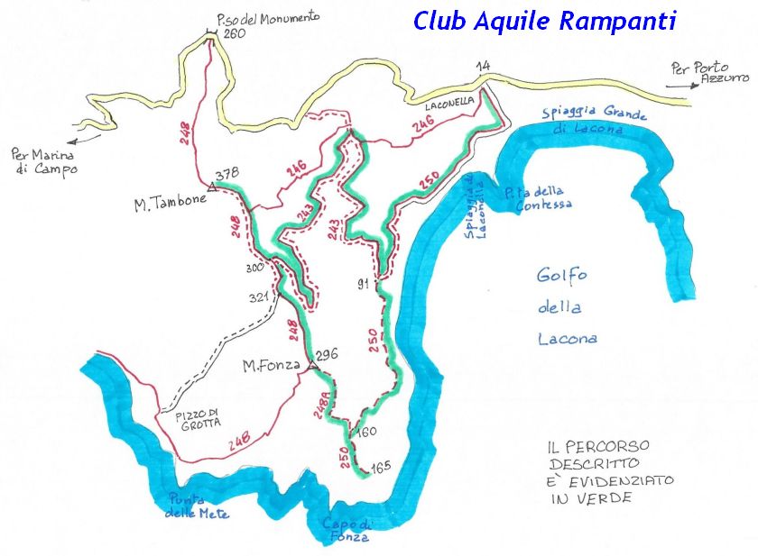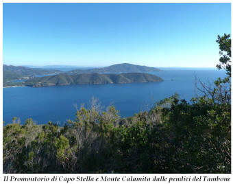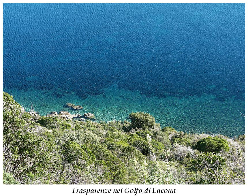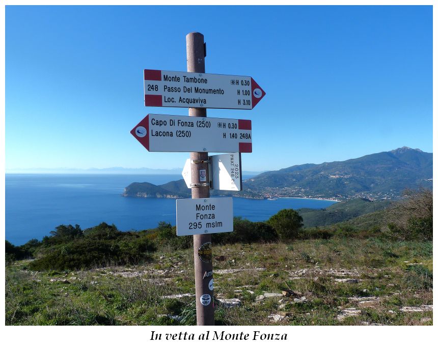 Il promontorio di Fonza, nell’ambito dell’Isola d’Elba, divide il Golfo di Lacona dal Golfo di Stella ed è incluso nel Parco Nazionale dell’Arcipelago Toscano. Il suo punto culminante è il Monte Tambone tuttavia il panorama più vasto e coinvolgente è di sicuro quello che si gode dalla cima del Monte Fonza. La quota contenuta non impedisce una vista estesa a gran parte del versante meridionale dell’Elba con i suoi promontori e le sue insenature. Nei giorni limpidi la vista si allarga sino ad osservare l’isola del Giglio e l’Isola di Montecristo mentre ad occidente si stagliano le vette più alte della Corsica. È un’escursione senz’altro consigliabilissima e percorribile in pratica per tutto l’anno. La stagione meno indicata resta in ogni caso l’estate per le temperature elevate; l’inverno al contrario è una stagione raramente presa in considerazione ma splendida permettendo di godere di un paesaggio sempreverde e al contempo di un silenzio e una solitudine che normalmente non caratterizzano una zona così turistica come l’Isola d’Elba. L’escursione in breve: Laconella (m 14) – sentiero n° 250 – bivio con sentiero 243 (inizio itinerario ad anello – m 91) – bivio sentiero 250 / 248A (m 160) – belvedere di Capo di Fonza (m 165) - bivio sentiero 250 / 248A (m 160) - Monte Fonza (m 296) – elevazione senza toponimo (m 321) – selletta senza nome (m 300) – bivio con sentiero n° 246 (m 341) – Monte Tambone (m 378) - bivio con sentiero n° 246 (m 341) – selletta senza nome (m 300) – sentiero n° 243 – bivio sentiero 243 / 250 (m 91) – Laconella (m 14) Partenza da Laconella (m 14): Difficoltà: E (Vai alla scala delle difficoltà). Segnaletica: tutti i bivi sono segnalati con cartelli tuttavia la segnaletica appare nel complesso scarsa e poco evidente (dicembre 2024). Dislivello assoluto: m 364. Acqua sul percorso: assente Accesso: Da Portoferraio seguiamo le indicazioni per Porto Azzurro seguendo la SP 26. Dopo pochi km volgiamo a destra sulla SP 30 con indicazioni per Marina di Campo. Raggiungiamo la frazione di Lacona; la strada si sviluppa a poche decine di metri dalla spiaggia anche se quest’ultima non è ben osservabile per via dalla pineta e per la presenza di diversi campeggi. Al termine del rettilineo cessano i lidi e si raggiunge, poco oltre, il bivio a sinistra di Via Laconella con cartello indicante l’omonimo campeggio. L’escursione ha inizio proprio in coincidenza dell’incrocio con cartello escursionistico indicante Capo di Fonza a ore 1.20 e Monte Tambone a ore 2. Descrizione del percorso: La prima frazione di cammino ricalca il tracciato di Via Laconella. In estate il transito è proibito alle automobili con l’eccezione dei residenti mentre in inverno l’accesso è libero con la possibilità di abbreviare il tracciato a piedi percorrendo un lungo tratto di sterrata. Non mancano alcuni scorci osservando, a sinistra, le rocce che caratterizzano la Punta della Contessa. La strada si articola tra alcune abitazioni private mentre verso meridione la vista si allarga sino ad osservare, all’orizzonte, l’Isola di Montecristo. Un paio di digressioni permettono, volendo, di calare in qualche minuto sino al litorale sottostante. Da rilevare lo scorcio verso la Spiaggia di Laconella osservando inoltre le splendide colorazioni del fondale. Osserviamo inoltre come la prima citata Punta della Contessa divida la Spiaggia di Laconella dalla Spiaggia Grande di Lacona. Verso oriente il panorama è in gran parte occupato dallo splendido promontorio di Capo Stella rivestito di un’alberatura particolarmente folta. Proseguiamo lungamente con la strada che diviene dissestata e non più percorribile alle automobili. Non vi è alcuna traccia di segnaletica ma il percorso è ovvio ricalcando fedelmente la sterrata. In coincidenza di un tornante abbandoniamo la carrareccia volgendo a sinistra sul sentiero che mantiene il segnavia n° 250 (m 91 - ore 0,30 dalla partenza). Il bivio è segnalato dai cartelli con indicato il “Punto panoramico Capo di Fonza” a ore 0,50 di cammino. Pochi metri di sentiero e incontriamo immediatamente un’ulteriore biforcazione che lascia di primo acchito nell’ambiguità per l’assenza di segnalazioni. Occorre ignorare la possibilità di sinistra mantenendo il tracciato che si inoltra nel mezzo della macchia. La segnaletica è ridotta al minimo ma nel proseguo non si affrontano problemi d’orientamento in quanto il sentiero appare ben marcato e privo per un lungo tratto d’ulteriori bivi. Si procede con dislivelli nel complesso contenuti affacciandosi a sinistra su un braccio di mare caratterizzato da magnifiche colorazioni tra il blu e il turchese. Se la prima frazione su sterrata non aveva entusiasmato ecco che questa frazione di sentiero appare invece di indiscutibile bellezza grazie alla vista del grande Golfo di Lacona. L’ambiente selvaggio e una macchia particolarmente rigogliosa rendono il cammino molto piacevole anche in pieno inverno. Avanzando verso meridione compare, alle spalle di Capo Stella, il promontorio di Capoliveri. Dopo una lunga frazione in debole saliscendi il sentiero cambia improvvisamente pendenza salendo ripido verso destra. È un tratto un po’ più faticoso ma si rivela relativamente breve in quanto si accede con rapidità ad un’ampia sella poco accentuata sulla dorsale che scende dal Monte Tambone a Capo Fonza (m 160 – ore 1,20 dalla partenza). Il paesaggio si apre per la prima volta verso occidente osservando, a breve distanza, la Punta delle Mete con, di fronte ad essa, lo Scoglio della Triglia. Più distante notiamo, al di là del Golfo di Campo, il pronunciato Capo di Poro mentre sullo sfondo svettano addirittura le cime della Corsica a chiudere l’orizzonte. Siamo inoltre ad un’importante biforcazione. I cartelli segnalano verso destra il Monte Fonza a 20 minuti di cammino mentre a sinistra è indicato Capo Fonza a 10 minuti. Scegliamo quest’ultima pos