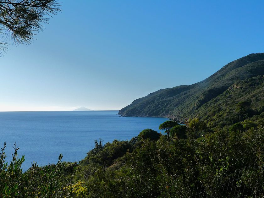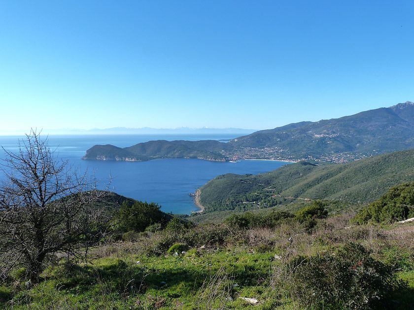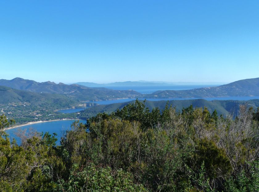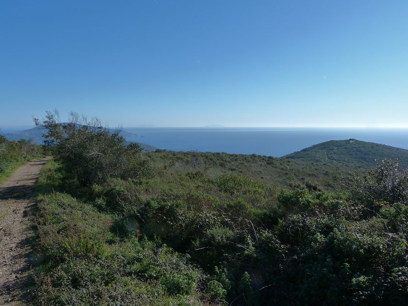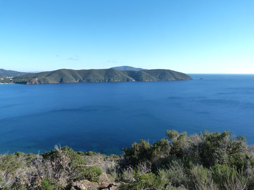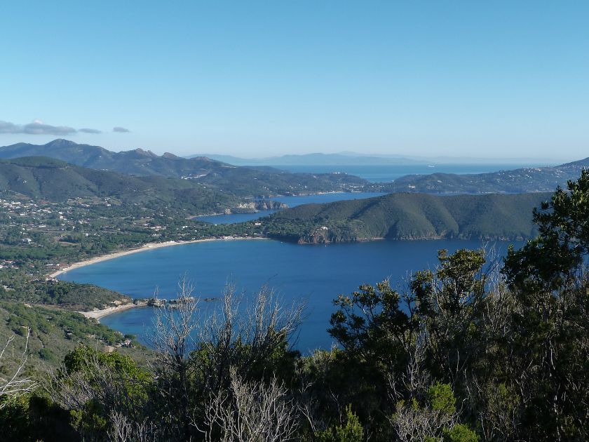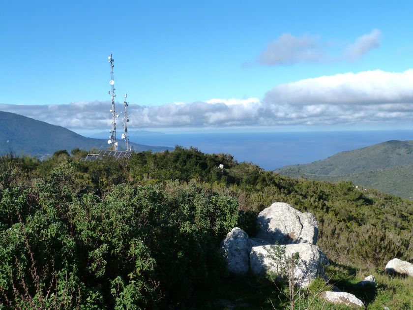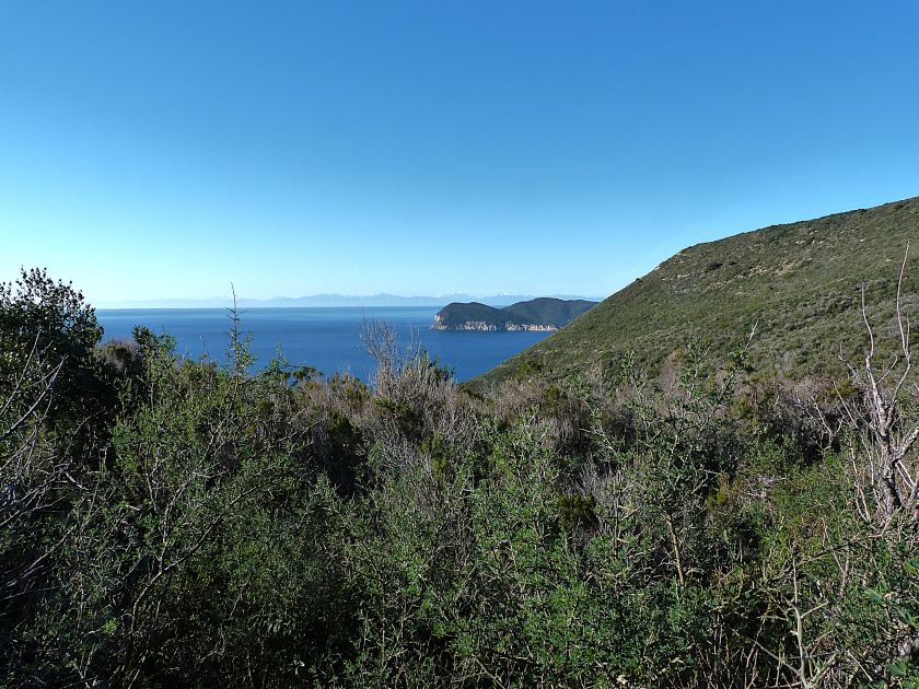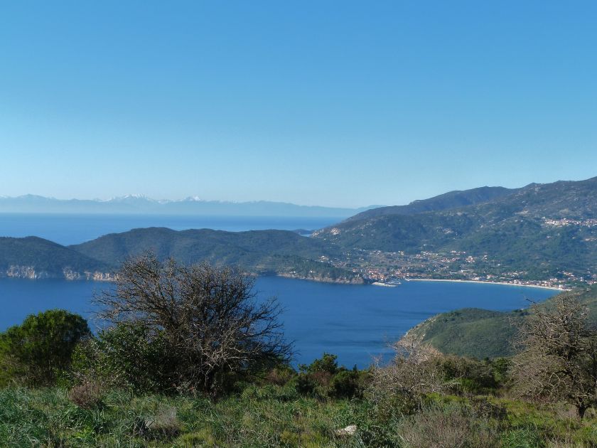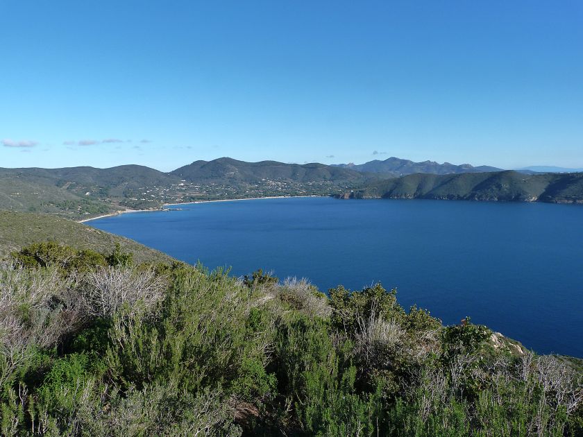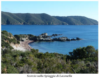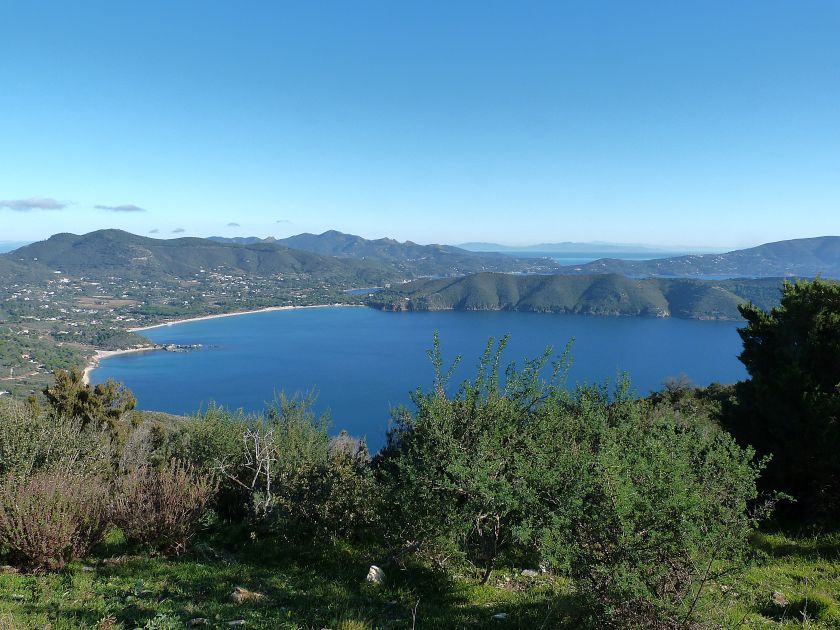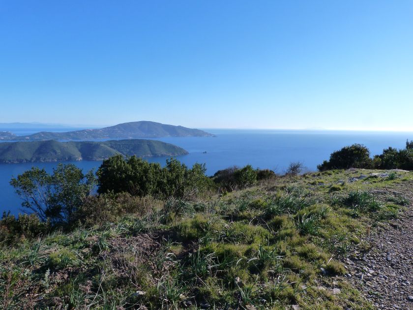 Il promontorio di Fonza, nell’ambito dell’Isola d’Elba, divide il Golfo di Lacona dal Golfo di Stella ed è incluso nel Parco Nazionale dell’Arcipelago Toscano. Il suo punto culminante è il Monte Tambone tuttavia il panorama più vasto e coinvolgente è di sicuro quello che si gode dalla cima del Monte Fonza. La quota contenuta non impedisce una vista estesa a gran parte del versante meridionale dell’Elba con i suoi promontori e le sue insenature. Nei giorni limpidi la vista si allarga sino ad osservare l’isola del Giglio e l’Isola di Montecristo mentre ad occidente si stagliano le vette più alte della Corsica. È un’escursione senz’altro consigliabilissima e percorribile in pratica per tutto l’anno. La stagione meno indicata resta in ogni caso l’estate per le temperature elevate; l’inverno al contrario è una stagione raramente presa in considerazione ma splendida permettendo di godere di un paesaggio sempreverde e al contempo di un silenzio e una solitudine che normalmente non caratterizzano una zona così turistica come l’Isola d’Elba. L’escursione in breve: Laconella (m 14) – sentiero n° 250 – bivio con sentiero 243 (inizio itinerario ad anello – m 91) – bivio sentiero 250 / 248A (m 160) – belvedere di Capo di Fonza (m 165) - bivio sentiero 250 / 248A (m 160) - Monte Fonza (m 296) – elevazione senza toponimo (m 321) – selletta senza nome (m 300) – bivio con sentiero n° 246 (m 341) – Monte Tambone (m 378) - bivio con sentiero n° 246 (m 341) – selletta senza nome (m 300) – sentiero n° 243 – bivio sentiero 243 / 250 (m 91) – Laconella (m 14) Partenza da Laconella (m 14): Difficoltà: E (Vai alla scala delle difficoltà). Segnaletica: tutti i bivi sono segnalati con cartelli tuttavia la segnaletica appare nel complesso scarsa e poco evidente (dicembre 2024). Dislivello assoluto: m 364. Acqua sul percorso: assente Accesso: Da Portoferraio seguiamo le indicazioni per Porto Azzurro seguendo la SP 26. Dopo pochi km volgiamo a destra sulla SP 30 con indicazioni per Marina di Campo. Raggiungiamo la frazione di Lacona; la strada si sviluppa a poche decine di metri dalla spiaggia anche se quest’ultima non è ben osservabile per via dalla pineta e per la presenza di diversi campeggi. Al termine del rettilineo cessano i lidi e si raggiunge, poco oltre, il bivio a sinistra di Via Laconella con cartello indicante l’omonimo campeggio. L’escursione ha inizio proprio in coincidenza dell’incrocio con cartello escursionistico indicante Capo di Fonza a ore 1.20 e Monte Tambone a ore 2. Descrizione del percorso: La prima frazione di cammino ricalca il tracciato di Via Laconella. In estate il transito è proibito alle automobili con l’eccezione dei residenti mentre in inverno l’accesso è libero con la possibilità di abbreviare il tracciato a piedi percorrendo un lungo tratto di sterrata. Non mancano alcuni scorci osservando, a sinistra, le rocce che caratterizzano la Punta della Contessa. La strada si articola tra alcune abitazioni private mentre verso meridione la vista si allarga sino ad osservare, all’orizzonte, l’Isola di Montecristo. Un paio di digressioni permettono, volendo, di calare in qualche minuto sino al litorale sottostante. Da rilevare lo scorcio verso la Spiaggia di Laconella osservando inoltre le splendide colorazioni del fondale. Osserviamo inoltre come la prima citata Punta della Contessa divida la Spiaggia di Laconella dalla Spiaggia Grande di Lacona. Verso oriente il panorama è in gran parte occupato dallo splendido promontorio di Capo Stella rivestito di un’alberatura particolarmente folta. Proseguiamo lungamente con la strada che diviene dissestata e non più percorribile alle automobili. Non vi è alcuna traccia di segnaletica ma il percorso è ovvio ricalcando fedelmente la sterrata. In coincidenza di un tornante abbandoniamo la carrareccia volgendo a sinistra sul sentiero che mantiene il segnavia n° 250 (m 91 - ore 0,30 dalla partenza). Il bivio è segnalato dai cartelli con indicato il “Punto panoramico Capo di Fonza” a ore 0,50 di cammino. Pochi metri di sentiero e incontriamo immediatamente un’ulteriore biforcazione che lascia di primo acchito nell’ambiguità per l’assenza di segnalazioni. Occorre ignorare la possibilità di sinistra mantenendo il tracciato che si inoltra nel mezzo della macchia. La segnaletica è ridotta al minimo ma nel proseguo non si affrontano problemi d’orientamento in quanto il sentiero appare ben marcato e privo per un lungo tratto d’ulteriori bivi. Si procede con dislivelli nel complesso contenuti affacciandosi a sinistra su un braccio di mare caratterizzato da magnifiche colorazioni tra il blu e il turchese. Se la prima frazione su sterrata non aveva entusiasmato ecco che questa frazione di sentiero appare invece di indiscutibile bellezza grazie alla vista del grande Golfo di Lacona. L’ambiente selvaggio e una macchia particolarmente rigogliosa rendono il cammino molto piacevole anche in pieno inverno. Avanzando verso meridione compare, alle spalle di Capo Stella, il promontorio di Capoliveri. Dopo una lunga frazione in debole saliscendi il sentiero cambia improvvisamente pendenza salendo ripido verso destra. È un tratto un po’ più faticoso ma si rivela relativamente breve in quanto si accede con rapidità ad un’ampia sella poco accentuata sulla dorsale che scende dal Monte Tambone a Capo Fonza (m 160 – ore 1,20 dalla partenza). Il paesaggio si apre per la prima volta verso occidente osservando, a breve distanza, la Punta delle Mete con, di fronte ad essa, lo Scoglio della Triglia. Più distante notiamo, al di là del Golfo di Campo, il pronunciato Capo di Poro mentre sullo sfondo svettano addirittura le cime della Corsica a chiudere l’orizzonte. Siamo inoltre ad un’importante biforcazione. I cartelli segnalano verso destra il Monte Fonza a 20 minuti di cammino mentre a sinistra è indicato Capo Fonza a 10 minuti. Scegliamo quest’ultima pos