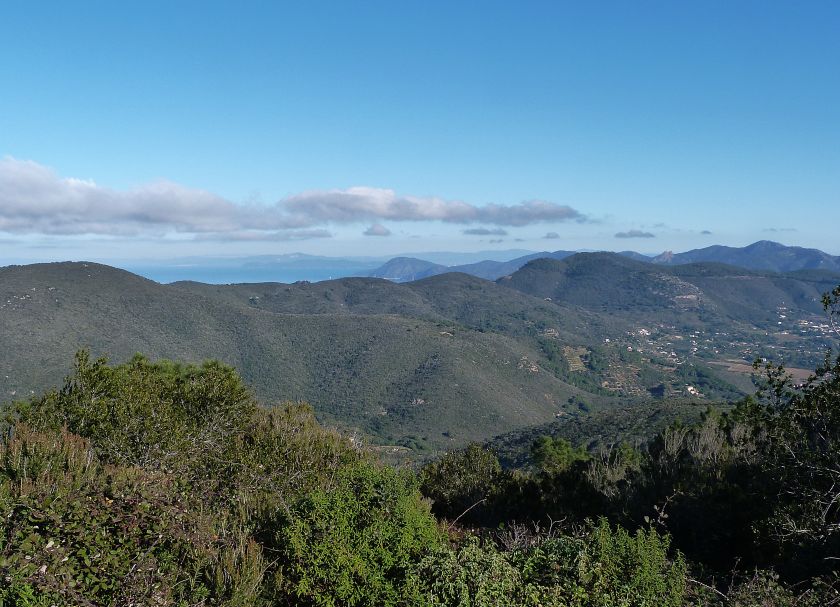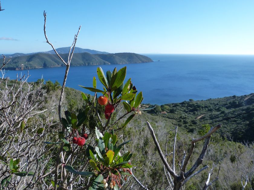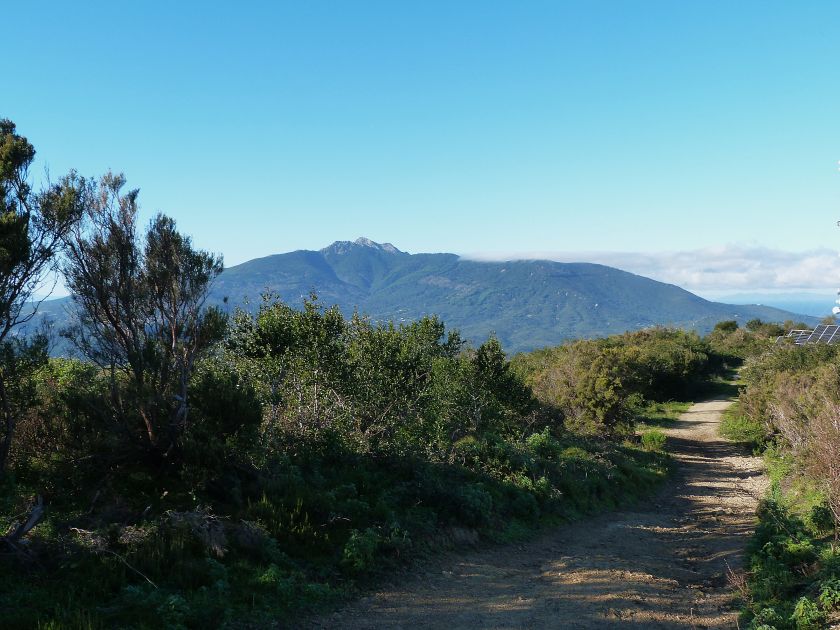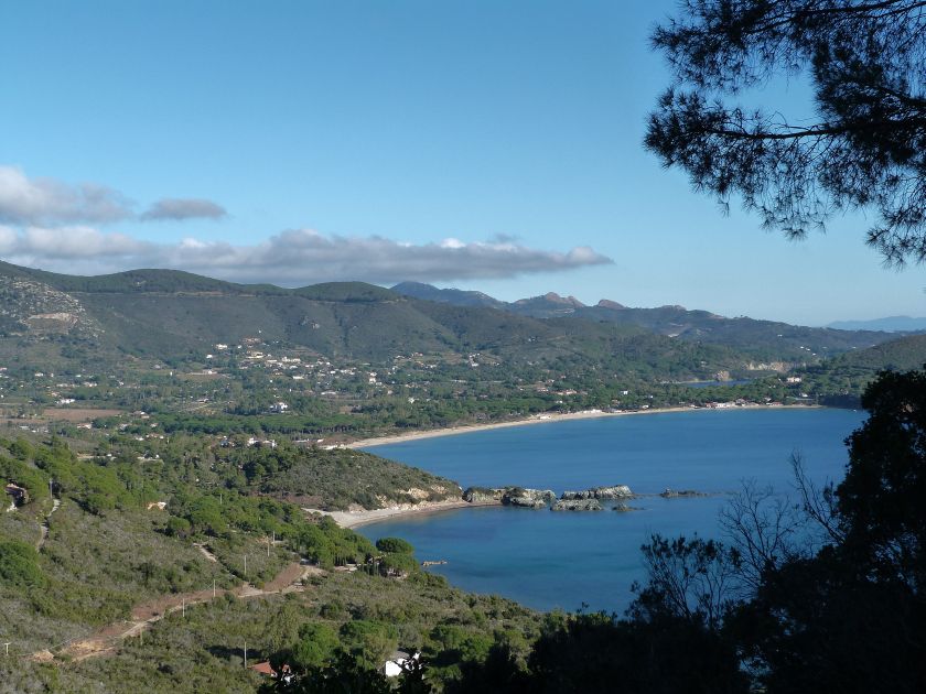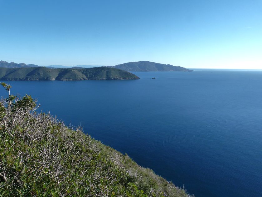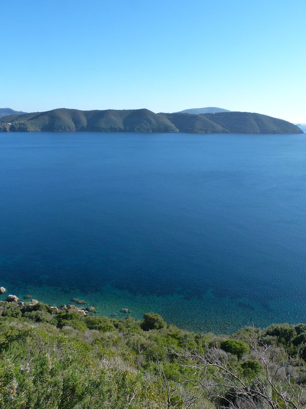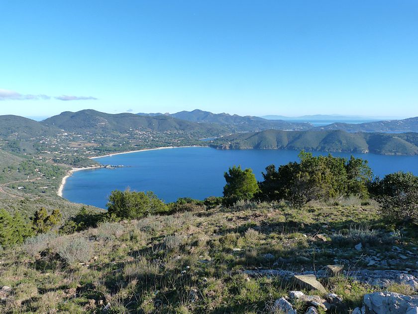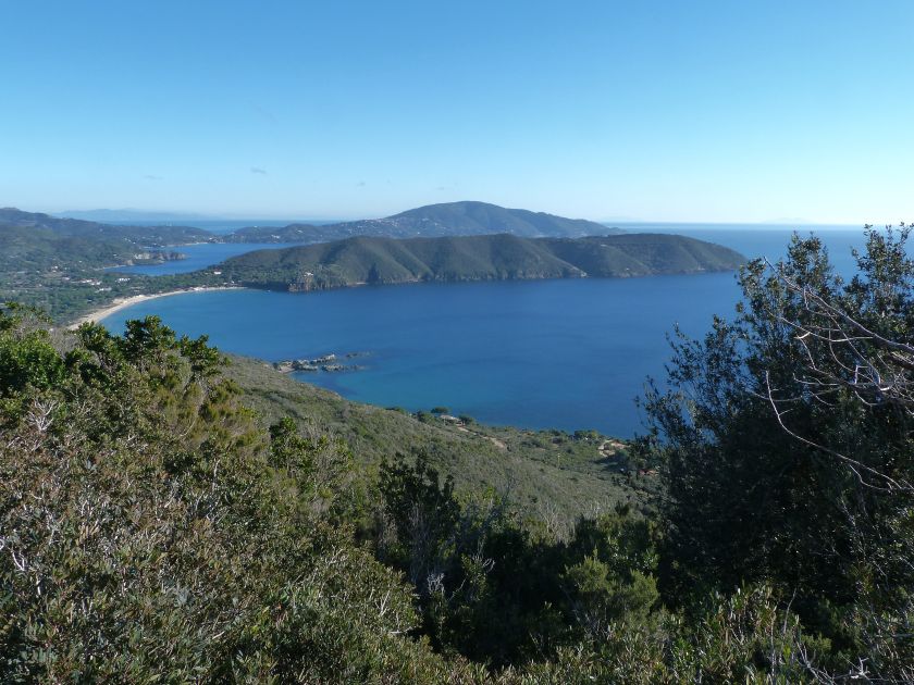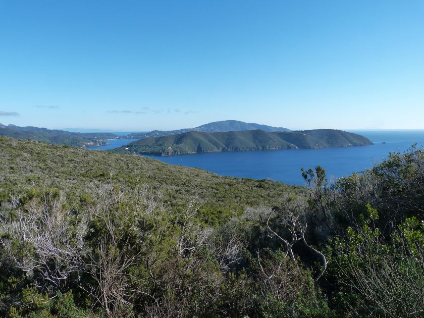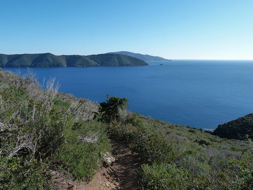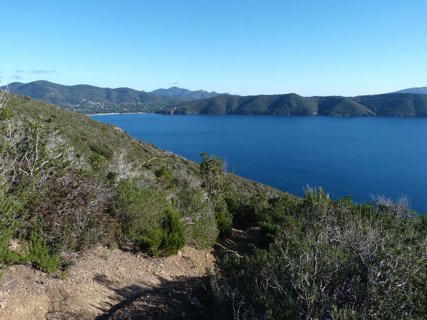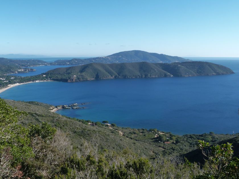 Il promontorio di Fonza, nell’ambito dell’Isola d’Elba, divide il Golfo di Lacona dal Golfo di Stella ed è incluso nel Parco Nazionale dell’Arcipelago Toscano. Il suo punto culminante è il Monte Tambone tuttavia il panorama più vasto e coinvolgente è di sicuro quello che si gode dalla cima del Monte Fonza. La quota contenuta non impedisce una vista estesa a gran parte del versante meridionale dell’Elba con i suoi promontori e le sue insenature. Nei giorni limpidi la vista si allarga sino ad osservare l’isola del Giglio e l’Isola di Montecristo mentre ad occidente si stagliano le vette più alte della Corsica. È un’escursione senz’altro consigliabilissima e percorribile in pratica per tutto l’anno. La stagione meno indicata resta in ogni caso l’estate per le temperature elevate; l’inverno al contrario è una stagione raramente presa in considerazione ma splendida permettendo di godere di un paesaggio sempreverde e al contempo di un silenzio e una solitudine che normalmente non caratterizzano una zona così turistica come l’Isola d’Elba. L’escursione in breve: Laconella (m 14) – sentiero n° 250 – bivio con sentiero 243 (inizio itinerario ad anello – m 91) – bivio sentiero 250 / 248A (m 160) – belvedere di Capo di Fonza (m 165) - bivio sentiero 250 / 248A (m 160) - Monte Fonza (m 296) – elevazione senza toponimo (m 321) – selletta senza nome (m 300) – bivio con sentiero n° 246 (m 341) – Monte Tambone (m 378) - bivio con sentiero n° 246 (m 341) – selletta senza nome (m 300) – sentiero n° 243 – bivio sentiero 243 / 250 (m 91) – Laconella (m 14) Partenza da Laconella (m 14): Difficoltà: E (Vai alla scala delle difficoltà). Segnaletica: tutti i bivi sono segnalati con cartelli tuttavia la segnaletica appare nel complesso scarsa e poco evidente (dicembre 2024). Dislivello assoluto: m 364. Acqua sul percorso: assente Accesso: Da Portoferraio seguiamo le indicazioni per Porto Azzurro seguendo la SP 26. Dopo pochi km volgiamo a destra sulla SP 30 con indicazioni per Marina di Campo. Raggiungiamo la frazione di Lacona; la strada si sviluppa a poche decine di metri dalla spiaggia anche se quest’ultima non è ben osservabile per via dalla pineta e per la presenza di diversi campeggi. Al termine del rettilineo cessano i lidi e si raggiunge, poco oltre, il bivio a sinistra di Via Laconella con cartello indicante l’omonimo campeggio. L’escursione ha inizio proprio in coincidenza dell’incrocio con cartello escursionistico indicante Capo di Fonza a ore 1.20 e Monte Tambone a ore 2. Descrizione del percorso: La prima frazione di cammino ricalca il tracciato di Via Laconella. In estate il transito è proibito alle automobili con l’eccezione dei residenti mentre in inverno l’accesso è libero con la possibilità di abbreviare il tracciato a piedi percorrendo un lungo tratto di sterrata. Non mancano alcuni scorci osservando, a sinistra, le rocce che caratterizzano la Punta della Contessa. La strada si articola tra alcune abitazioni private mentre verso meridione la vista si allarga sino ad osservare, all’orizzonte, l’Isola di Montecristo. Un paio di digressioni permettono, volendo, di calare in qualche minuto sino al litorale sottostante. Da rilevare lo scorcio verso la Spiaggia di Laconella osservando inoltre le splendide colorazioni del fondale. Osserviamo inoltre come la prima citata Punta della Contessa divida la Spiaggia di Laconella dalla Spiaggia Grande di Lacona. Verso oriente il panorama è in gran parte occupato dallo splendido promontorio di Capo Stella rivestito di un’alberatura particolarmente folta. Proseguiamo lungamente con la strada che diviene dissestata e non più percorribile alle automobili. Non vi è alcuna traccia di segnaletica ma il percorso è ovvio ricalcando fedelmente la sterrata. In coincidenza di un tornante abbandoniamo la carrareccia volgendo a sinistra sul sentiero che mantiene il segnavia n° 250 (m 91 - ore 0,30 dalla partenza). Il bivio è segnalato dai cartelli con indicato il “Punto panoramico Capo di Fonza” a ore 0,50 di cammino. Pochi metri di sentiero e incontriamo immediatamente un’ulteriore biforcazione che lascia di primo acchito nell’ambiguità per l’assenza di segnalazioni. Occorre ignorare la possibilità di sinistra mantenendo il tracciato che si inoltra nel mezzo della macchia. La segnaletica è ridotta al minimo ma nel proseguo non si affrontano problemi d’orientamento in quanto il sentiero appare ben marcato e privo per un lungo tratto d’ulteriori bivi. Si procede con dislivelli nel complesso contenuti affacciandosi a sinistra su un braccio di mare caratterizzato da magnifiche colorazioni tra il blu e il turchese. Se la prima frazione su sterrata non aveva entusiasmato ecco che questa frazione di sentiero appare invece di indiscutibile bellezza grazie alla vista del grande Golfo di Lacona. L’ambiente selvaggio e una macchia particolarmente rigogliosa rendono il cammino molto piacevole anche in pieno inverno. Avanzando verso meridione compare, alle spalle di Capo Stella, il promontorio di Capoliveri. Dopo una lunga frazione in debole saliscendi il sentiero cambia improvvisamente pendenza salendo ripido verso destra. È un tratto un po’ più faticoso ma si rivela relativamente breve in quanto si accede con rapidità ad un’ampia sella poco accentuata sulla dorsale che scende dal Monte Tambone a Capo Fonza (m 160 – ore 1,20 dalla partenza). Il paesaggio si apre per la prima volta verso occidente osservando, a breve distanza, la Punta delle Mete con, di fronte ad essa, lo Scoglio della Triglia. Più distante notiamo, al di là del Golfo di Campo, il pronunciato Capo di Poro mentre sullo sfondo svettano addirittura le cime della Corsica a chiudere l’orizzonte. Siamo inoltre ad un’importante biforcazione. I cartelli segnalano verso destra il Monte Fonza a 20 minuti di cammino mentre a sinistra è indicato Capo Fonza a 10 minuti. Scegliamo quest’ultima pos