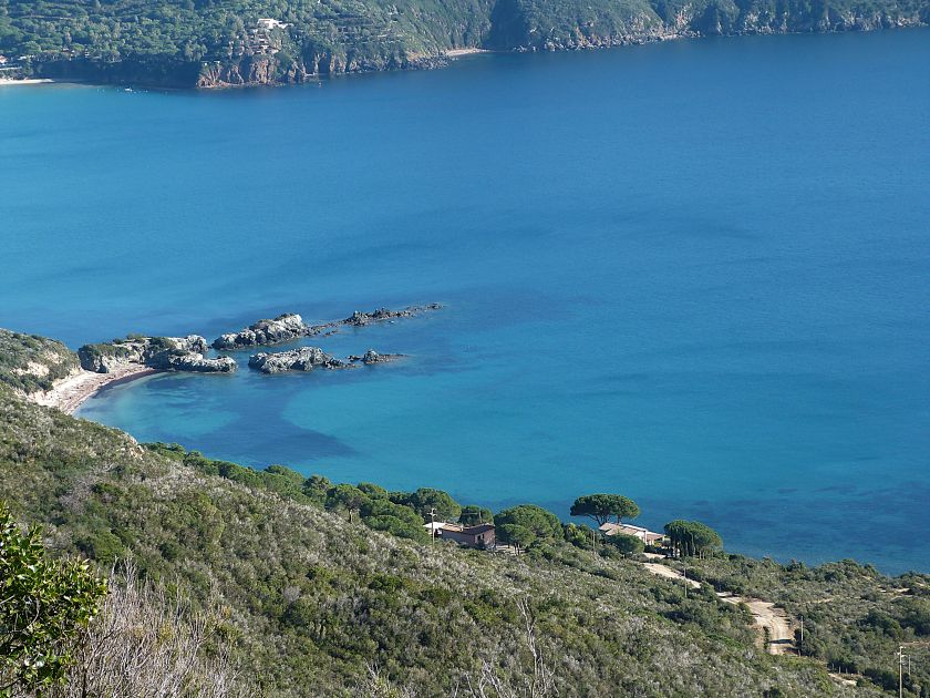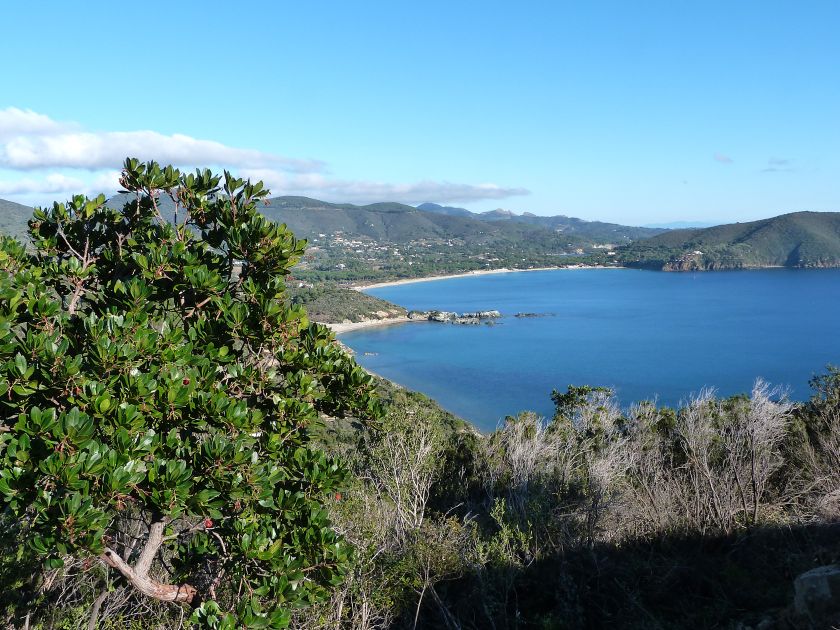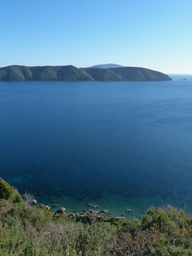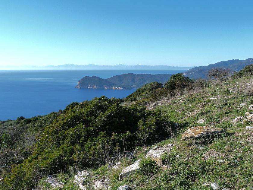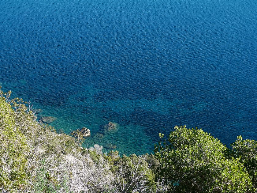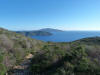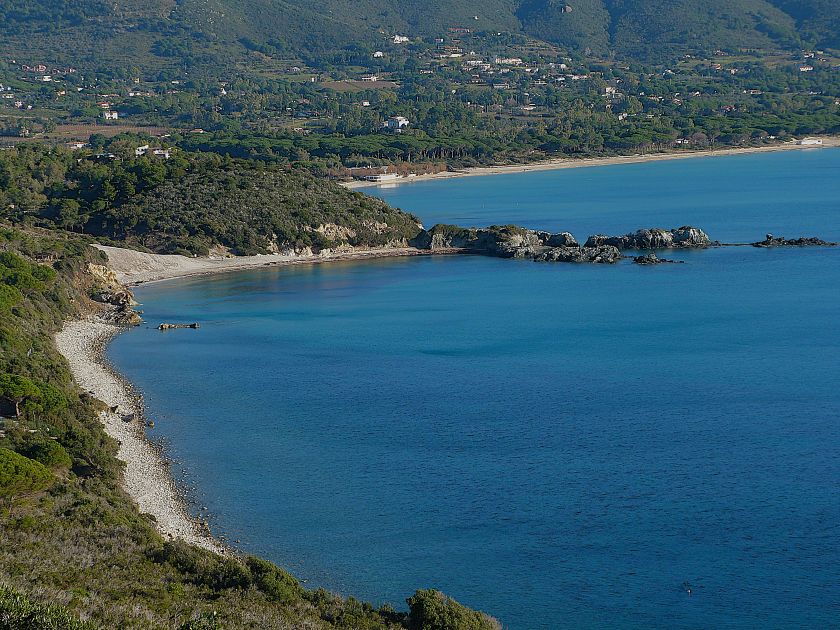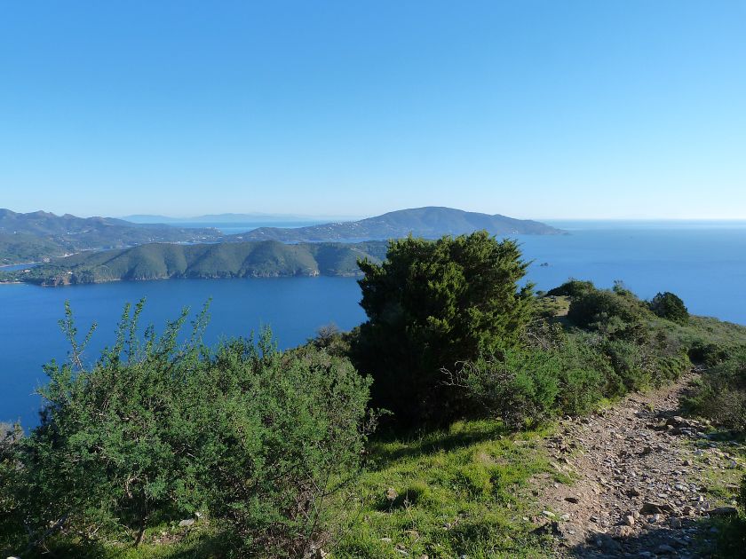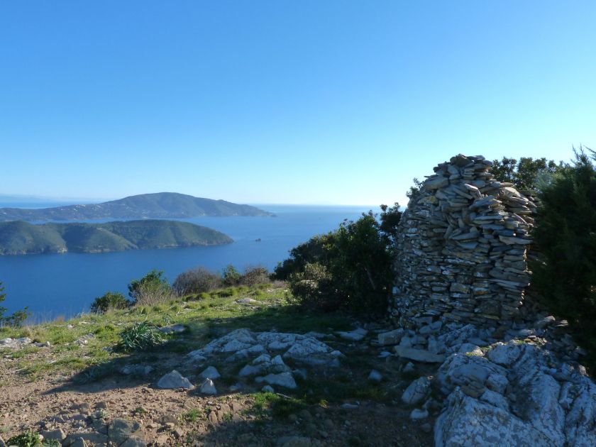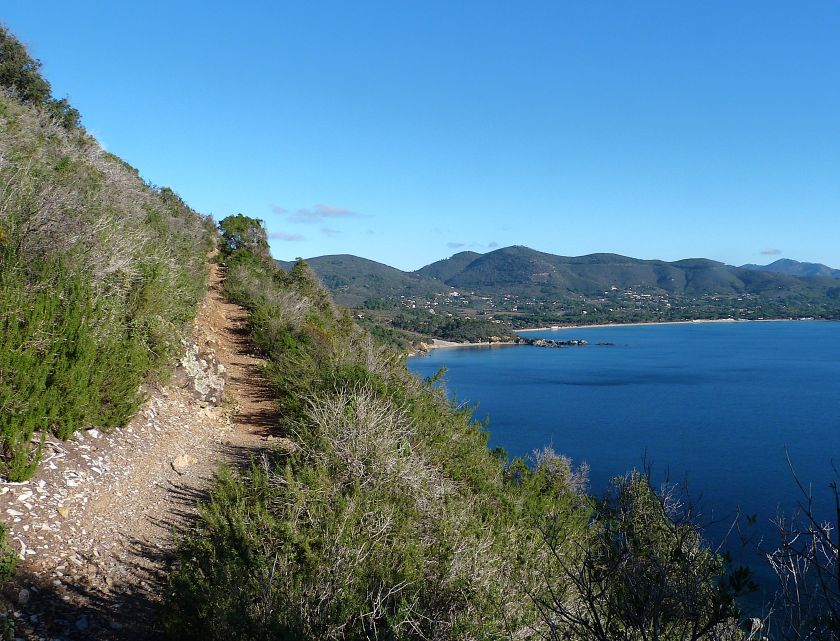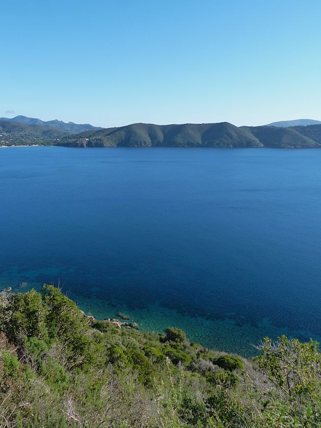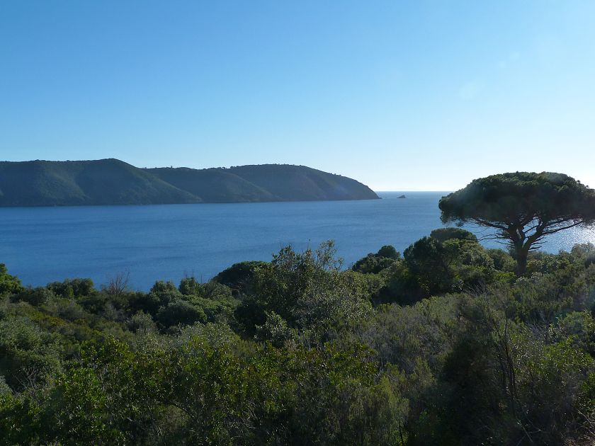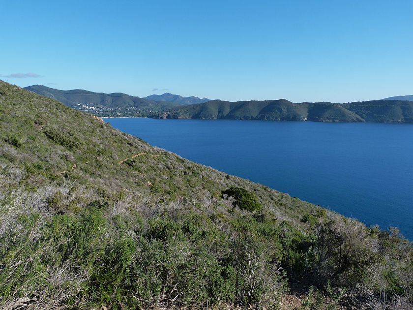 Il promontorio di Fonza, nell’ambito dell’Isola d’Elba, divide il Golfo di Lacona dal Golfo di Stella ed è incluso nel Parco Nazionale dell’Arcipelago Toscano. Il suo punto culminante è il Monte Tambone tuttavia il panorama più vasto e coinvolgente è di sicuro quello che si gode dalla cima del Monte Fonza. La quota contenuta non impedisce una vista estesa a gran parte del versante meridionale dell’Elba con i suoi promontori e le sue insenature. Nei giorni limpidi la vista si allarga sino ad osservare l’isola del Giglio e l’Isola di Montecristo mentre ad occidente si stagliano le vette più alte della Corsica. È un’escursione senz’altro consigliabilissima e percorribile in pratica per tutto l’anno. La stagione meno indicata resta in ogni caso l’estate per le temperature elevate; l’inverno al contrario è una stagione raramente presa in considerazione ma splendida permettendo di godere di un paesaggio sempreverde e al contempo di un silenzio e una solitudine che normalmente non caratterizzano una zona così turistica come l’Isola d’Elba. L’escursione in breve: Laconella (m 14) – sentiero n° 250 – bivio con sentiero 243 (inizio itinerario ad anello – m 91) – bivio sentiero 250 / 248A (m 160) – belvedere di Capo di Fonza (m 165) - bivio sentiero 250 / 248A (m 160) - Monte Fonza (m 296) – elevazione senza toponimo (m 321) – selletta senza nome (m 300) – bivio con sentiero n° 246 (m 341) – Monte Tambone (m 378) - bivio con sentiero n° 246 (m 341) – selletta senza nome (m 300) – sentiero n° 243 – bivio sentiero 243 / 250 (m 91) – Laconella (m 14) Partenza da Laconella (m 14): Difficoltà: E (Vai alla scala delle difficoltà). Segnaletica: tutti i bivi sono segnalati con cartelli tuttavia la segnaletica appare nel complesso scarsa e poco evidente (dicembre 2024). Dislivello assoluto: m 364. Acqua sul percorso: assente Accesso: Da Portoferraio seguiamo le indicazioni per Porto Azzurro seguendo la SP 26. Dopo pochi km volgiamo a destra sulla SP 30 con indicazioni per Marina di Campo. Raggiungiamo la frazione di Lacona; la strada si sviluppa a poche decine di metri dalla spiaggia anche se quest’ultima non è ben osservabile per via dalla pineta e per la presenza di diversi campeggi. Al termine del rettilineo cessano i lidi e si raggiunge, poco oltre, il bivio a sinistra di Via Laconella con cartello indicante l’omonimo campeggio. L’escursione ha inizio proprio in coincidenza dell’incrocio con cartello escursionistico indicante Capo di Fonza a ore 1.20 e Monte Tambone a ore 2. Descrizione del percorso: La prima frazione di cammino ricalca il tracciato di Via Laconella. In estate il transito è proibito alle automobili con l’eccezione dei residenti mentre in inverno l’accesso è libero con la possibilità di abbreviare il tracciato a piedi percorrendo un lungo tratto di sterrata. Non mancano alcuni scorci osservando, a sinistra, le rocce che caratterizzano la Punta della Contessa. La strada si articola tra alcune abitazioni private mentre verso meridione la vista si allarga sino ad osservare, all’orizzonte, l’Isola di Montecristo. Un paio di digressioni permettono, volendo, di calare in qualche minuto sino al litorale sottostante. Da rilevare lo scorcio verso la Spiaggia di Laconella osservando inoltre le splendide colorazioni del fondale. Osserviamo inoltre come la prima citata Punta della Contessa divida la Spiaggia di Laconella dalla Spiaggia Grande di Lacona. Verso oriente il panorama è in gran parte occupato dallo splendido promontorio di Capo Stella rivestito di un’alberatura particolarmente folta. Proseguiamo lungamente con la strada che diviene dissestata e non più percorribile alle automobili. Non vi è alcuna traccia di segnaletica ma il percorso è ovvio ricalcando fedelmente la sterrata. In coincidenza di un tornante abbandoniamo la carrareccia volgendo a sinistra sul sentiero che mantiene il segnavia n° 250 (m 91 - ore 0,30 dalla partenza). Il bivio è segnalato dai cartelli con indicato il “Punto panoramico Capo di Fonza” a ore 0,50 di cammino. Pochi metri di sentiero e incontriamo immediatamente un’ulteriore biforcazione che lascia di primo acchito nell’ambiguità per l’assenza di segnalazioni. Occorre ignorare la possibilità di sinistra mantenendo il tracciato che si inoltra nel mezzo della macchia. La segnaletica è ridotta al minimo ma nel proseguo non si affrontano problemi d’orientamento in quanto il sentiero appare ben marcato e privo per un lungo tratto d’ulteriori bivi. Si procede con dislivelli nel complesso contenuti affacciandosi a sinistra su un braccio di mare caratterizzato da magnifiche colorazioni tra il blu e il turchese. Se la prima frazione su sterrata non aveva entusiasmato ecco che questa frazione di sentiero appare invece di indiscutibile bellezza grazie alla vista del grande Golfo di Lacona. L’ambiente selvaggio e una macchia particolarmente rigogliosa rendono il cammino molto piacevole anche in pieno inverno. Avanzando verso meridione compare, alle spalle di Capo Stella, il promontorio di Capoliveri. Dopo una lunga frazione in debole saliscendi il sentiero cambia improvvisamente pendenza salendo ripido verso destra. È un tratto un po’ più faticoso ma si rivela relativamente breve in quanto si accede con rapidità ad un’ampia sella poco accentuata sulla dorsale che scende dal Monte Tambone a Capo Fonza (m 160 – ore 1,20 dalla partenza). Il paesaggio si apre per la prima volta verso occidente osservando, a breve distanza, la Punta delle Mete con, di fronte ad essa, lo Scoglio della Triglia. Più distante notiamo, al di là del Golfo di Campo, il pronunciato Capo di Poro mentre sullo sfondo svettano addirittura le cime della Corsica a chiudere l’orizzonte. Siamo inoltre ad un’importante biforcazione. I cartelli segnalano verso destra il Monte Fonza a 20 minuti di cammino mentre a sinistra è indicato Capo Fonza a 10 minuti. Scegliamo quest’ultima pos