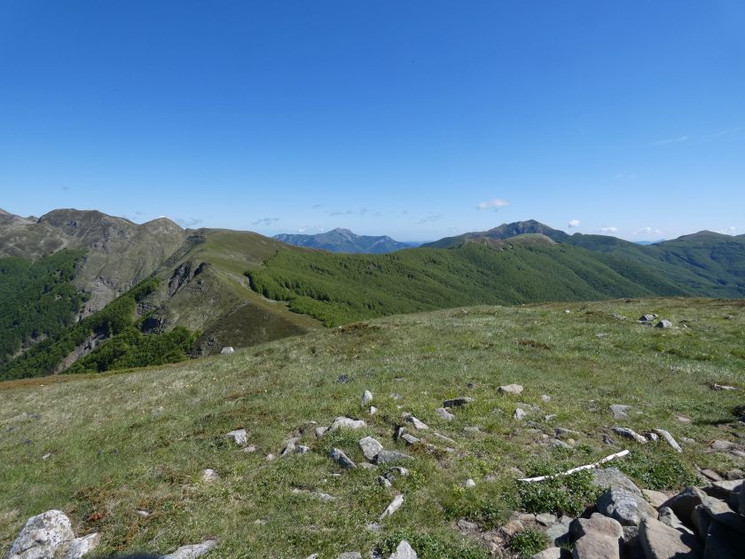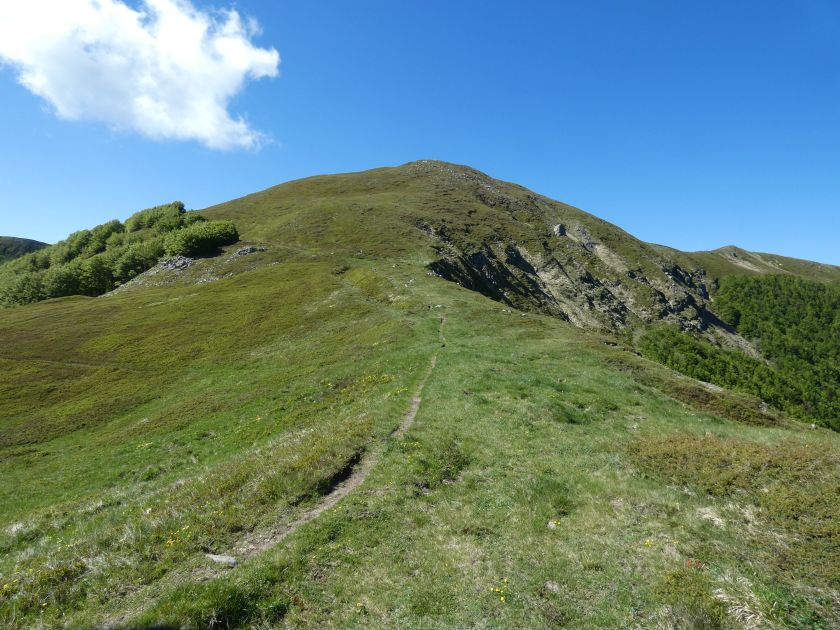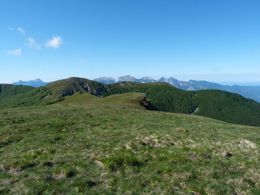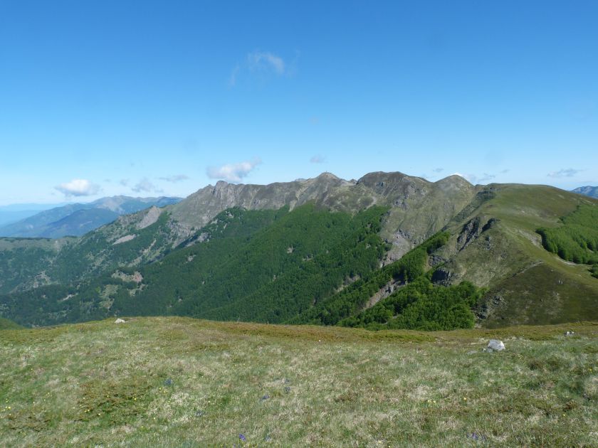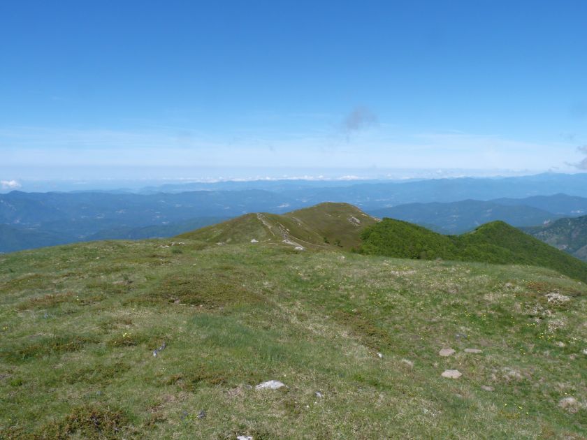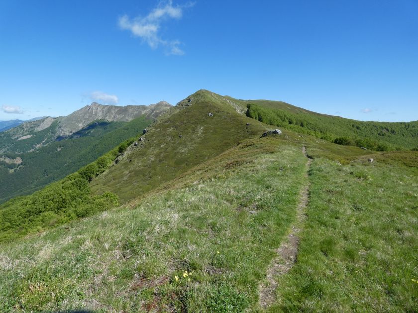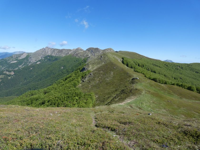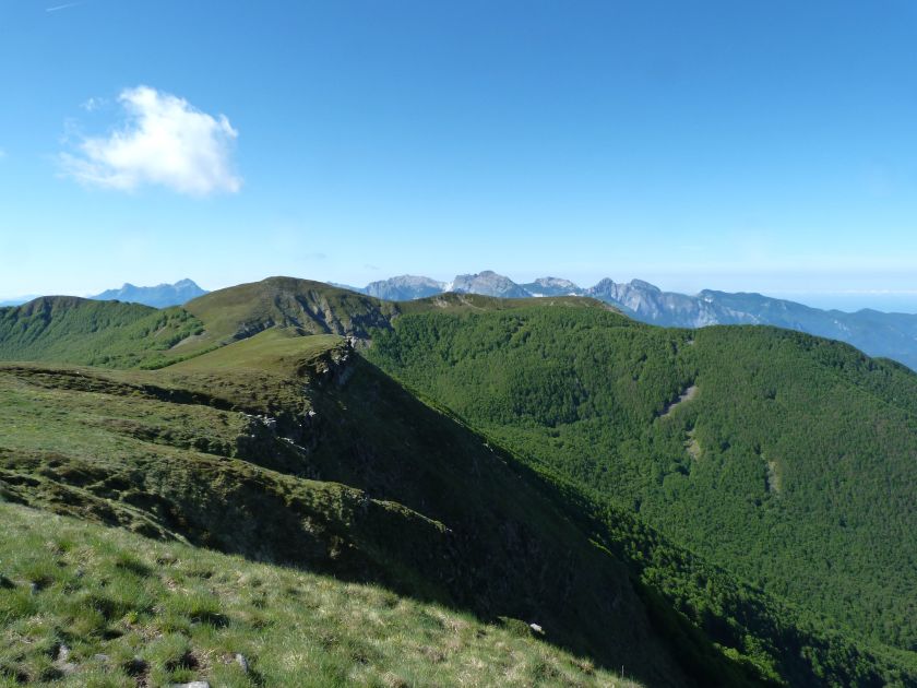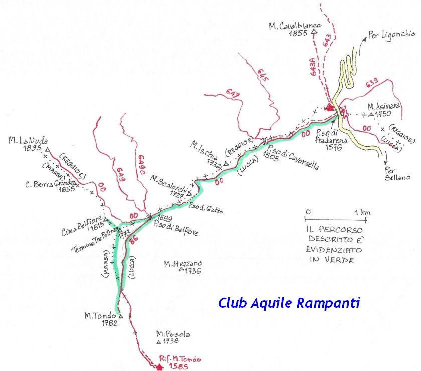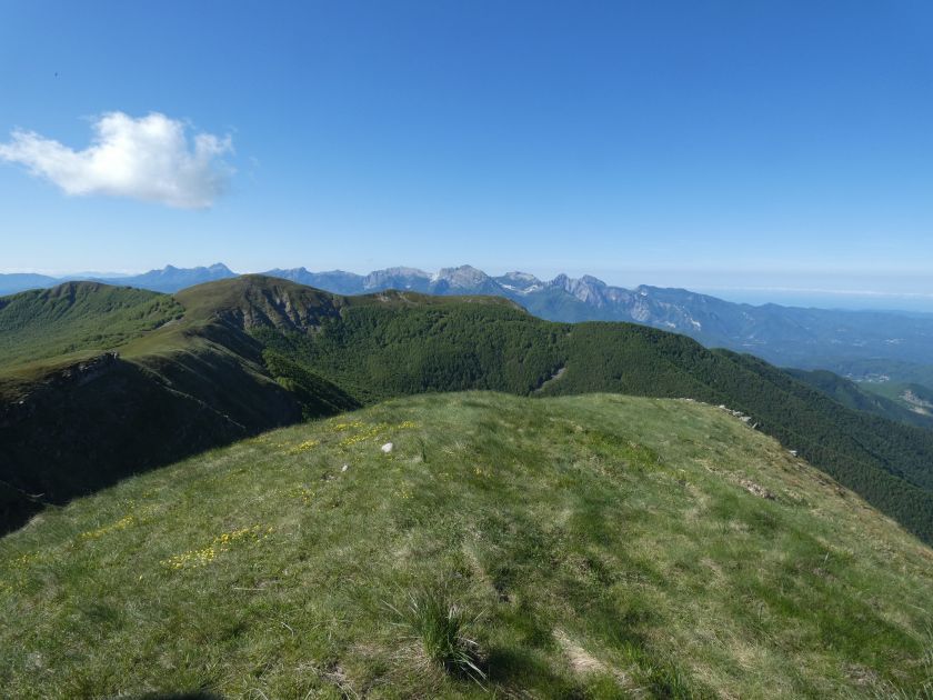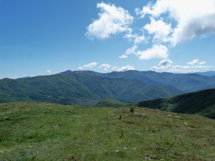 L’escursione che andiamo a narrarvi sorprende per l’ambiente insolitamente selvaggio ed isolato giustamente inserito nell’ambito del Parco Nazionale dell’Appennino Tosco Emiliano. Il cammino raggiunge il suo culmine nella Cima Belfiore, posta proprio lungo lo spartiacque principale. Nonostante la forma a cupola poco rilevata offre un panorama di insospettabile vastità in grado, nelle giornate più limpide, di estendersi dall’arco alpino a nord al Mar Ligure e alla Corsica verso sudovest. Prima del raggiungimento della Cima Belfiore se ne tocca la piccola anticima sudorientale denominata Termine Tre Potenze. Nonostante la poca appariscenza è un importantissimo nodo orografico. Dal punto più alto si diparte infatti, nel versante toscano, una lunga cresta a dividere la Garfagnana dalla Lunigiana. Il crinale tocca il Monte Tondo per poi calare sino a raggiungere la Foce dei Carpinelli, dove transita la SS 445 che unisce Bagni di Lucca ad Aulla. Al di là della Foce dei Carpinelli il pendio riprende quota nelle Alpi Apuane. Controversa appare l’origine del toponimo “Termine Tre Potenze”. Sulla vetta è infatti presente un cippo arenaceo che nel XVIII secolo fu posto al confine tra il Ducato di Modena e il Granducato di Toscana. Le “potenze” erano in effetti solo due a meno che il toponimo non si riferisca al fatto che la vetta domina tre grandi bacini idrografici: la Val Secchia nel versante reggiano, la Lungiana (Valle del Magra) e la Garfagnana. Il mistero è ancora più fitto se si pensa che il toponimo compare nelle mappe solo a partire dal 1936 mentre in una mappa del 1878 è citato solo il Monte Belfiore e in una carta del 600 si parla di Monte Gragnanese. Forse non si troverà mai una risposta, ma ancora più sorprendente è accorgersi che il toponimo si adatta perfettamente alla situazione amministrativa attuale. Il Termine Tre Potenze è infatti al momento il punto di unione e separazione delle province di Reggio Emilia, Lucca e Massa Carrara. Tralasciando l’aspetto storico e amministrativo l’escursione è senz’altro raccomandabile tra maggio e giugno quando la neve è ormai scomparsa potendo godere delle fioriture di inizio stagione. In alternativa il cammino risulta molto piacevole anche nelle terse giornate autunnali. Inutile ricordare che il percorso, sviluppandosi per un lungo tratto in pieno crinale appenninico spartiacque, è pericolosamente esposto alle nebbie e a forti venti di tempesta nelle giornate dal tempo instabile. In sintesi occorre attenzione alle previsioni del tempo per scegliere una giornata adatta al cammino. L’escursione in breve: Passo di Pradarena (m 1576) – Passo di Cavorsella (m 1505) – Passo del Gatto – Passo di Belfiore (m 1669) – Termine Tre Potenze (m 1773) – Cima Belfiore (m 1815) – Termine Tre Potenze (m 1773) - Monte Tondo (m 1782) – sentiero n° 86 – Passo di Belfiore (m 1669) – a ritroso sino al Passo di Pradarena (m 1576). Dati tecnici: Partenza dal Passo di Pradarena (m 1576): Difficoltà: E (Vai alla scala delle difficoltà); breve passaggio in lieve esposizione con difficoltà EE in coincidenza del Passo del Gatto. Segnaletica: totale. Dislivello assoluto: m 310; dislivello reale senza dubbio maggiore per via delle lunghe frazioni di crinale. Acqua potabile sul percorso: alla partenza; una sorgente lungo il sentiero 86. Accesso alla partenza: La partenza coincide con l’importante Passo di Pradarena, uno dei più alti valichi rotabili dell’Appennino Settentrionale. Usando l’autostrada A1 si esce a Reggio Emilia e si seguono le indicazioni per La Spezia e il Passo del Cerreto (SS 63). Arrivati al paese di Busana si abbandona la statale volgendo a sinistra sulla SP 18 per salire a Ligonchio (75 km da Reggio Emilia). Si tratta dell’ultimo paese, se si eccettua la piccola frazione di Ospitaletto, prima della salita che conduce direttamente al valico, al confine tra l’Emilia e la Toscana. Naturalmente si può salire al valico anche dal versante toscano. In questo caso si raggiunge, con la SS 445 della Garfagnana, il paese di Piazza al Serchio. Si abbandona la statale per salire dapprima a Sillano quindi, in 4,5 km, sino a Capanne di Sillano. La strada procede in ripida salita guadagnando, in ulteriori 7 km, il Passo di Pradarena. Descrizione del percorso: In coincidenza del Passo di Pradarena (m 1576) si separa verso occidente un’ampia sterrata chiusa al traffico che entra nella bella e lussureggiante faggeta. Si tratta del segnavia 00 di crinale che in questa prima frazione si articola dapprima in piano quindi in debole discesa sino a raggiungere, sempre nel bosco, il punto più basso dell’escursione. Siamo al Passo di Cavorsella (m 1505 – ore 0,20 dalla partenza), importante crocevia di sentieri ben segnalato dai cartelli. Ignoriamo il sentiero 647 che si separa a destra mantenendo il segnavia 00 con l’ampia mulattiera che lascia spazio ad un buon sentiero. Ci innalziamo ripidamente nel pendio boscoso con il paesaggio, in questa prima frazione, impedito dalla fitta alberatura. In breve guadagniamo il margine superiore della faggeta. Subito oltre siamo nella prateria d’altitudine con il sentiero ridotto ad una striscia nel manto erboso e con panorama che si apre all’improvviso divenendo vasto e suggestivo. Verso meridione spiccano le Alpi Apuane mentre alle spalle osserviamo il Monte Cusna seconda cima, in ordine di altezza, dell’Appennino Settentrionale. Facile e ben tracciato, il percorso si articola di poco sotto crinale aggirando nel versante toscano le pendici del Monte Ischia. Tra distese di mirtillo e bassa vegetazione cespugliosa ci portiamo verso lo spartiacque che andiamo infine a toccare in coincidenza della marcata selletta che divide il Monte Scalocchi dal Monte Ischia. Possiamo osservare un bel paesaggio verso Cima Belfiore e il Monte La Nuda. Subito oltre il sentiero segnato torna ad abbandonare il crinale debordando nel versante toscano per aggirare le ripide pe